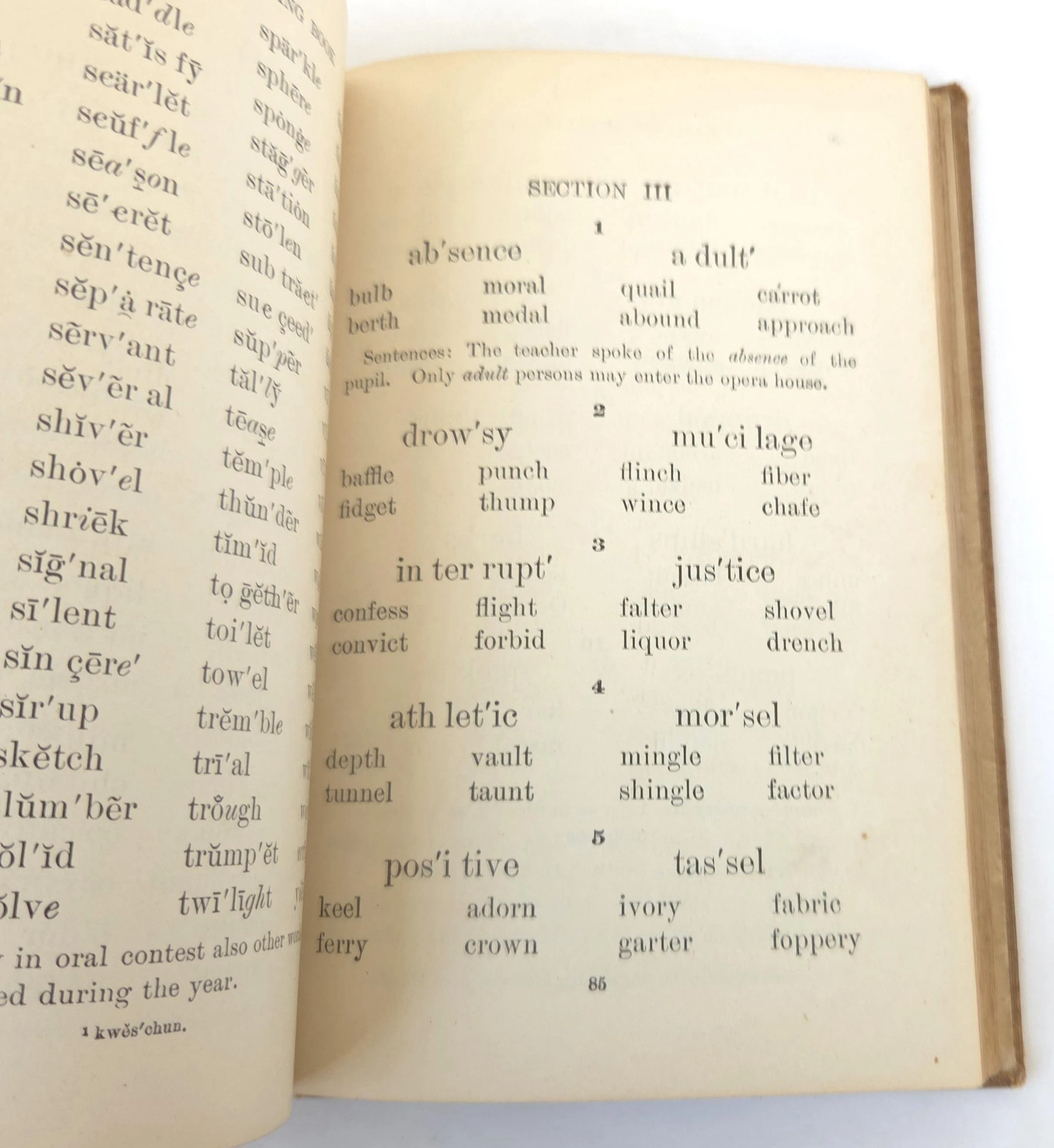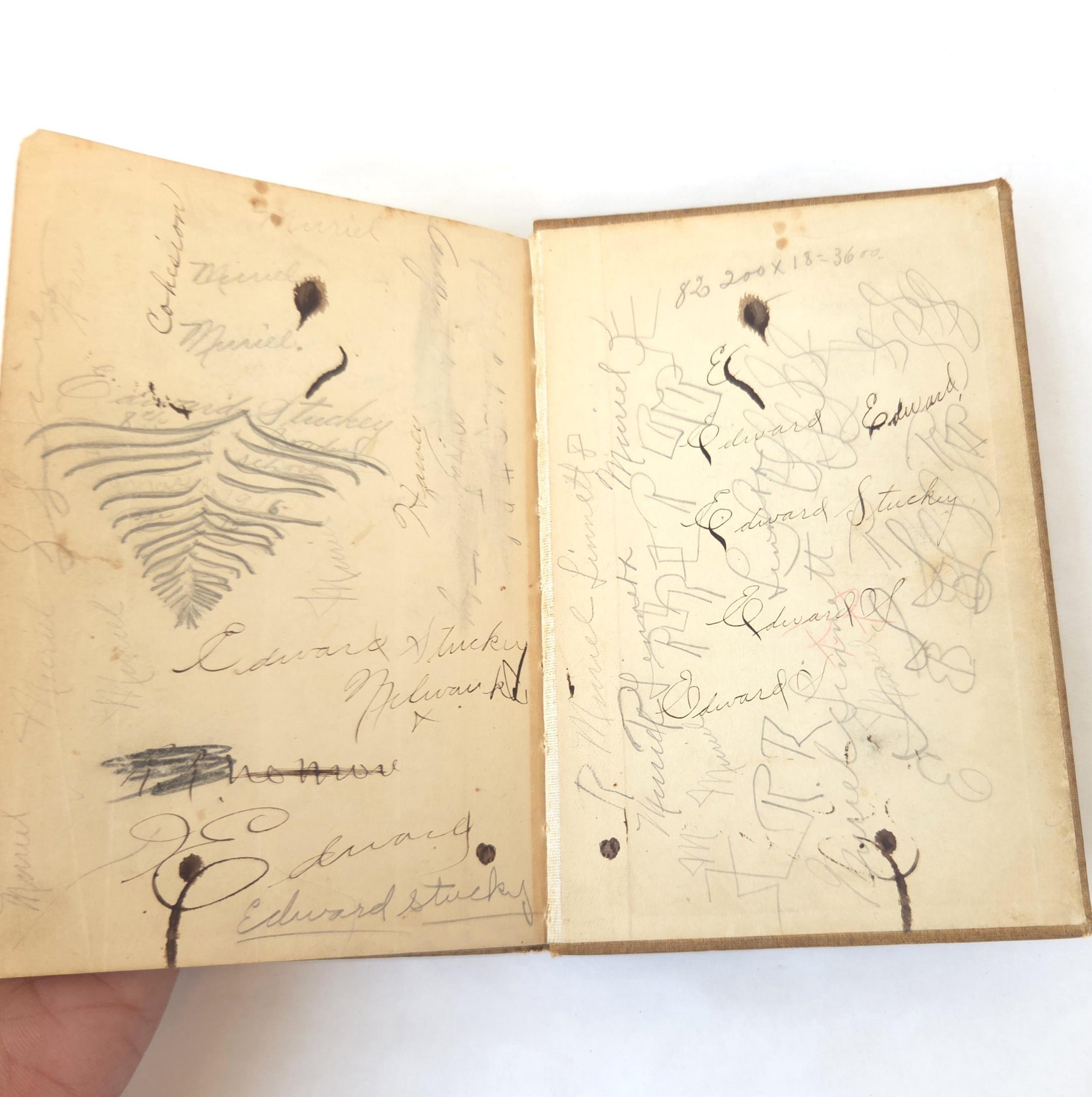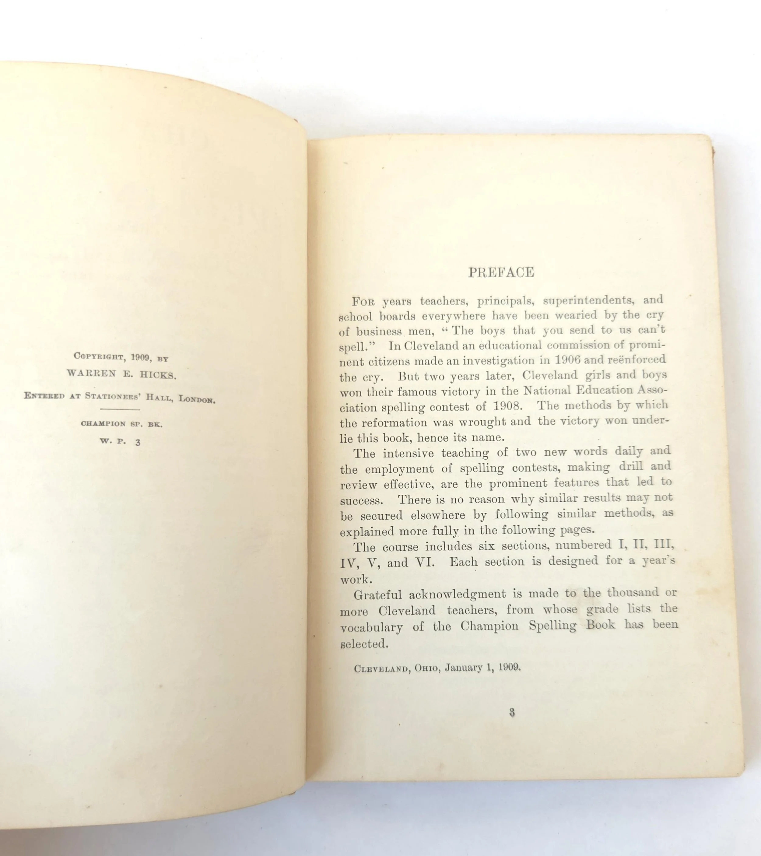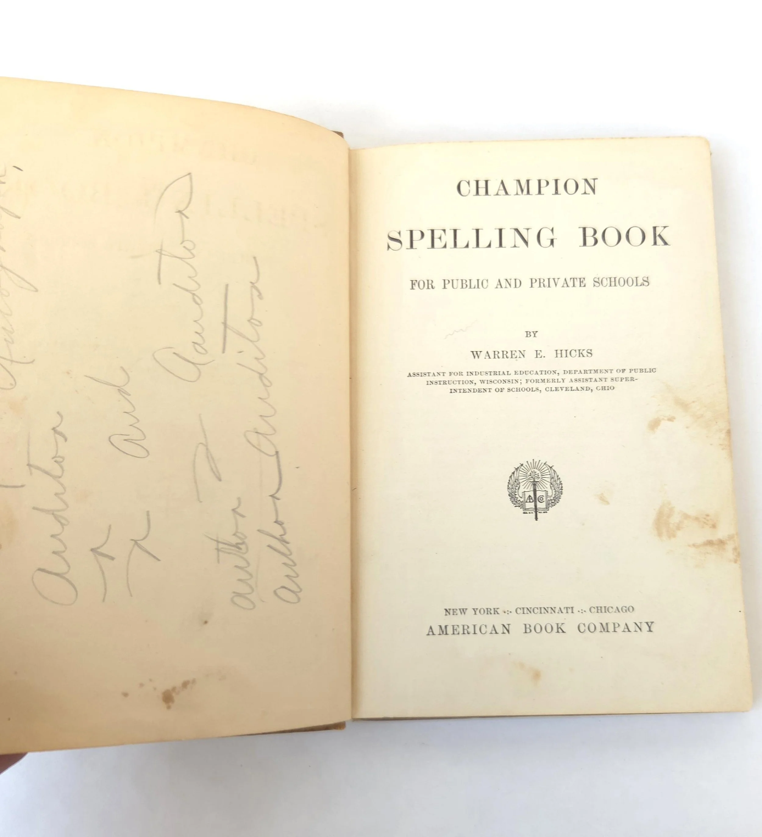 This beautiful antique 1909 hardcover edition of the Champion Spelling Book for Public and Private Schools by Warren E. Hicks is a classic children's school book from the early nineteen hundreds. It has a darling printed cover featuring a pair of kids reading on decorative bench framed by potted plants. The book is in used antique condition with some wear to the edges of the cover along with some discoloration from age. There is extensive scribbling inside the front and back cover as well as a clipped corner to the front end page. There is some staining to the front few and back few pages and well as a few inner pages with marks, but there are no torn inner pages, a solid binding and good overall color quality.