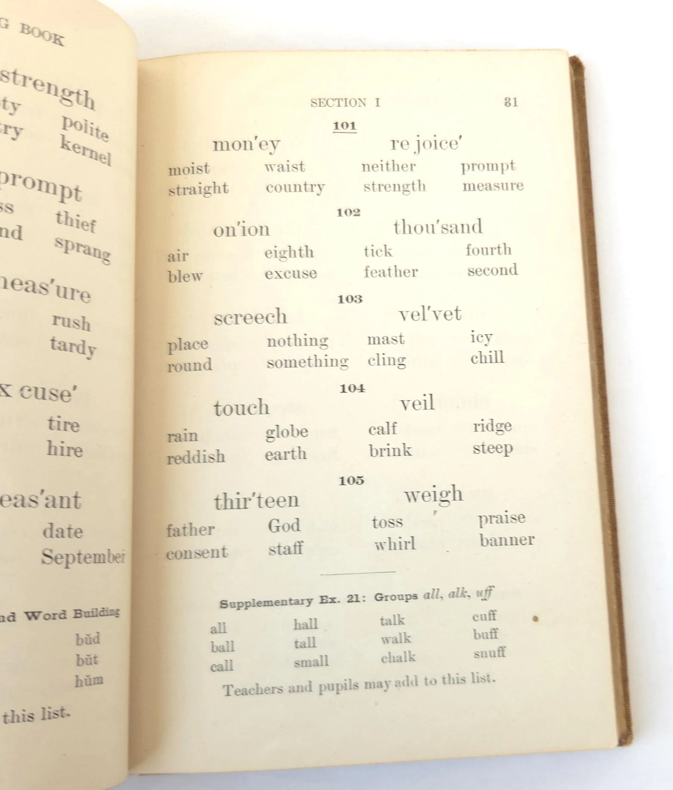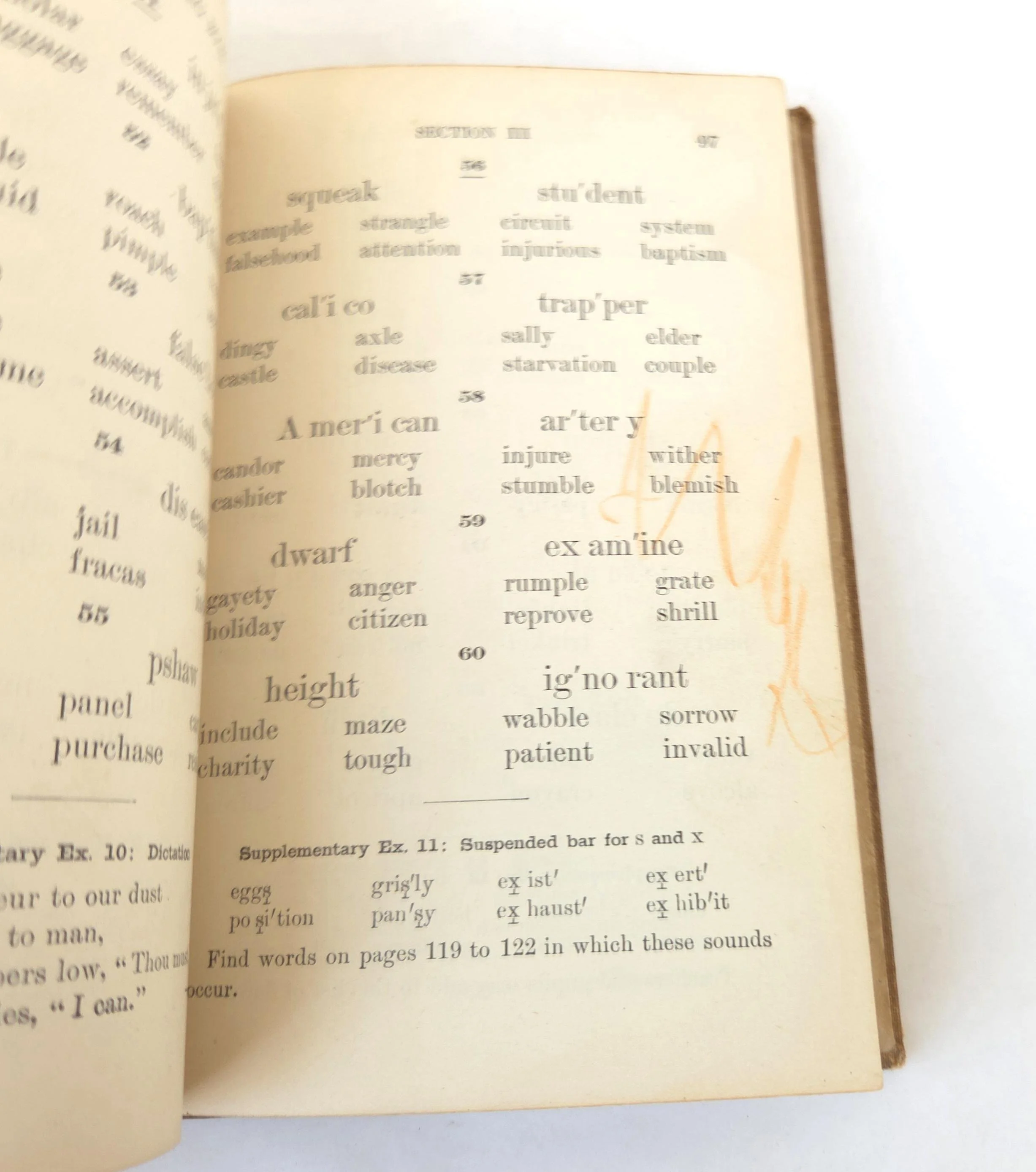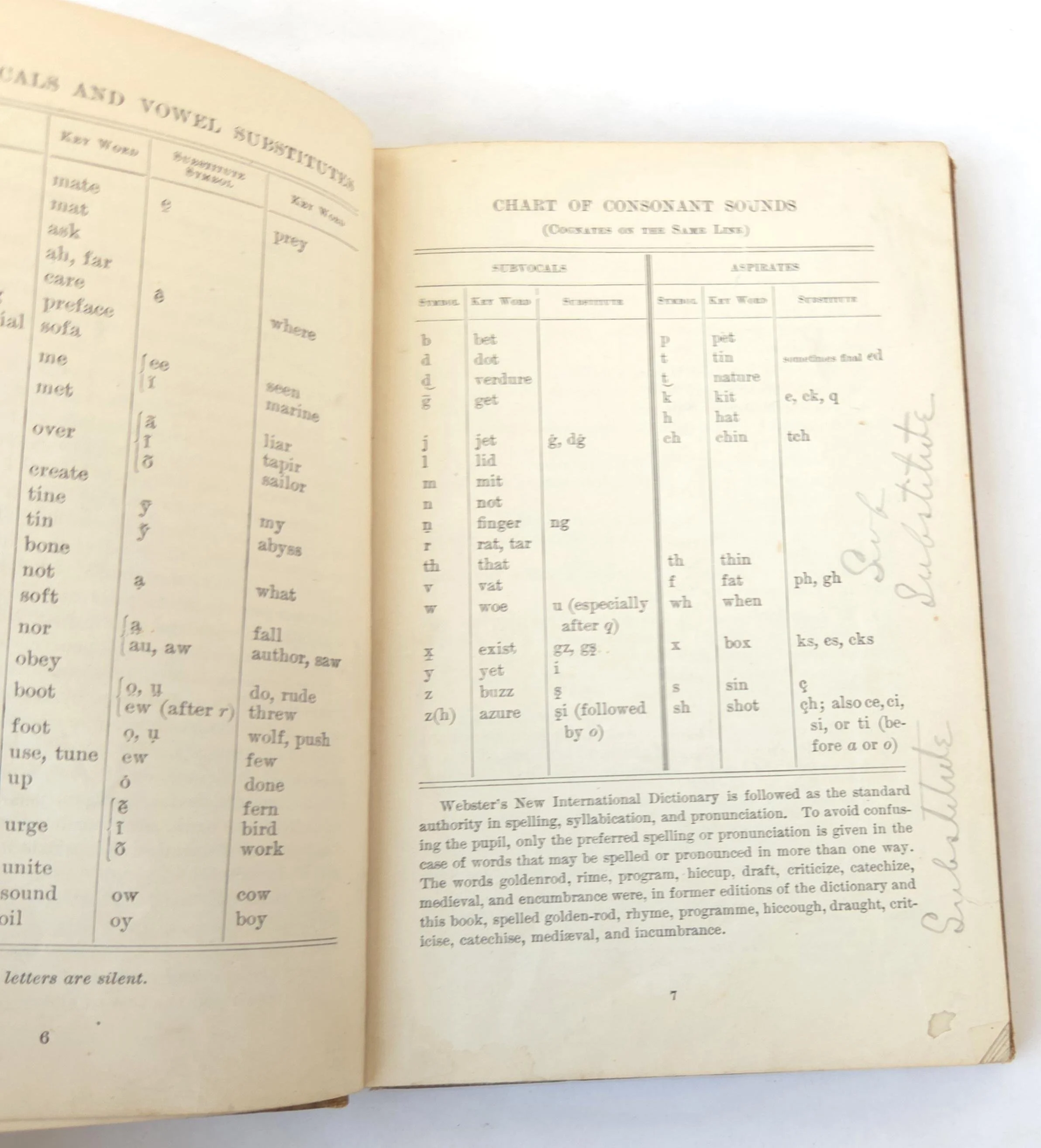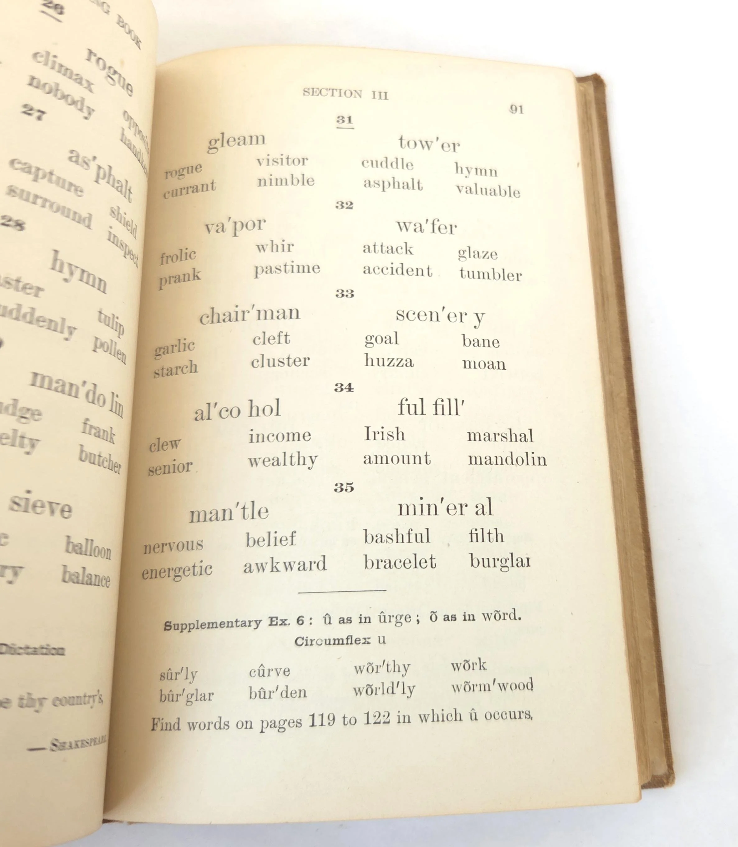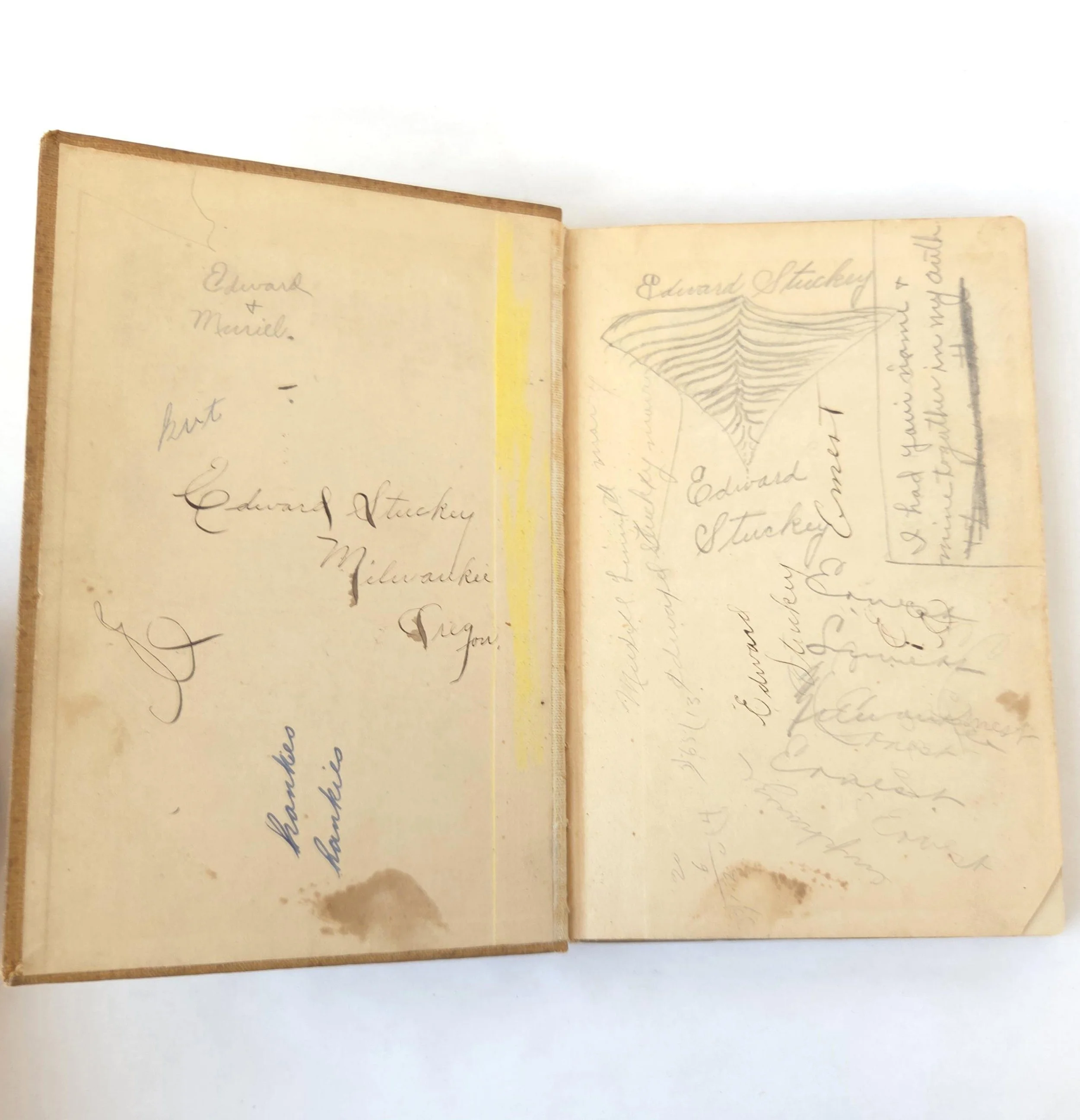 This beautiful antique 1909 hardcover edition of the Champion Spelling Book for Public and Private Schools by Warren E. Hicks is a classic children's school book from the early nineteen hundreds. It has a darling printed cover featuring a pair of kids reading on decorative bench framed by potted plants. The book is in used antique condition with some wear to the edges of the cover along with some discoloration from age. There is extensive scribbling inside the front and back cover as well as a clipped corner to the front end page. There is some staining to the front few and back few pages and well as a few inner pages with marks, but there are no torn inner pages, a solid binding and good overall color quality.