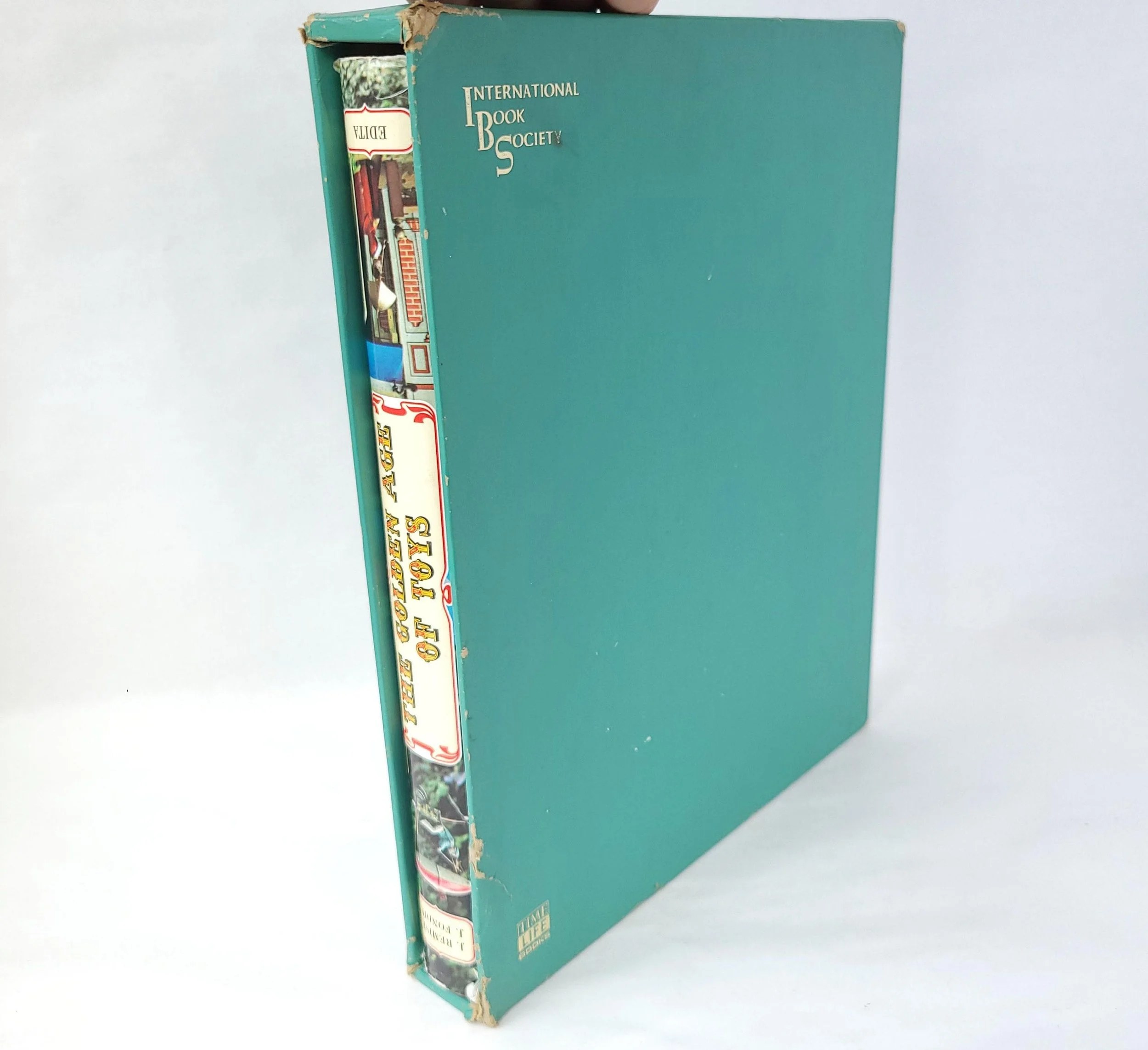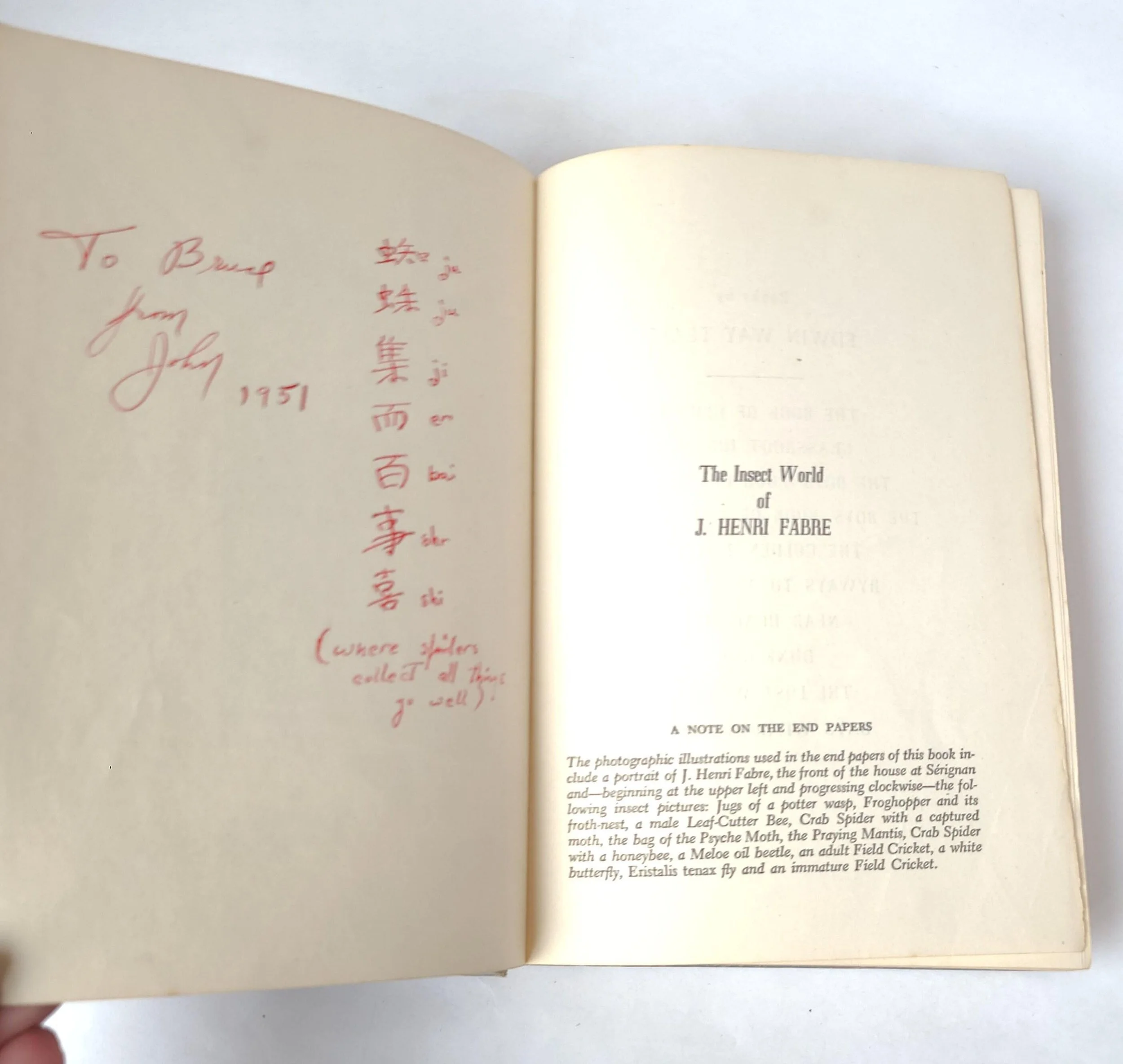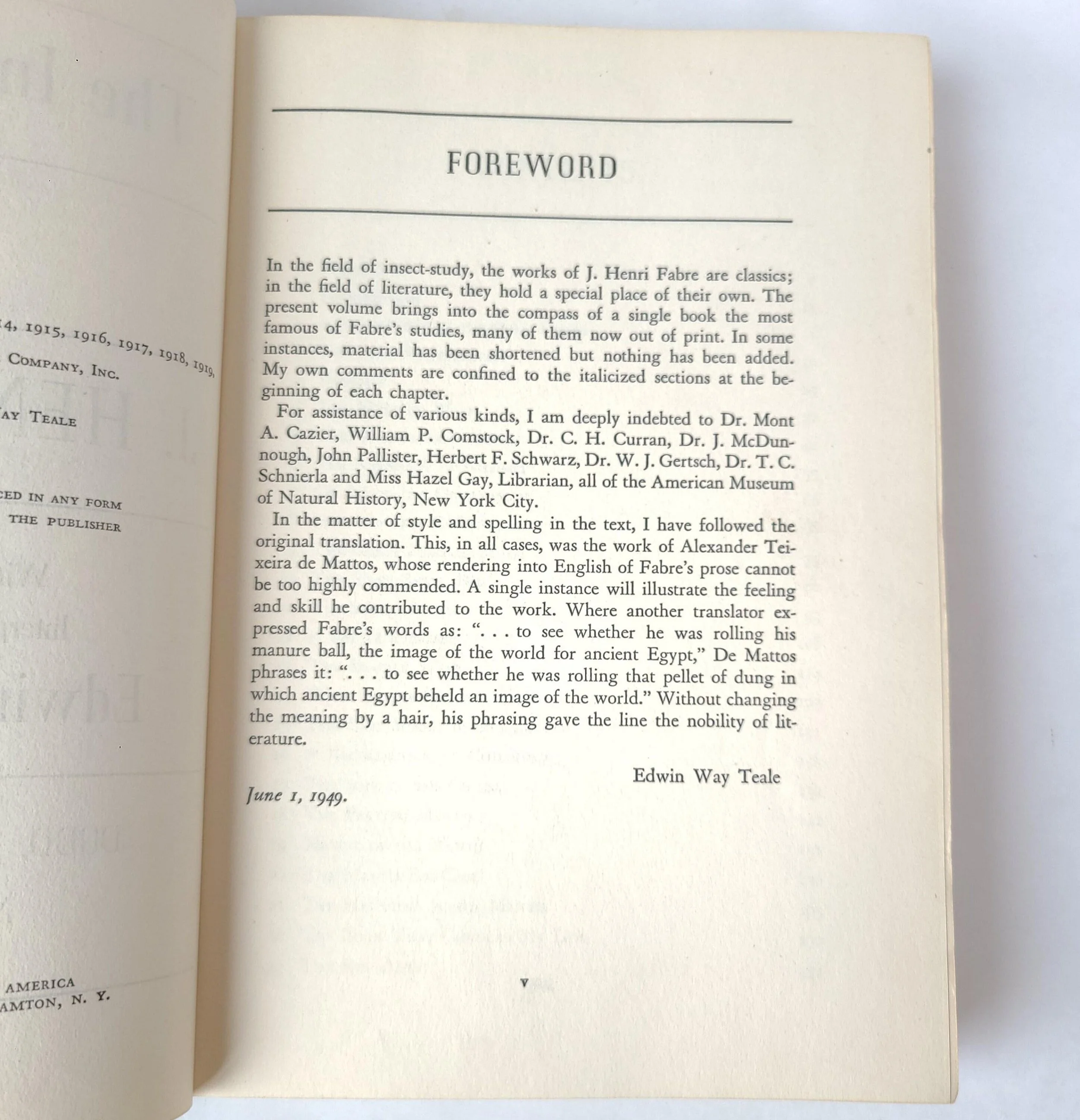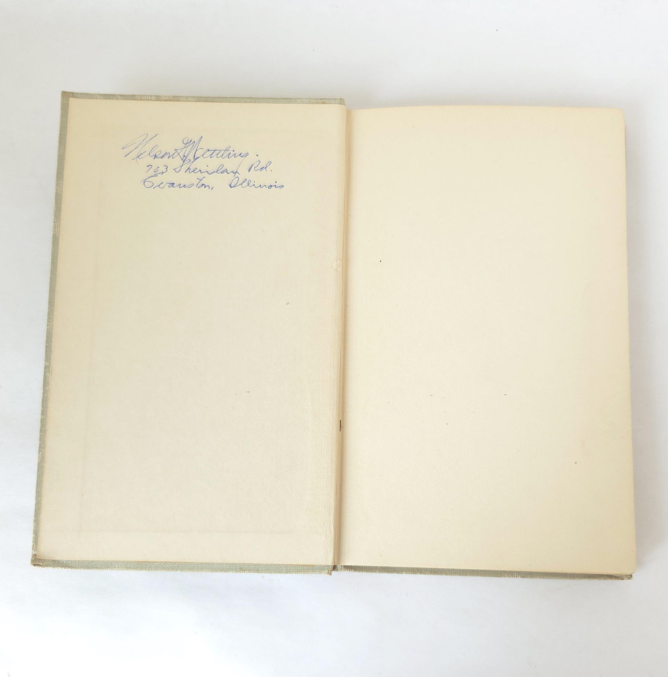 The book is in antique condition with the dust jacket missing and some spots, scuffs and color loss to the cloth cover, as well as some wear to the corners. The original owner's information is written inside the front cover and there is a creased corner to one interior page. At the center of the book there is a crack along the spine that reveals some of the glue, but the binding itself feels solid and there are no torn or missing pages.