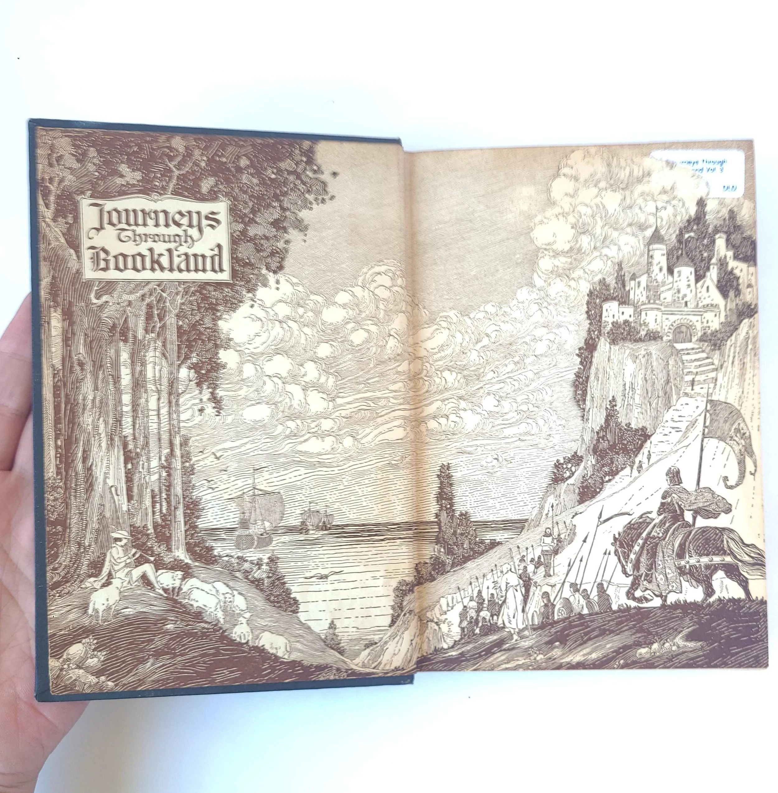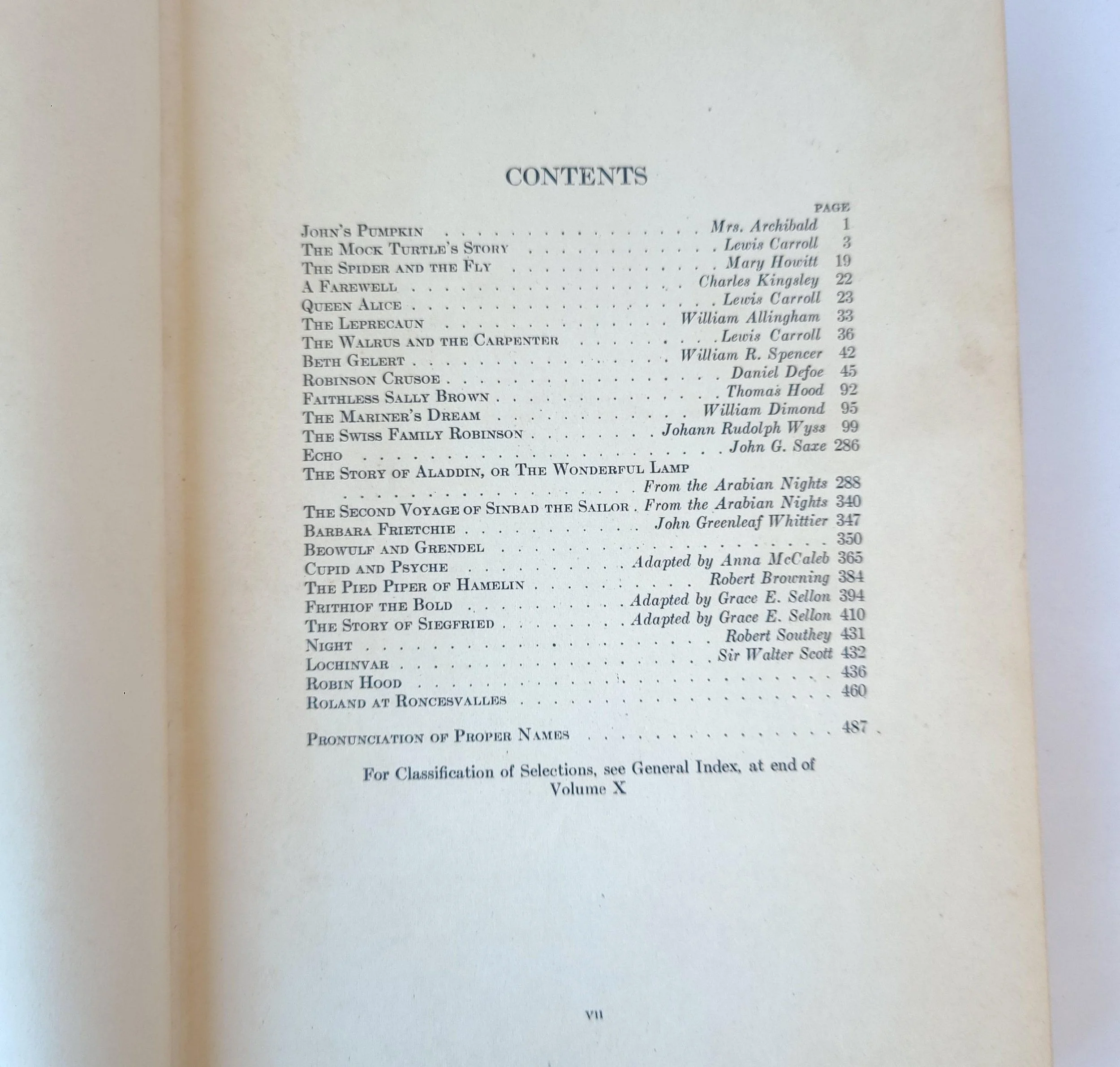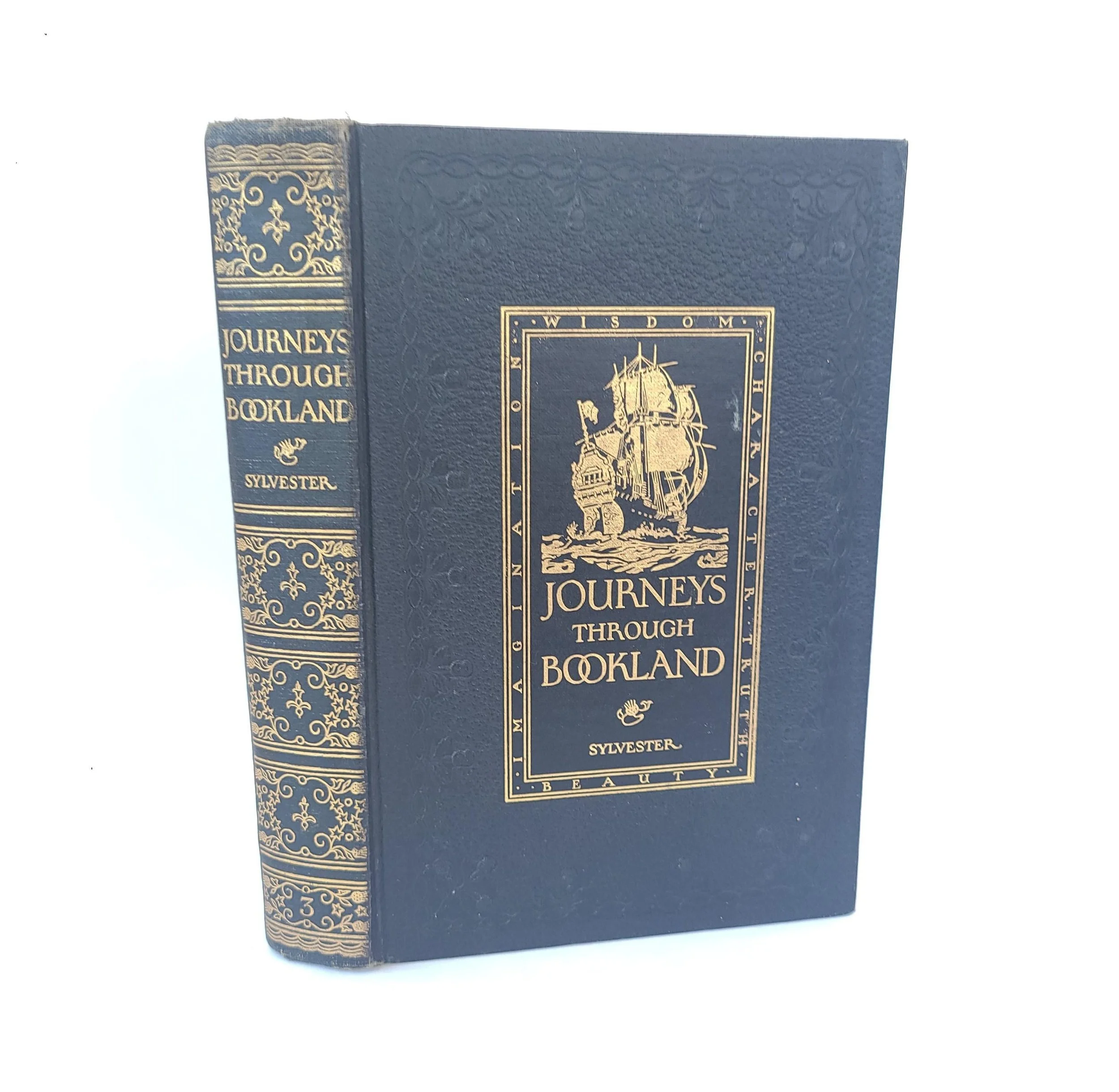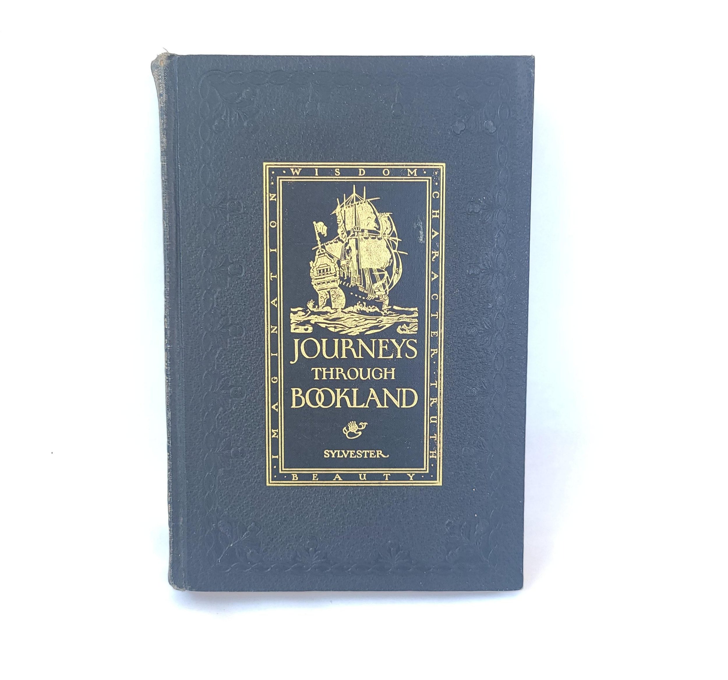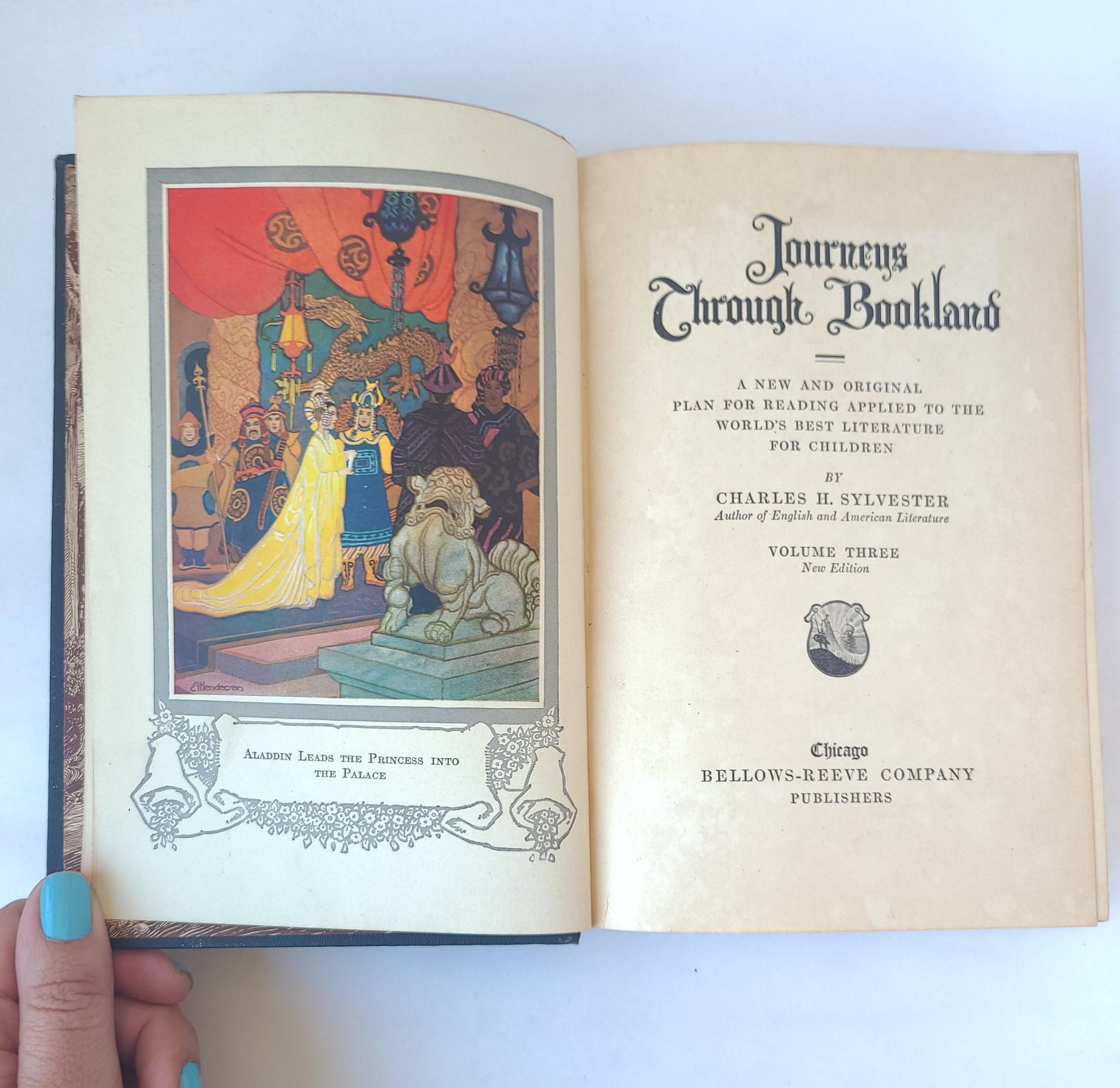 This gorgeous antique 1922 edition of Journeys Through Bookland Volume 3 - A New and Original Plan For Reading Applied to The World's Best Literature for Children was edited by Charles H. Sylvester and published by the Bellows-Reeve Company. Featured in this book are excerpts of classics including Robinson Crusoe, Alice in Wonderland, Robin Hood, The Story of Aladdin and many more. The book is in antique condition with the dust jacket missing and some minor wear to the edges of the cover. There are remnants of a sticker on the front end page as well as some spots of discoloration, small tears and creases throughout the book - but the binding is solid and the book has good overall color quality - especially the beautiful illustrations.