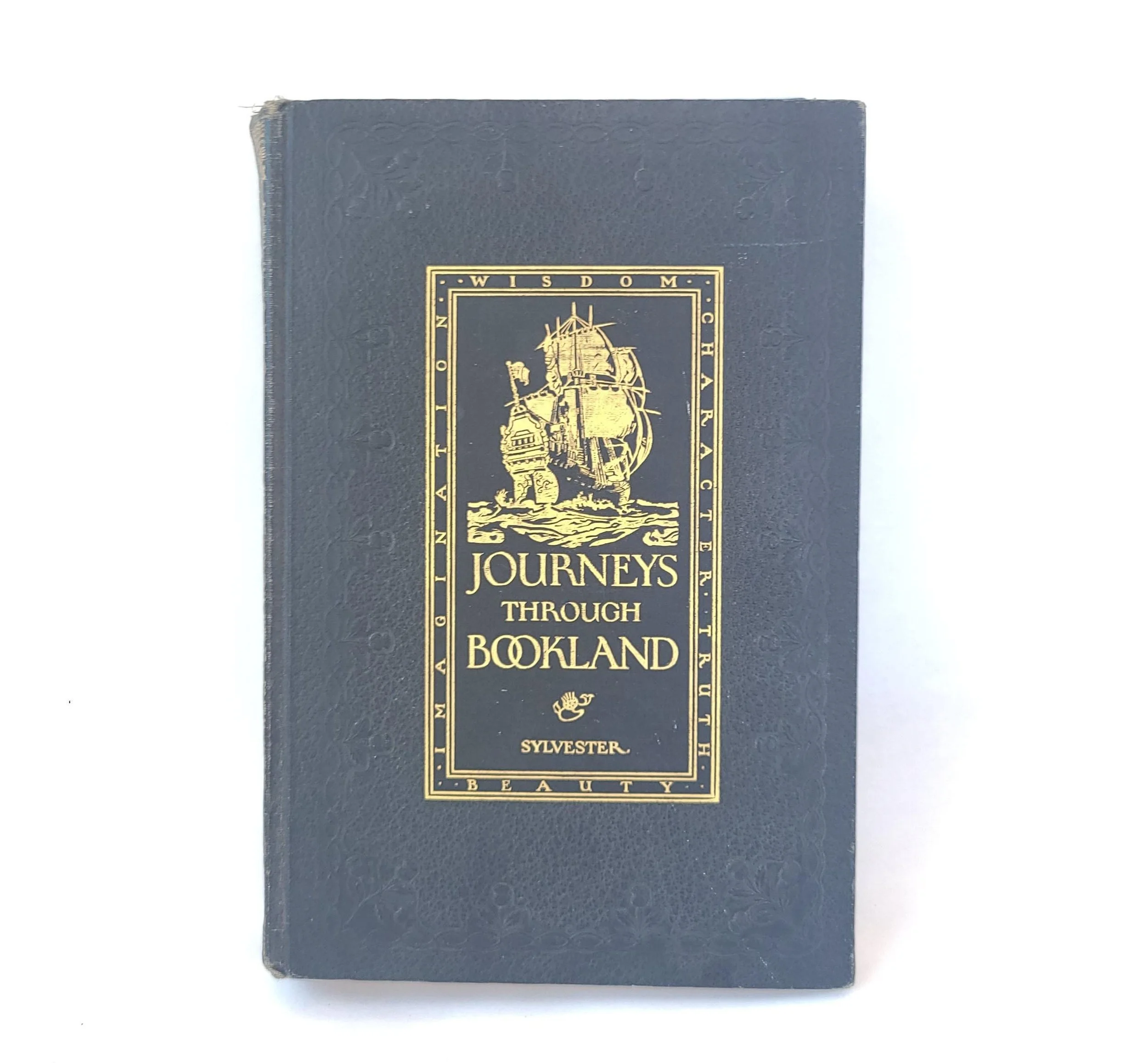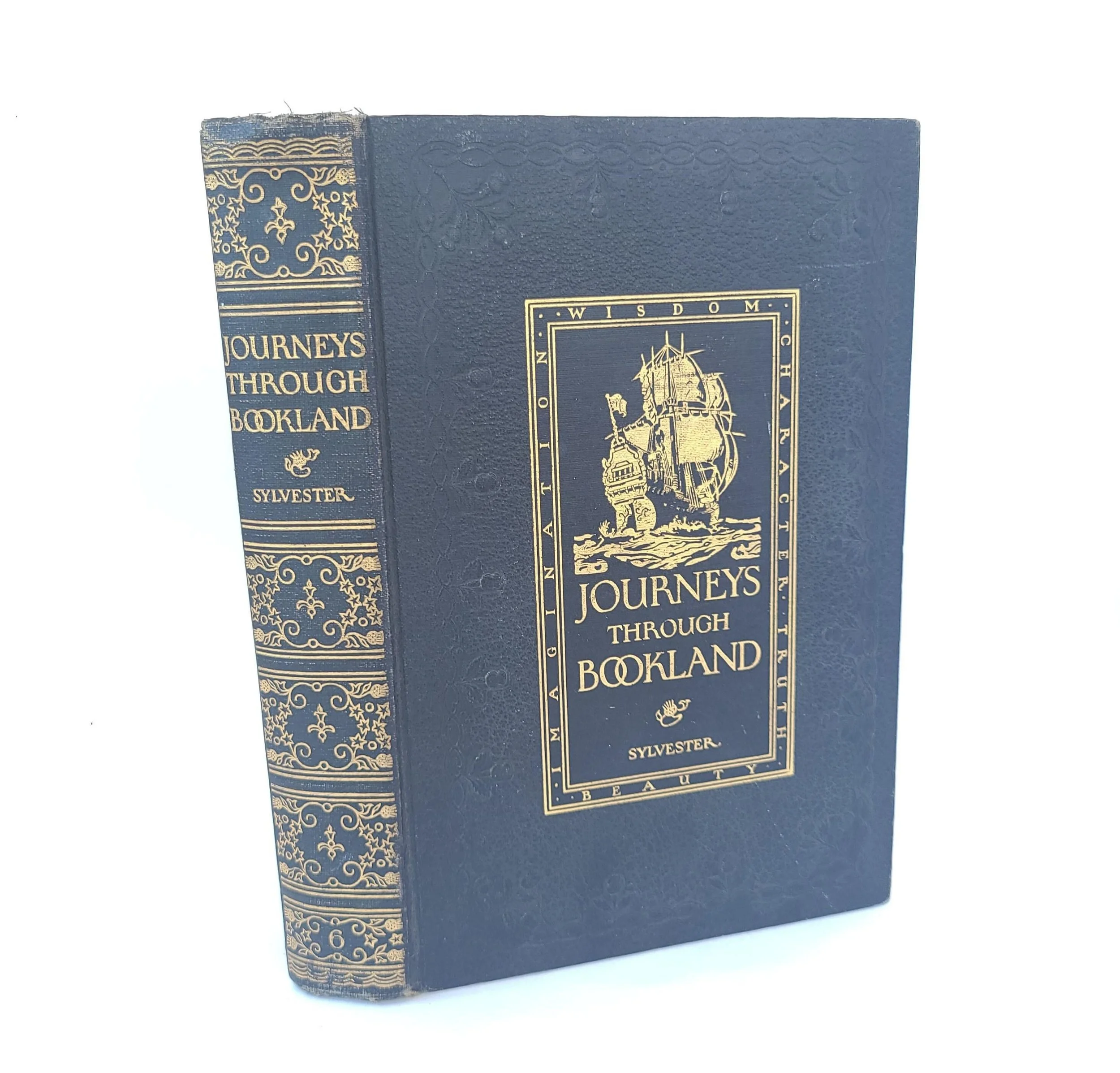 This gorgeous antique 1922 edition of Journeys Through Bookland Volume 6 - A New and Original Plan For Reading Applied to The World's Best Literature for Children was edited by Charles H. Sylvester and published by the Bellows-Reeve Company. Featured in this book are excerpts of classics including Elephant Hunting, The Christmas Carol, Poor Richard's Almanac and many more. The book is in antique condition with the dust jacket missing and some minor wear to the edges of the cover. There are remnants of a sticker on the front end and some spots of discoloration, small tears and creases throughout the book - but the binding is solid and the book has good overall color quality - especially the beautiful illustrations.