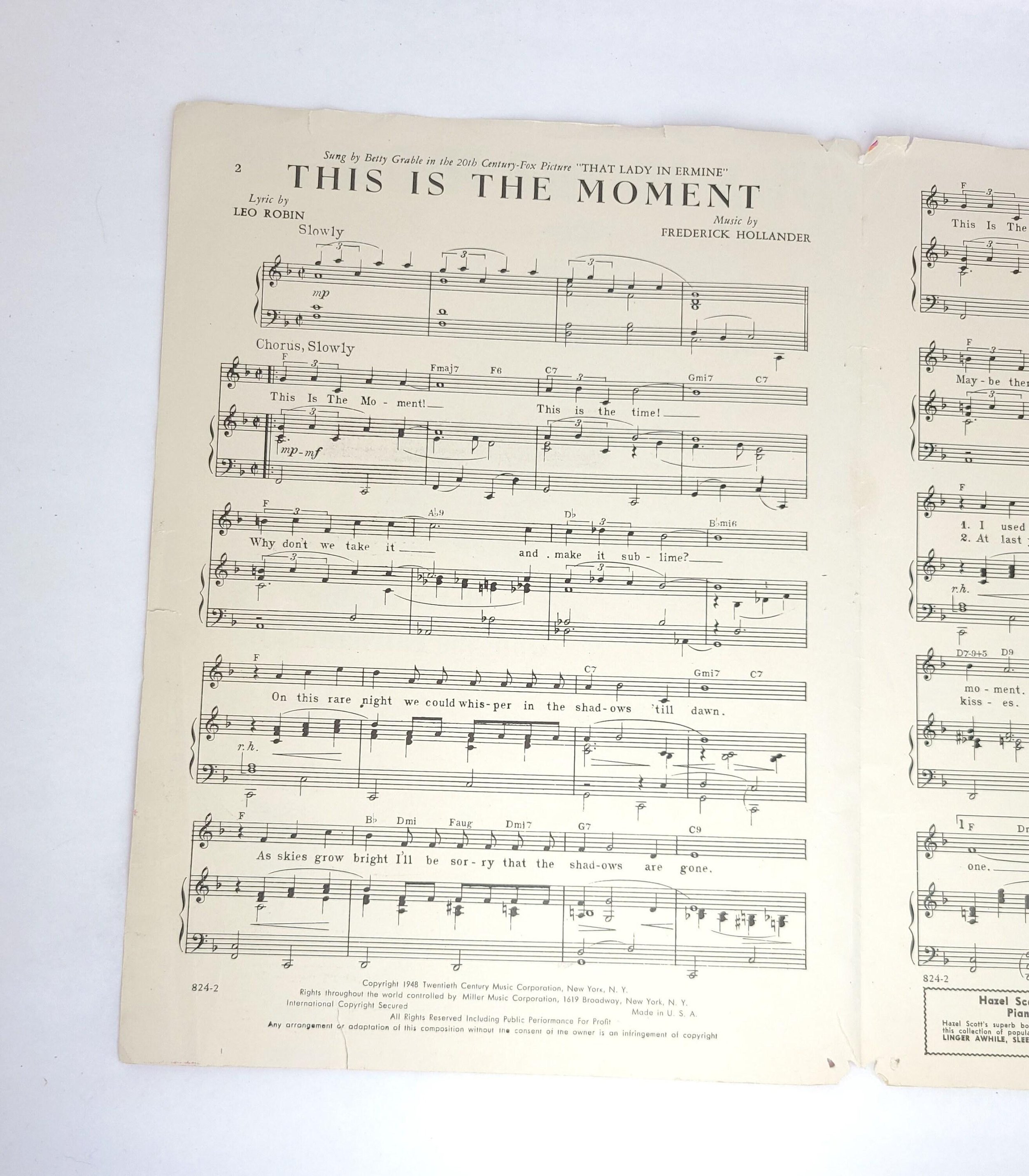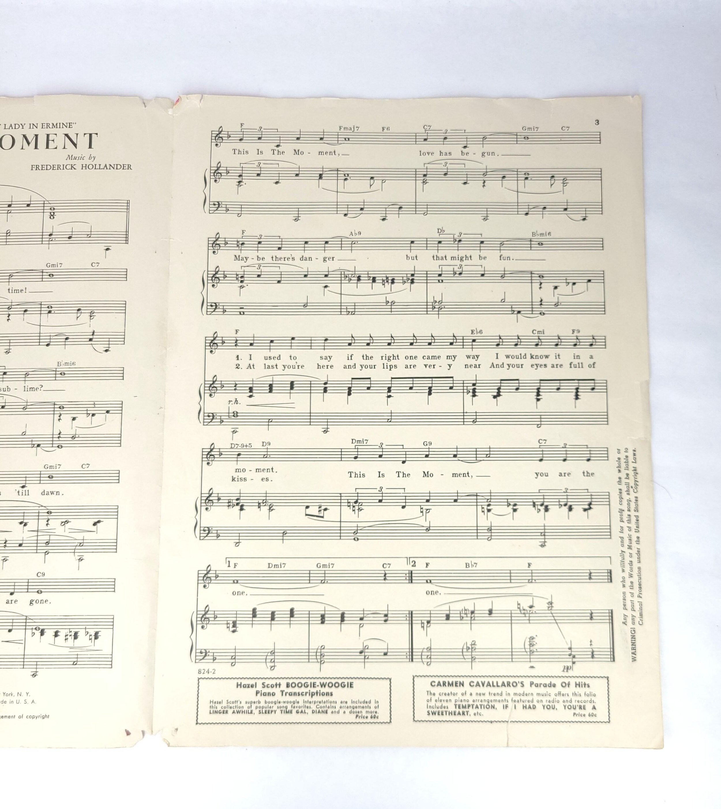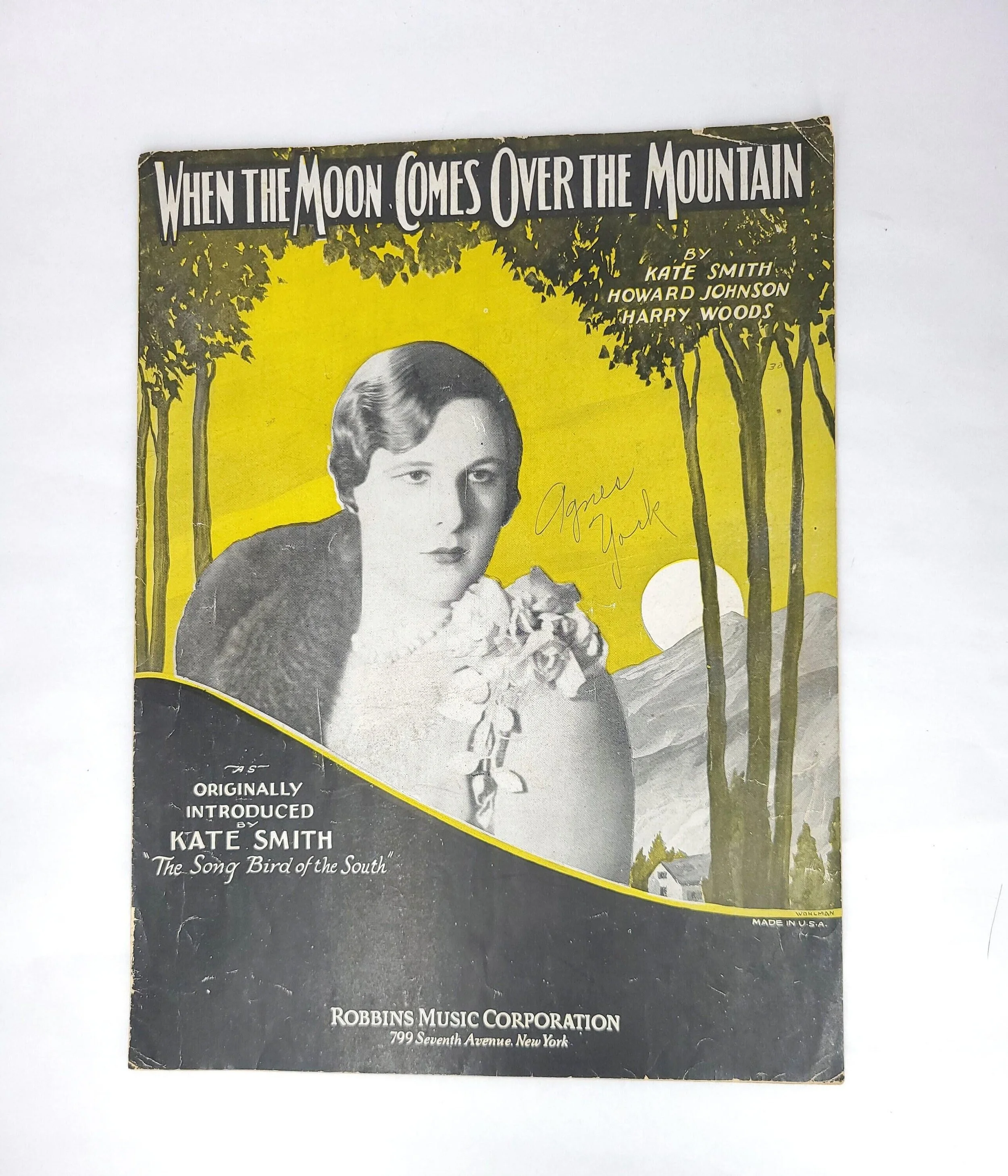 This is vintage 1931 sheet music for the song When The Moon Comes Over The Mountain made famous by the singer Kate Smith. It includes all the music and lyrics for this song. The booklet is in used vintage condition with a small tear to the edge, wear and scuffing to the cover along with the original owner's name written on the front. The inside has no marks on the music.