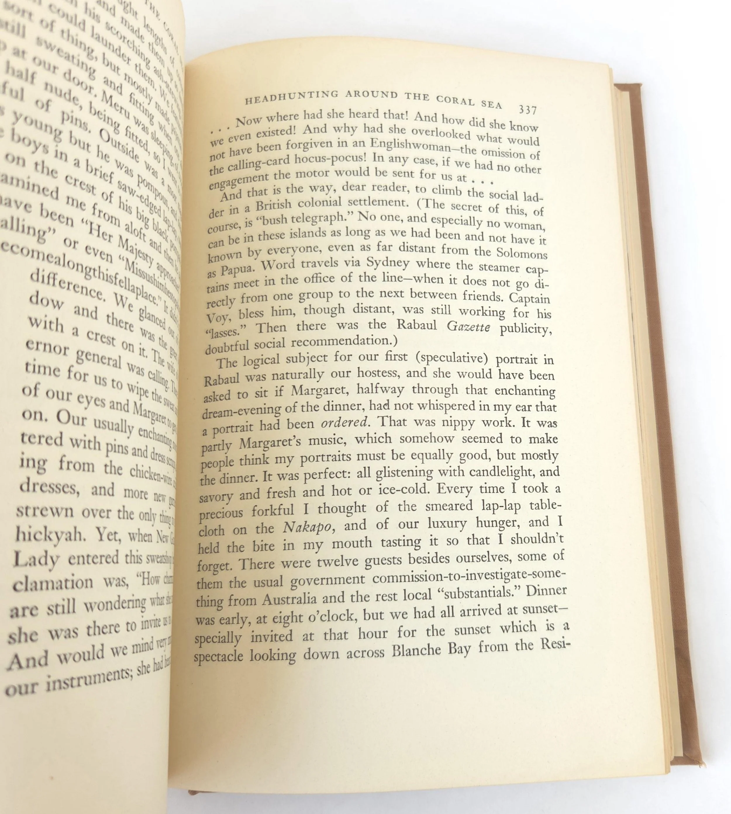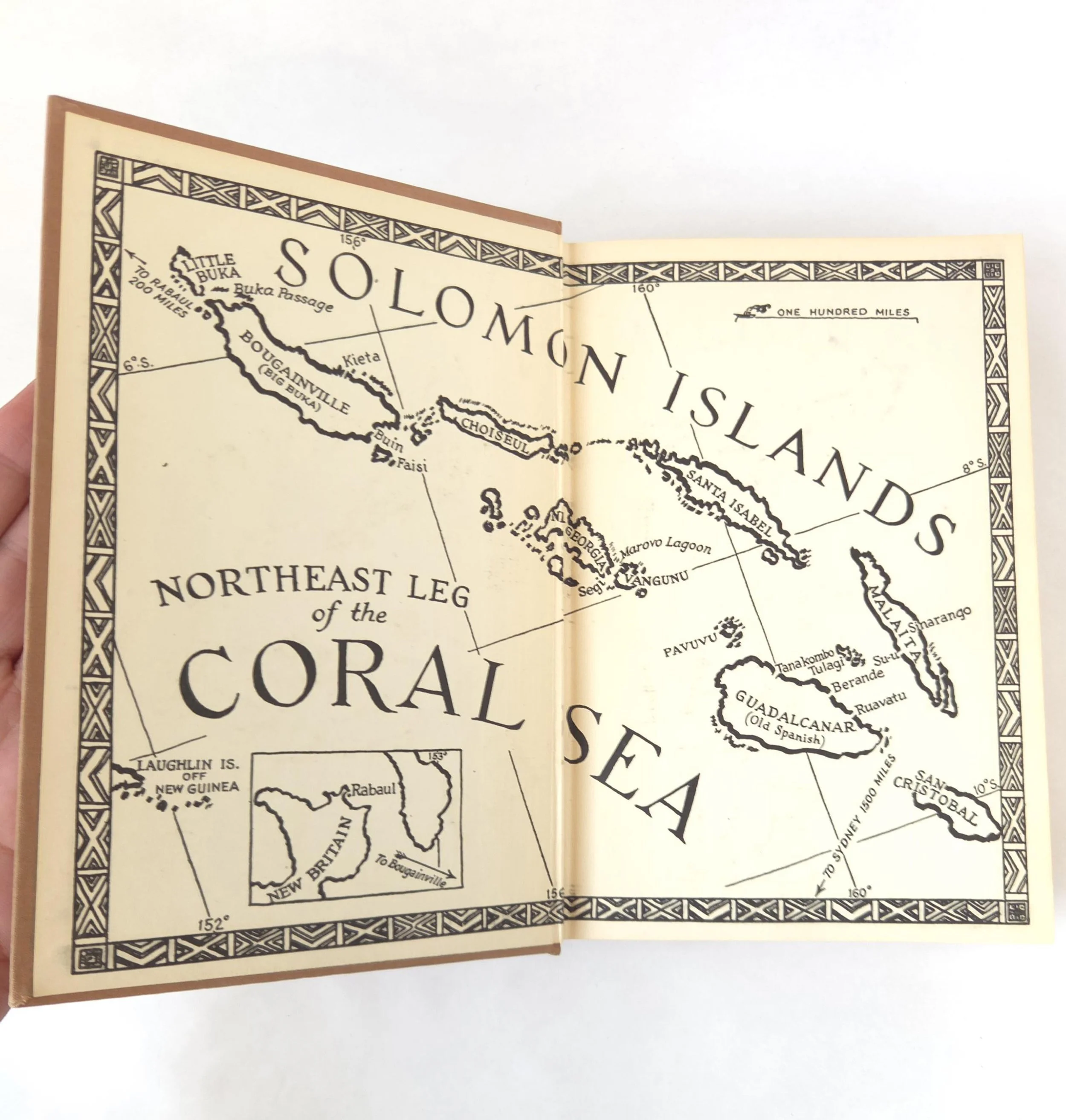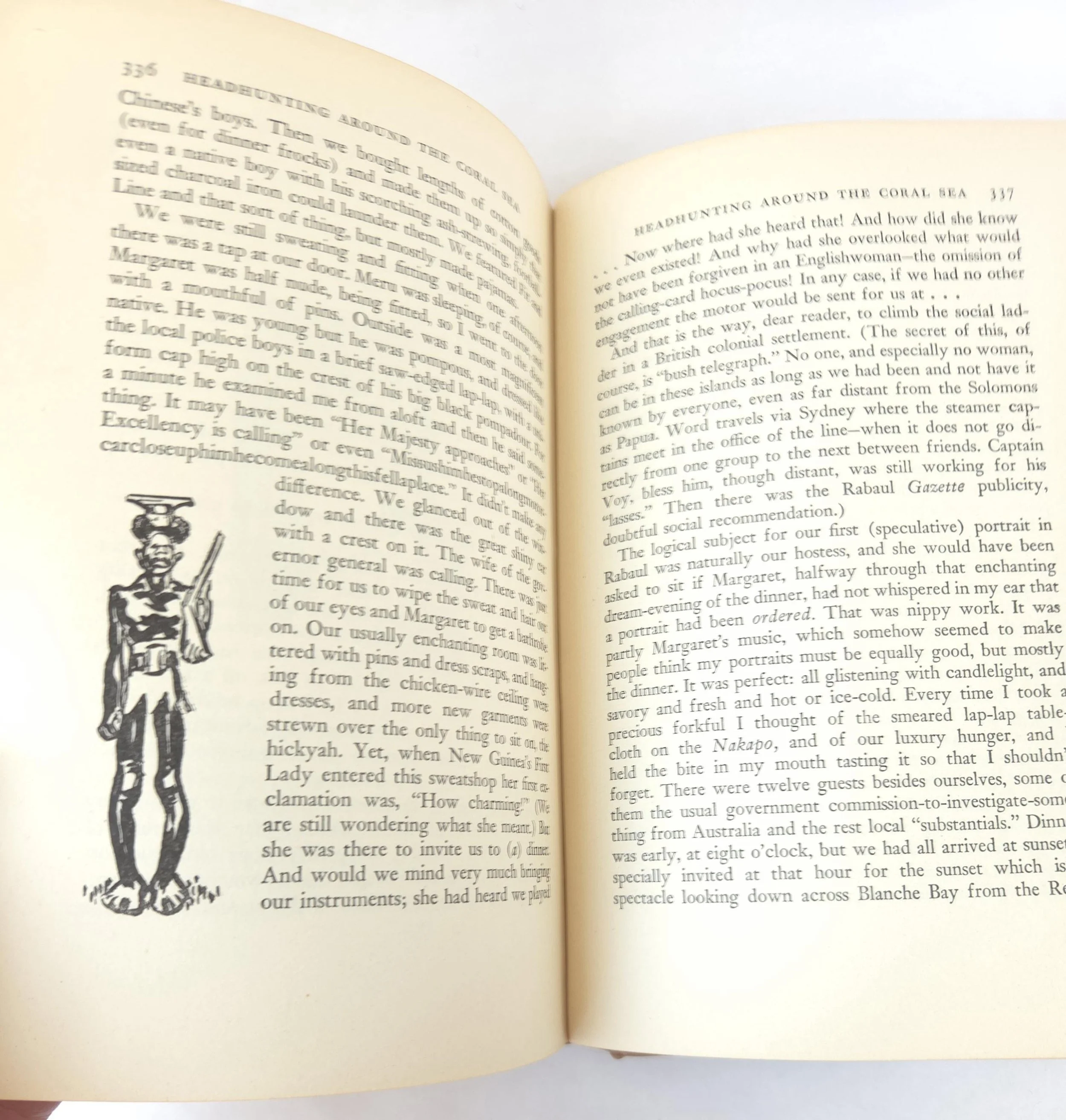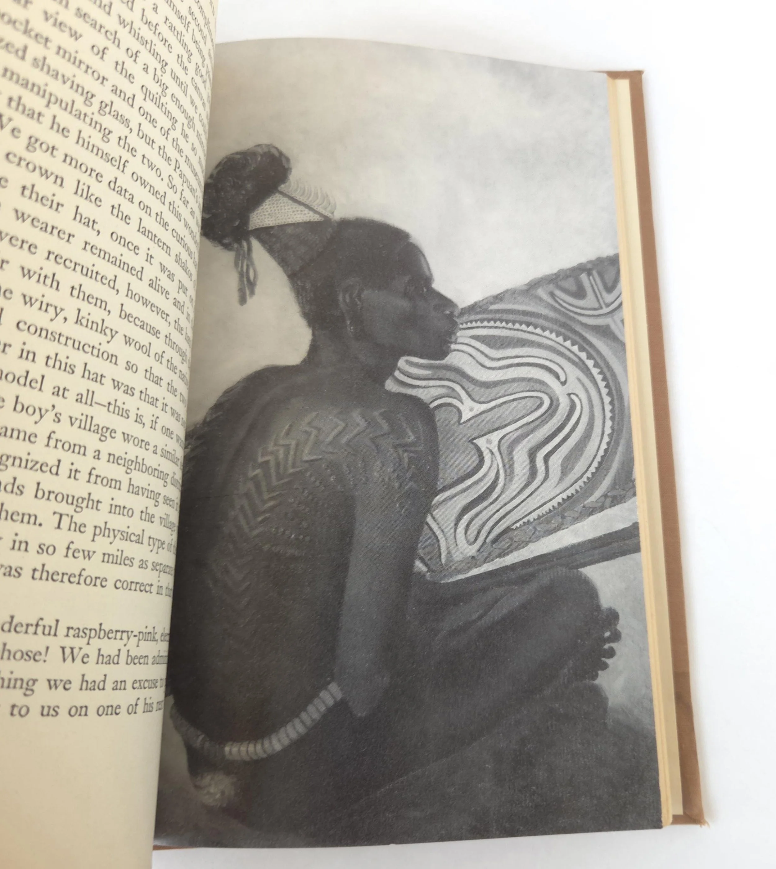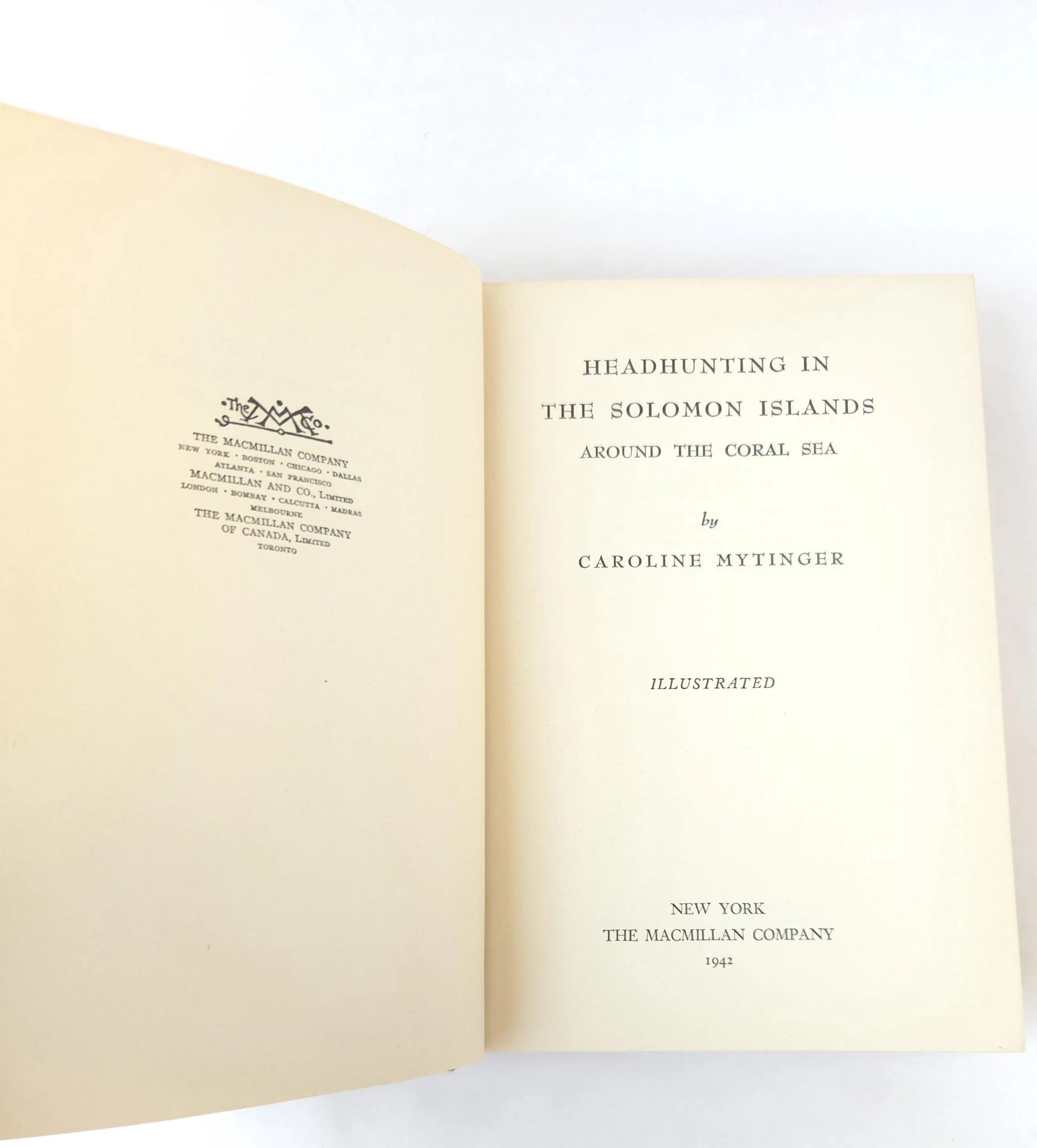 This fascinating vintage 1942 hardcover edition of Headhunting in The Solomon Islands: Around The Coral Sea by was written by Caroline Mylinger. It tells the story famous portrait artist, Mylinger and her childhood friend Margaret Warner, who set out by freighter from San Francisco with little more than $400 in their pocket and a tin of paints to their name. Their objective was to paint portraits of the tribal people of Papua New Guinea and the Solomon Islands before the encroachment of modern, European-style culture changed their lives forever. This gripping book tells of the two women's experiences whilst travelling through Melanesia between 1926 and 1930. This copy is in used vintage condition with the dust jacket missing and some wear to the edges of the cloth cover. There are a couple of spots of discoloration to the front end pages, but there are no marked or torn inner pages and excellent overall color quality.
