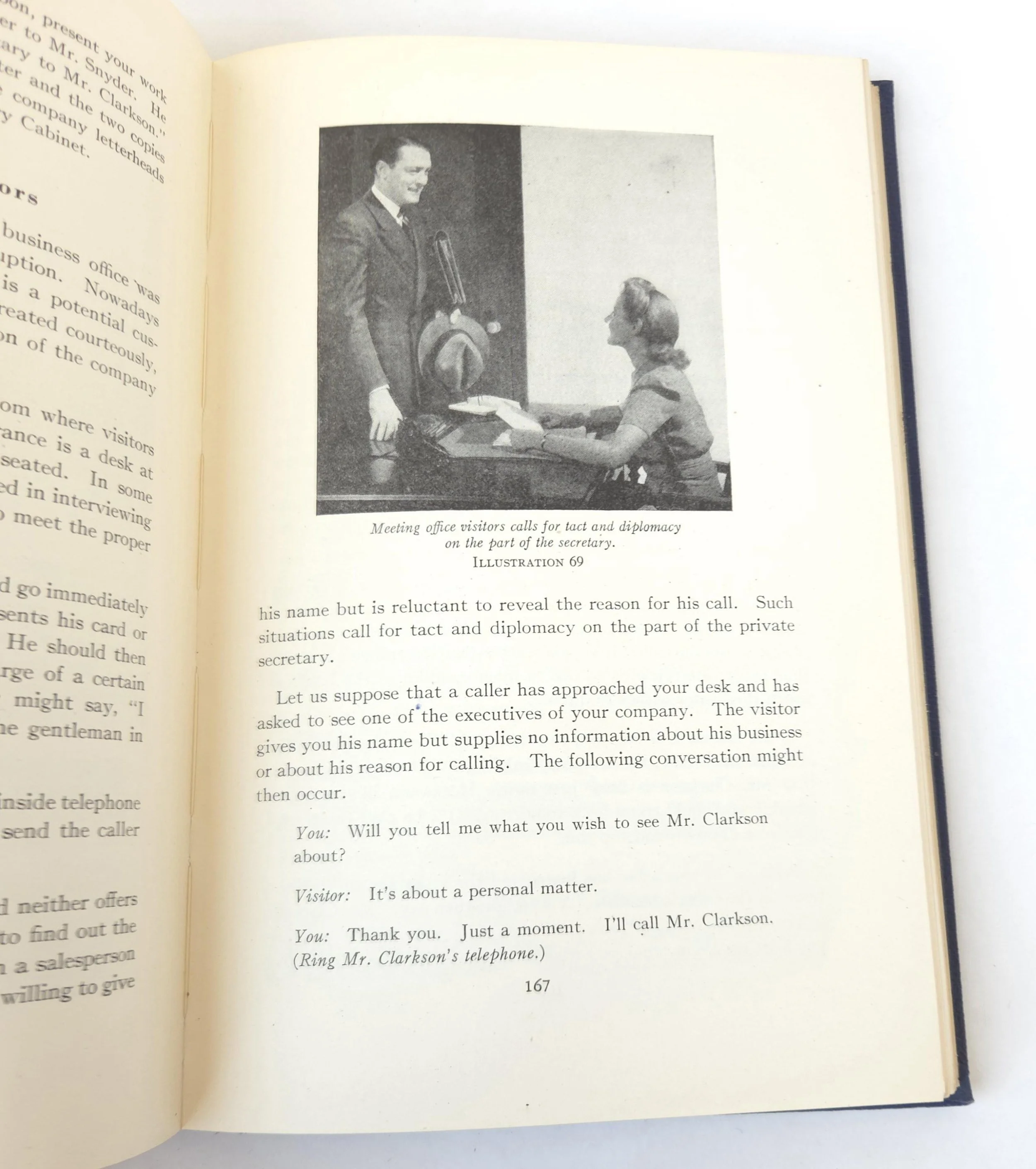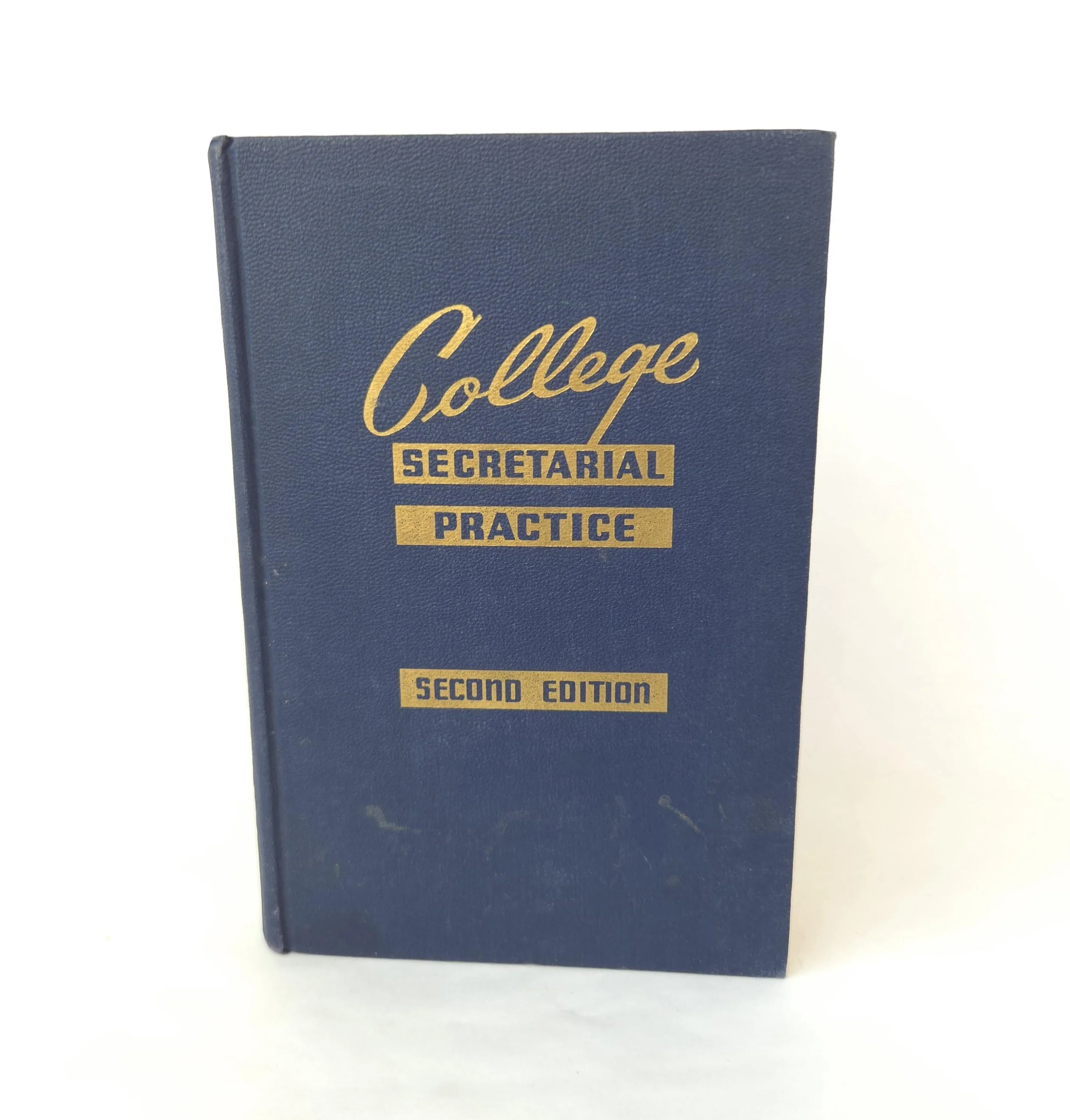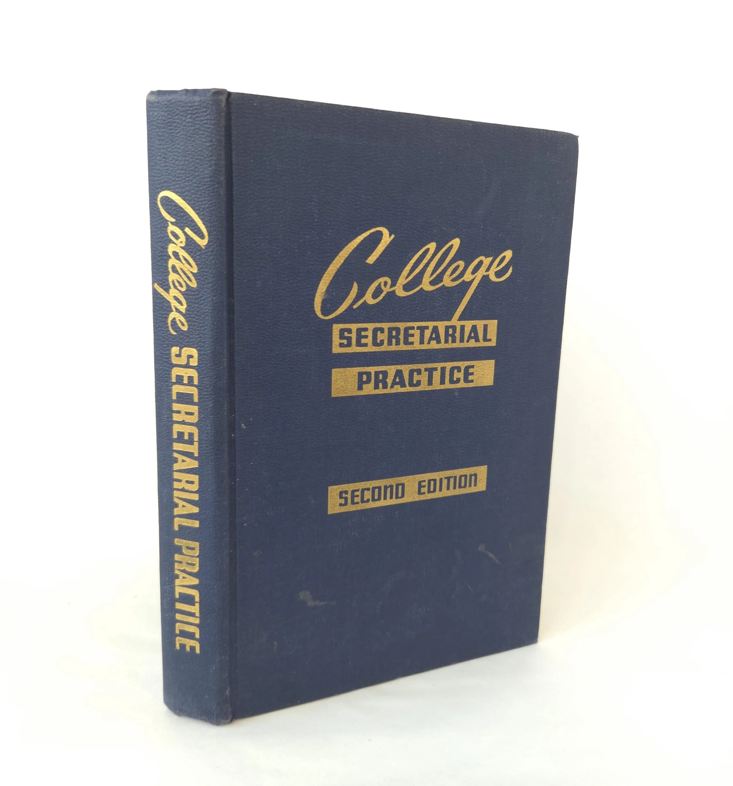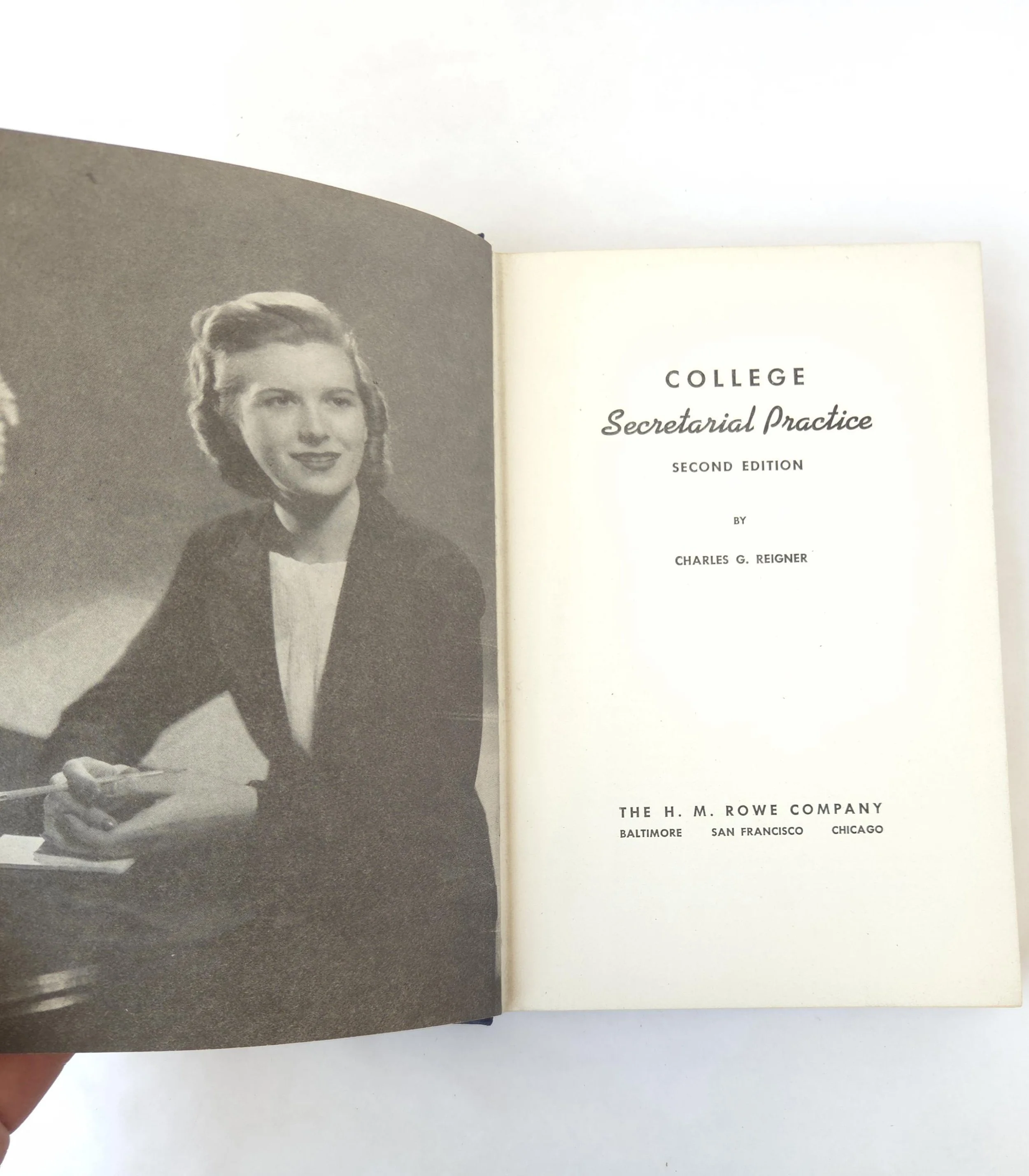 This charming vintage 1946 hardcover edition of College Secretarial Practice (Second Edition) was written by Charles G. Reigner. It is a course in the skills one needs to get a secretarial position, with tips on stenographic and general office work. This copy is in good used vintage condition with the dust jacket missing and some minor discoloration to the front cover. The original owner's name is written on the front end page and there are some pencil notes on a couple of pages, but there are no torn pages and the binding is solid.