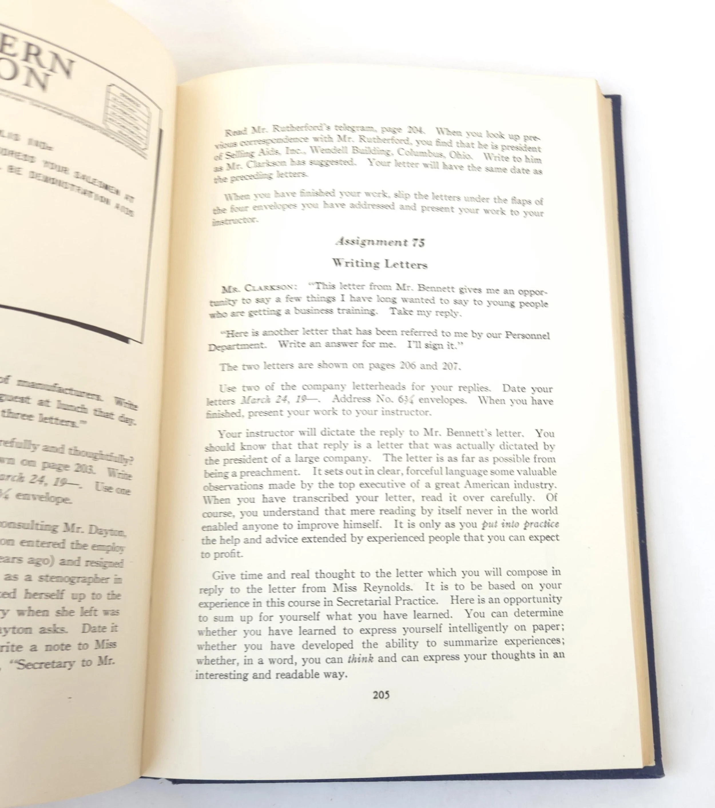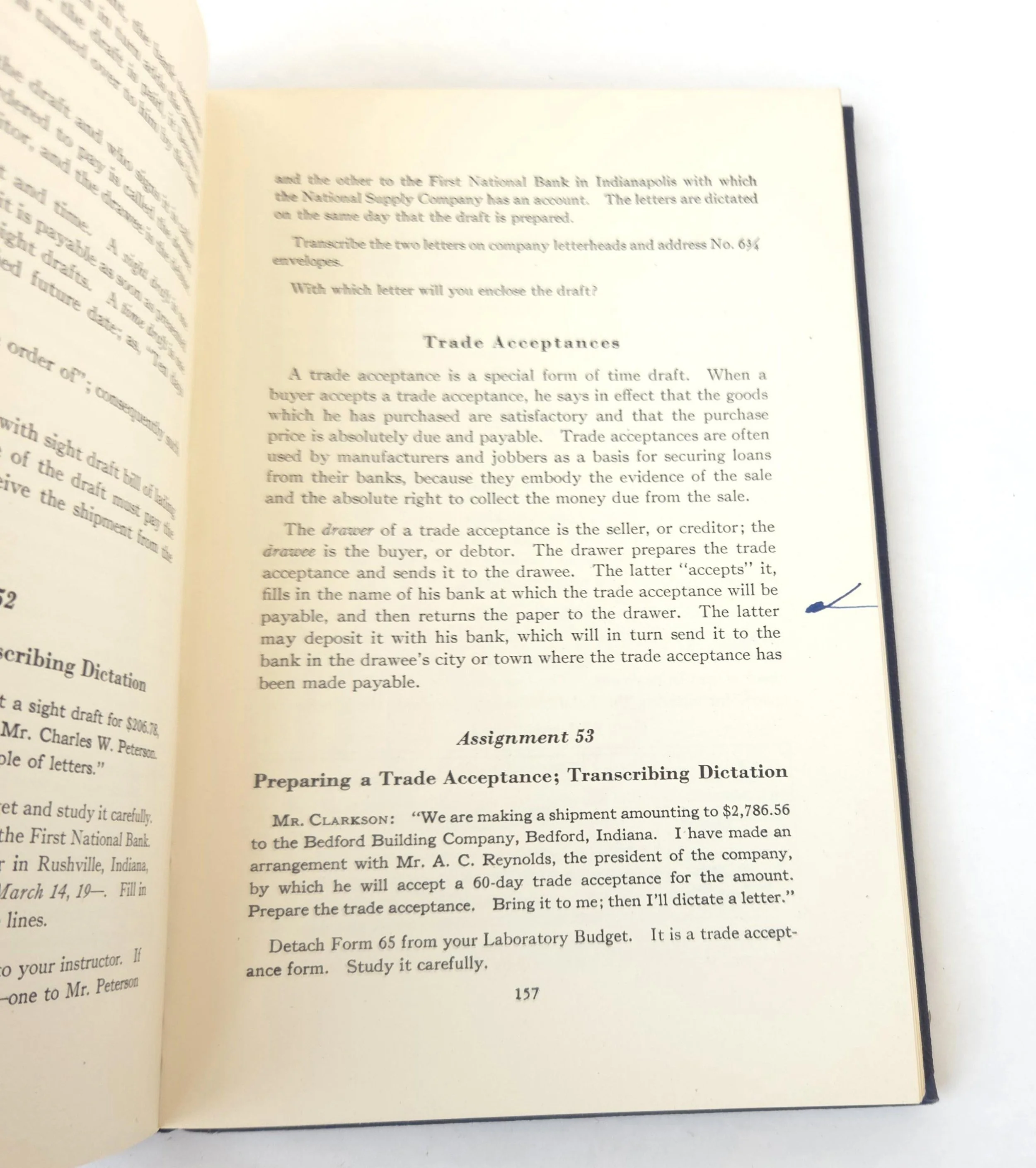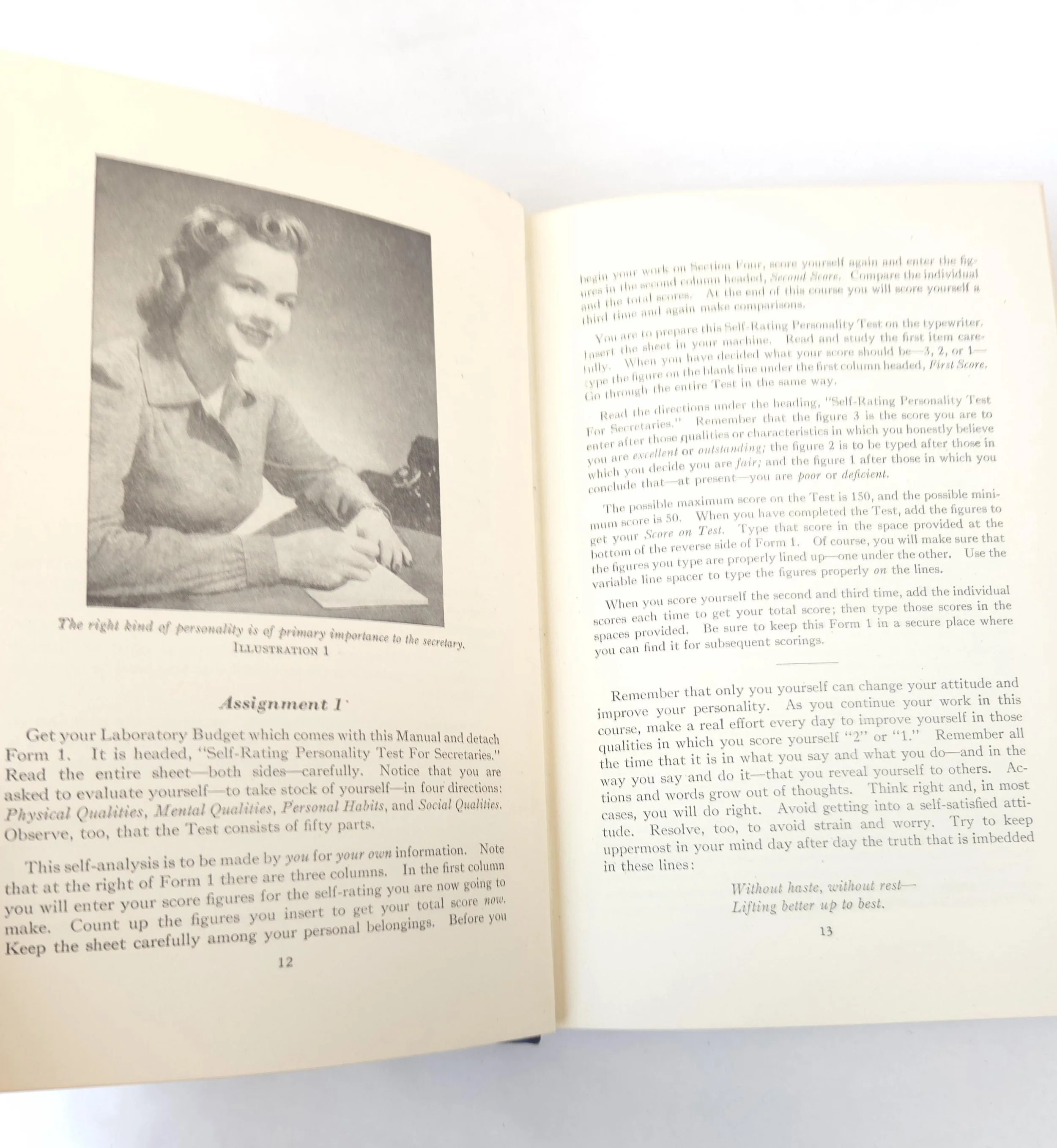 This charming vintage 1946 hardcover edition of College Secretarial Practice (Second Edition) was written by Charles G. Reigner. It is a course in the skills one needs to get a secretarial position, with tips on stenographic and general office work. This copy is in good used vintage condition with the dust jacket missing and some minor discoloration to the front cover. The original owner's name is written on the front end page and there are some pencil notes on a couple of pages, but there are no torn pages and the binding is solid.