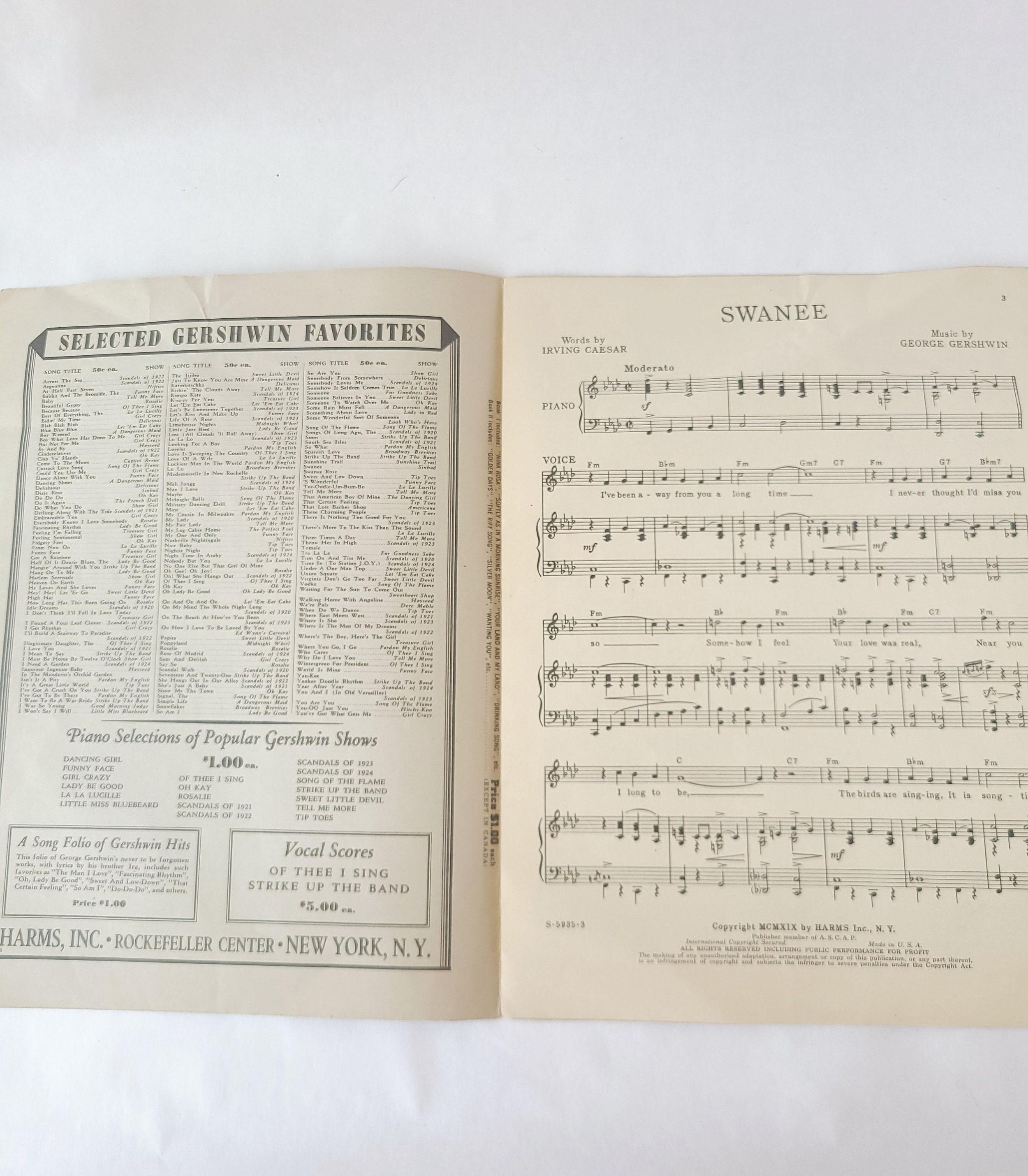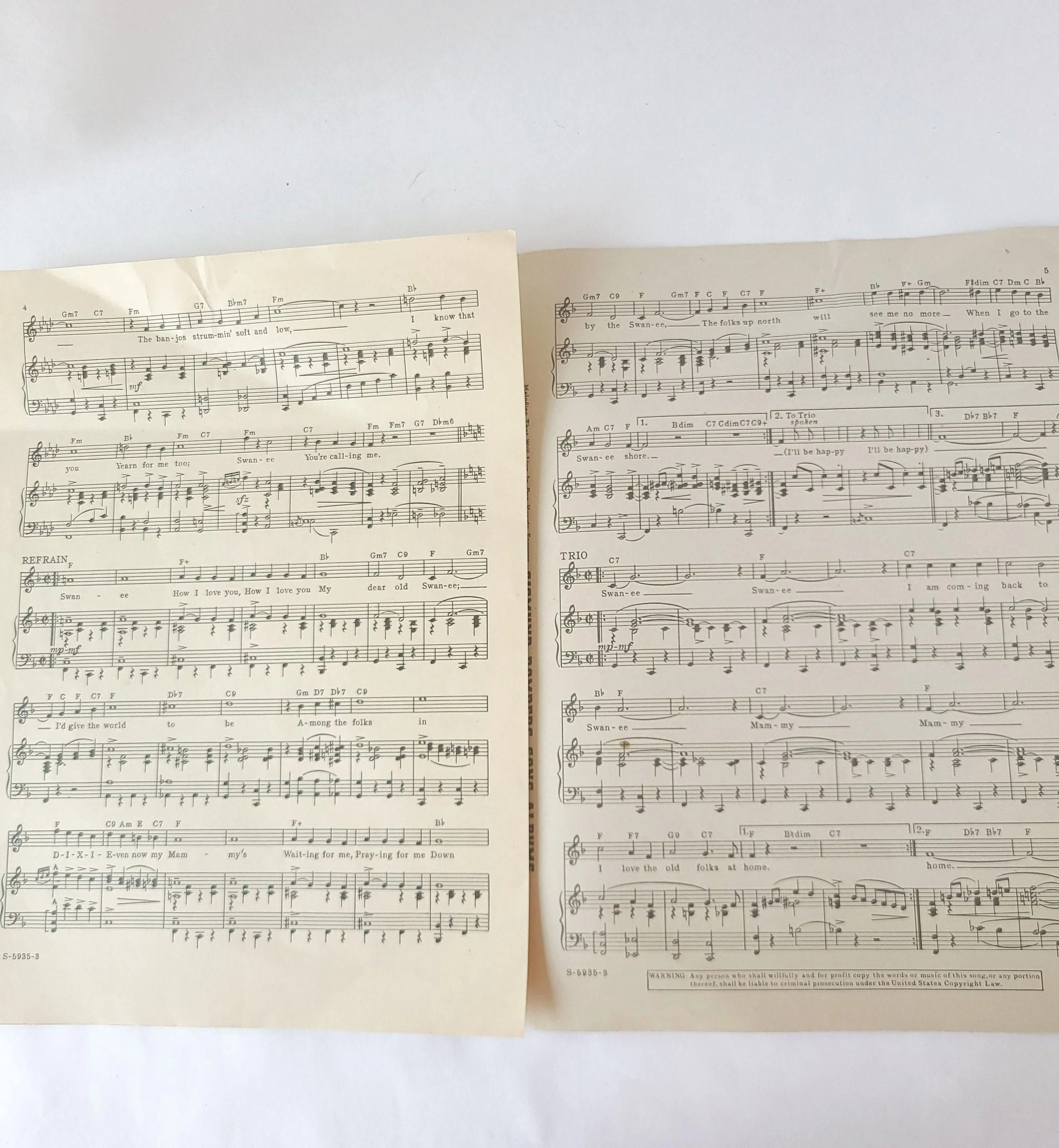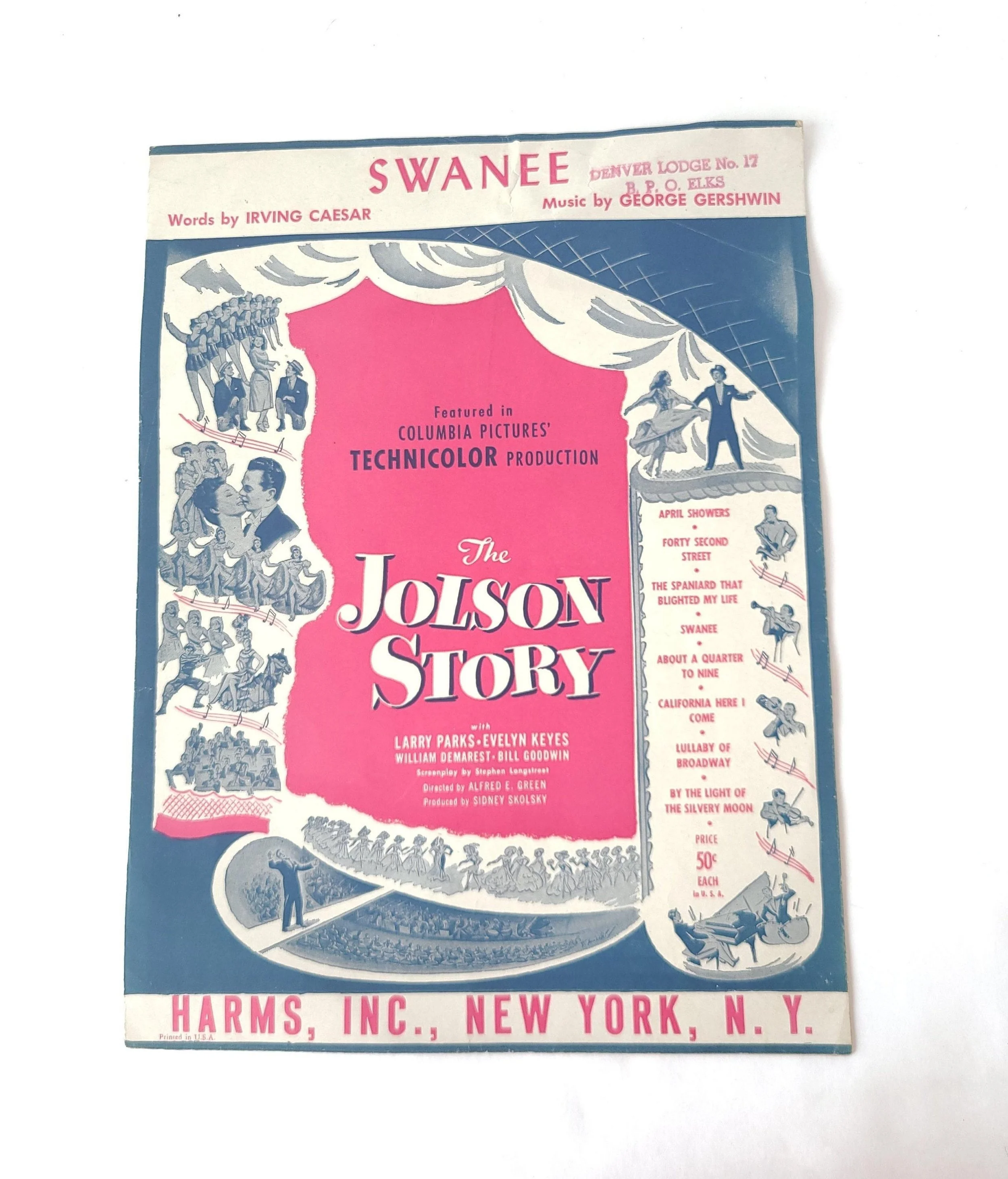 This is vintage sheet music for the song Swanee from the film The Jolson Story. It includes all the music and lyrics for this song. The booklet is in used vintage condition with some scratching and wear to the edges of the cover, a stamp on the cover from the original seller, no tears or marks on music.