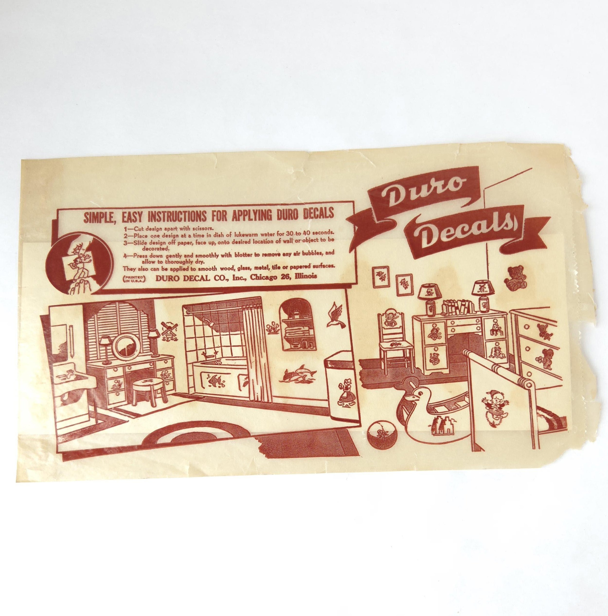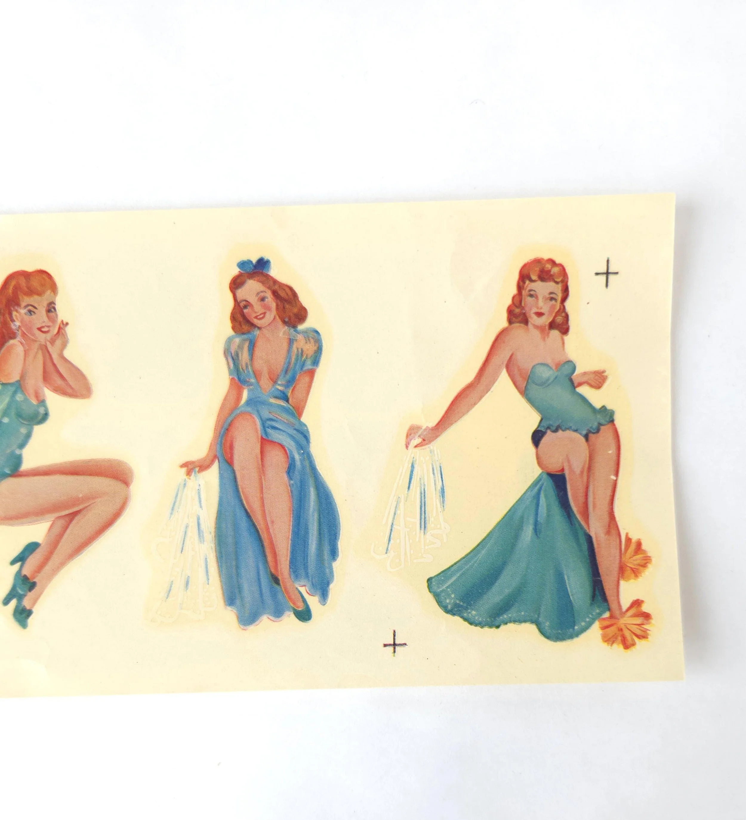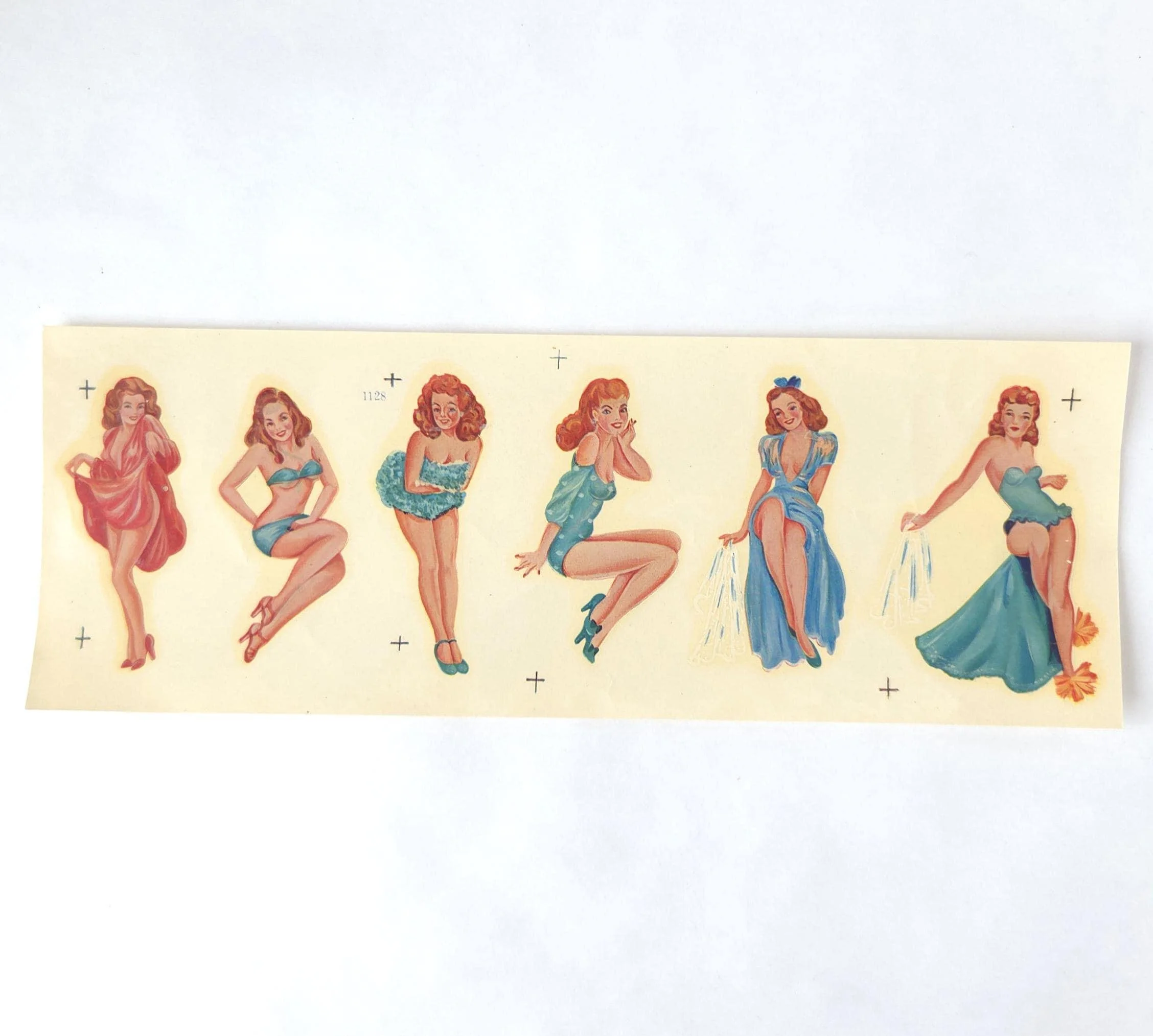 These darling vintage transfers feature 6 different pin-up girls posing in cute little outfits - perfect for adding that touch of sassy vintage charm to your home. They were made by Duro Decal Co and include their original package with instructions, which does have some wear and tear. There are a couple of tiny white spots on one of the girls, but otherwise they are in good condition - ready to use and bring kitschy joy to your life!