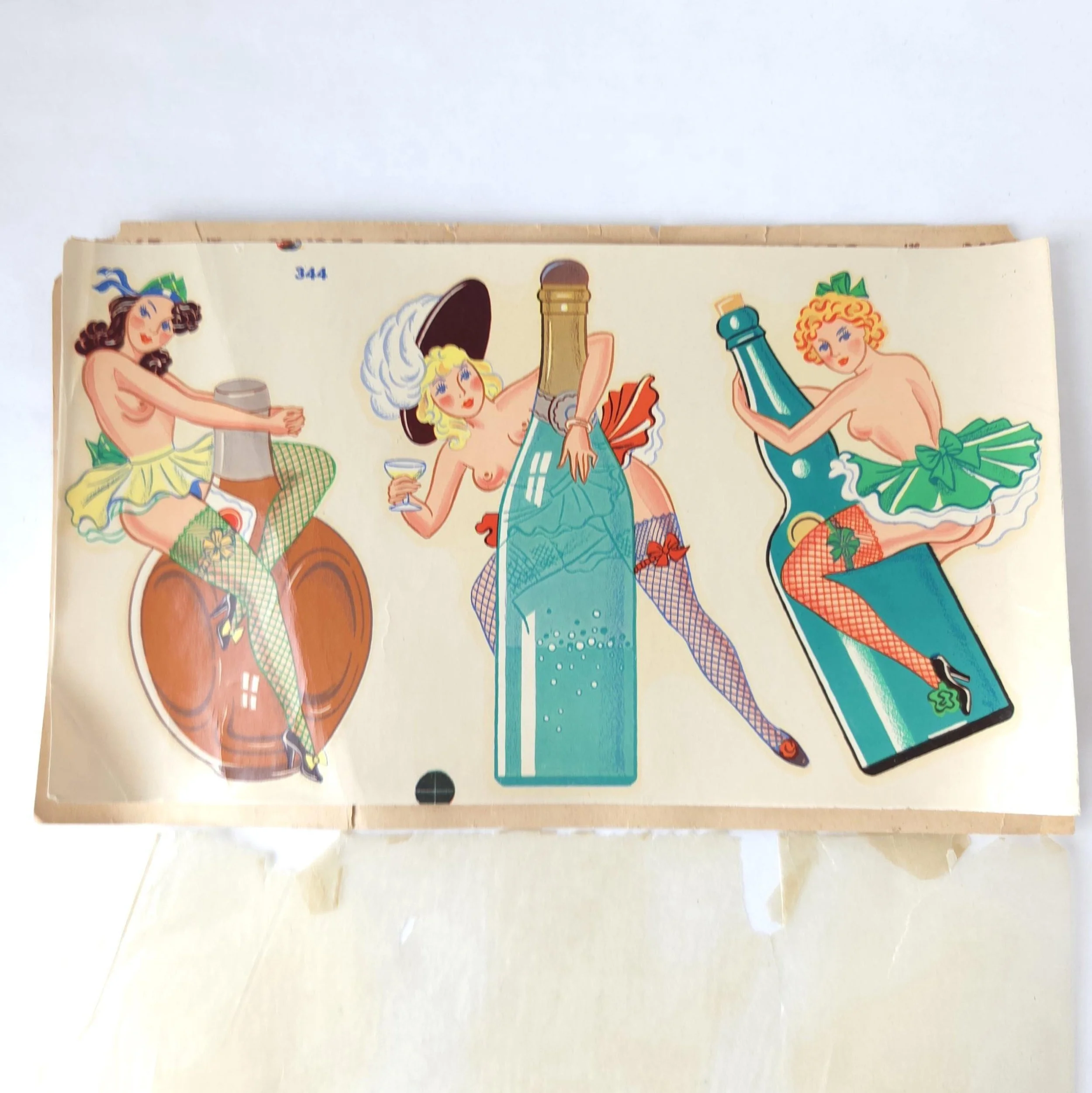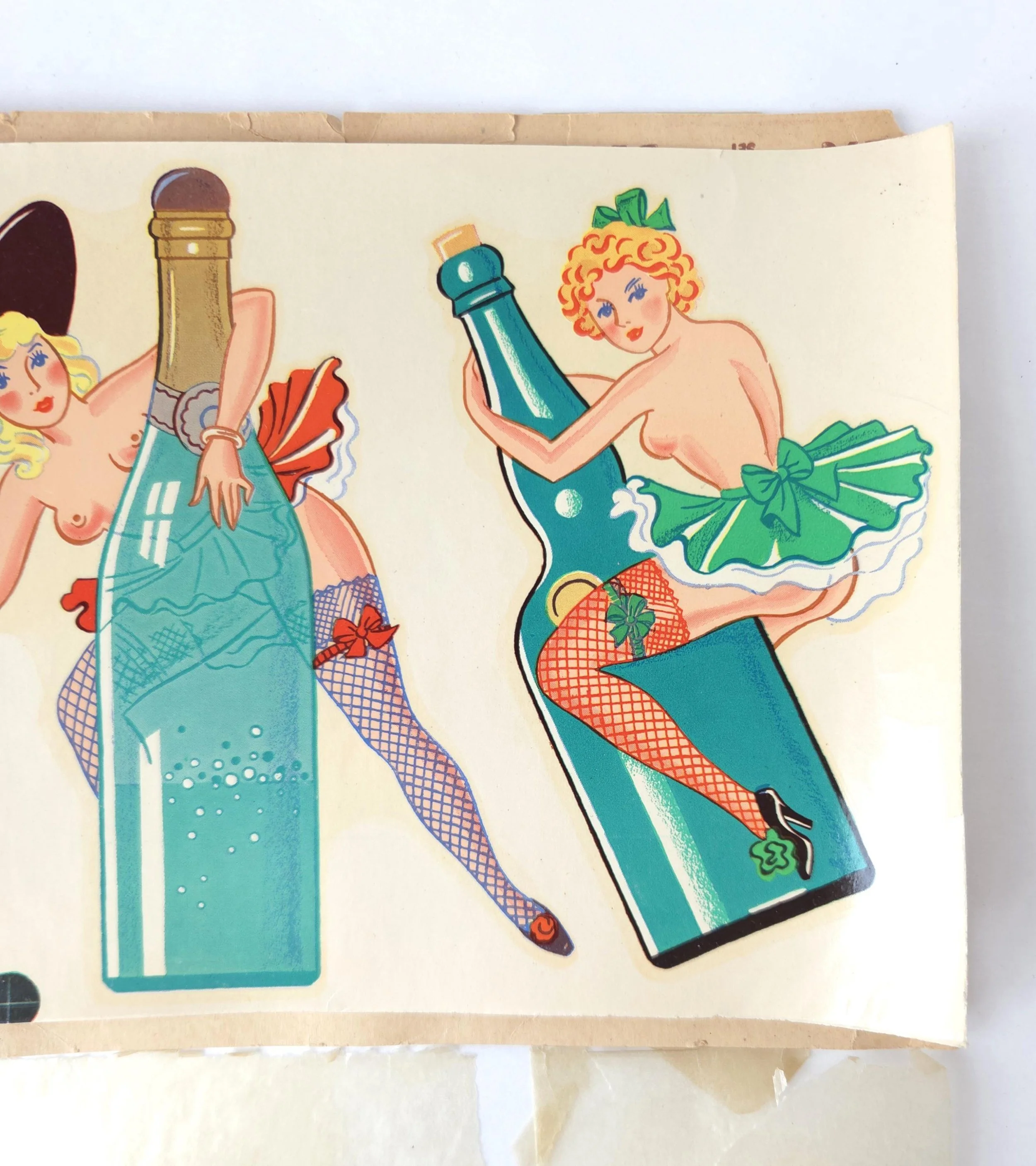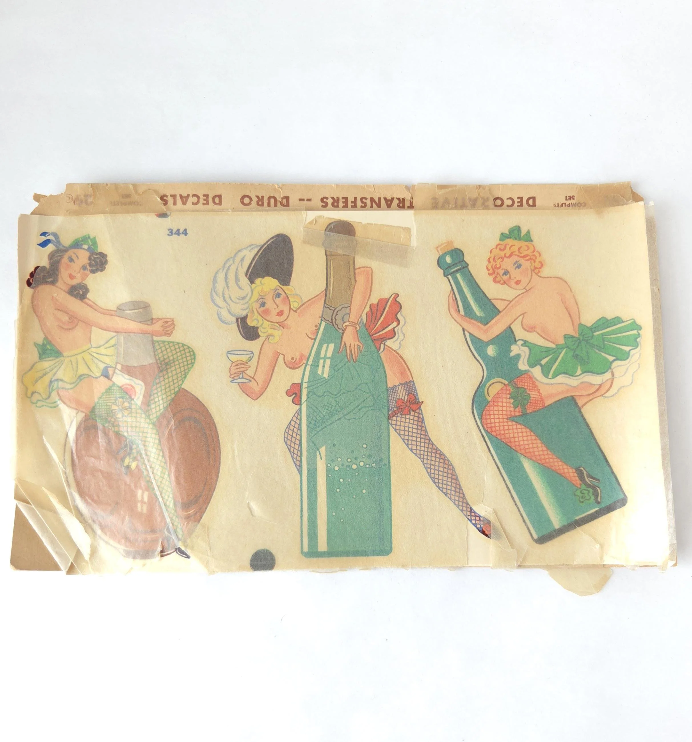 These darling vintage transfers feature 3 different scantily pin up girls wrapped around liquor bottles - perfect for adding that touch of sassy vintage charm to your home. They were made by Duro Decal Co and include their original package with instructions, which does have some wear and tear. There are some spots of crinkling and creasing to the decal page, but the transfers themselves are in good condition - ready to use and bring kitschy joy to your life!