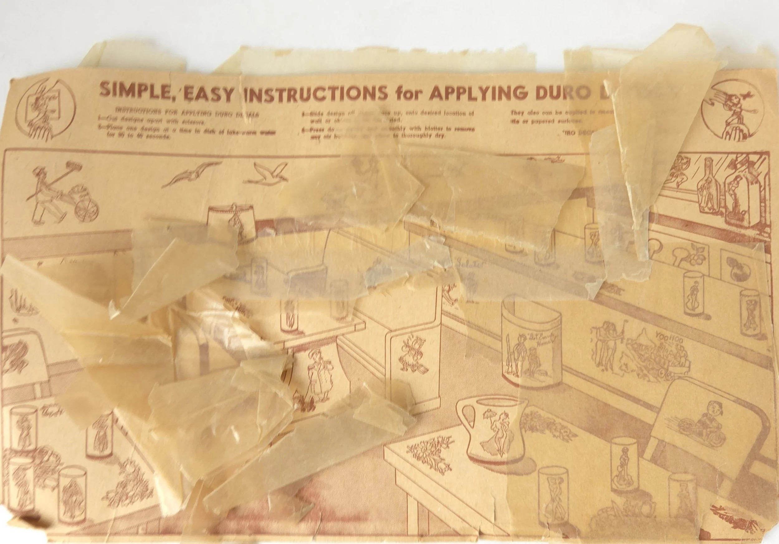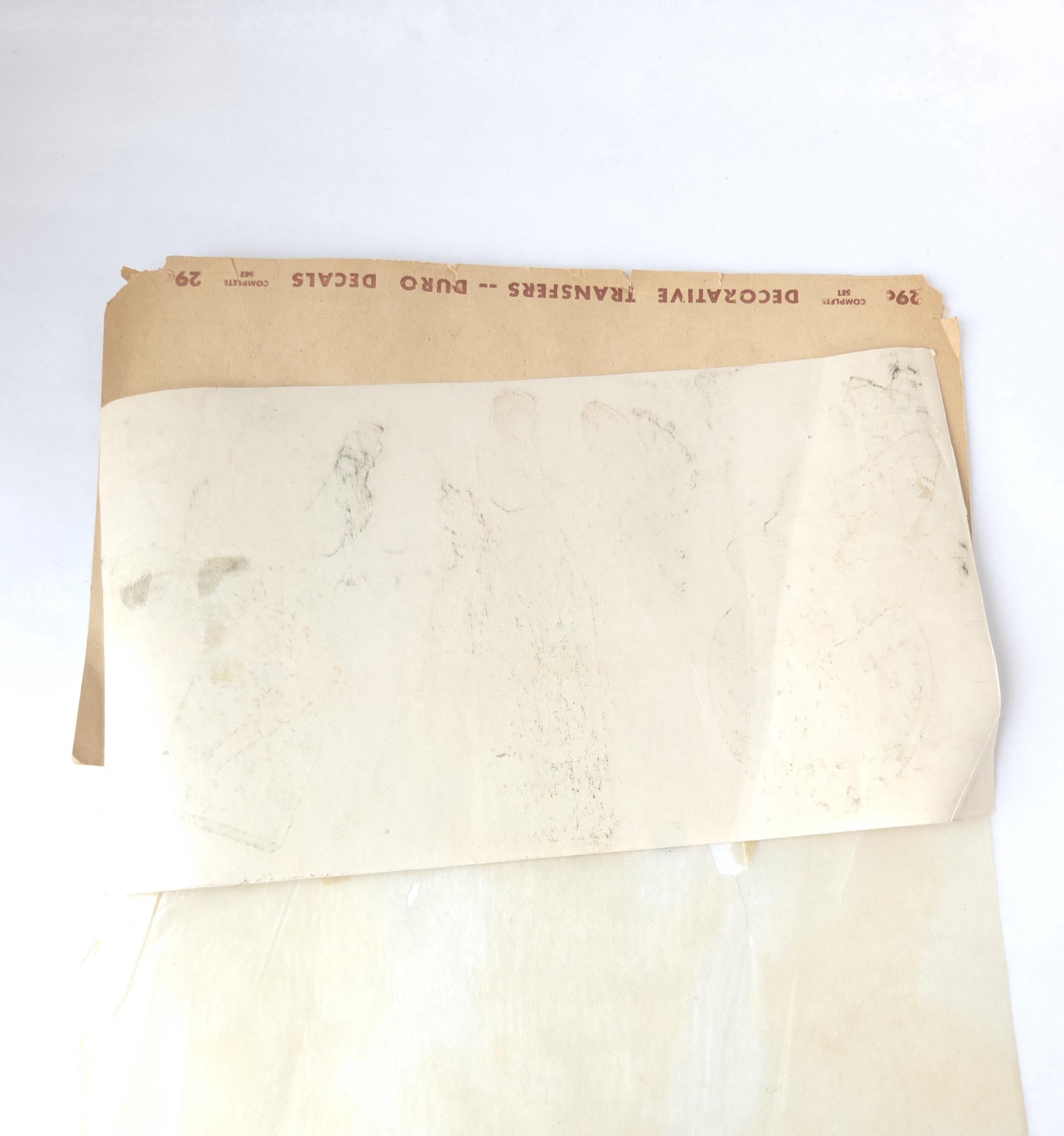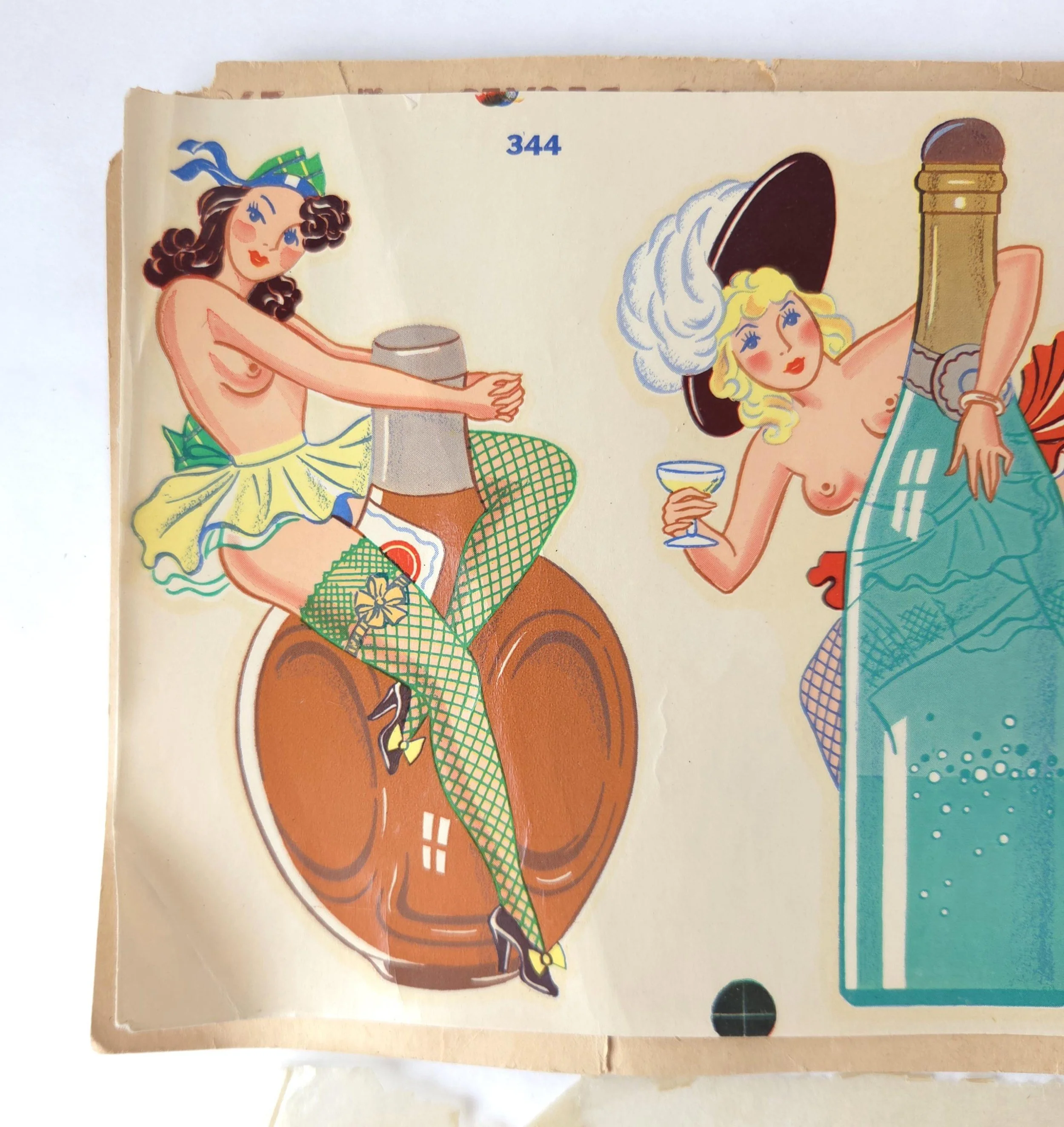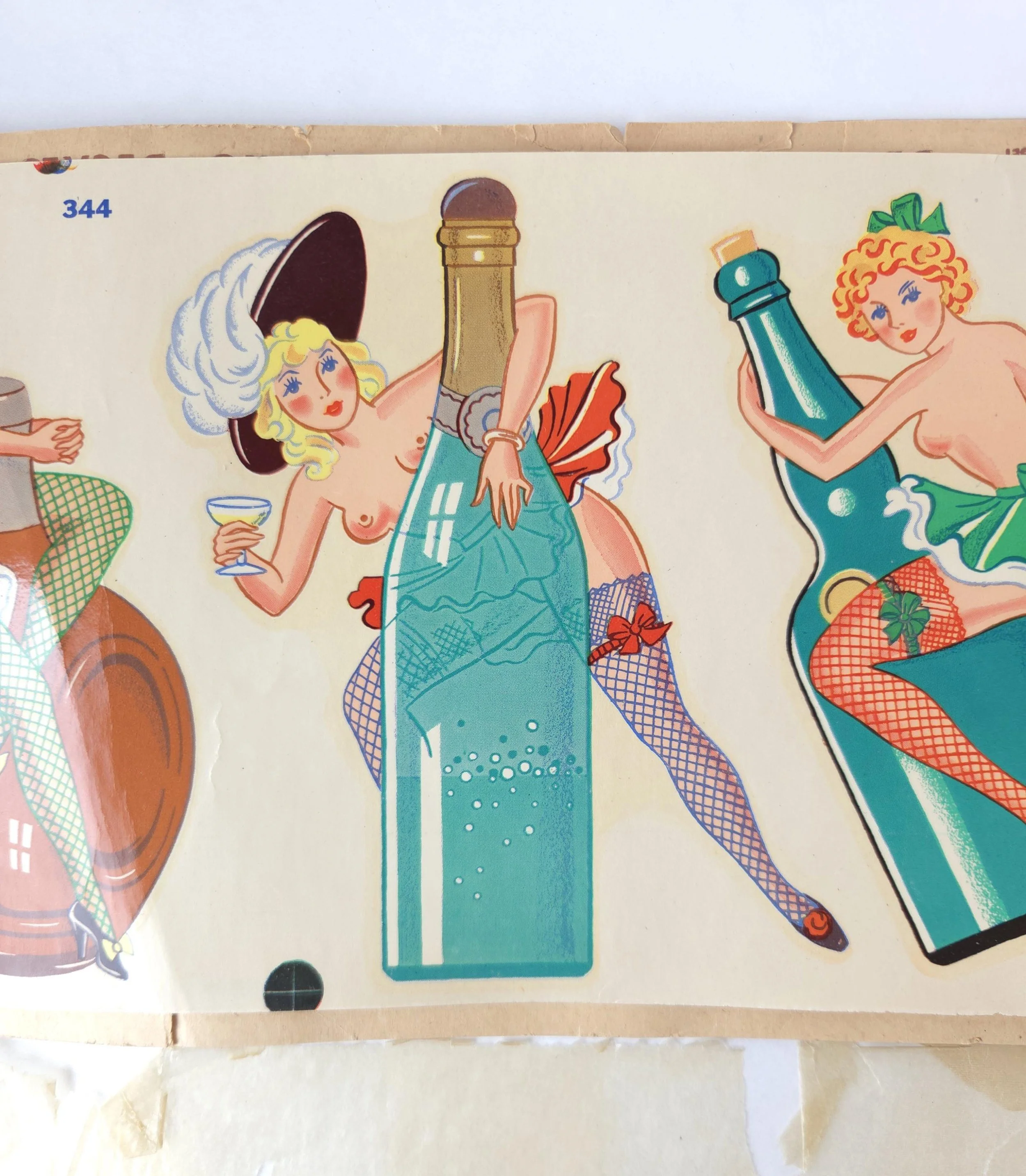 These darling vintage transfers feature 3 different scantily pin up girls wrapped around liquor bottles - perfect for adding that touch of sassy vintage charm to your home. They were made by Duro Decal Co and include their original package with instructions, which does have some wear and tear. There are some spots of crinkling and creasing to the decal page, but the transfers themselves are in good condition - ready to use and bring kitschy joy to your life!