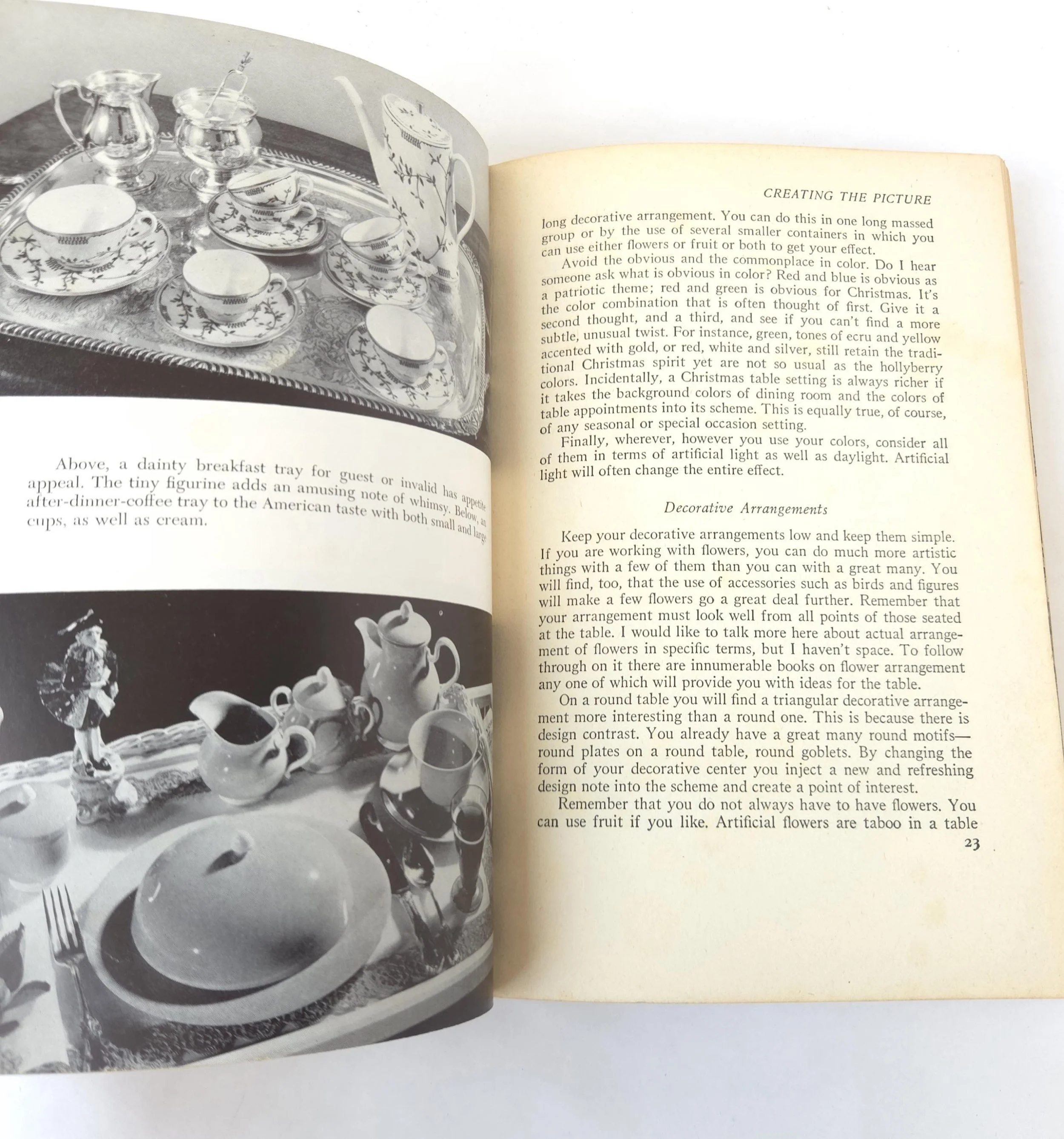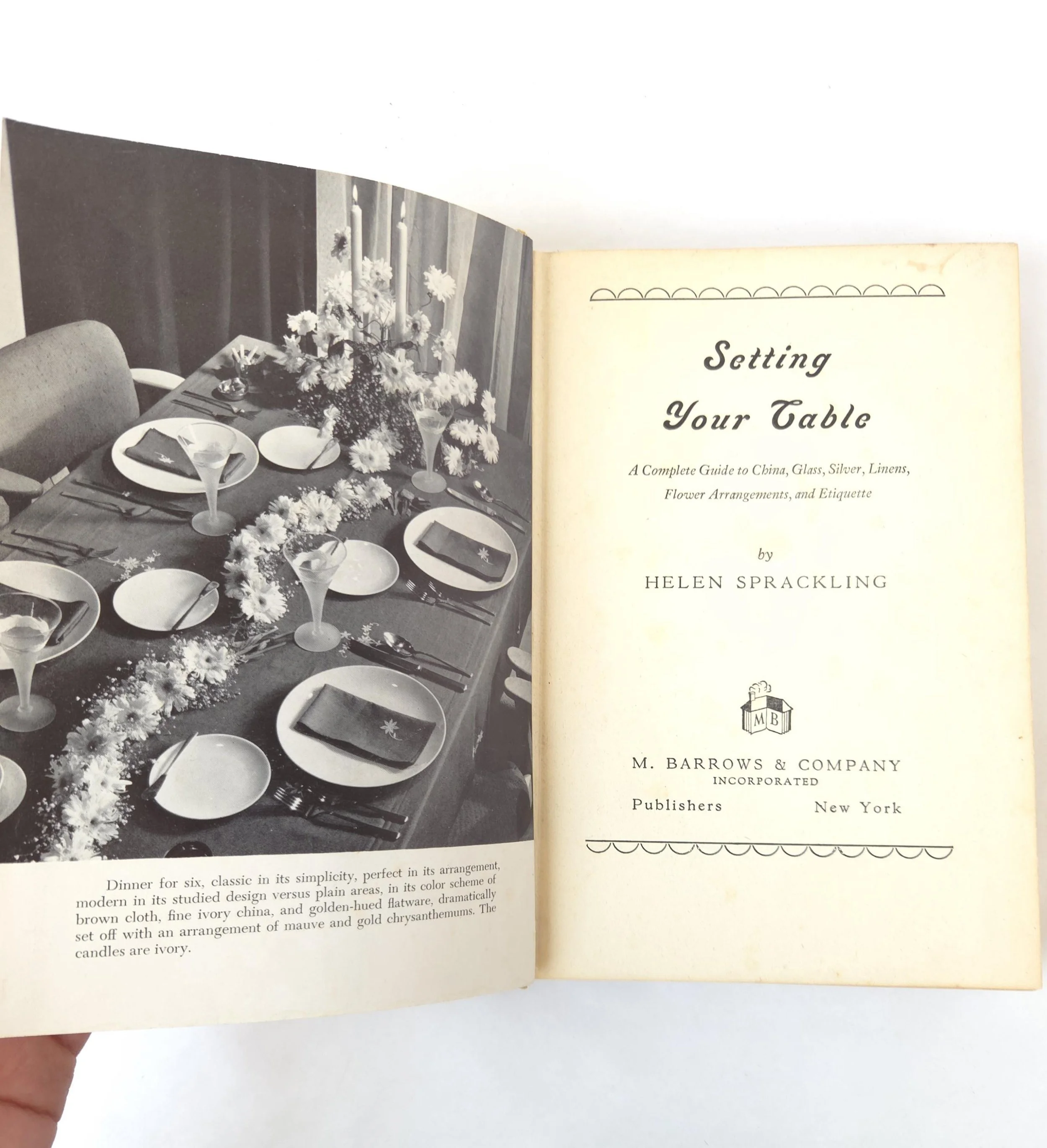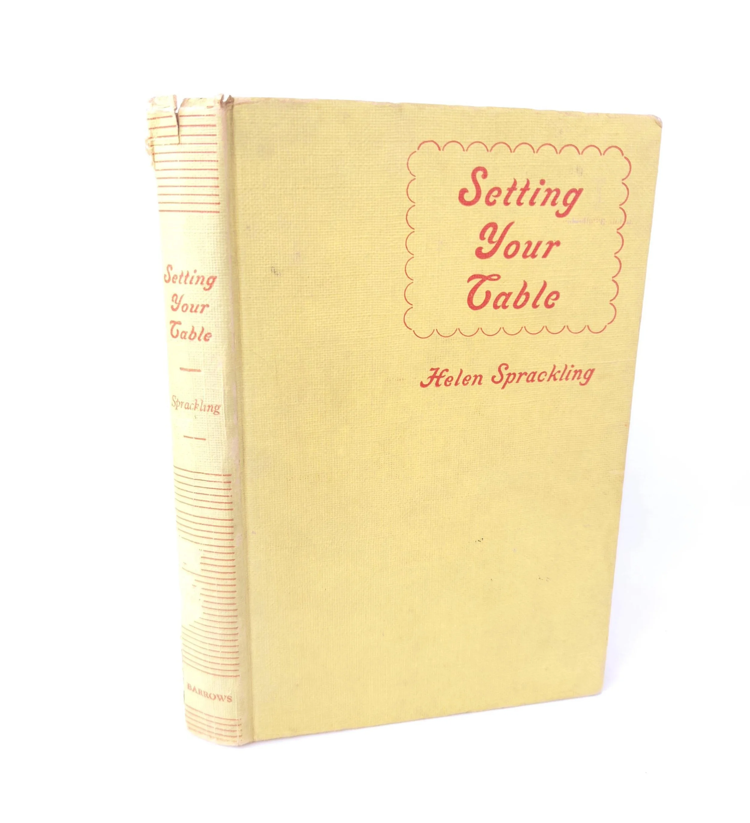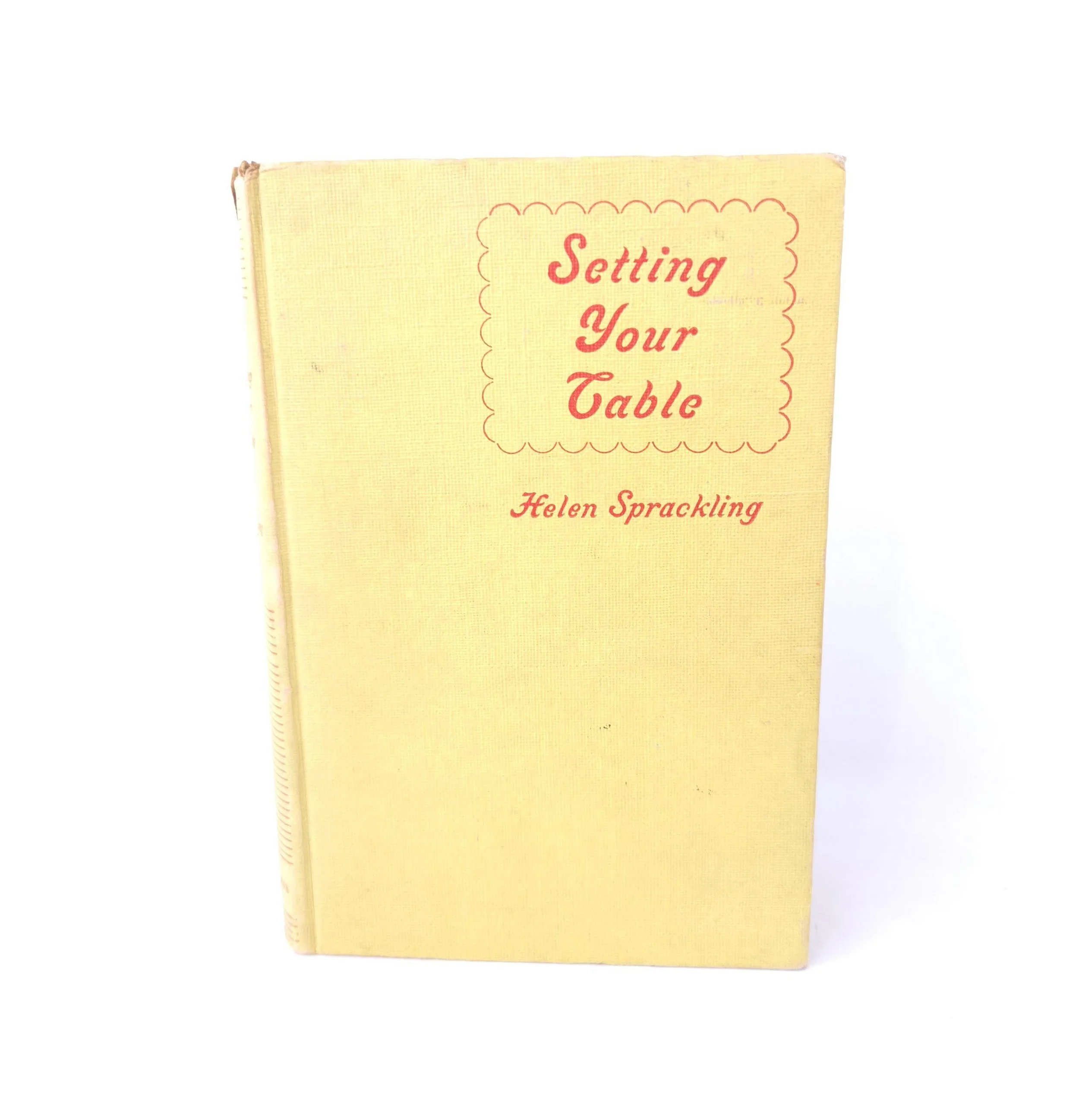 This charming vintage 1951 hardcover edition of Setting Your Table by Helen Sprackling is "a complete guide to China, Glass, Silver, Linens, Flower Arrangements and Etiquette". This copy is in used vintage condition with the dust jacket missing and some tearing to the edges of the cloth cover. The original owner's name is written on the front end page, and there are a couple of spots of minor discoloration to some inner pages and the front end page (which is blank) has been ripped out, but there are no marked or torn inner pages and excellent overall color quality.