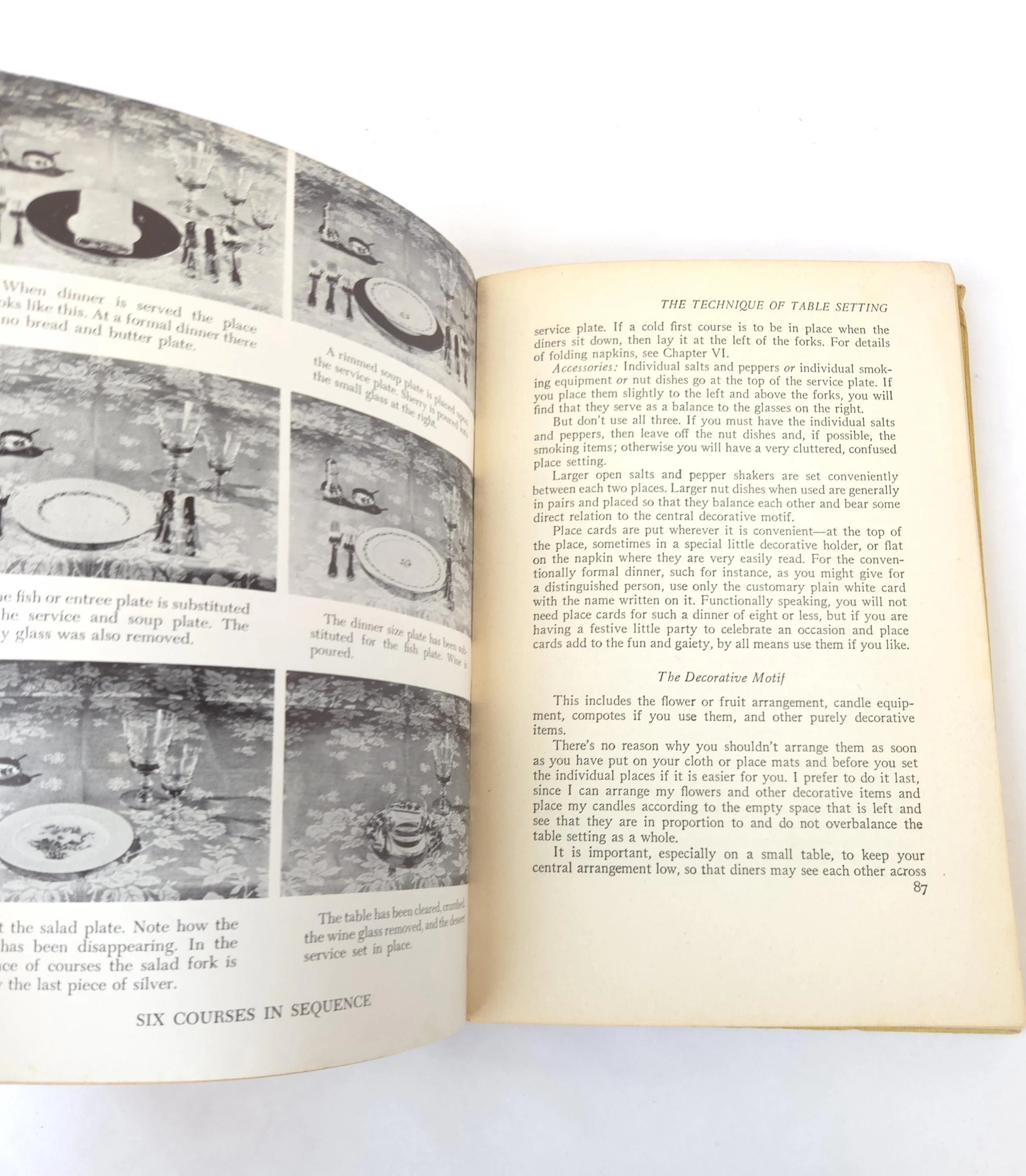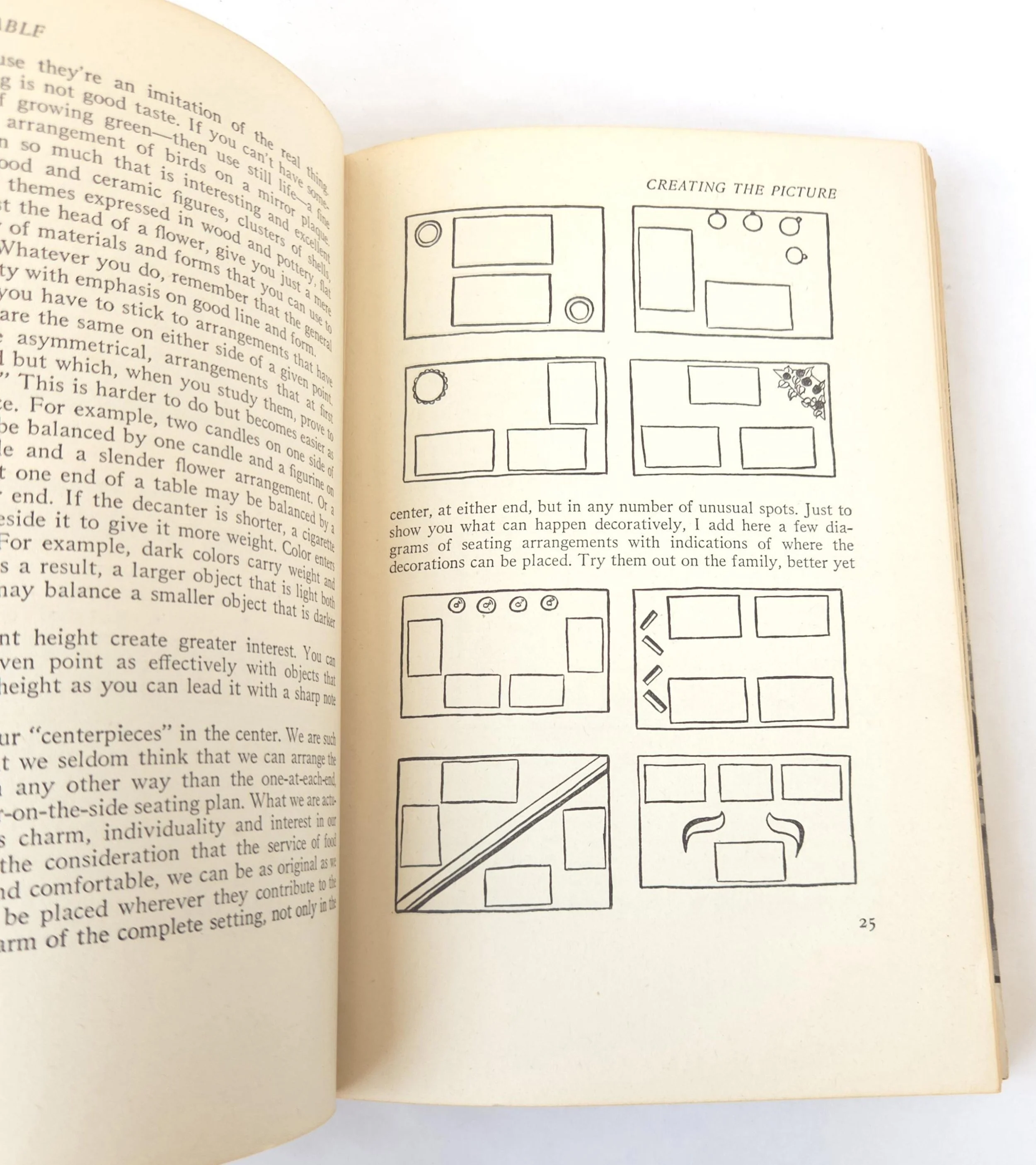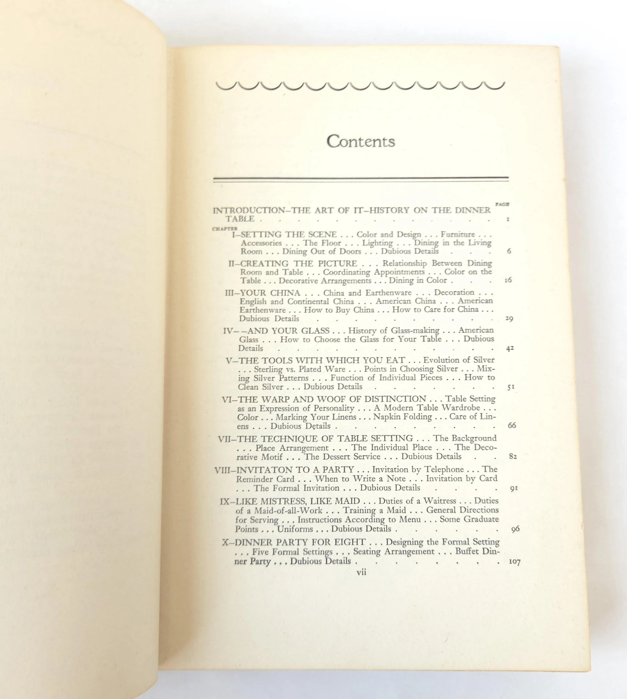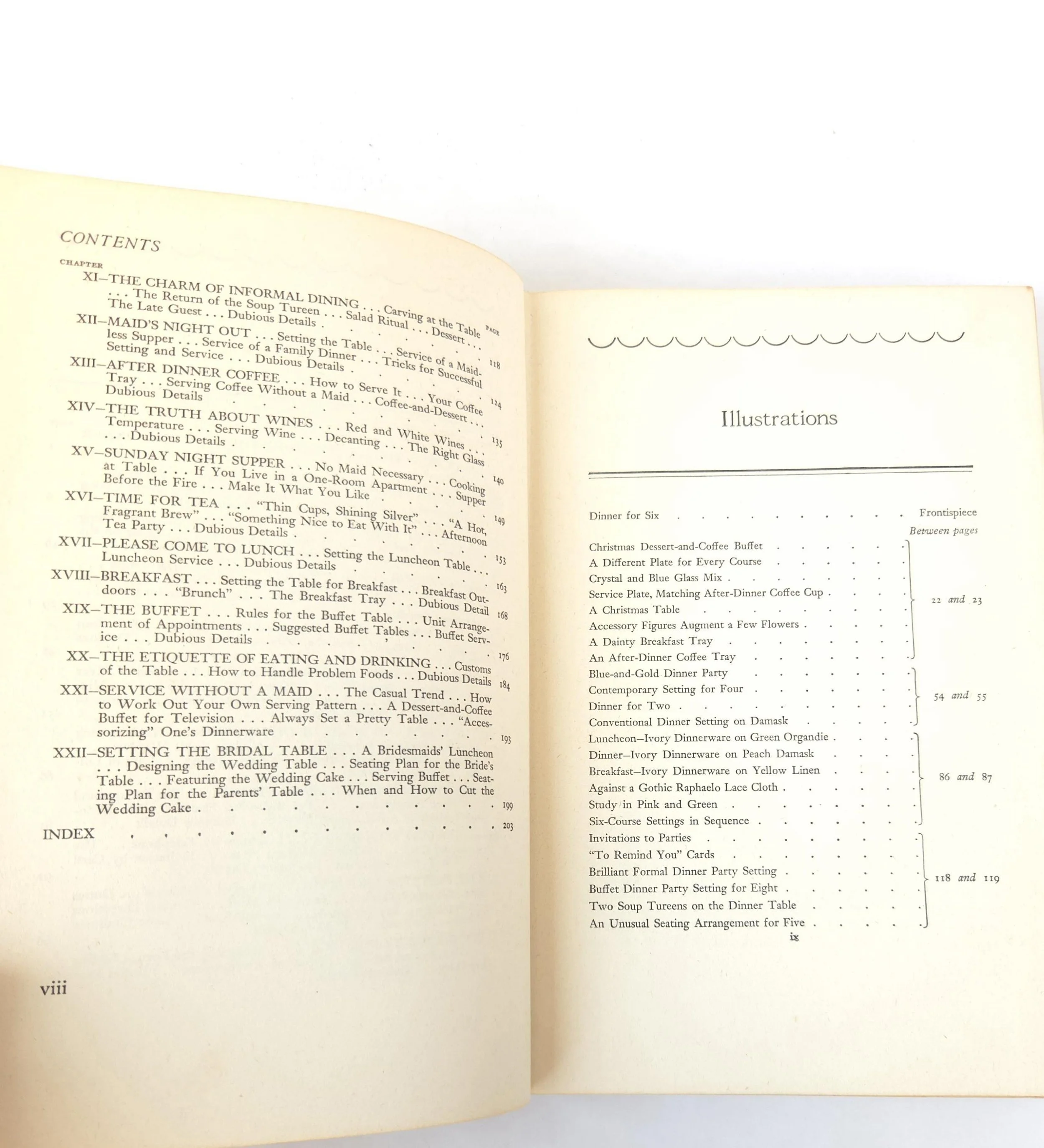 This charming vintage 1951 hardcover edition of Setting Your Table by Helen Sprackling is "a complete guide to China, Glass, Silver, Linens, Flower Arrangements and Etiquette". This copy is in used vintage condition with the dust jacket missing and some tearing to the edges of the cloth cover. The original owner's name is written on the front end page, and there are a couple of spots of minor discoloration to some inner pages and the front end page (which is blank) has been ripped out, but there are no marked or torn inner pages and excellent overall color quality.