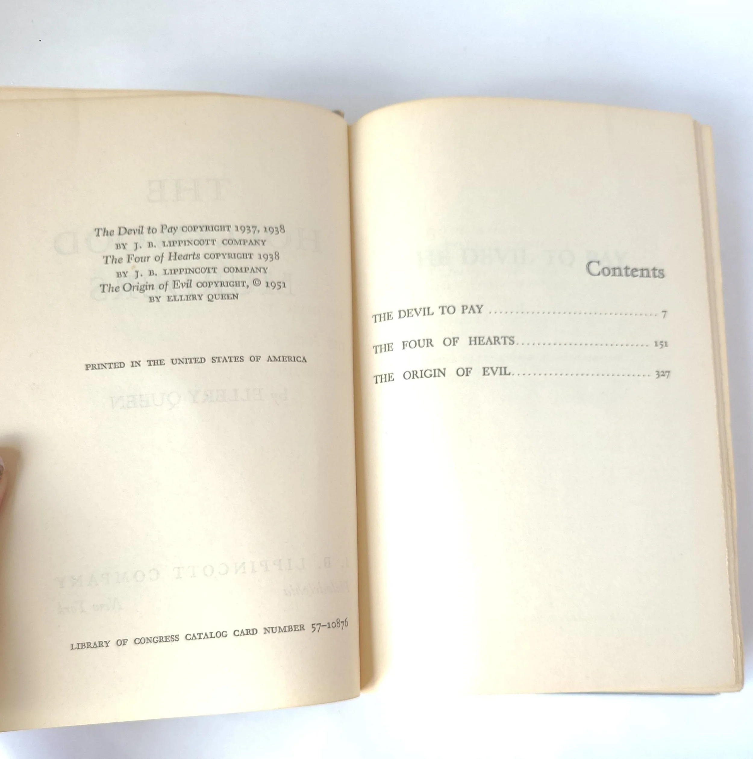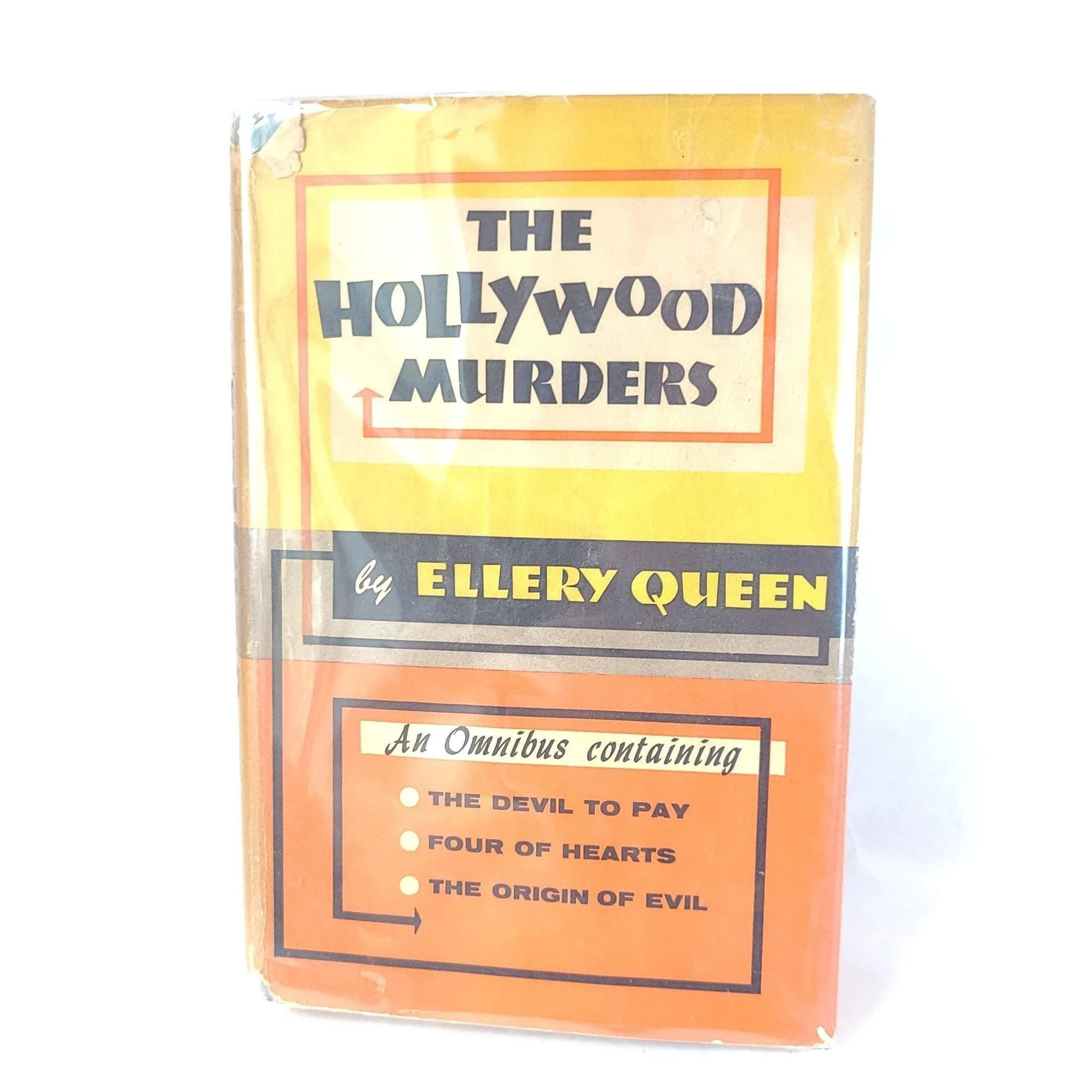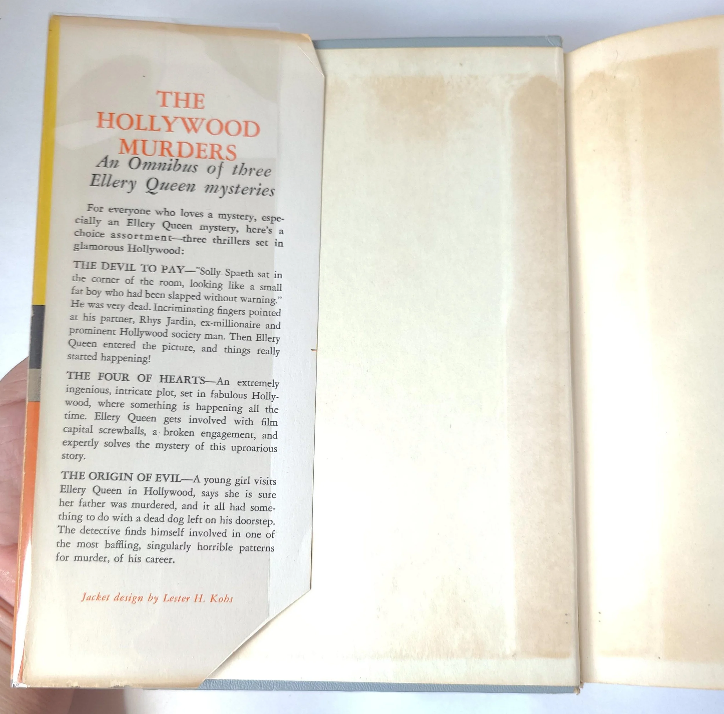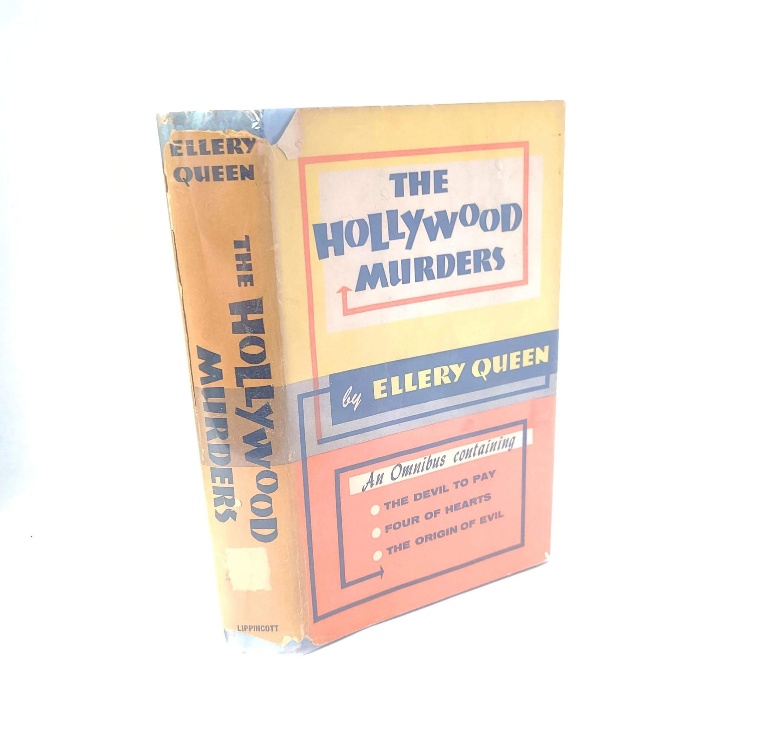 This vintage 1951 edition of The Hollywood Murders by Ellery Queen is "an omnibus containing: The Devil to Pay, Four of Hearts and The Origin of Evil". Ellery Queen is a pseudonym created in 1928 by the American detective fiction writers Frederic Dannay and Manfred Bennington Lee. It is also the name of their main fictional detective, a mystery writer in New York City who helps his police inspector father solve baffling murder cases. Dannay and Lee wrote around forty novels and short story collections in which Ellery Queen appears as a character.