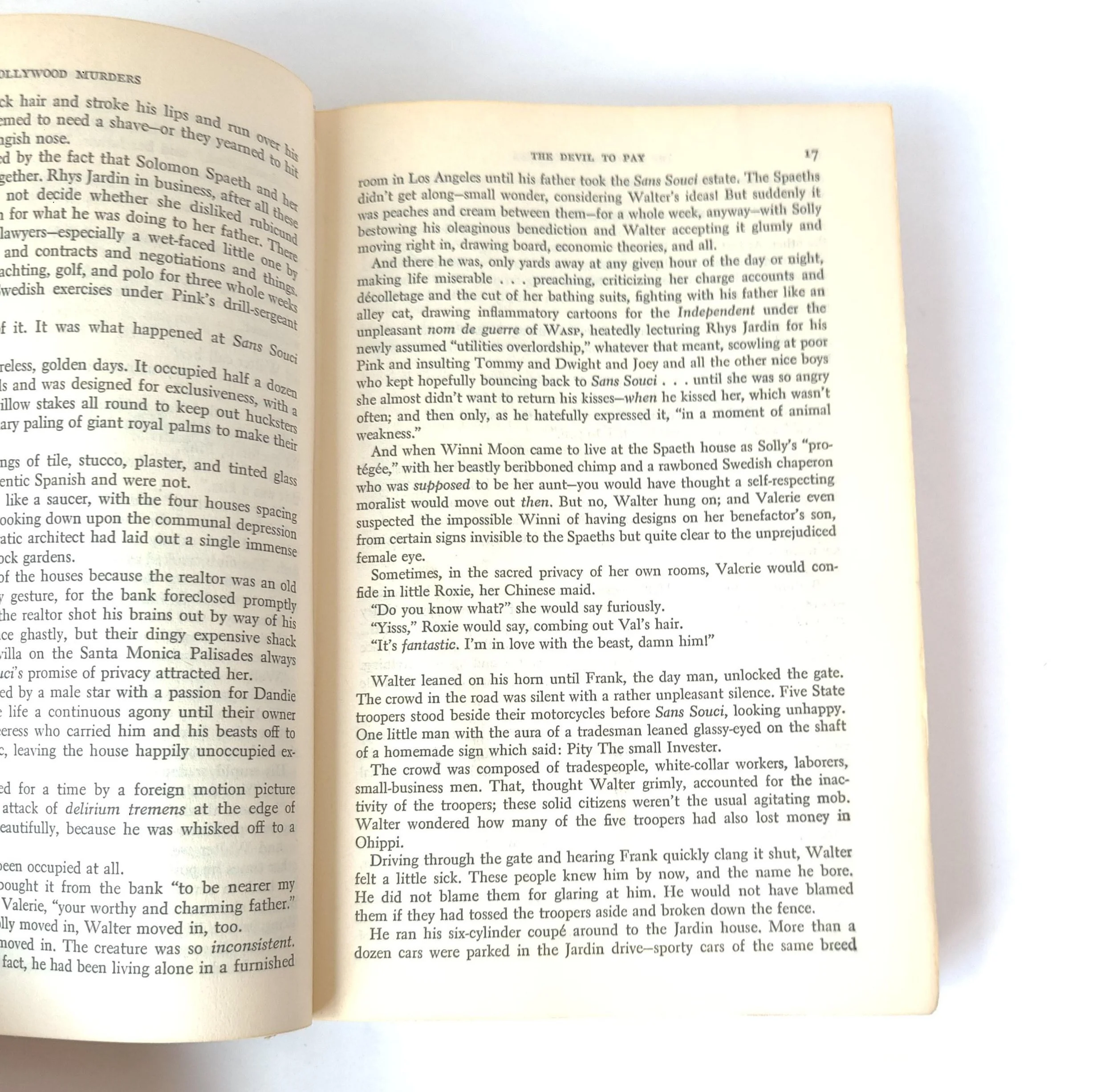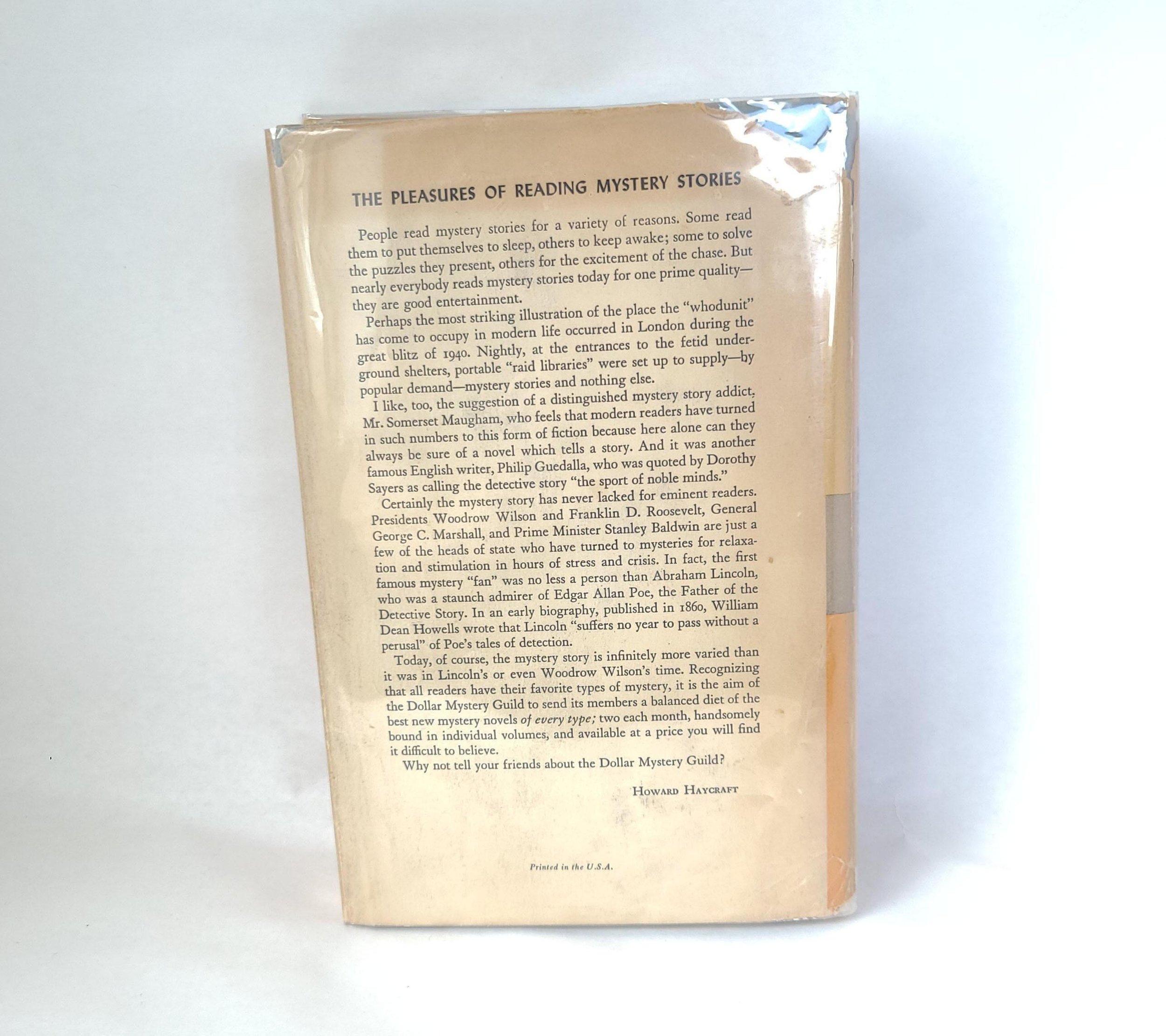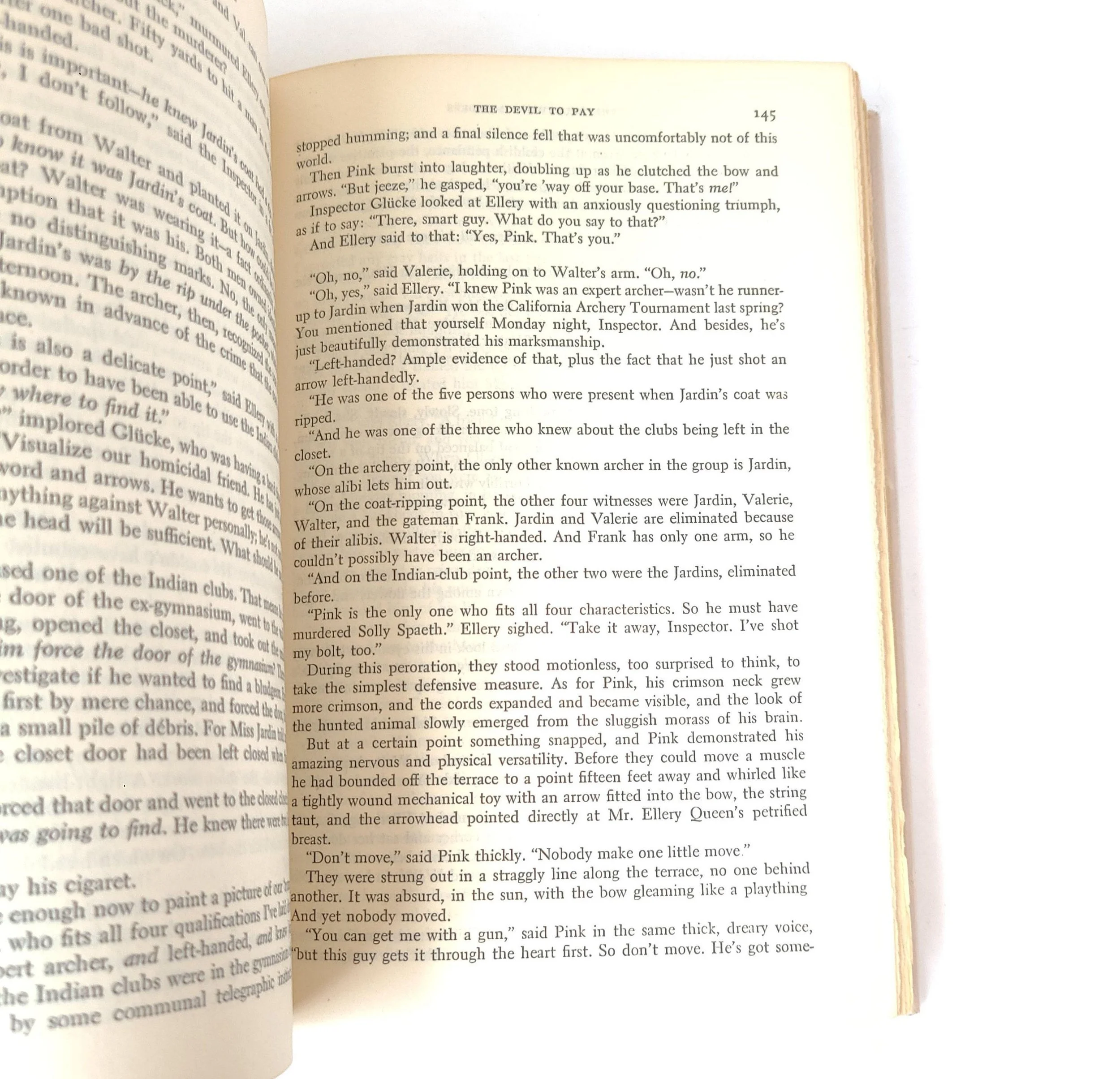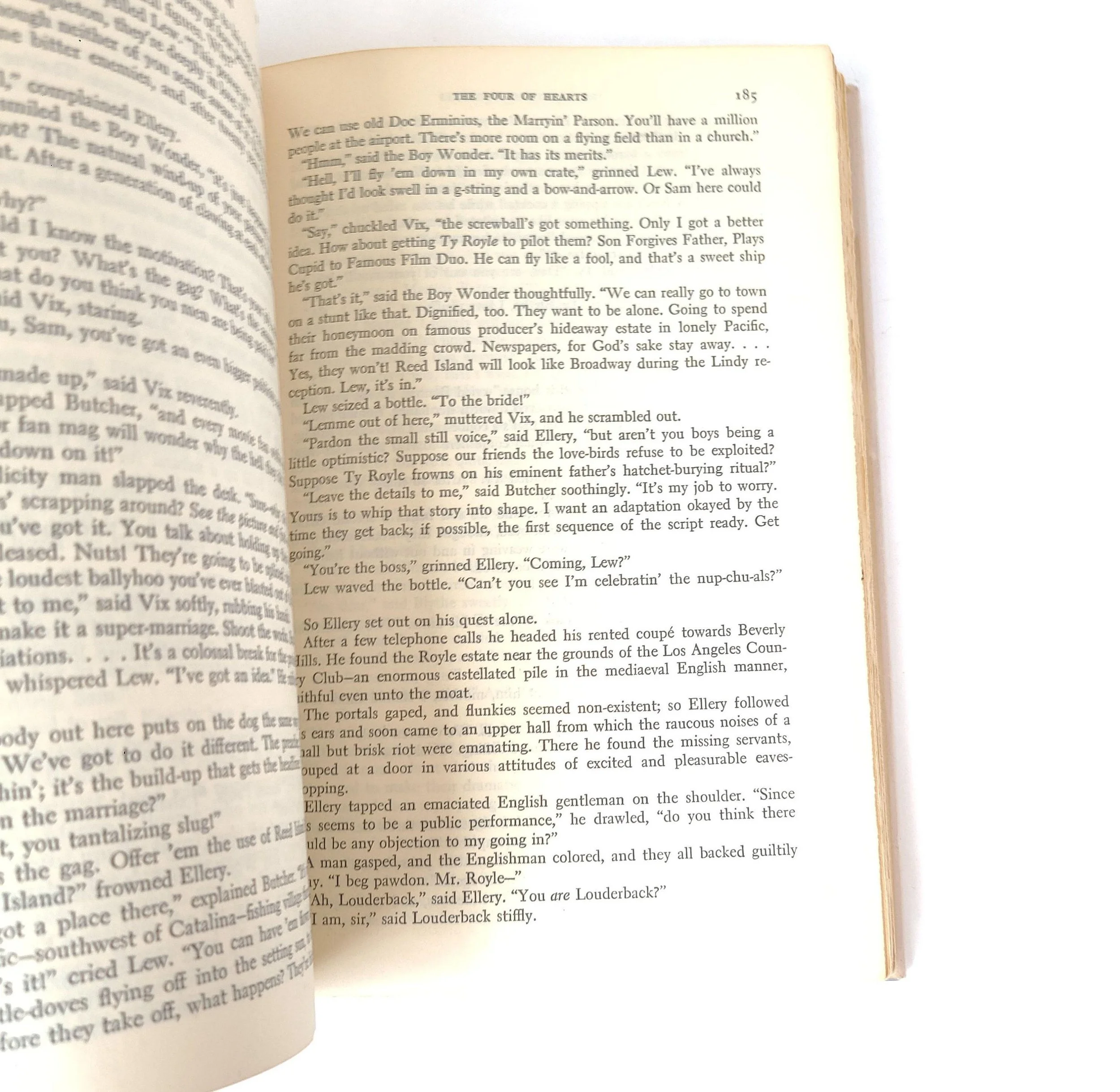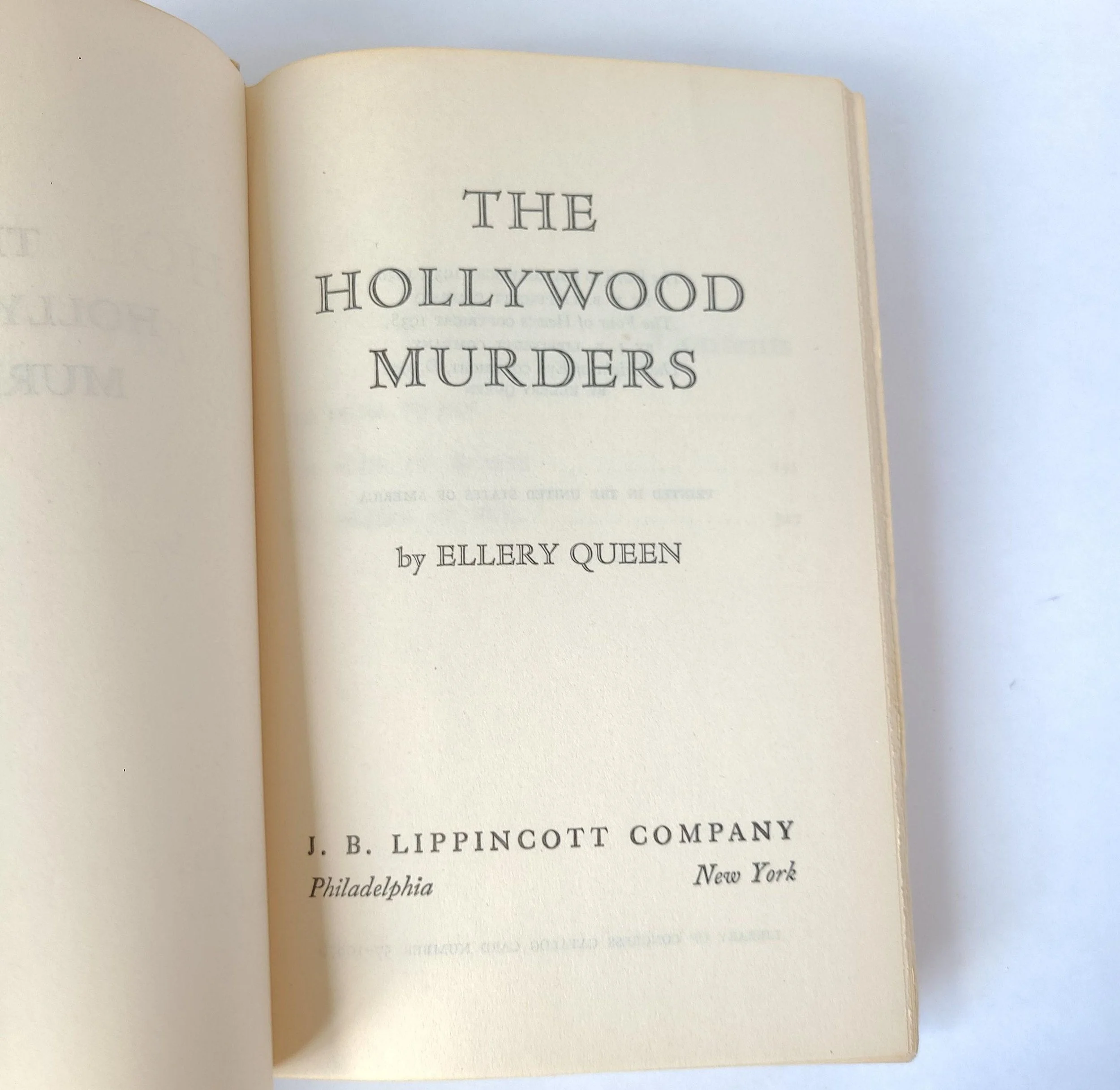 This vintage 1951 edition of The Hollywood Murders by Ellery Queen is "an omnibus containing: The Devil to Pay, Four of Hearts and The Origin of Evil". Ellery Queen is a pseudonym created in 1928 by the American detective fiction writers Frederic Dannay and Manfred Bennington Lee. It is also the name of their main fictional detective, a mystery writer in New York City who helps his police inspector father solve baffling murder cases. Dannay and Lee wrote around forty novels and short story collections in which Ellery Queen appears as a character.