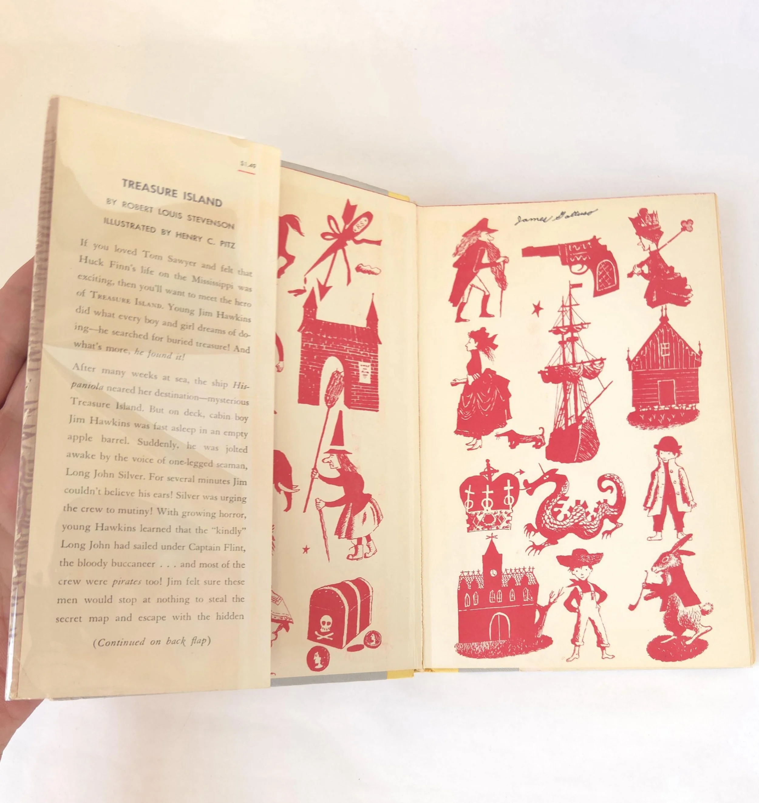 This charming vintage 1954 hardcover edition of Treasure Island by Robert Louis Stevenson features exciting illustrations by Henry C. Pitz and was published as a part of the beloved Junior Deluxe series by Doubleday. This copy is in used vintage condition with some tears and creases to the edges of the dust jacket (that is protected with a plastic sleeve). The original owner's name is written on the front end page, but there are no marked or torn inner pages and excellent overall color quality.