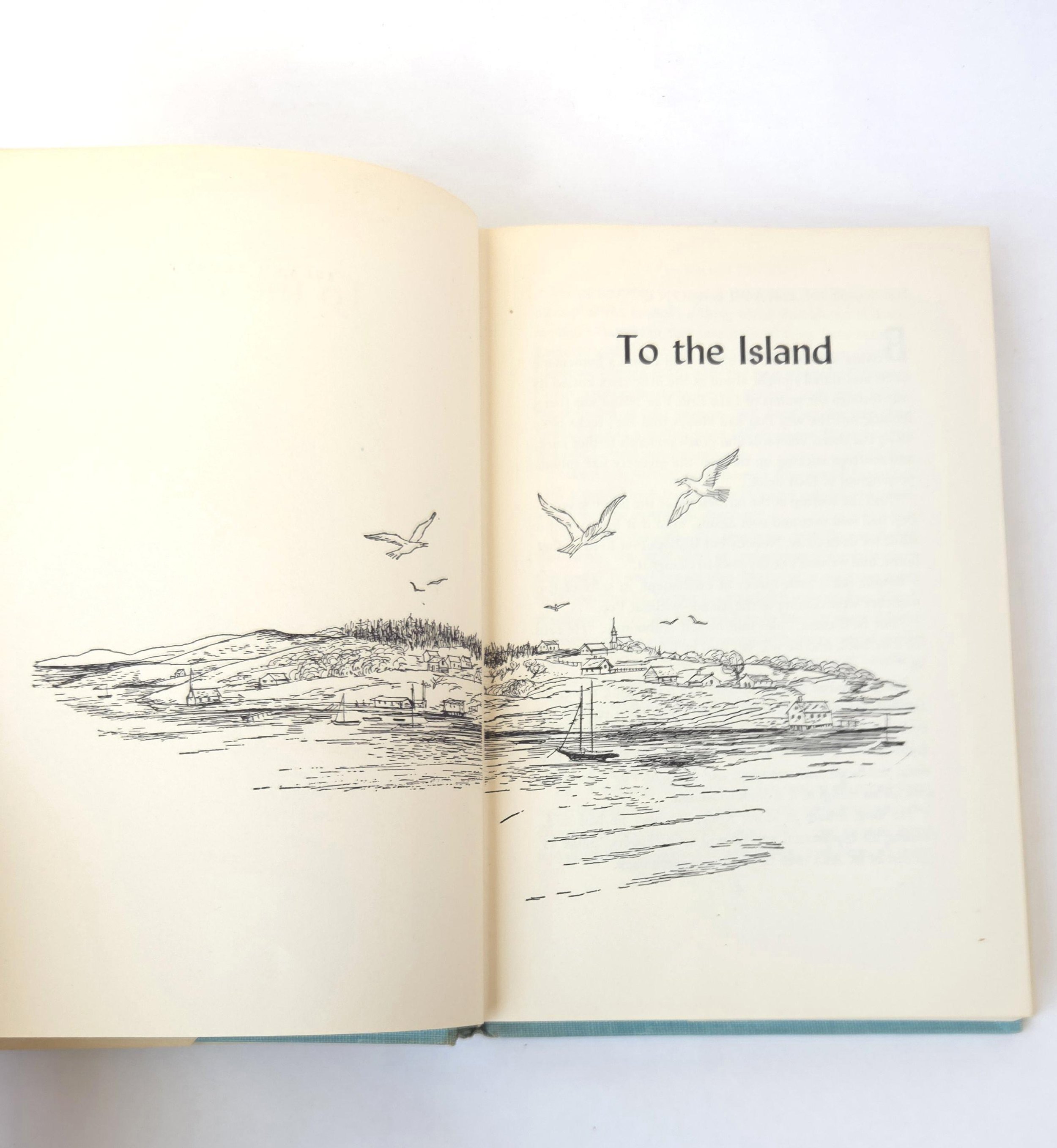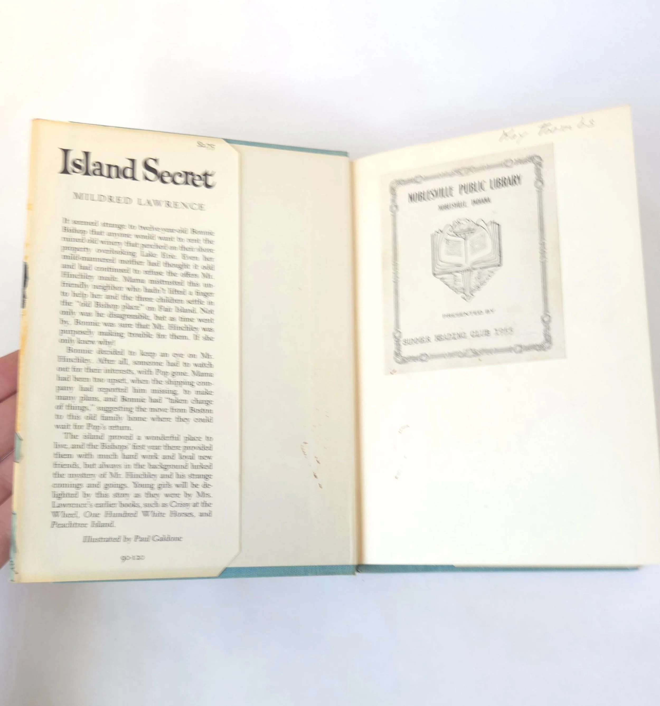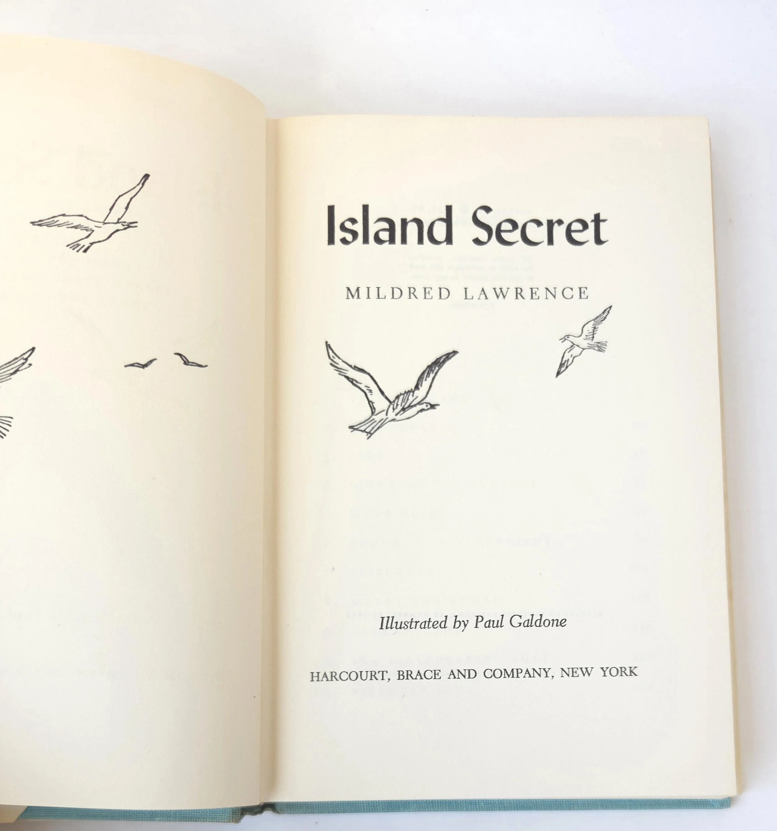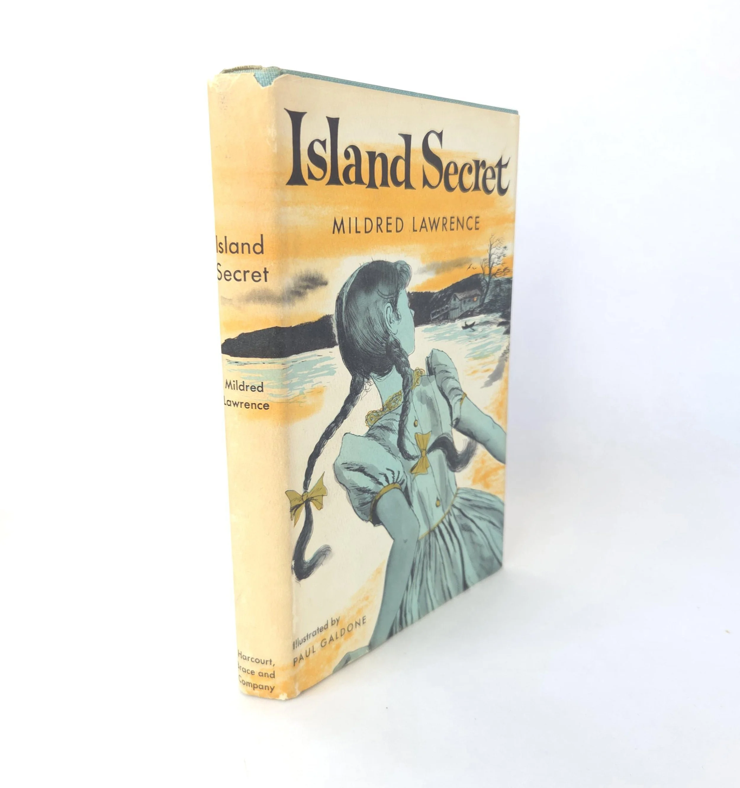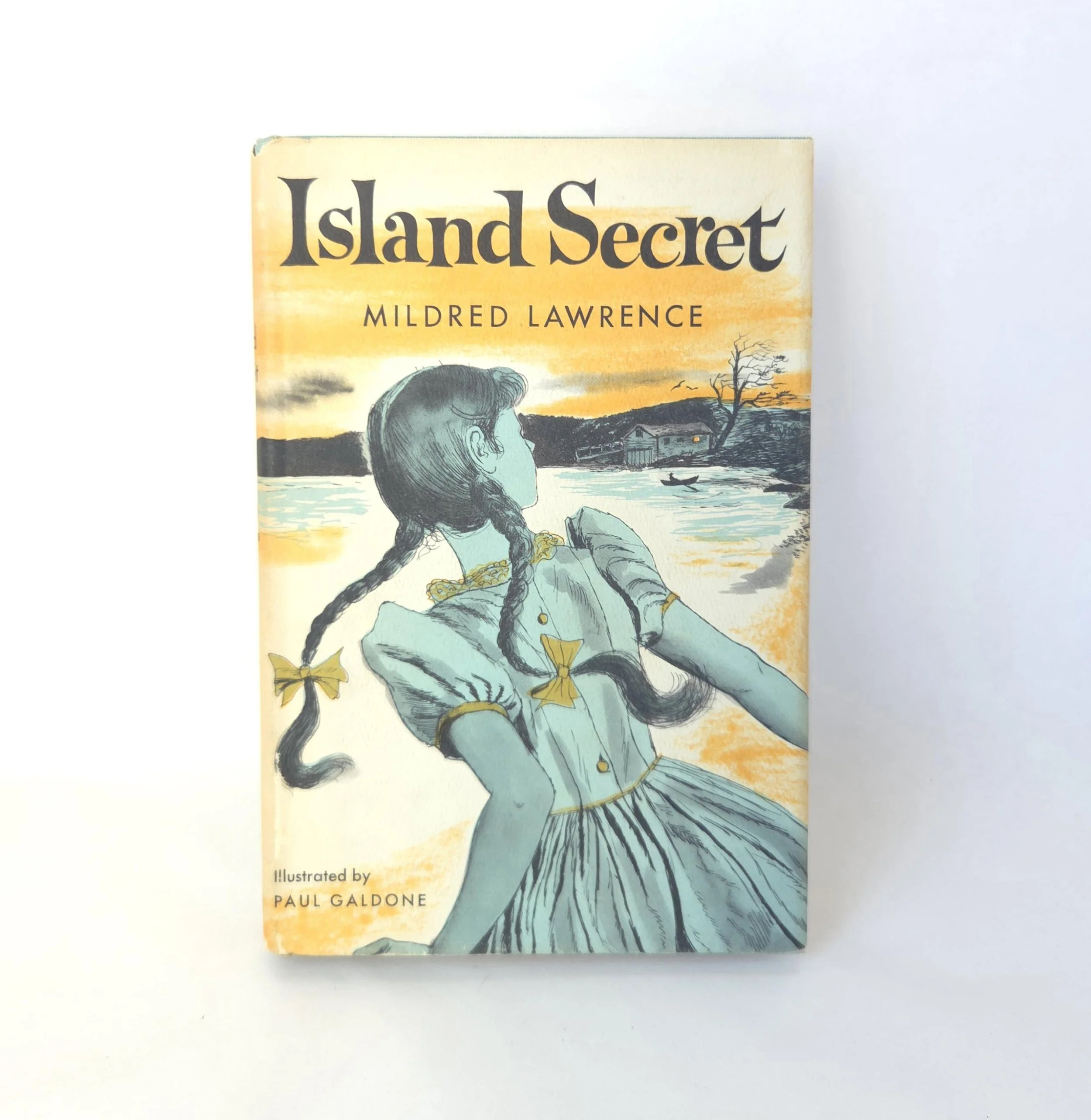 This precious vintage 1955 hardcover first edition of Island Secret tells the story of Bonnie Bishop and her investigation of the strange neighbor at her new home at an old ruined winery - all brought to life by charming illustrations by Paul Galdone. This copy is in used vintage condition with some small tears to the edges of the dust jacket along with some minor discoloration to the back side. There is a bookplate and name on the front end page, but no torn or marked pages and excellent overall color quality.