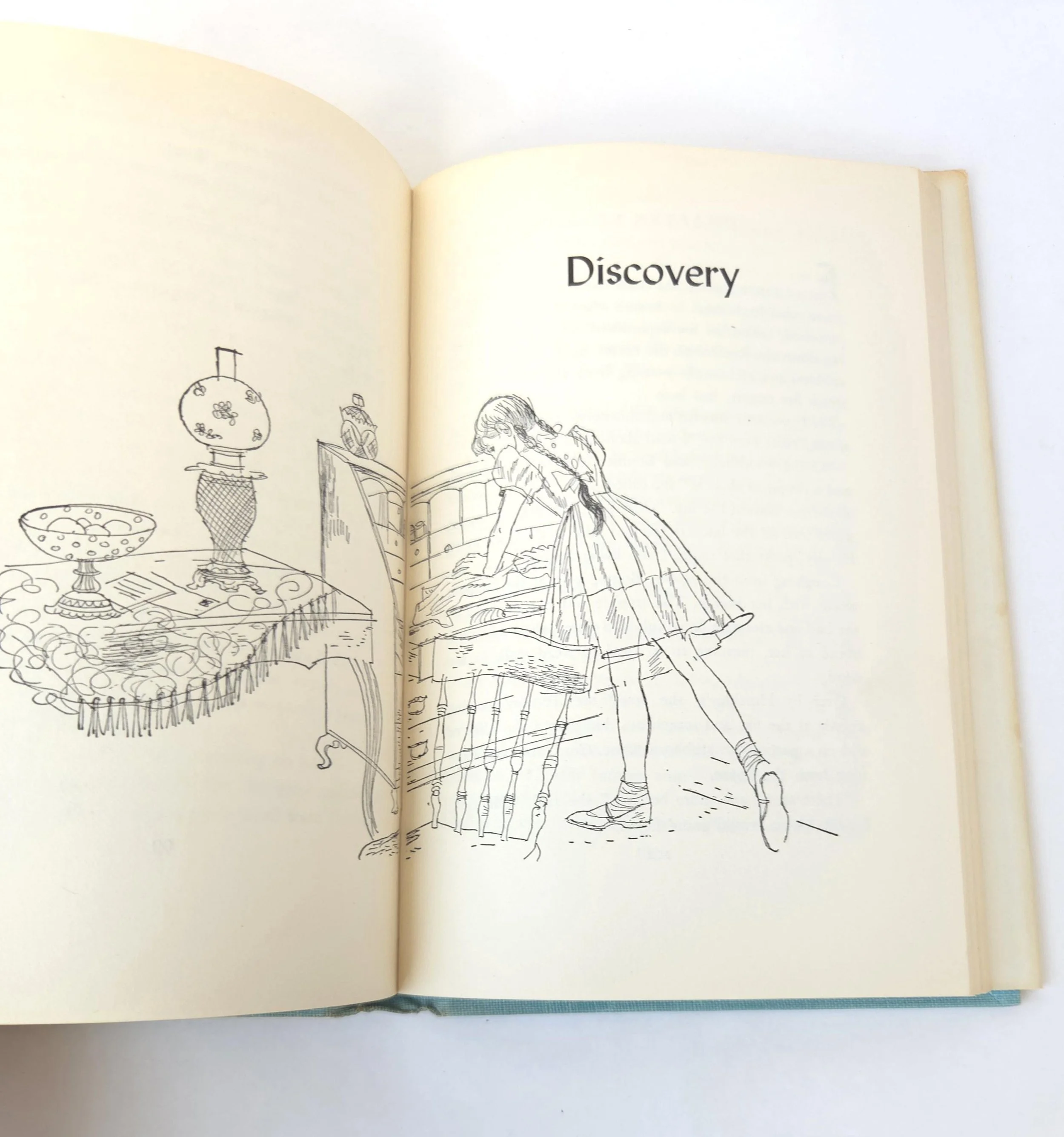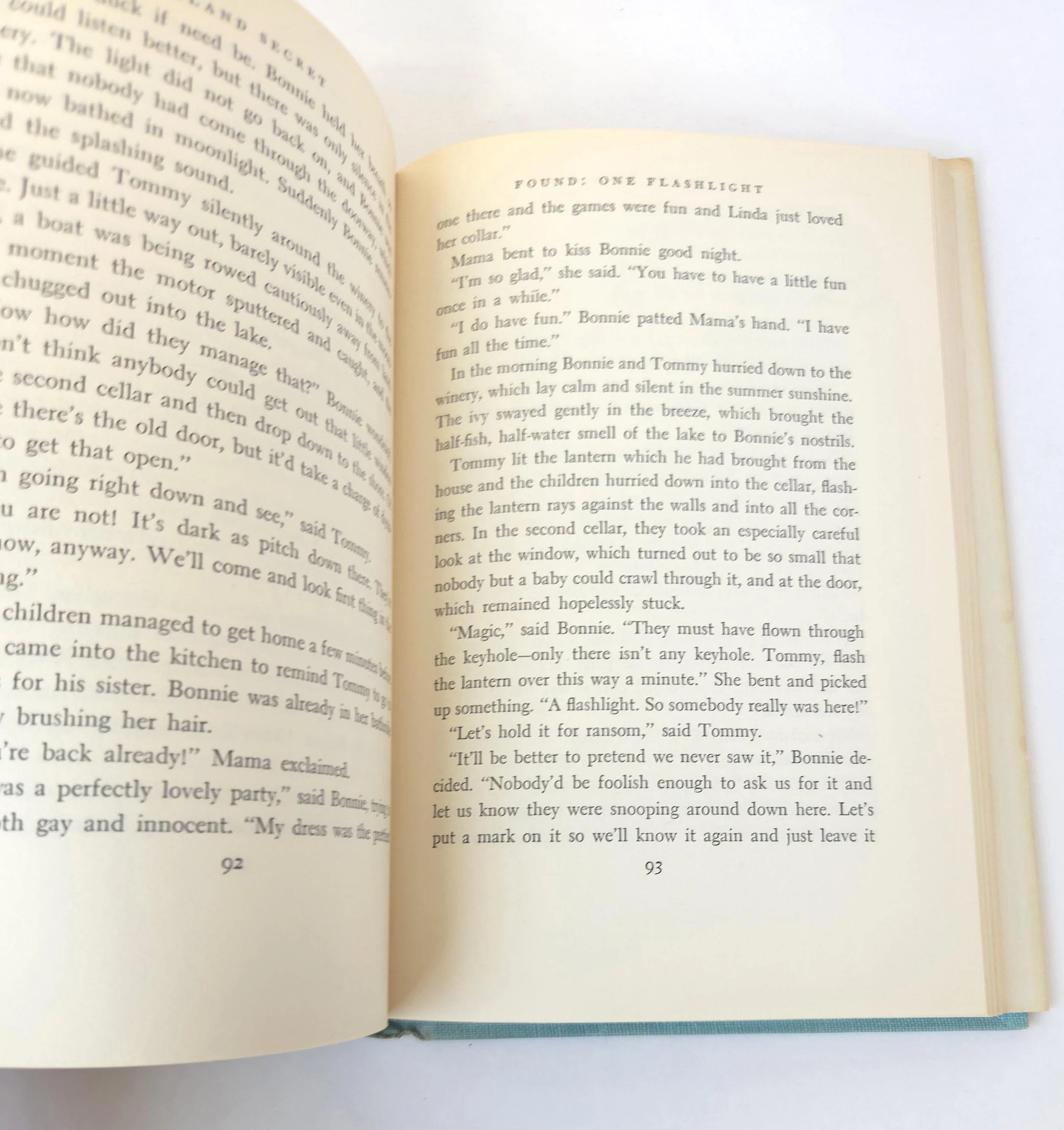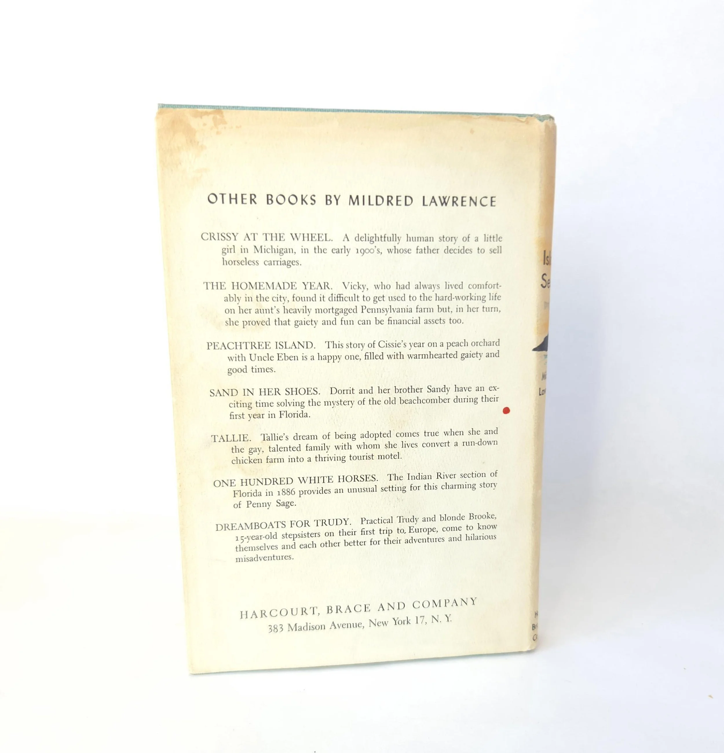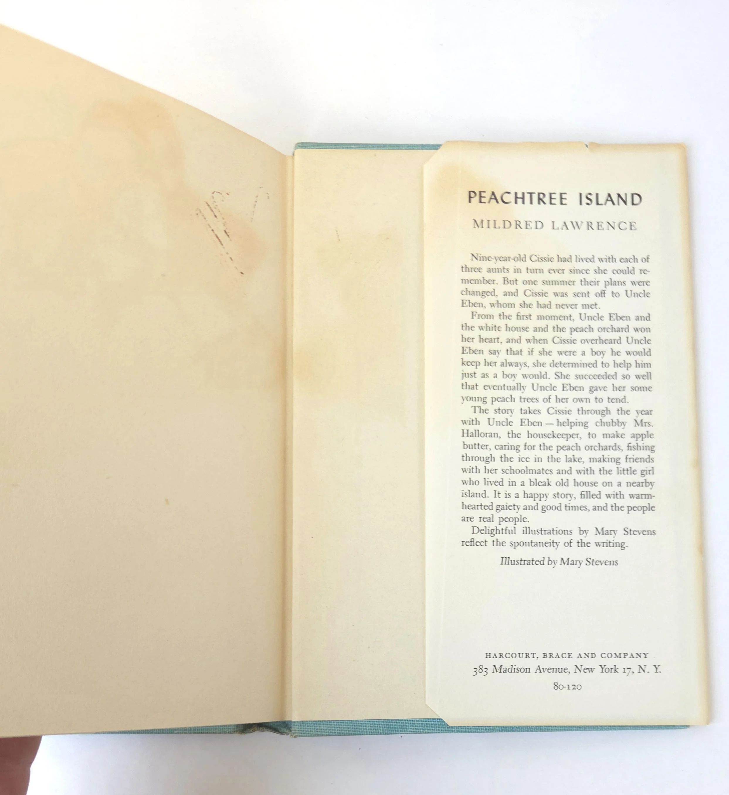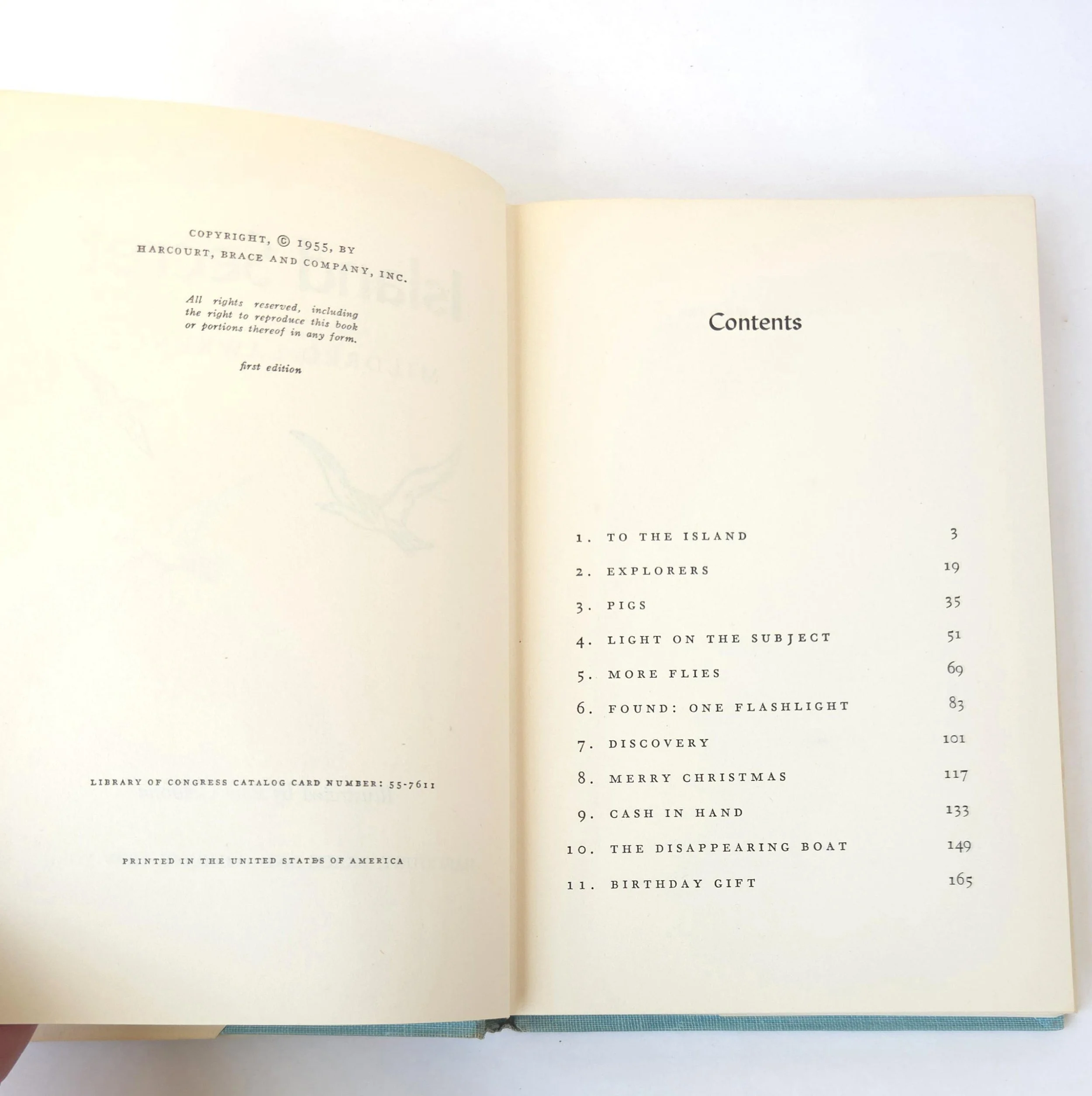 This precious vintage 1955 hardcover first edition of Island Secret tells the story of Bonnie Bishop and her investigation of the strange neighbor at her new home at an old ruined winery - all brought to life by charming illustrations by Paul Galdone. This copy is in used vintage condition with some small tears to the edges of the dust jacket along with some minor discoloration to the back side. There is a bookplate and name on the front end page, but no torn or marked pages and excellent overall color quality.