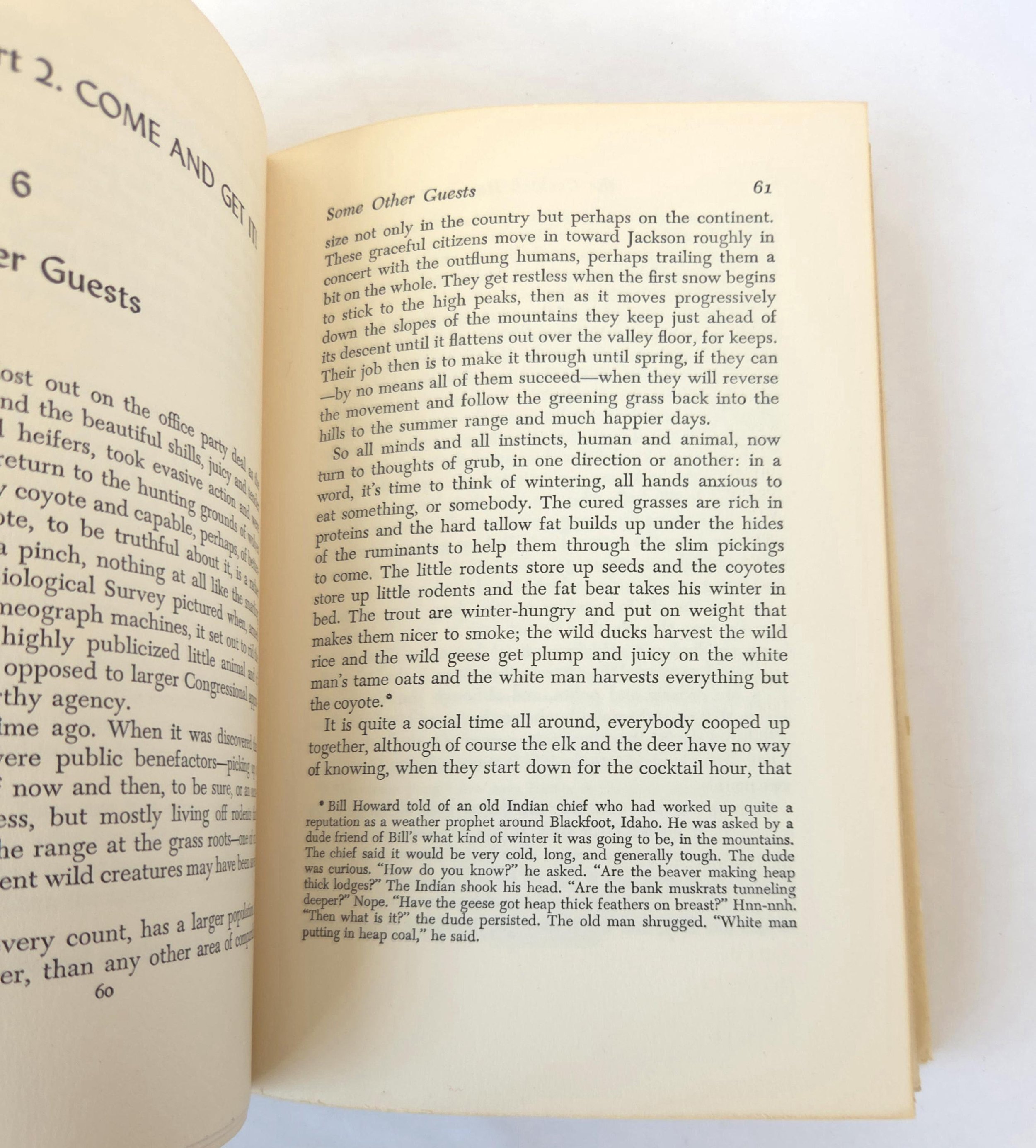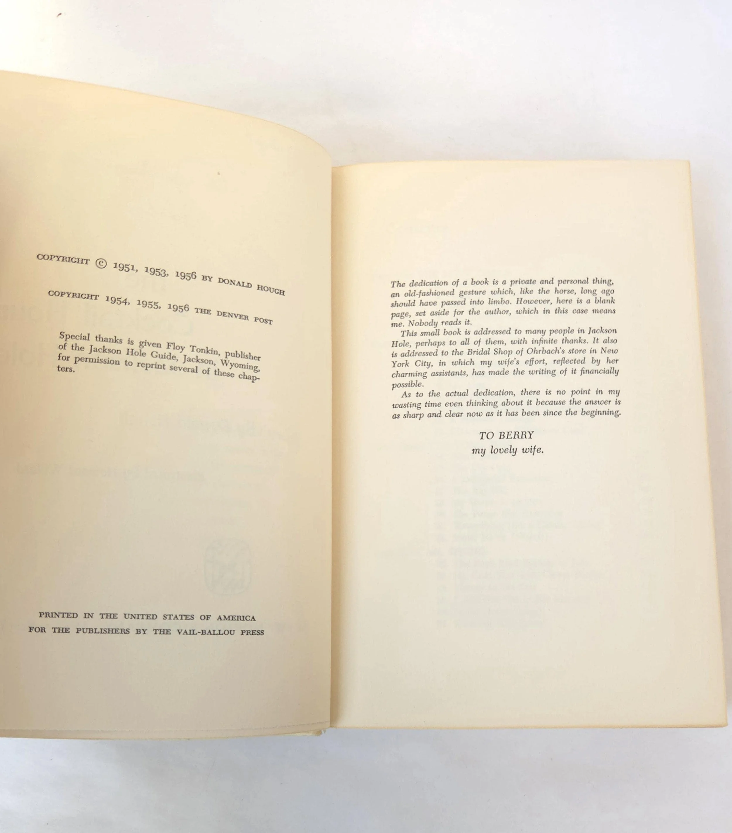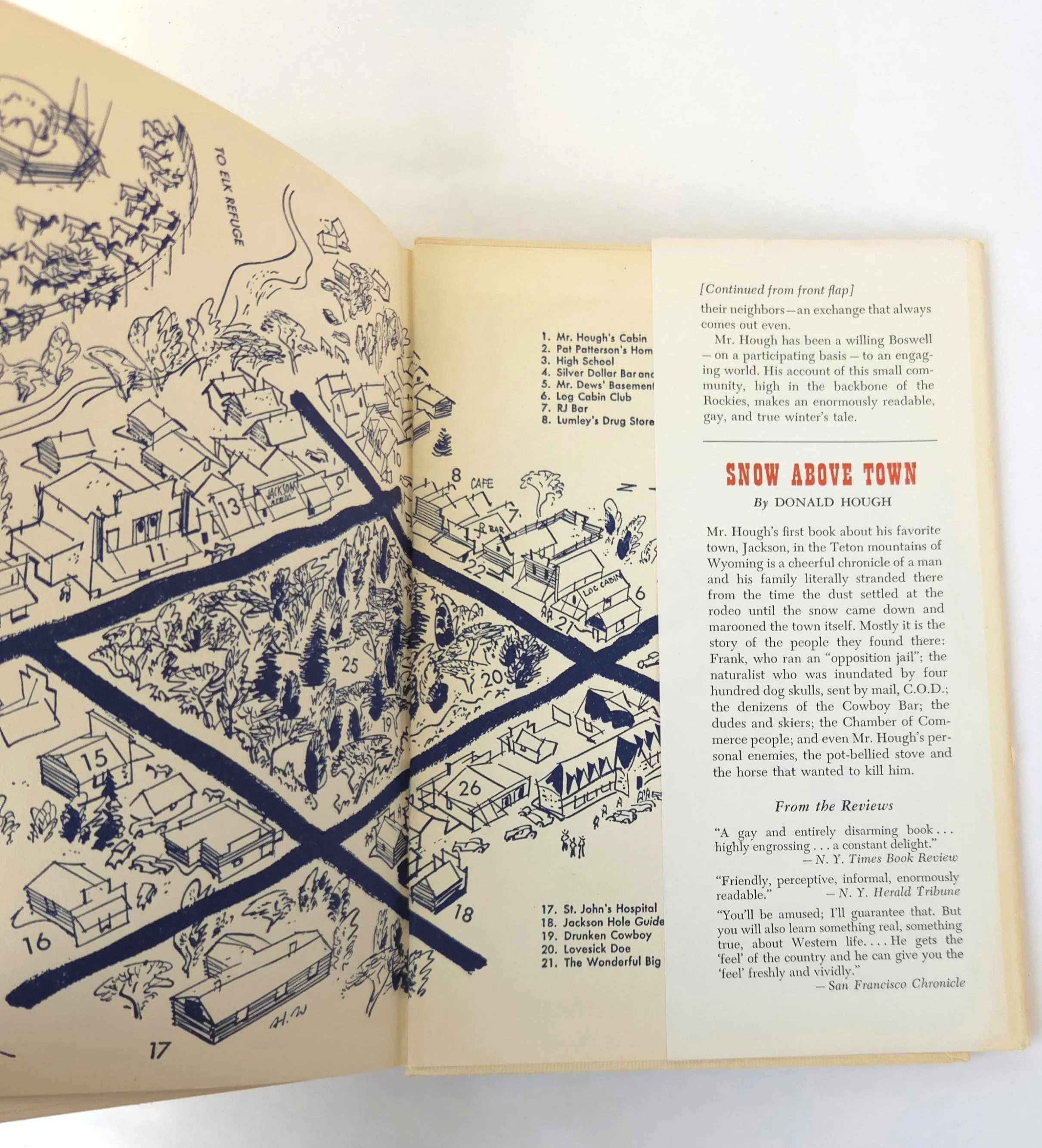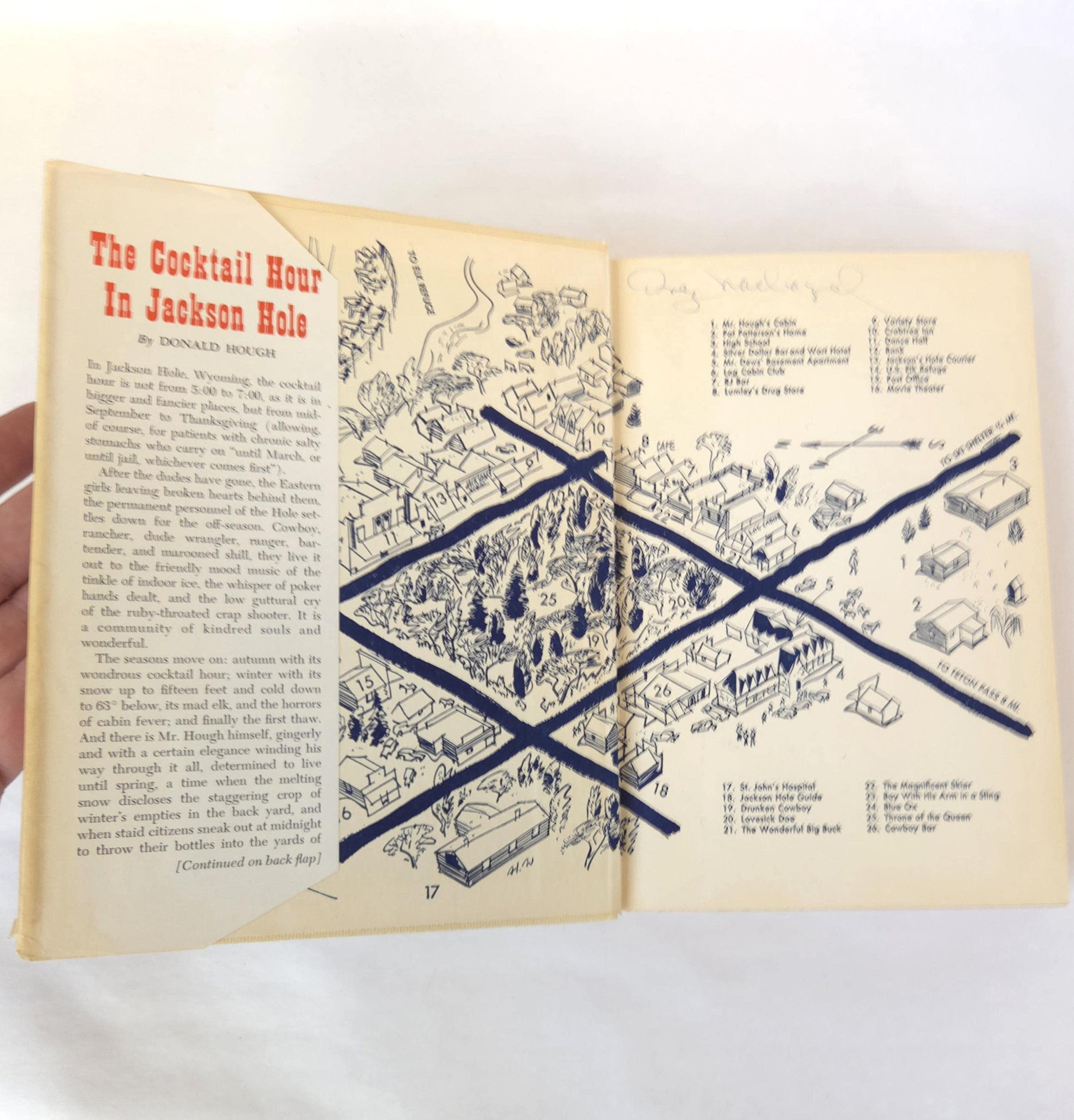 This vintage 1956 hardcover first edition of The Cocktail Hour in Jackson Hole is a satire book by Donald Hough that chronicles the off-season life of Jackson Hole, Wyoming. It portrays the town from September to Thanksgiving when locals reclaim the area after tourists leave, focusing on saloon culture, local characters, and daily life rather than "tourist" attractions. This copy is in used vintage condition with tears to the edges of the dust jacket and a dedication written on the title page, but no torn or marked inner pages and good overall color quality.