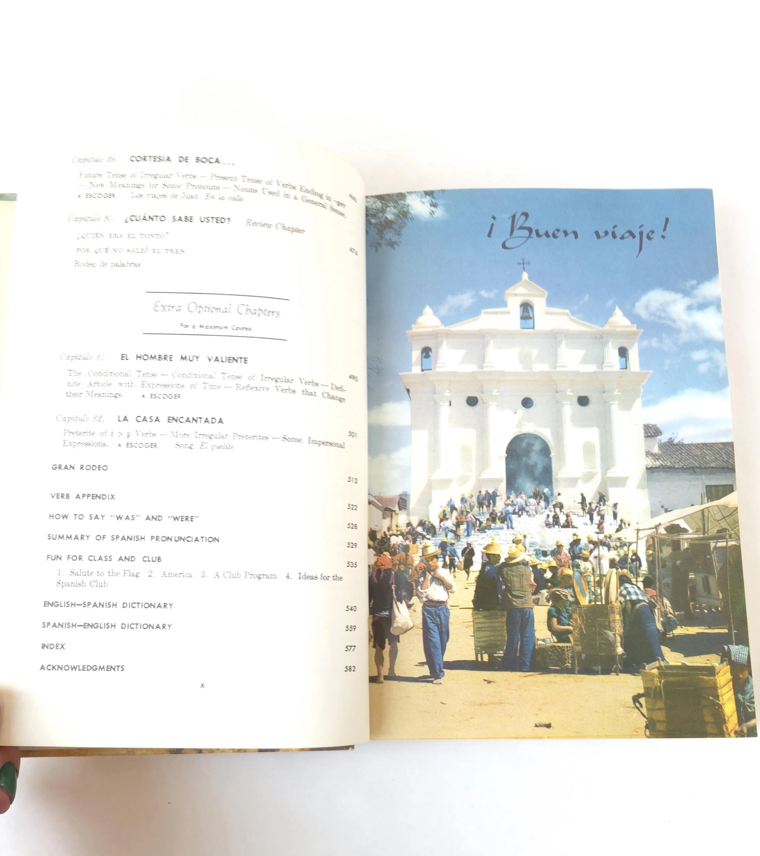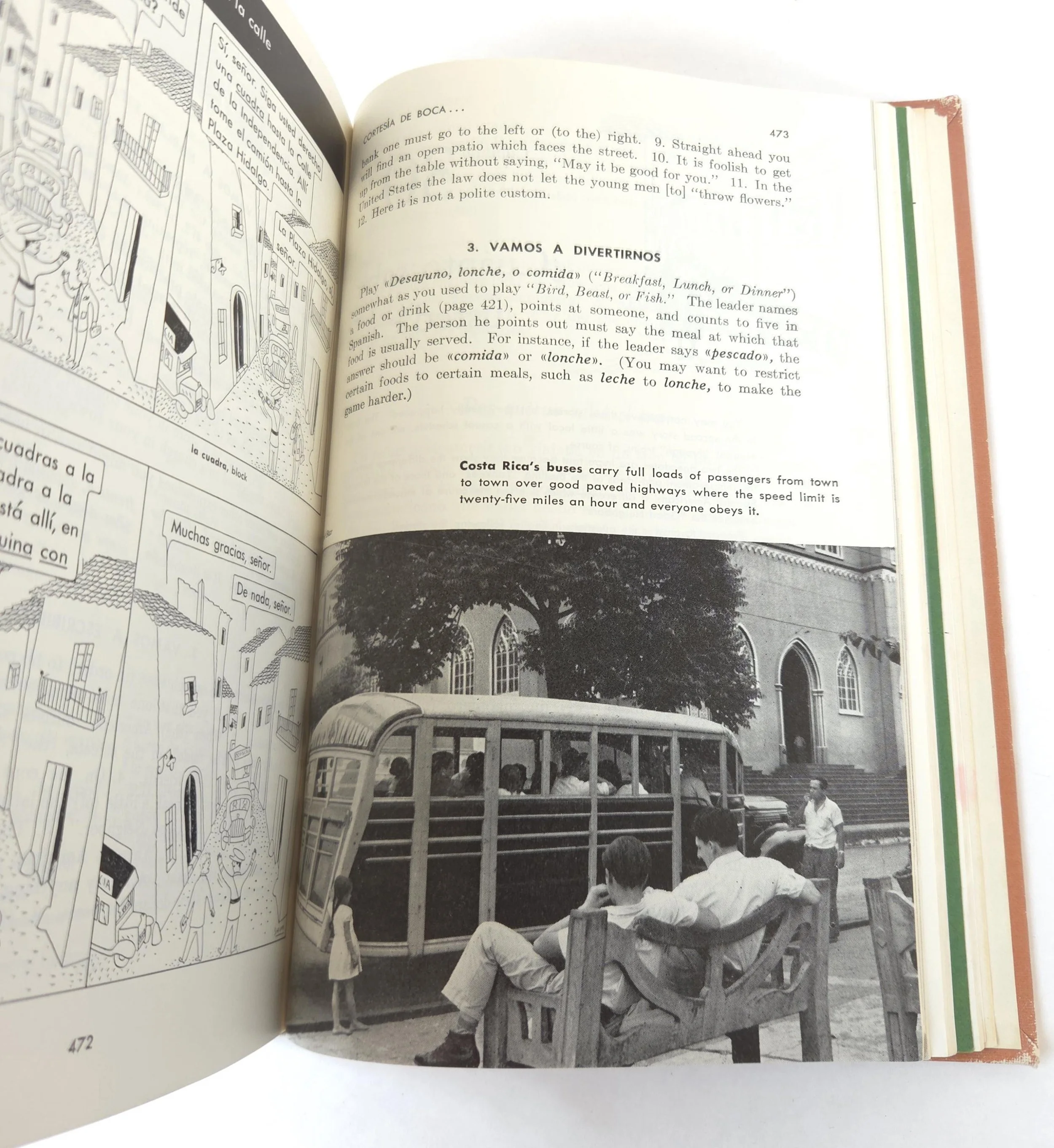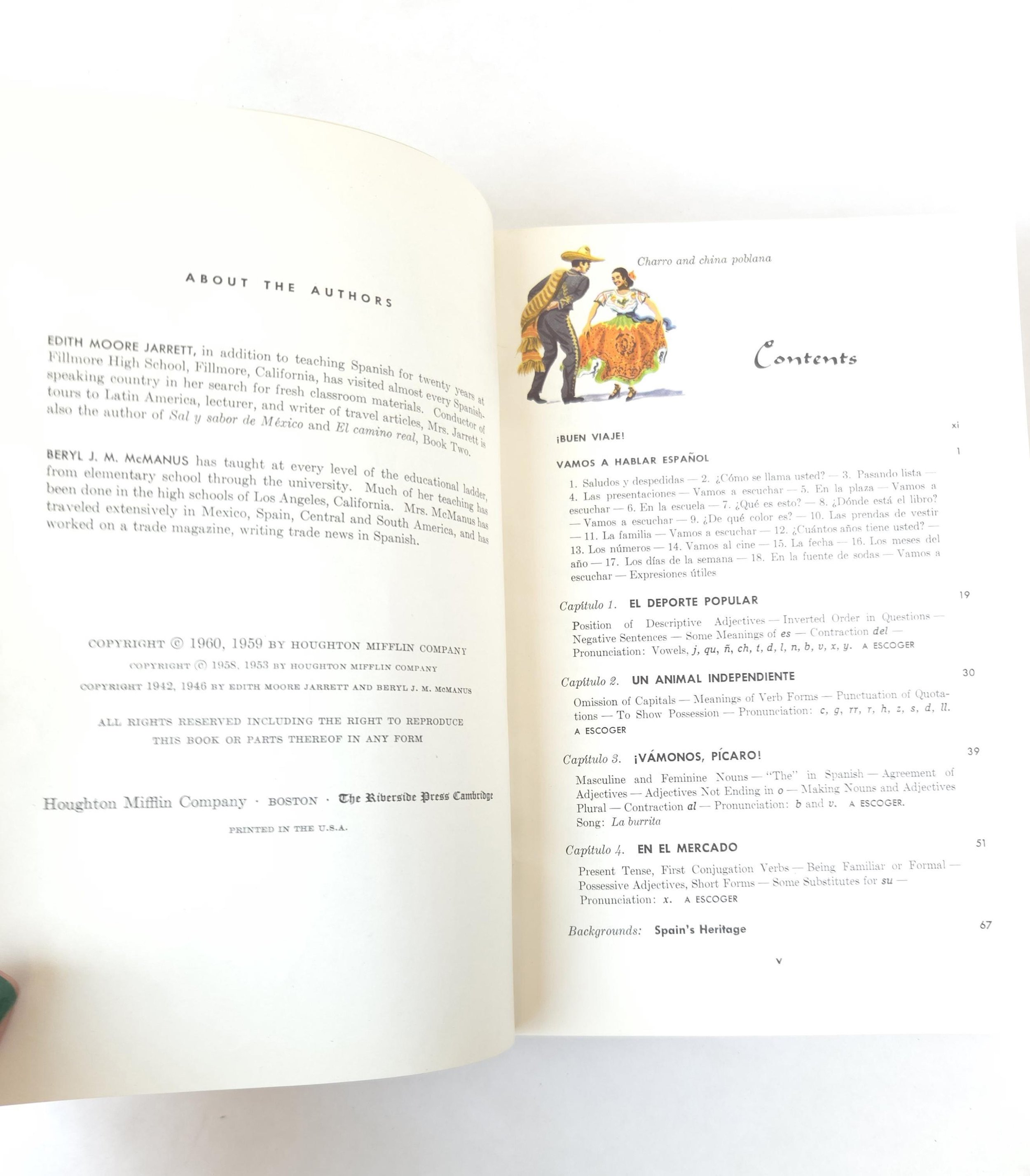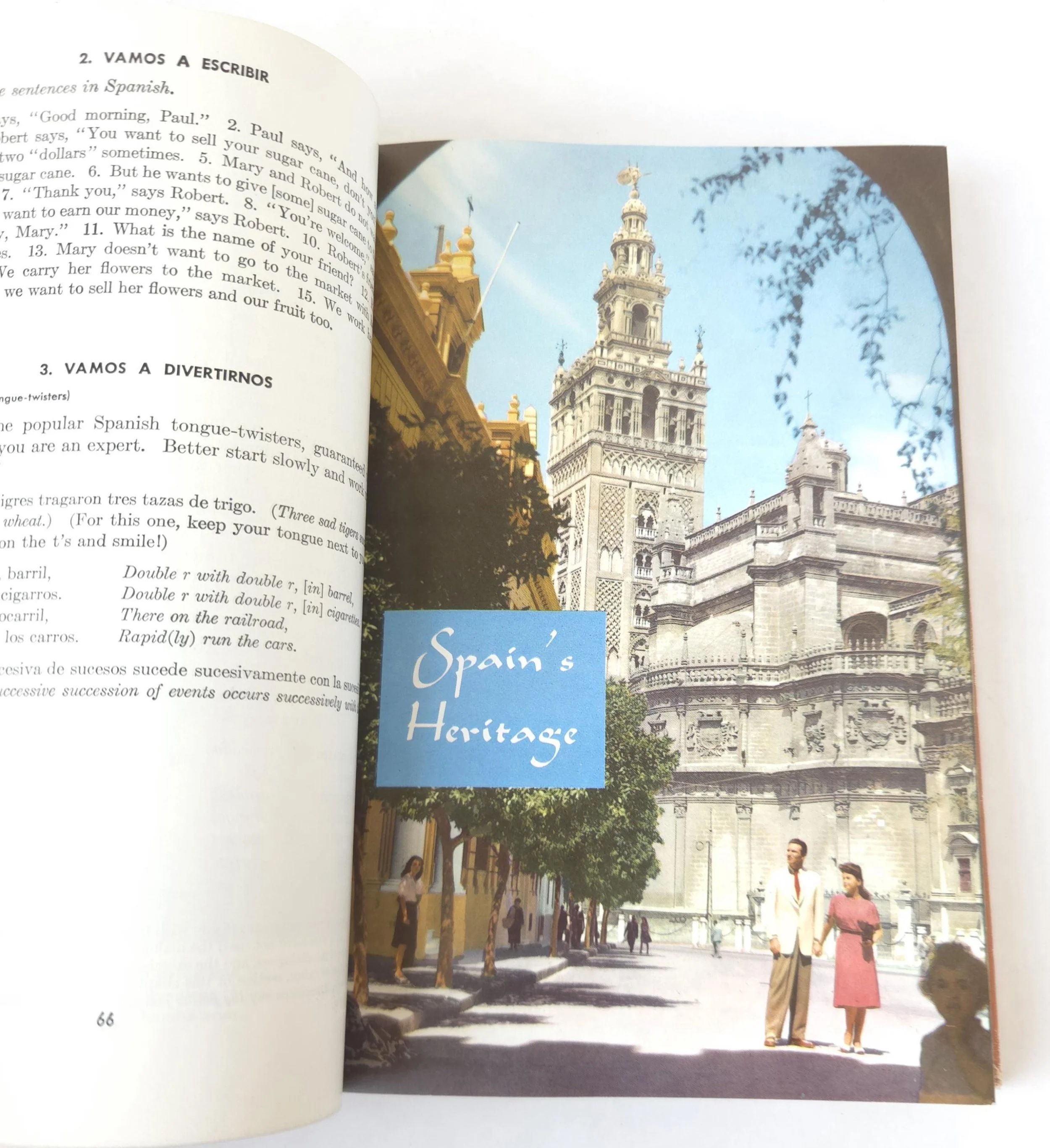 This beautiful vintage 1959 hardcover edition of El Camino Real by Jarrett and McManus is the third edition of Book One of this Spanish language textbook - enriched with photos and stories about Spanish culture from Europe to Central America. The book is in used vintage condition with some wear to the edges of the cover, as well as a name written on the page separating the body from the index. There are no torn or marked inner pages and excellent overall color quality.
