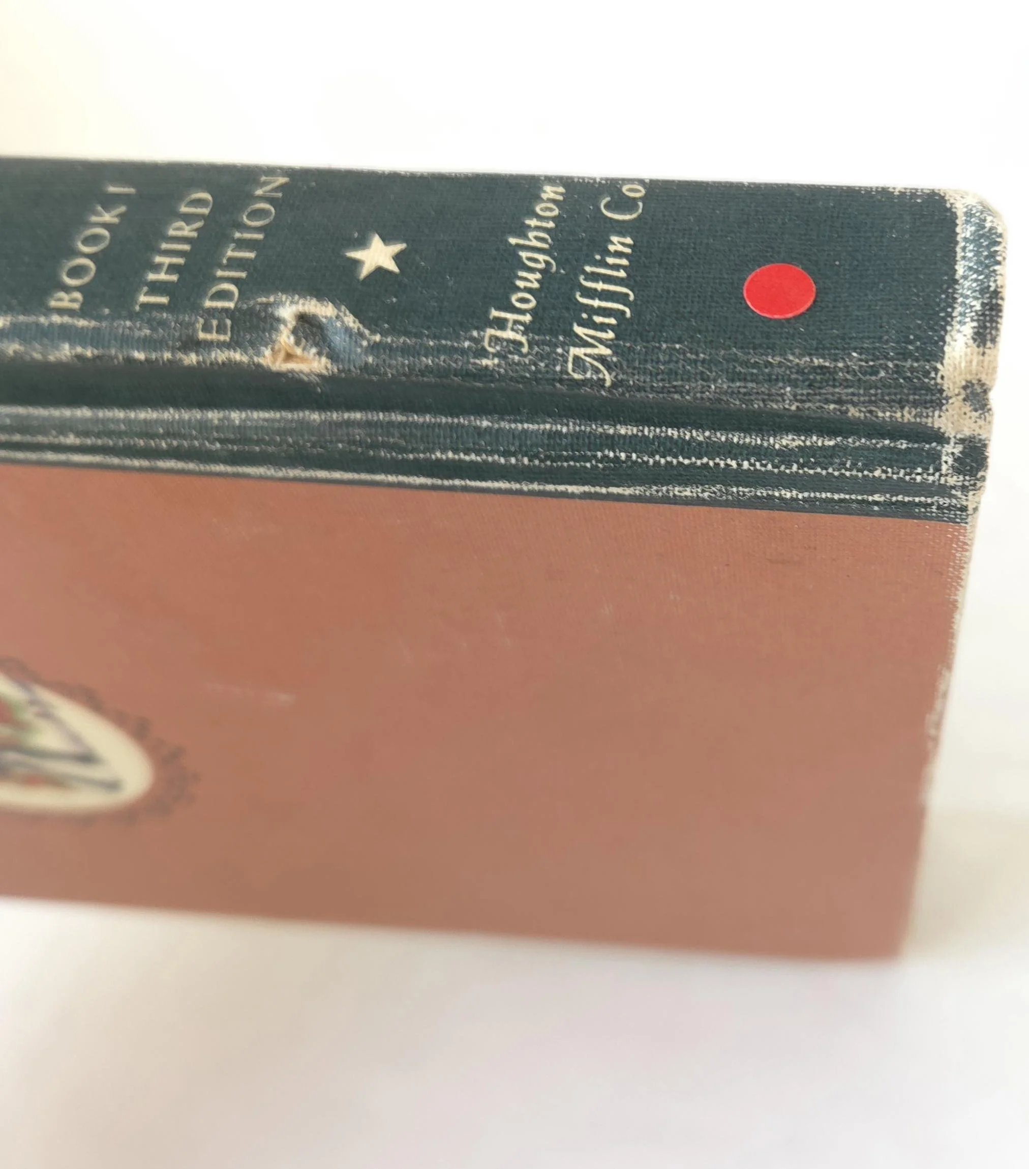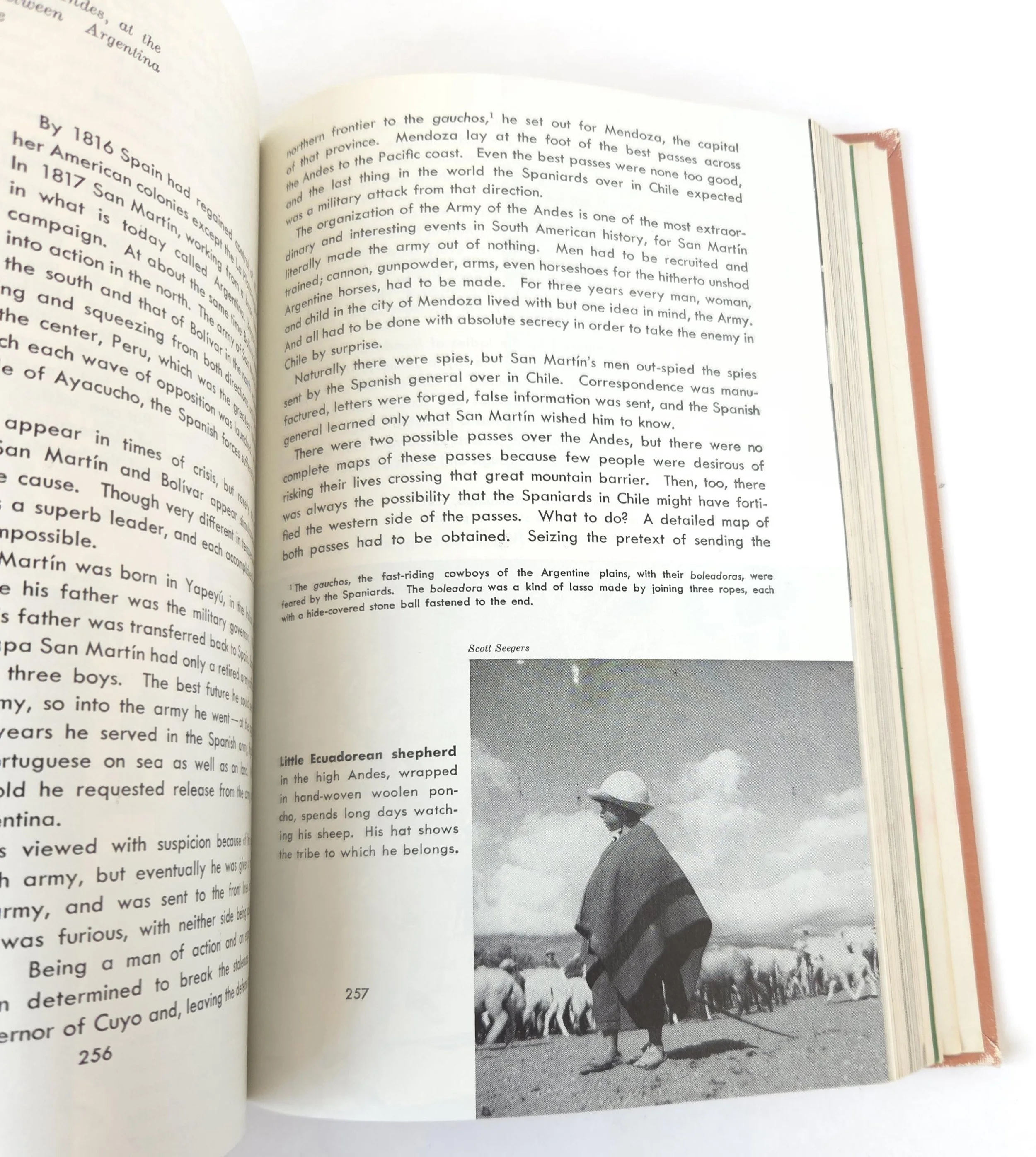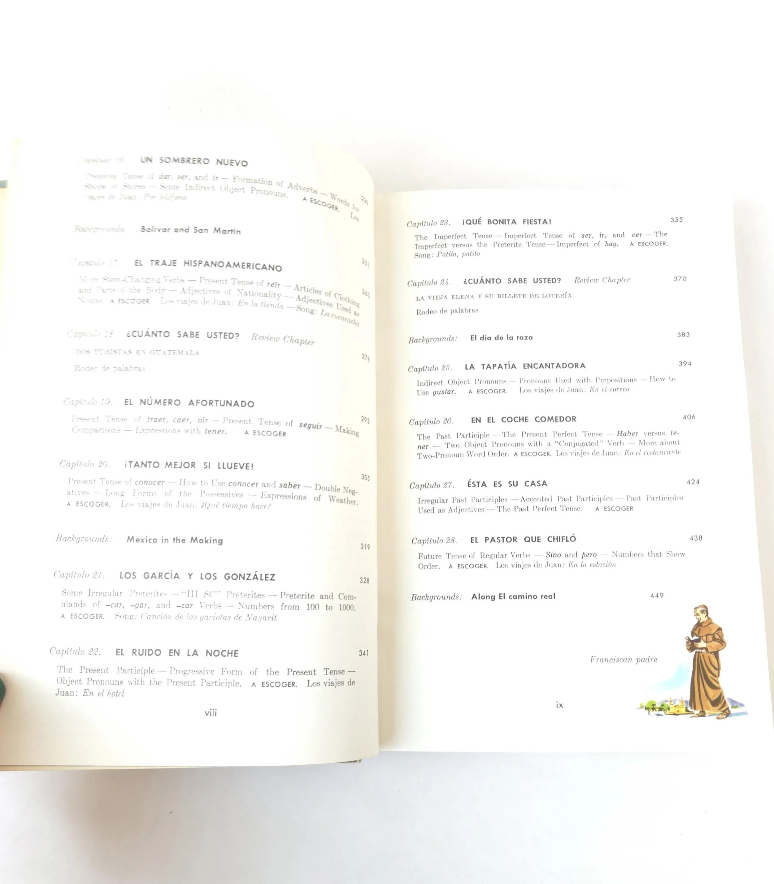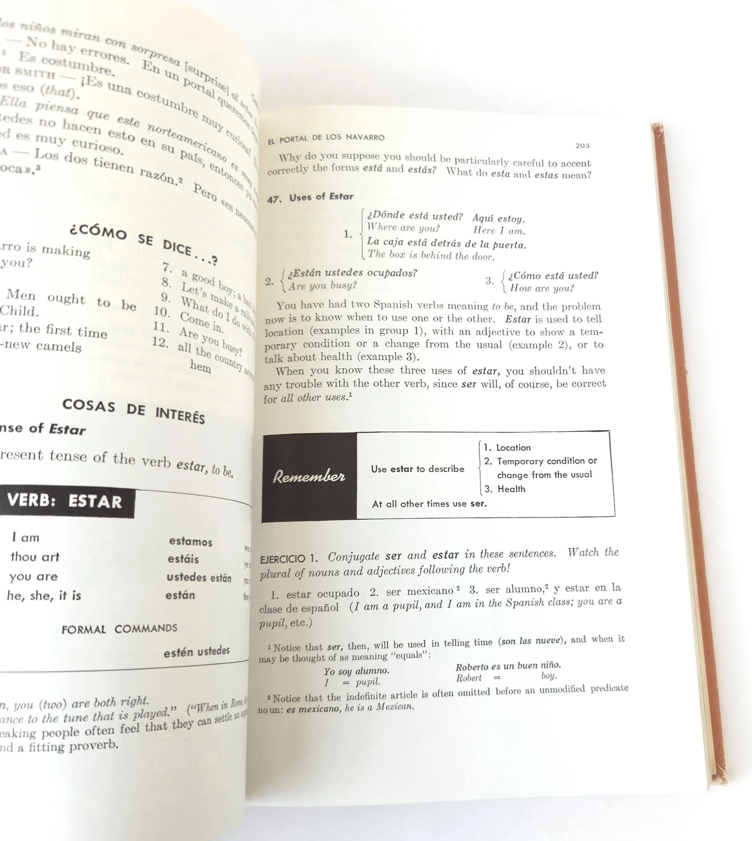 This beautiful vintage 1959 hardcover edition of El Camino Real by Jarrett and McManus is the third edition of Book One of this Spanish language textbook - enriched with photos and stories about Spanish culture from Europe to Central America. The book is in used vintage condition with some wear to the edges of the cover, as well as a name written on the page separating the body from the index. There are no torn or marked inner pages and excellent overall color quality.