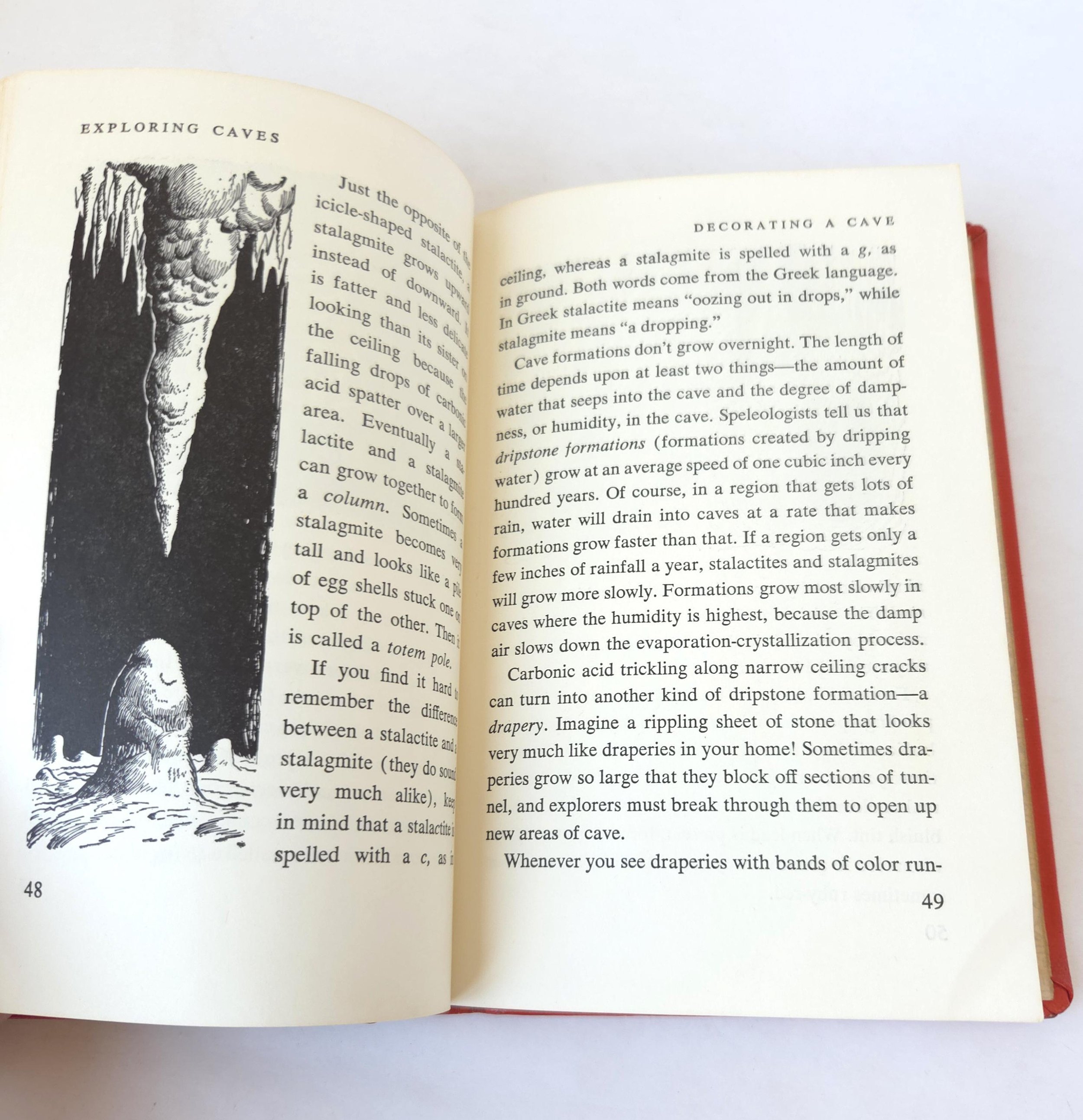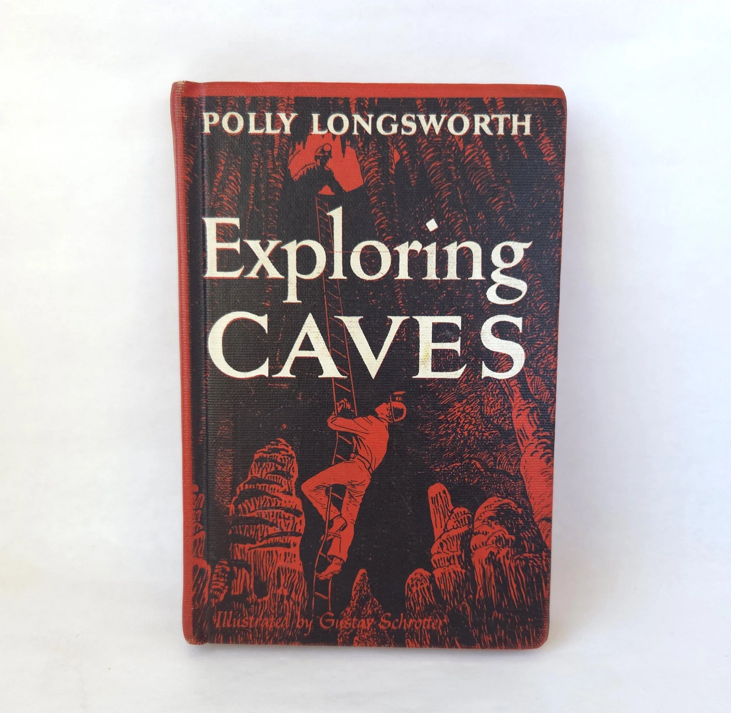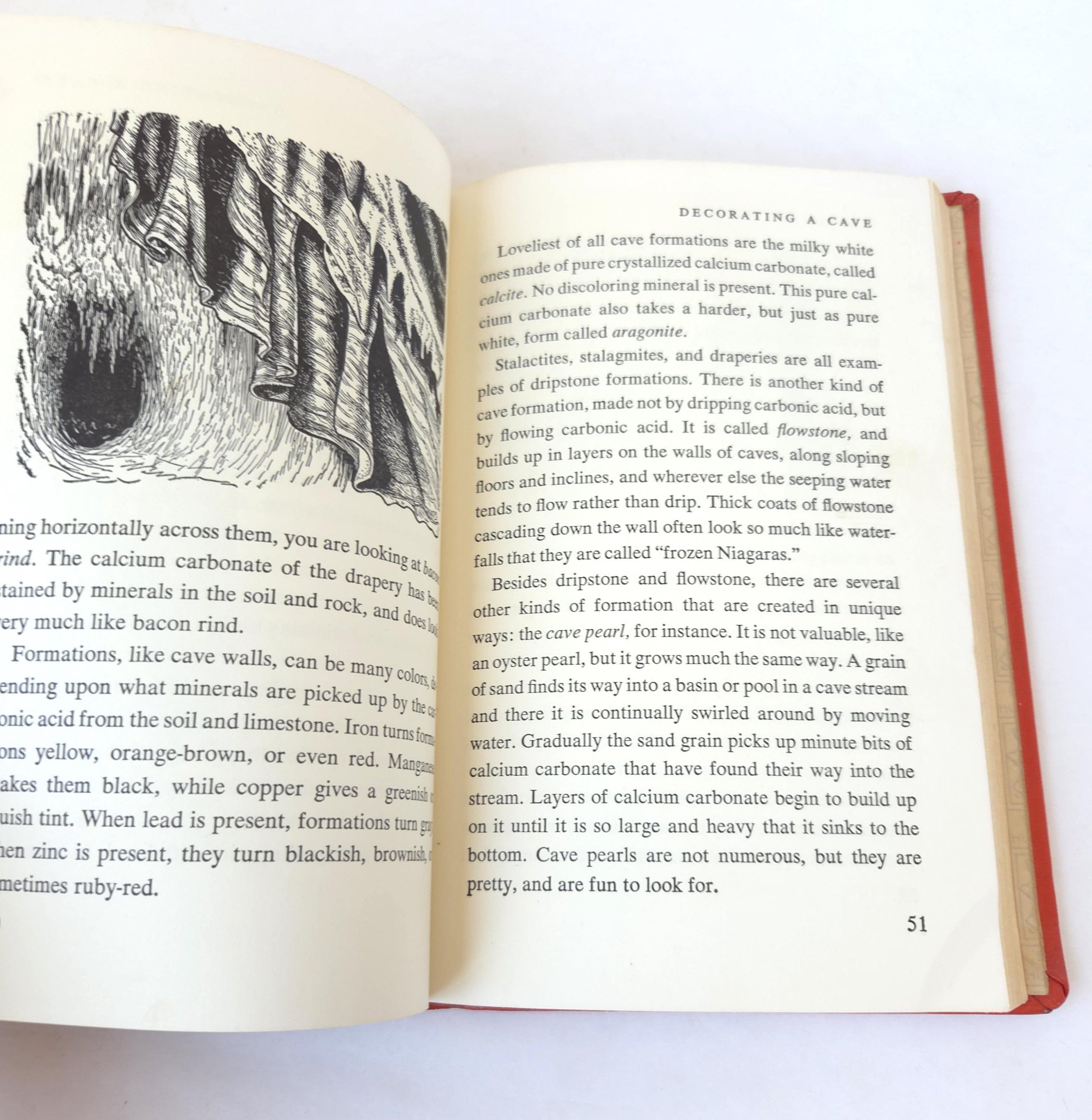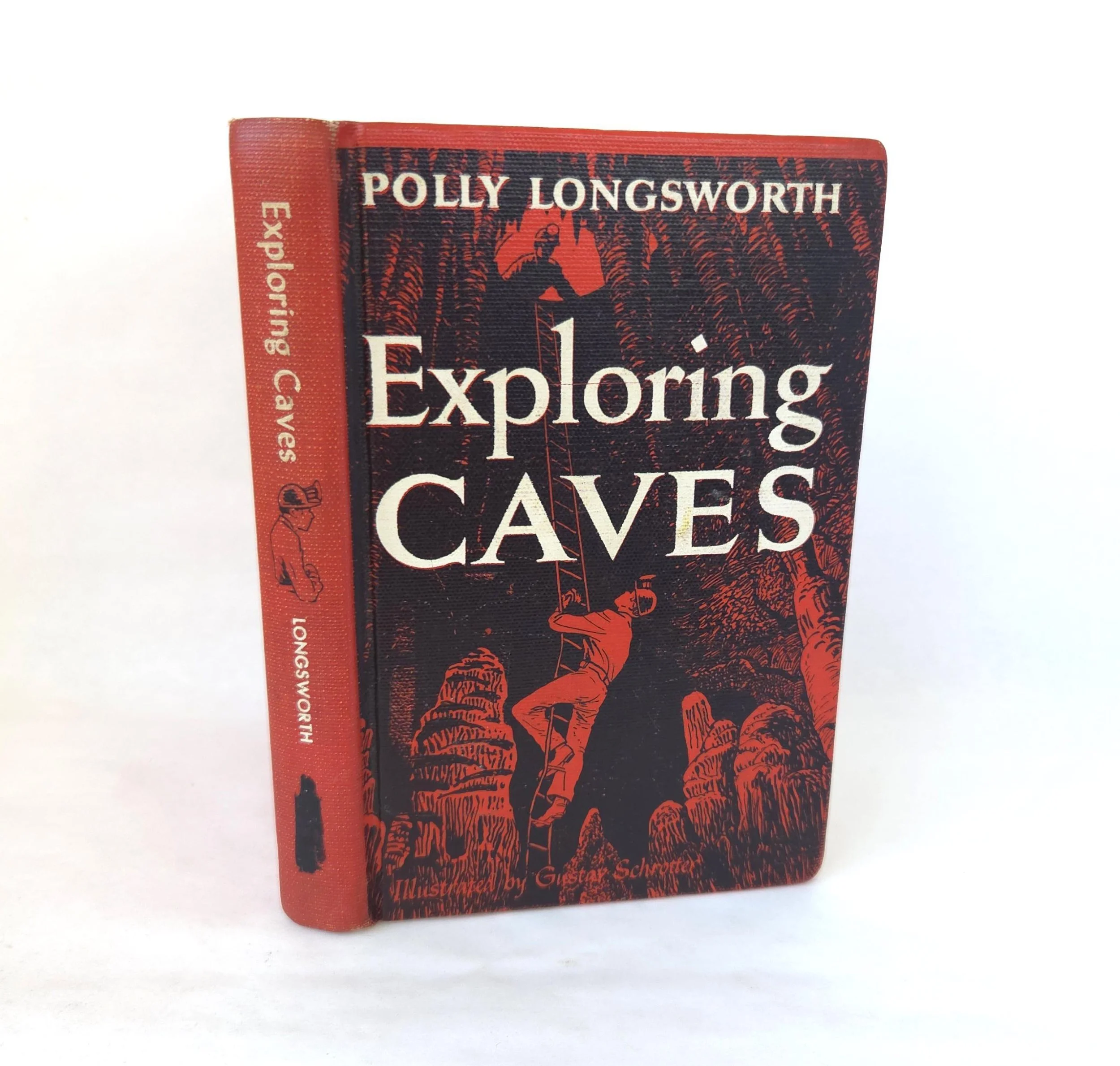 This charming vintage 1959 hardcover edition of Exploring Caves by Polly Longsworth features illustrations by Gustav Shrotter. It brings to life the formation of, life within and adventures that can be found inside caves around the world. The book is in used vintage condition with some minor wear to the edges of the cover along with some discoloration to the back cover, and a mark on the spine. The book belonged to a school library so it has a checkout card inside the cover and a few stamps on the title and end pages, but no torn or marked inner pages and good overall color quality.