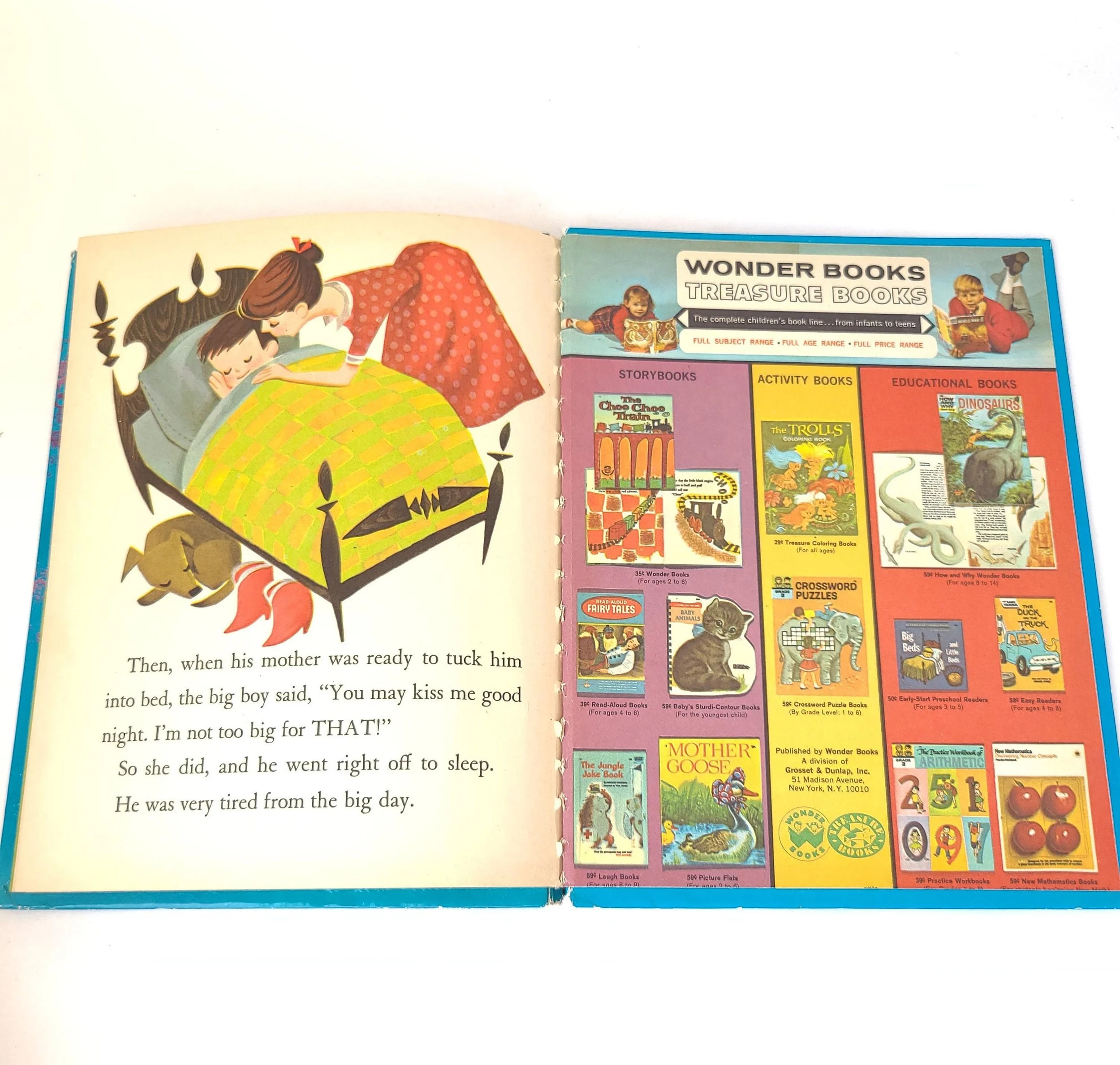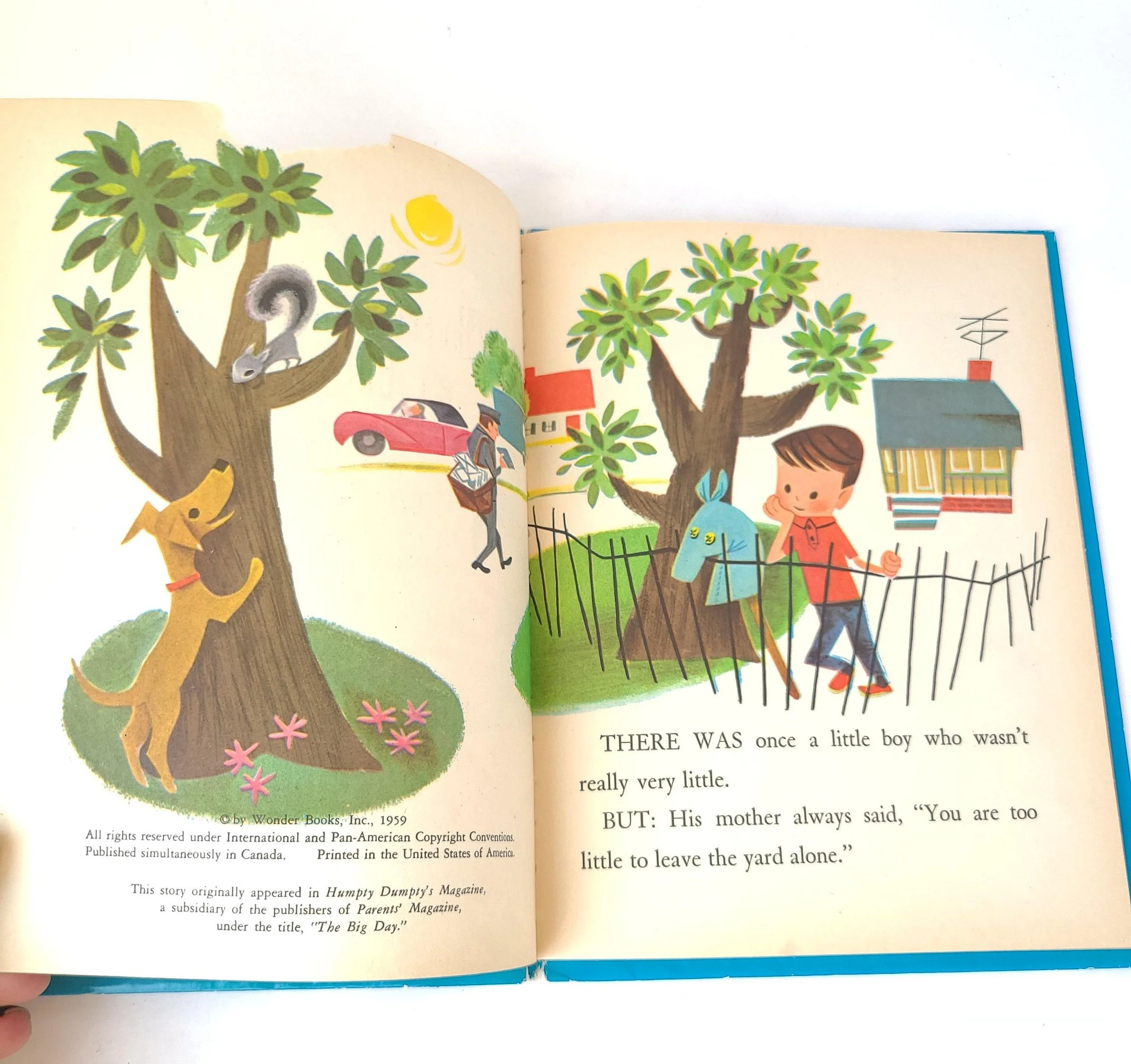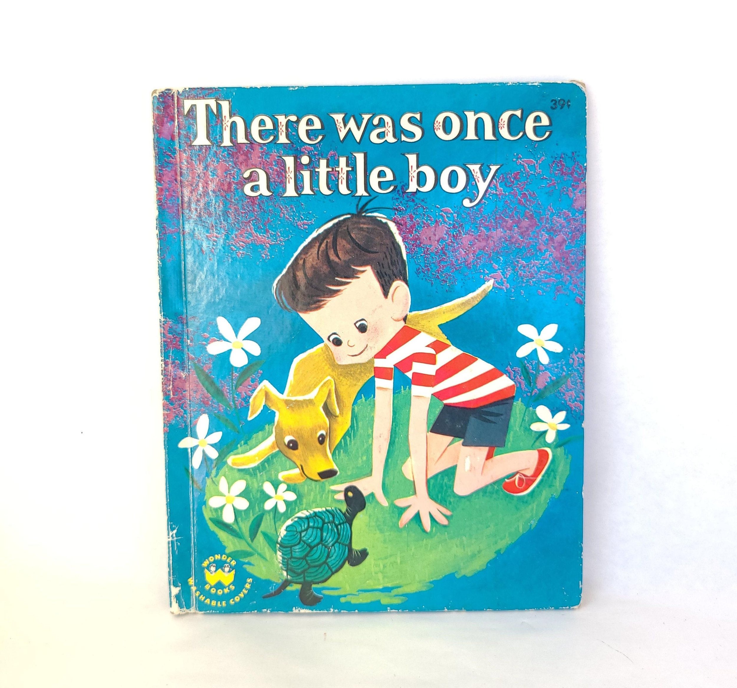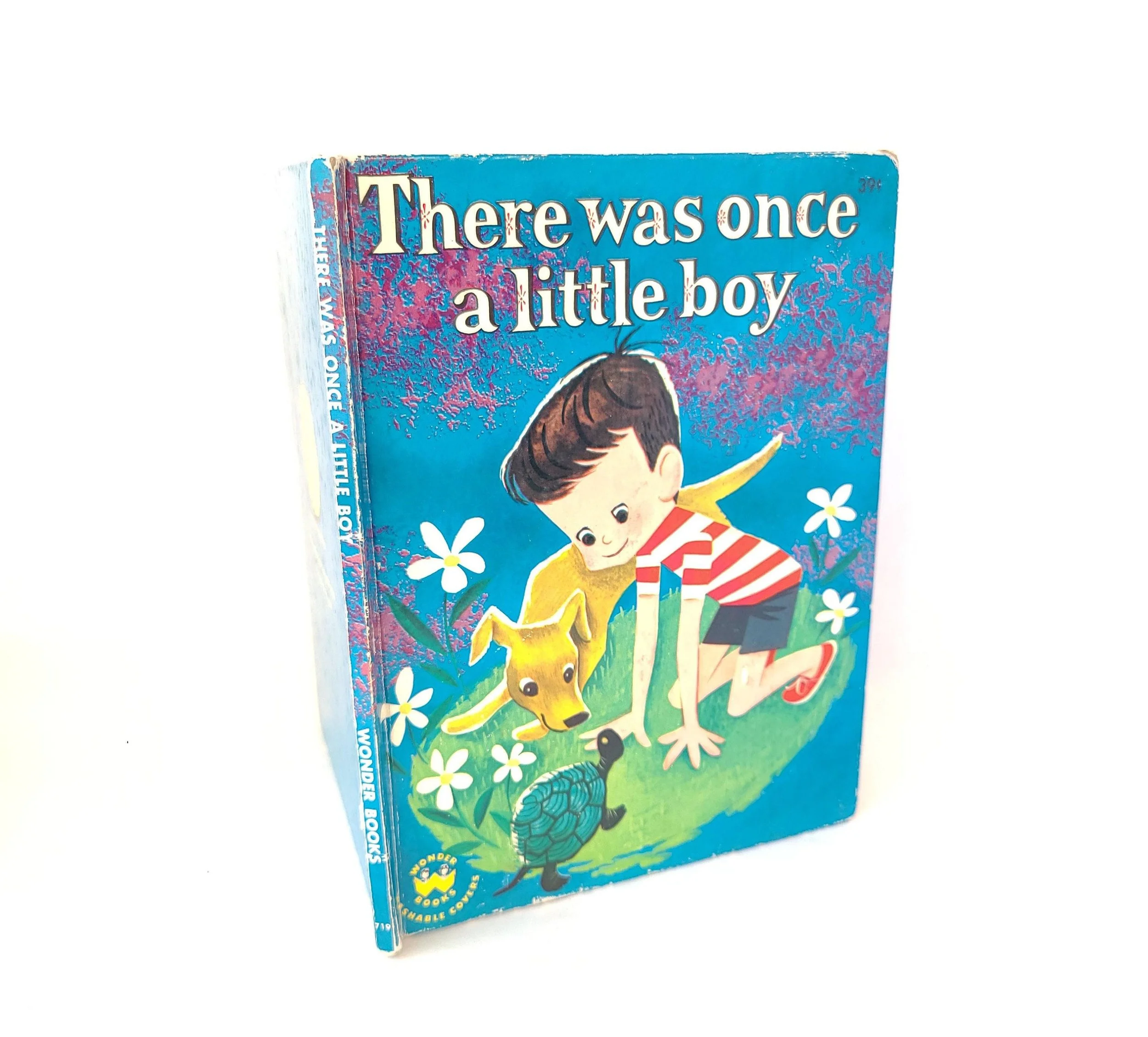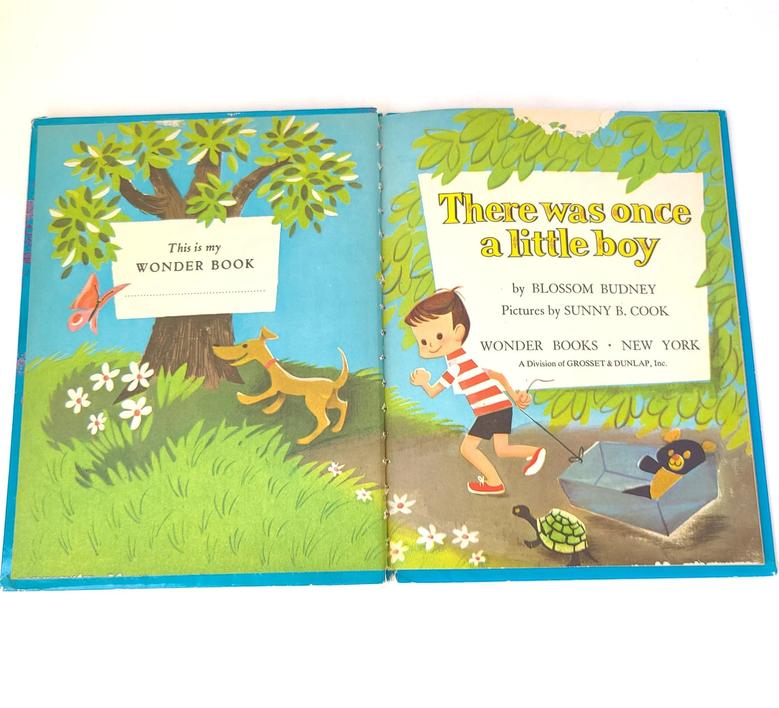 This precious vintage 1959 edition of There Was Once A Little Boy is a part of the Wonder Books series and was written by Blossom Budney and illustrated by Sunny B. Cook. The book is in used condition with wear to the edges of the cover along with some color loss. There is a tear to the top of the copyright page and some yellowing to the pages from age, but there are no torn or marked inner pages and good overall color quality.