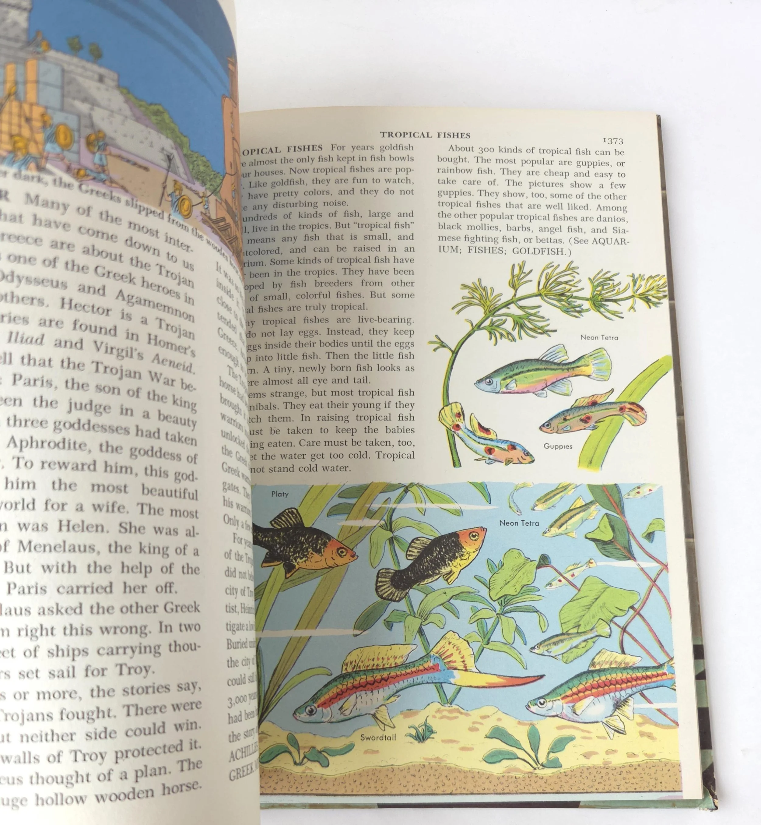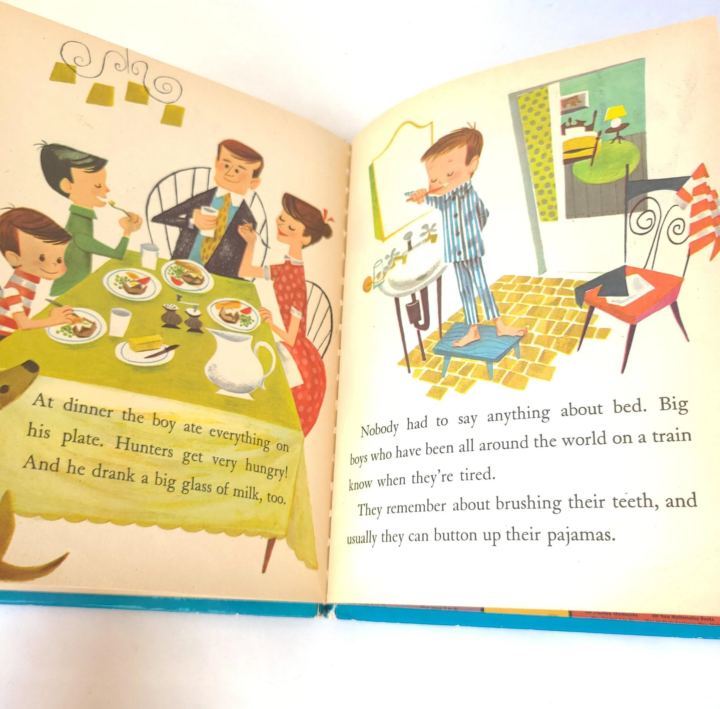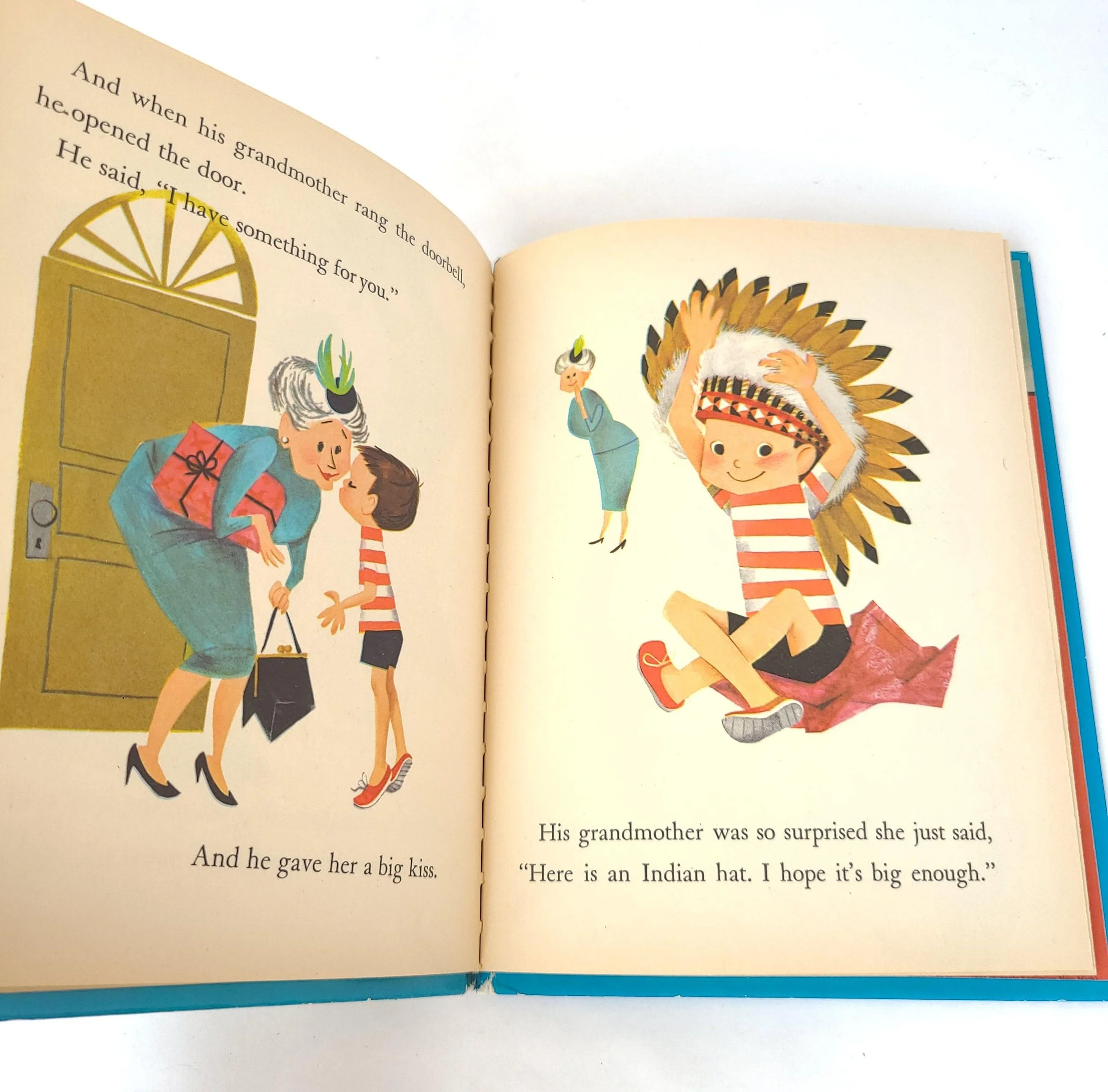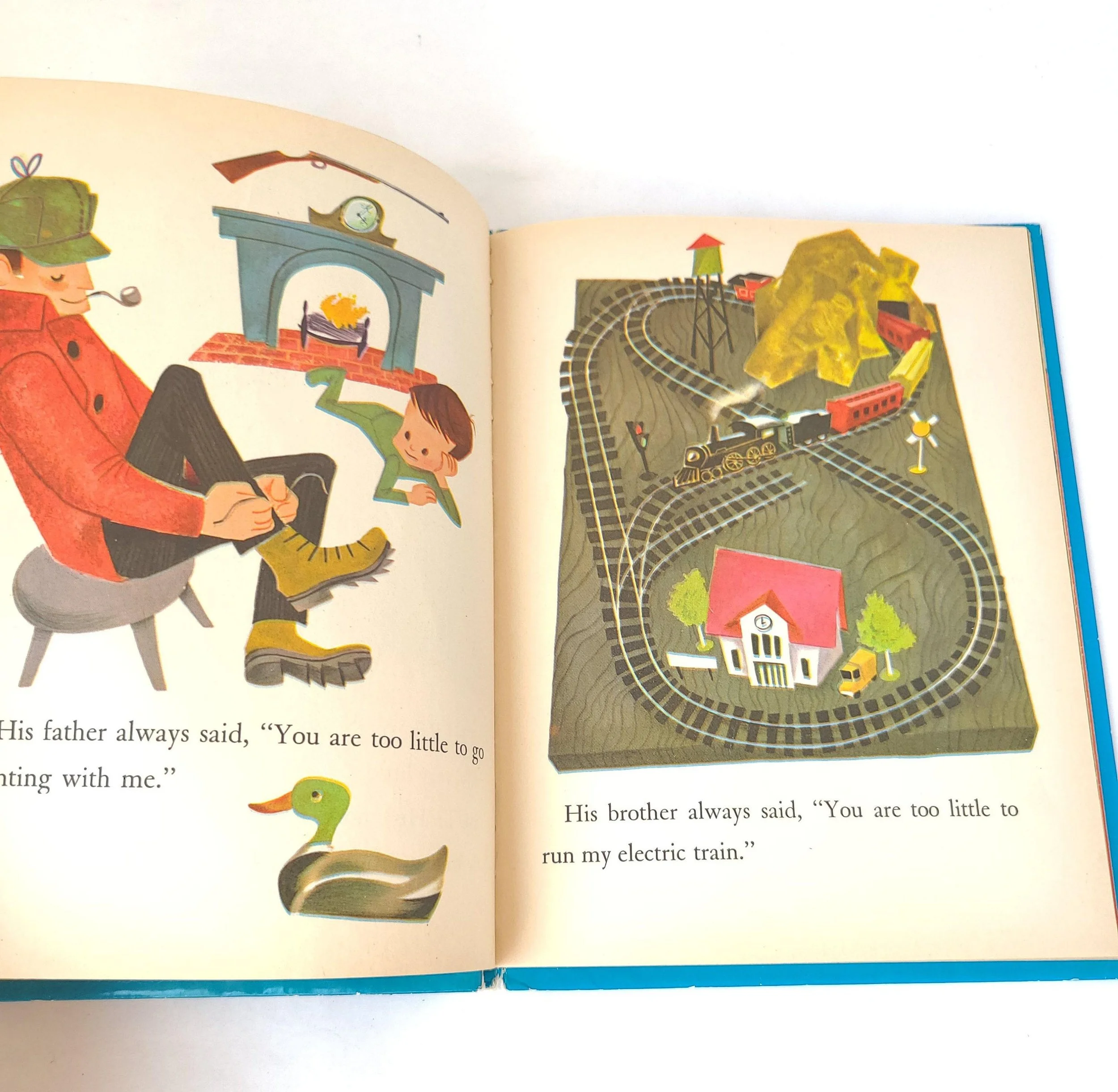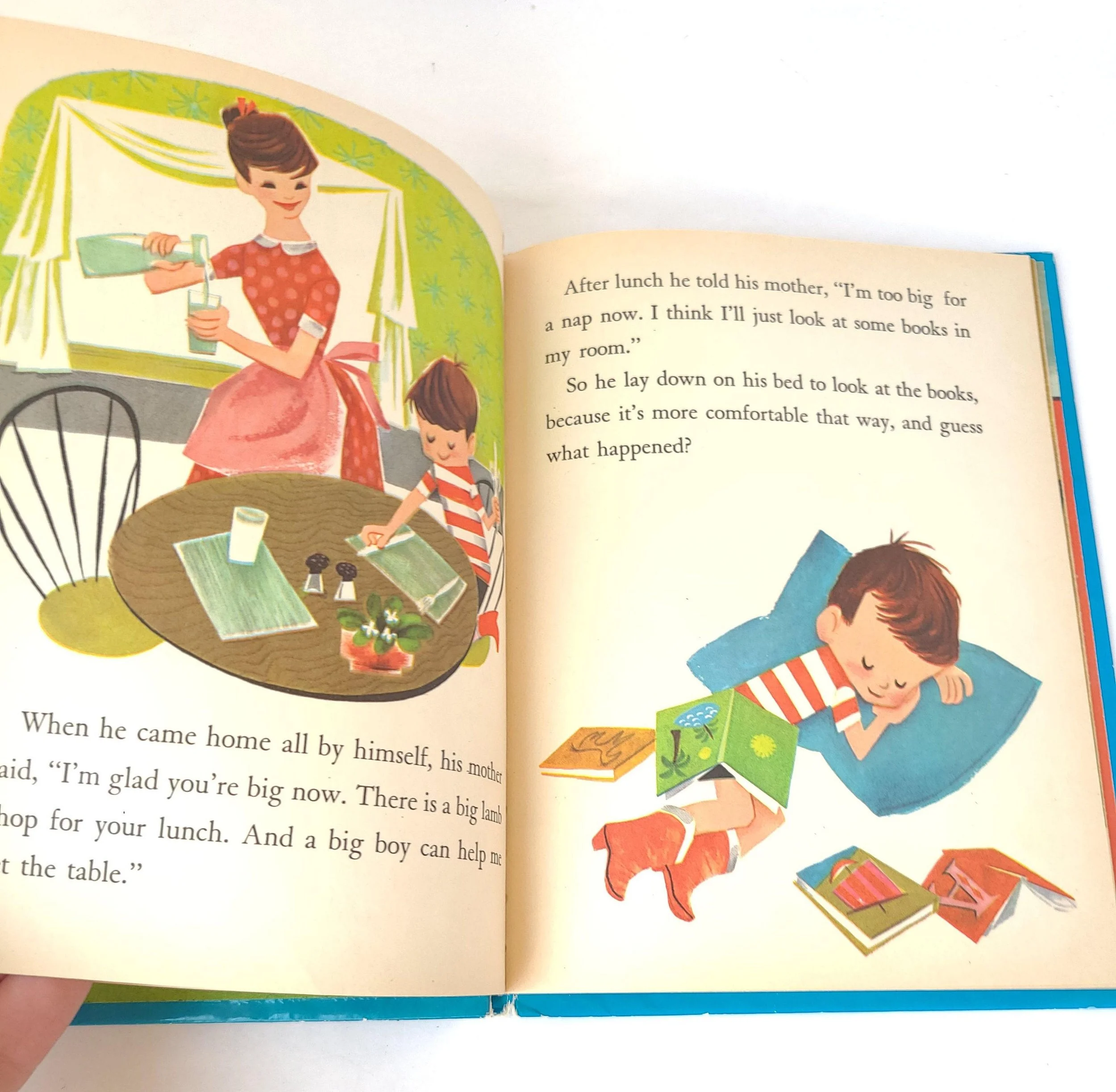 This precious vintage 1959 edition of There Was Once A Little Boy is a part of the Wonder Books series and was written by Blossom Budney and illustrated by Sunny B. Cook. The book is in used condition with wear to the edges of the cover along with some color loss. There is a tear to the top of the copyright page and some yellowing to the pages from age, but there are no torn or marked inner pages and good overall color quality.