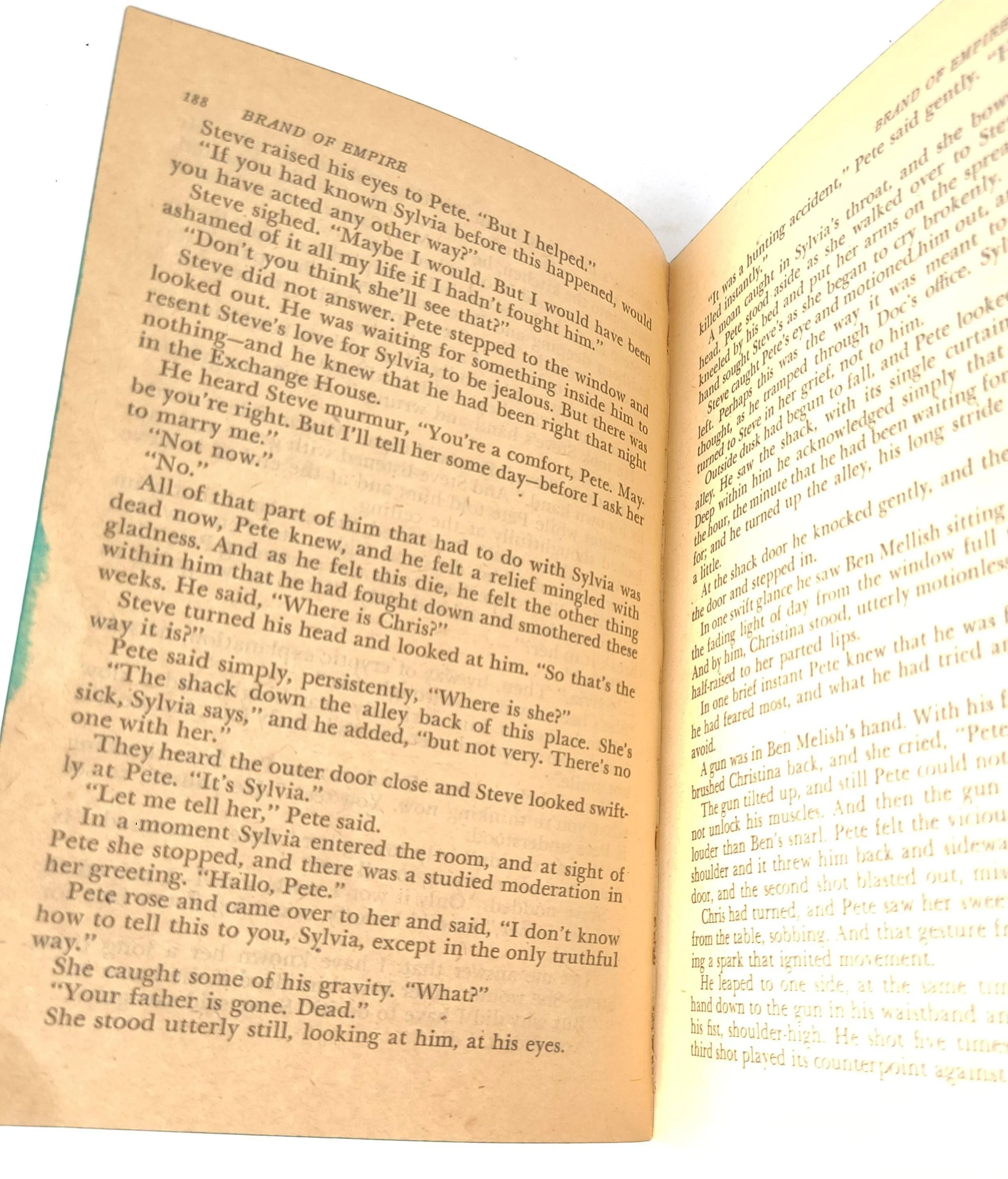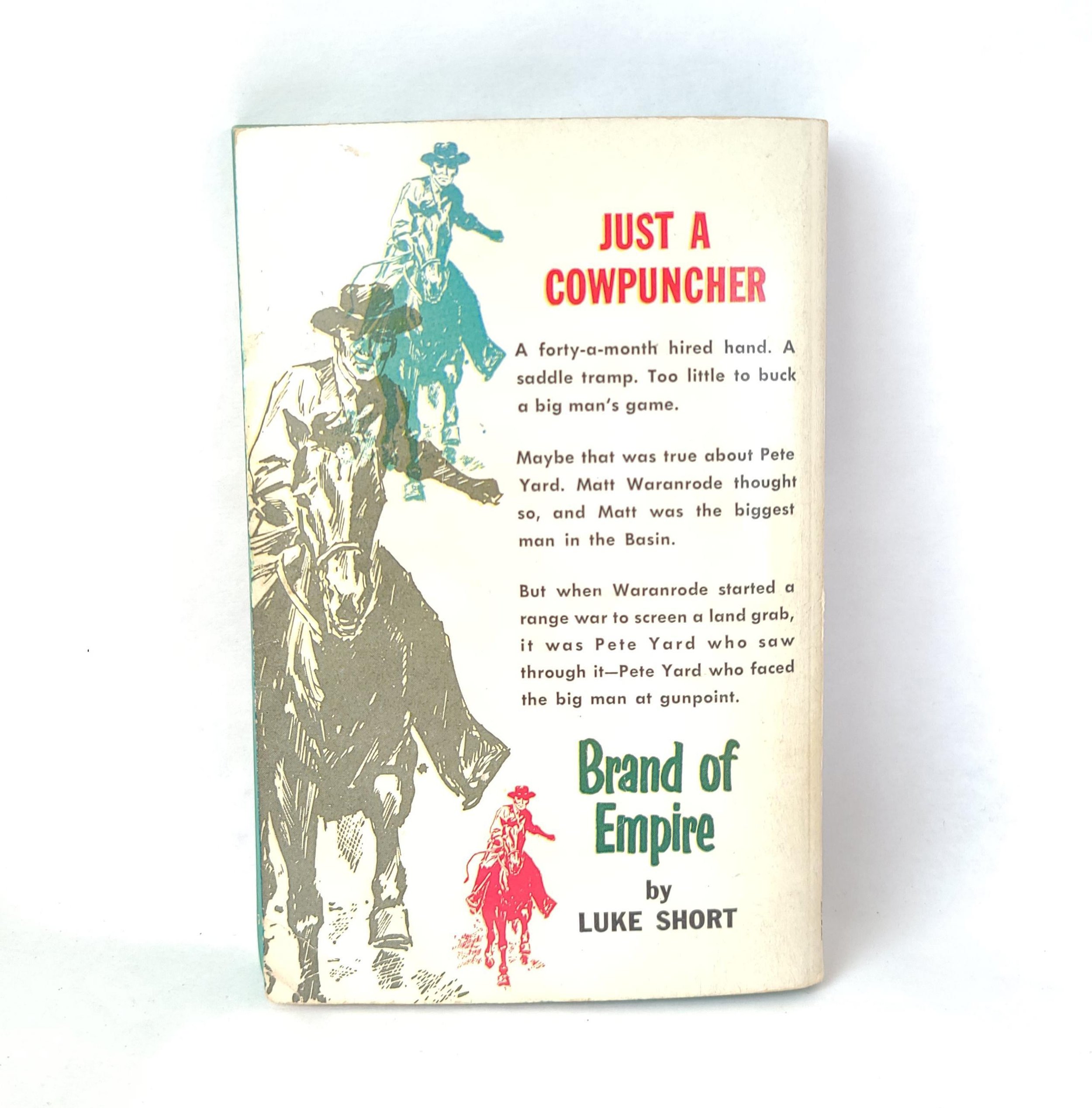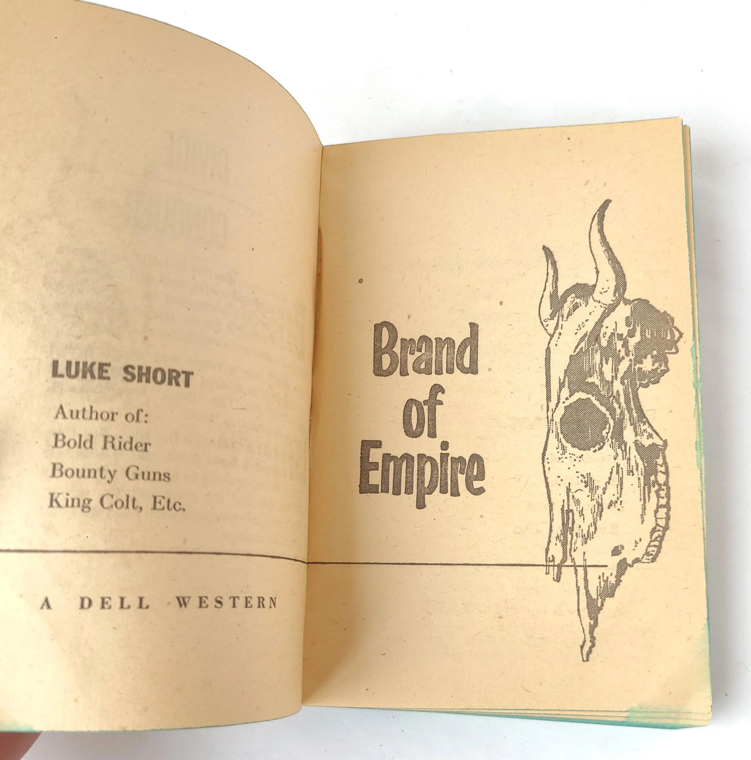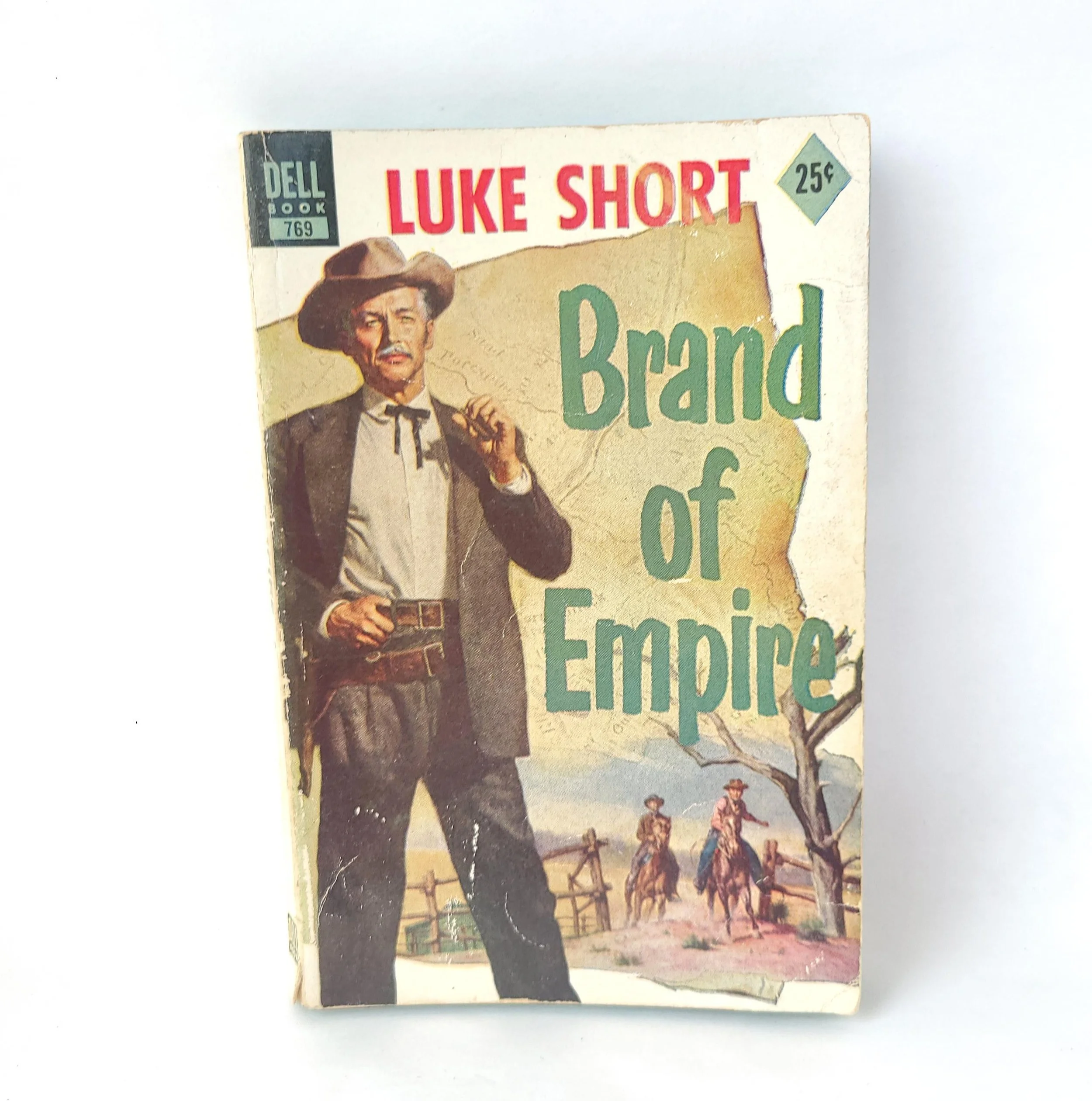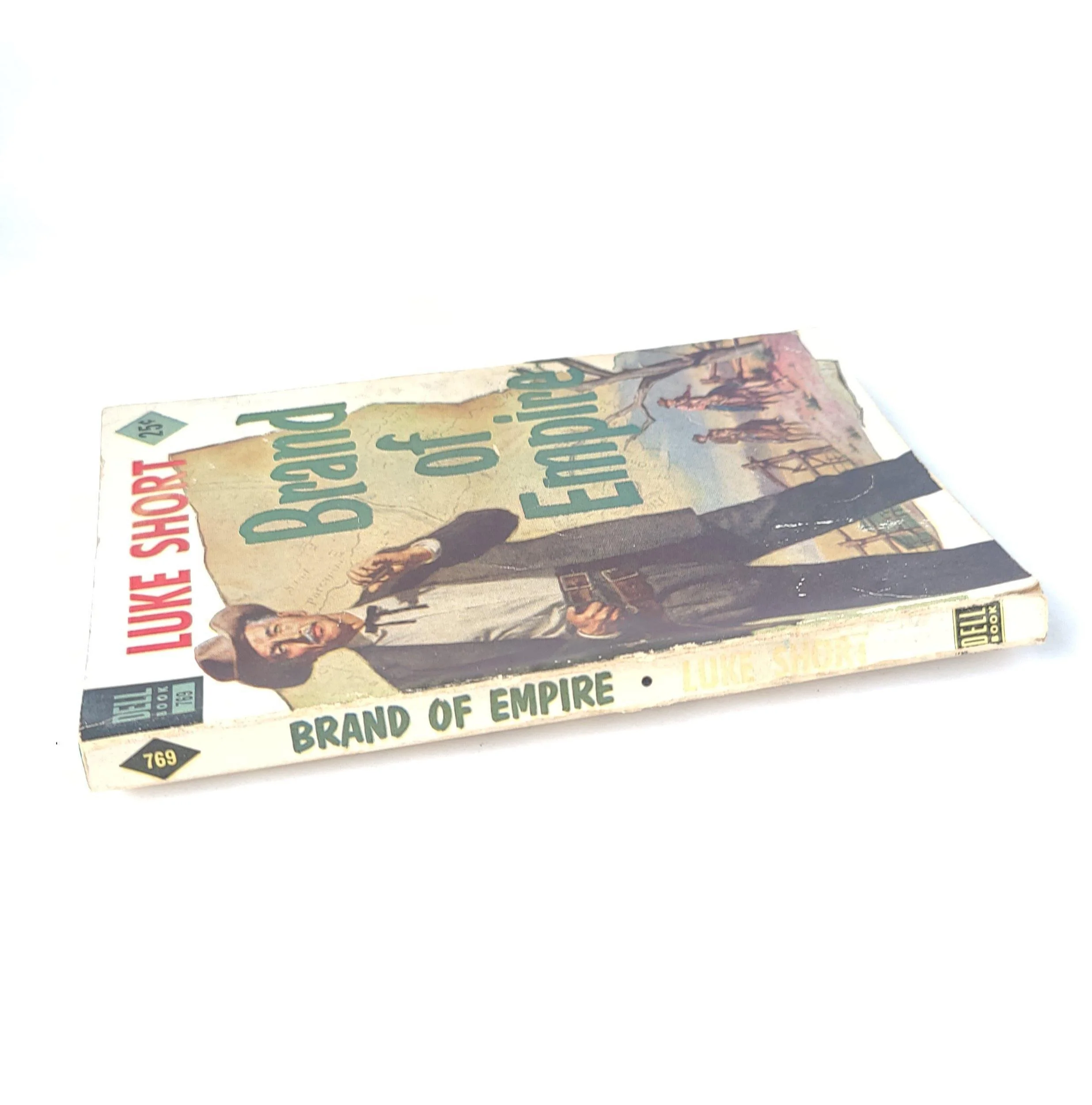 This vintage paperback edition of Brand of Empire by Luke Short is a 1960's reprint of this classic 1930's pulp western. The book is in used condition with some wear and small tears to the edges, as well as light scratching to the cover. There is a check mark written on the front end page, but there are no torn or marked inner pages and good overall color quality.