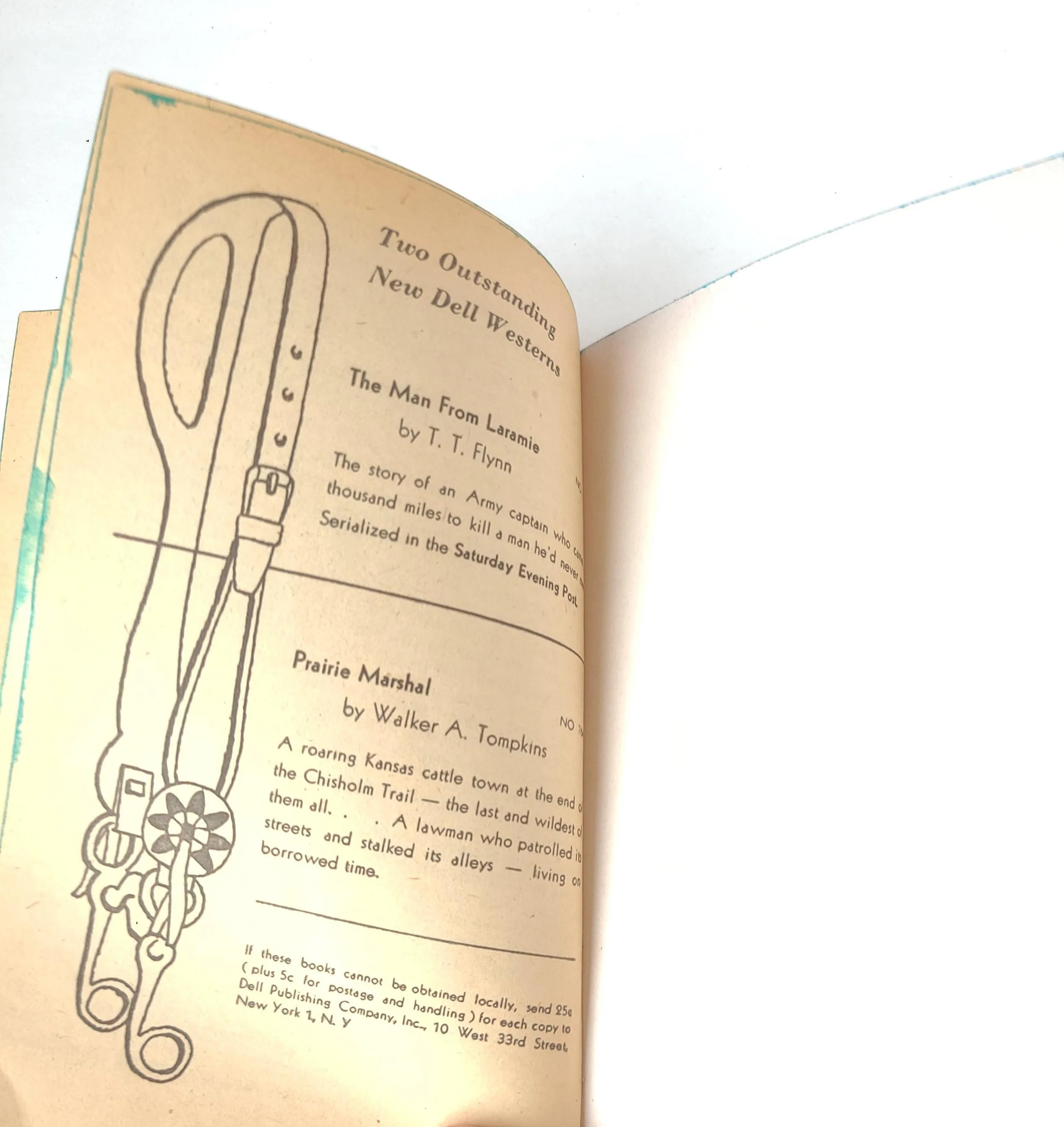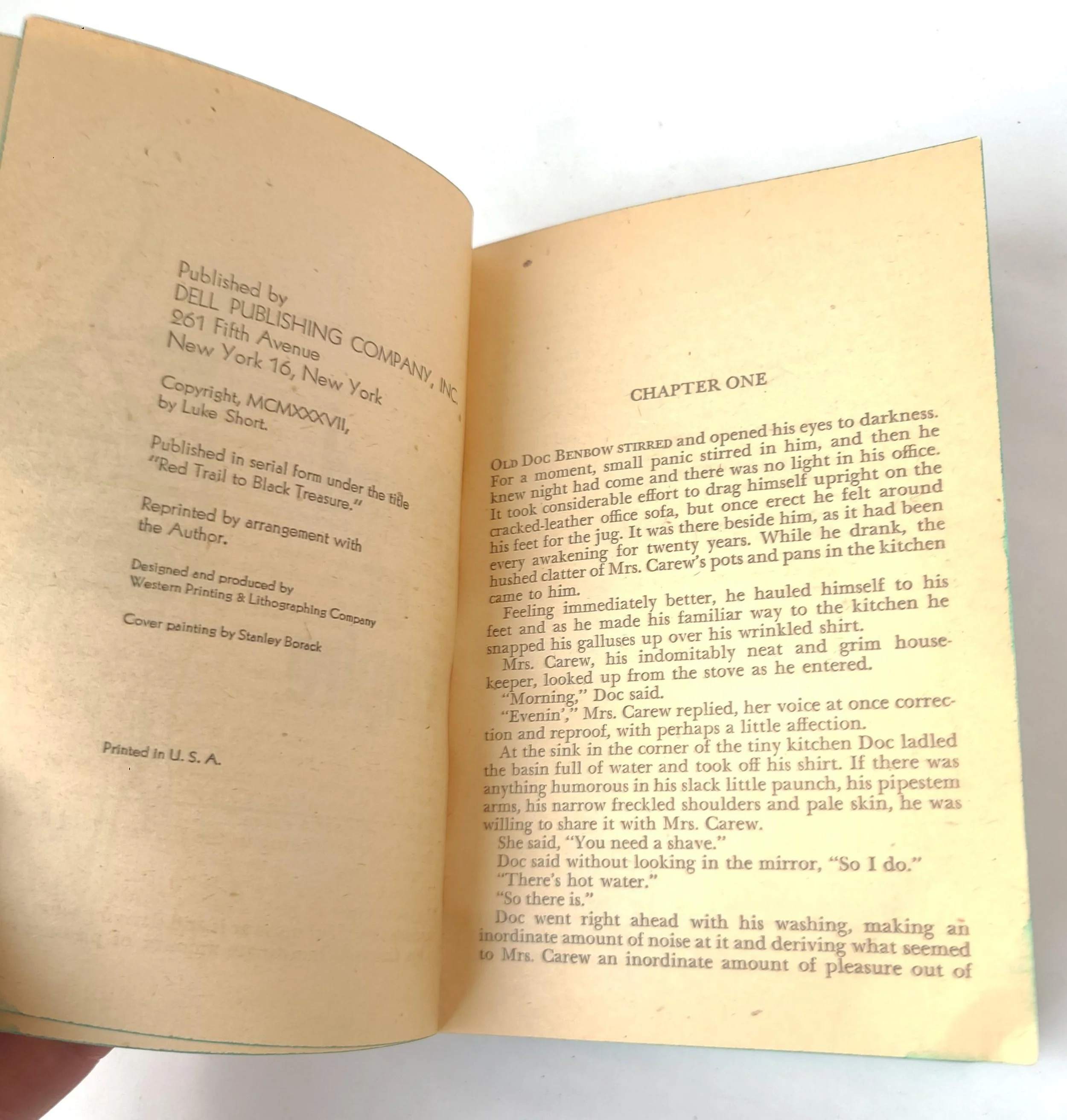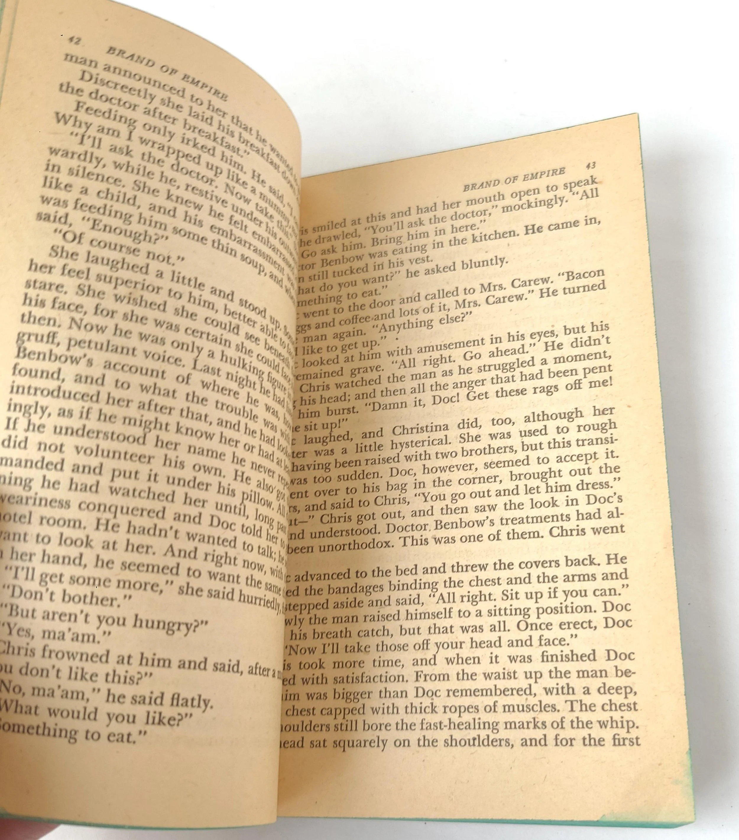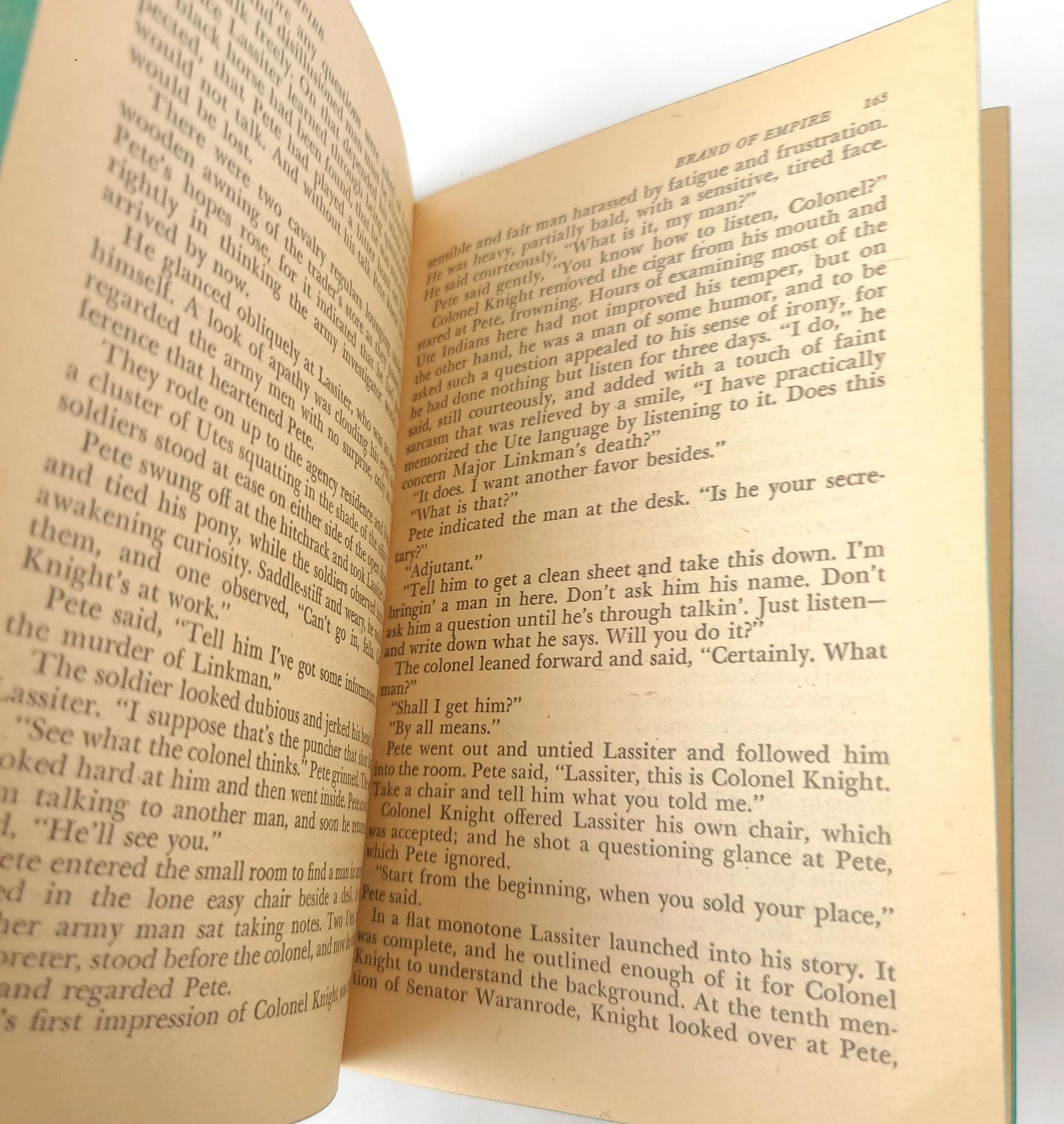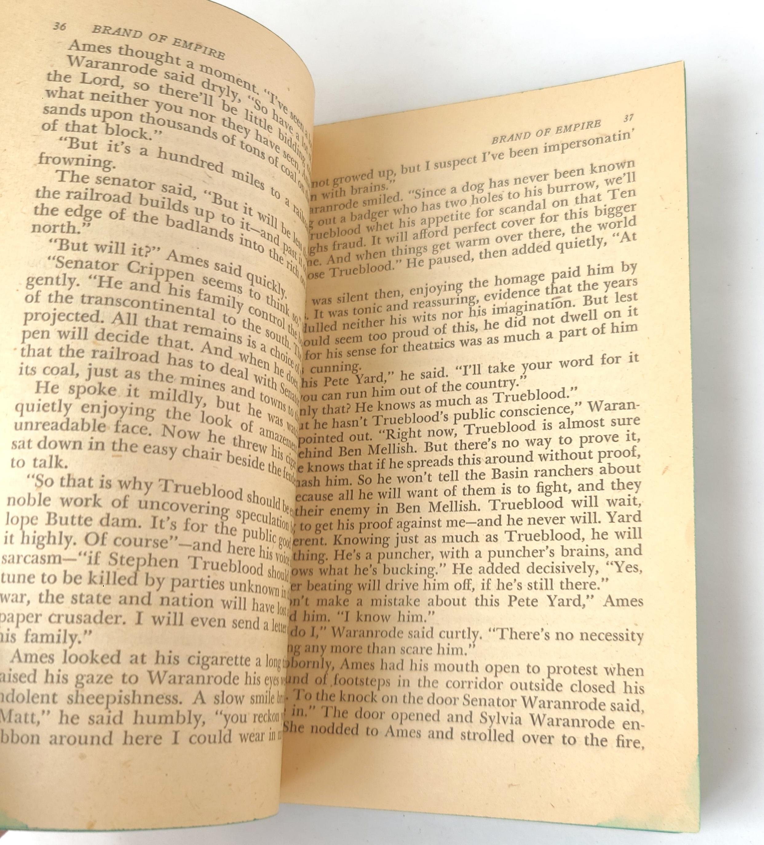 This vintage paperback edition of Brand of Empire by Luke Short is a 1960's reprint of this classic 1930's pulp western. The book is in used condition with some wear and small tears to the edges, as well as light scratching to the cover. There is a check mark written on the front end page, but there are no torn or marked inner pages and good overall color quality.