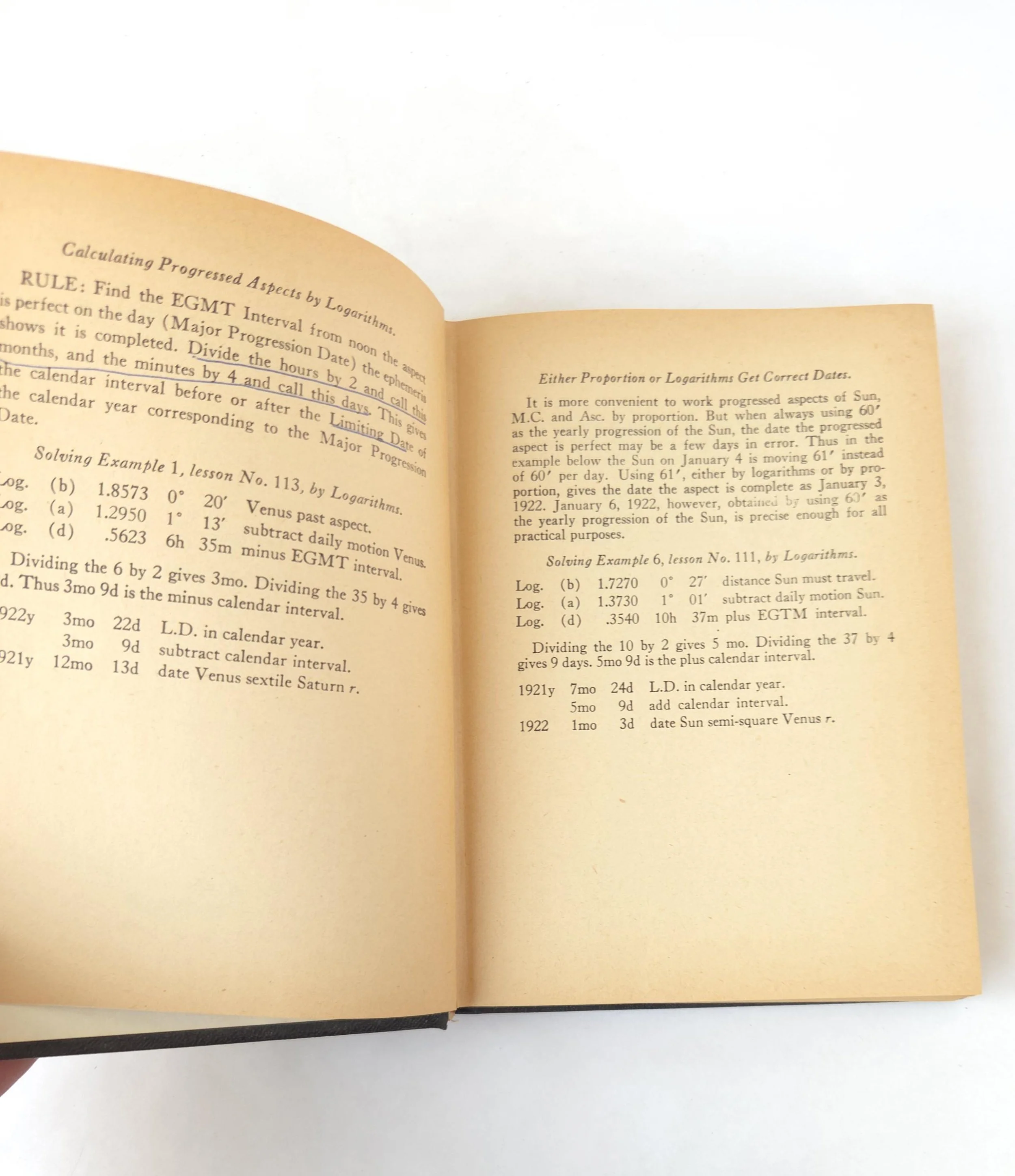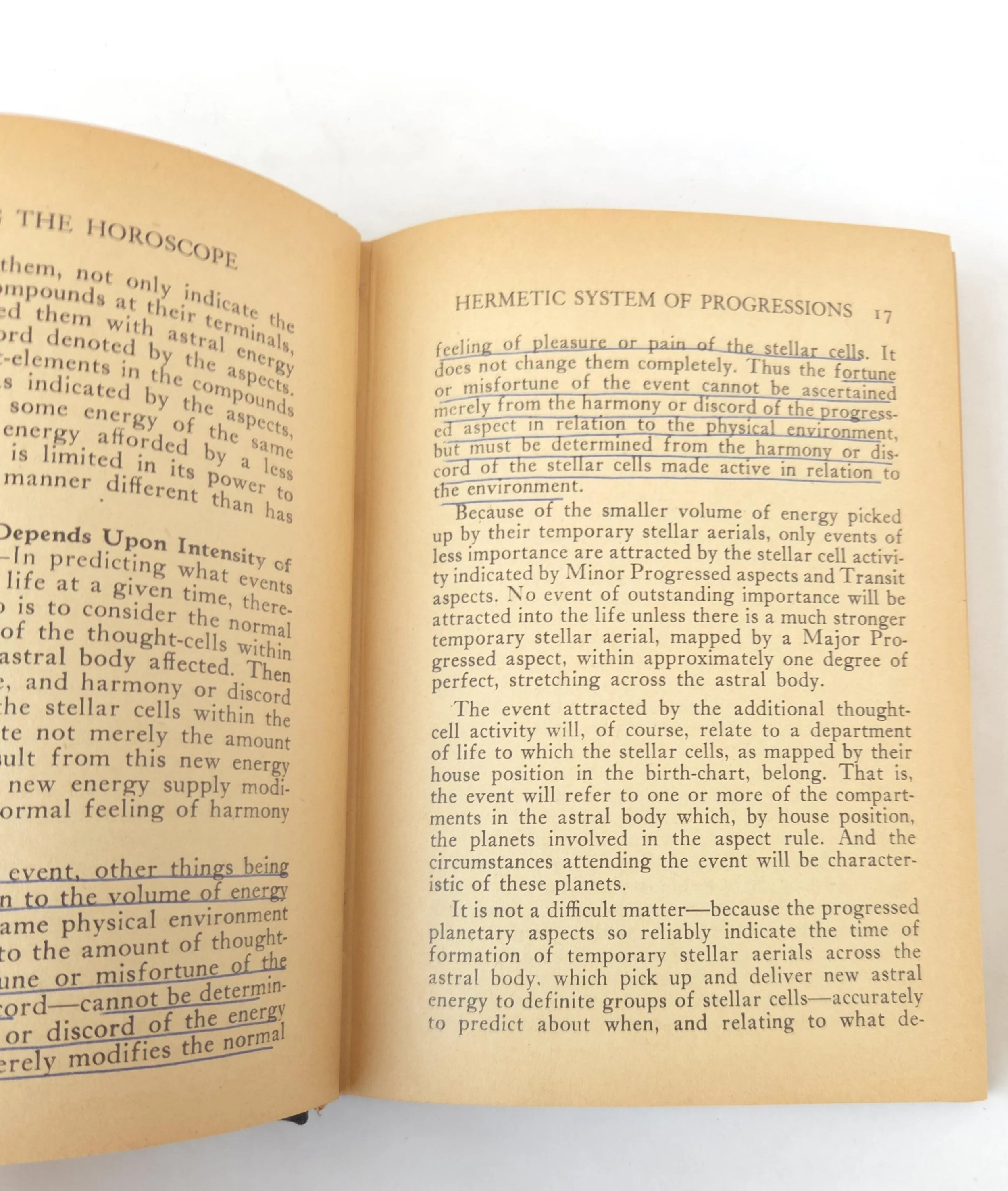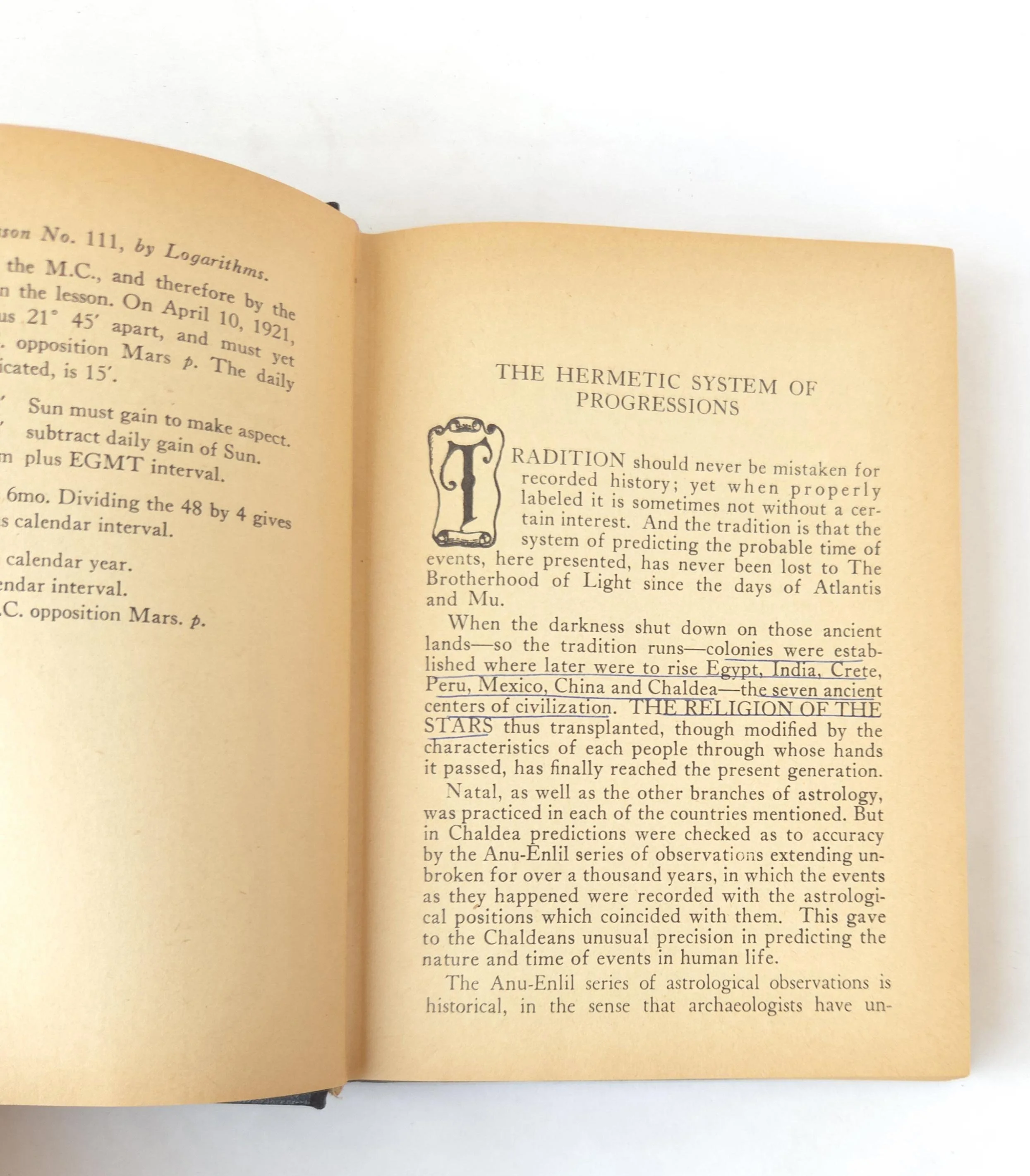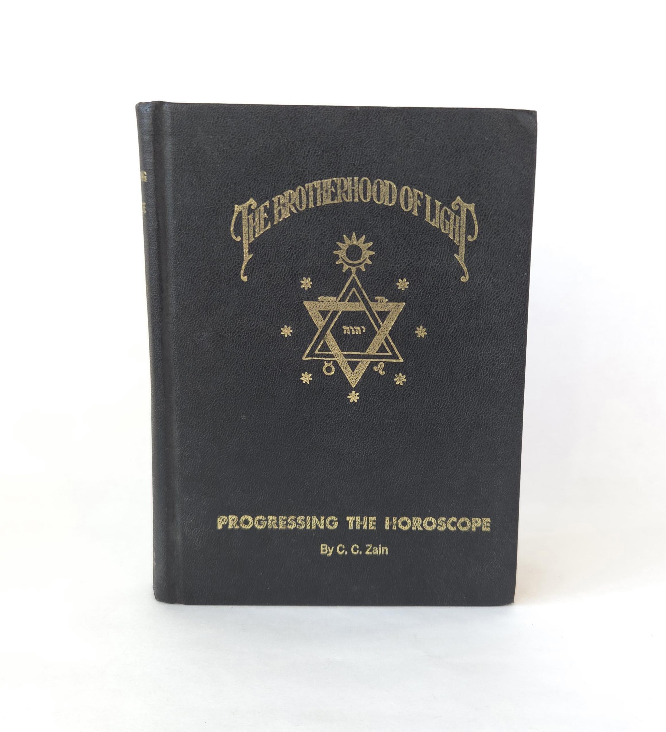 This vintage 1961 hardcover edition of Progressing the Horoscope by C.C. Zain is a key text from the Brotherhood of Light (also known as The Church of Light), a 20-volume esoteric home-study course by Elbert Benjamine (C.C. Zain) that teaches Hermetic sciences, focusing on advanced astrology, alchemy, and magic to guide spiritual evolution. This specific book (Course X-II) teaches techniques for interpreting future trends in a natal chart, including major and minor progressions and transits, revealing inner soul growth and external life events for proactive living. This copy is in used vintage condition with slightly bumped corners and some minimal underlining to a few passages inside the book. There are no torn or stained pages and excellent overall color quality.