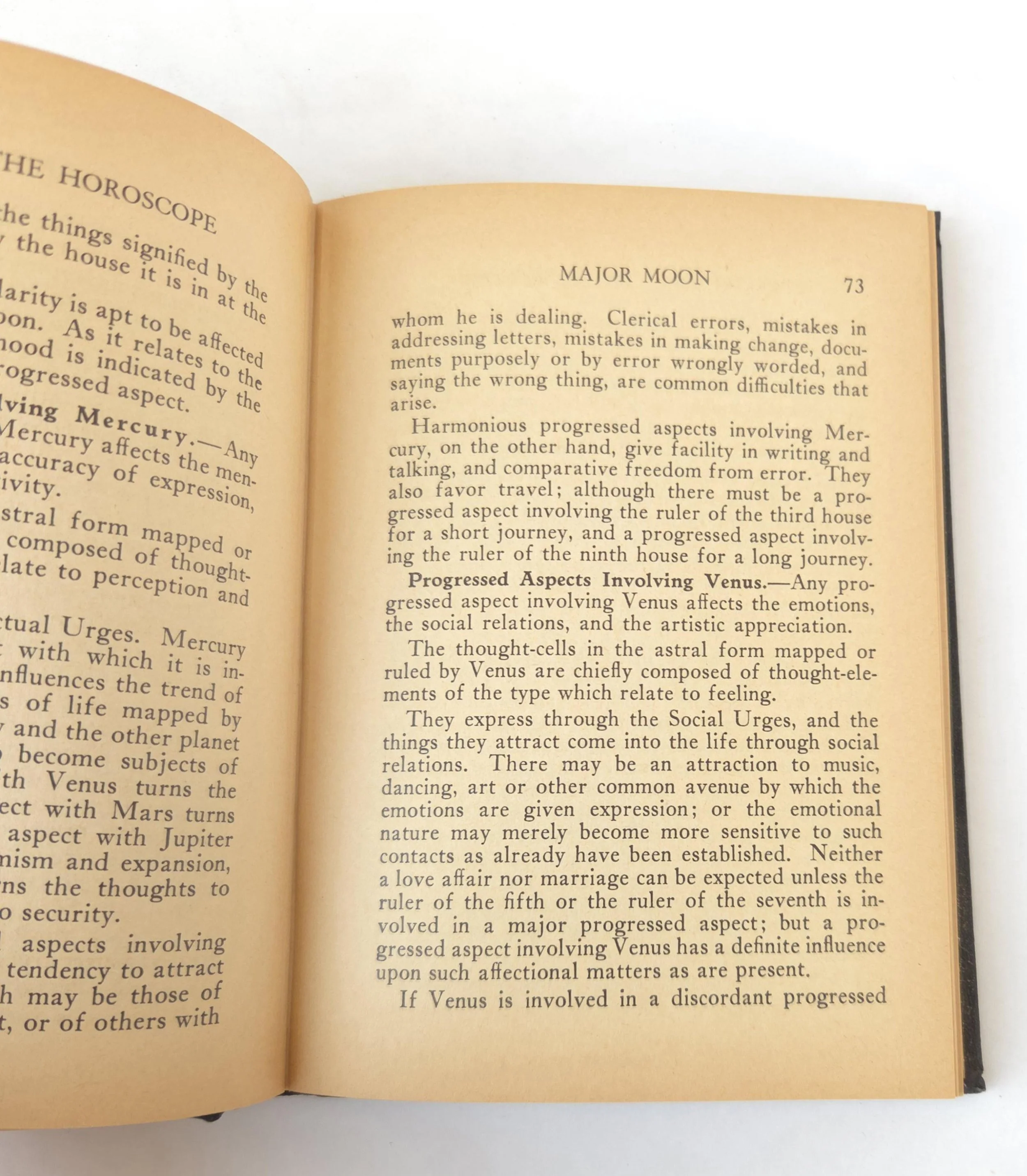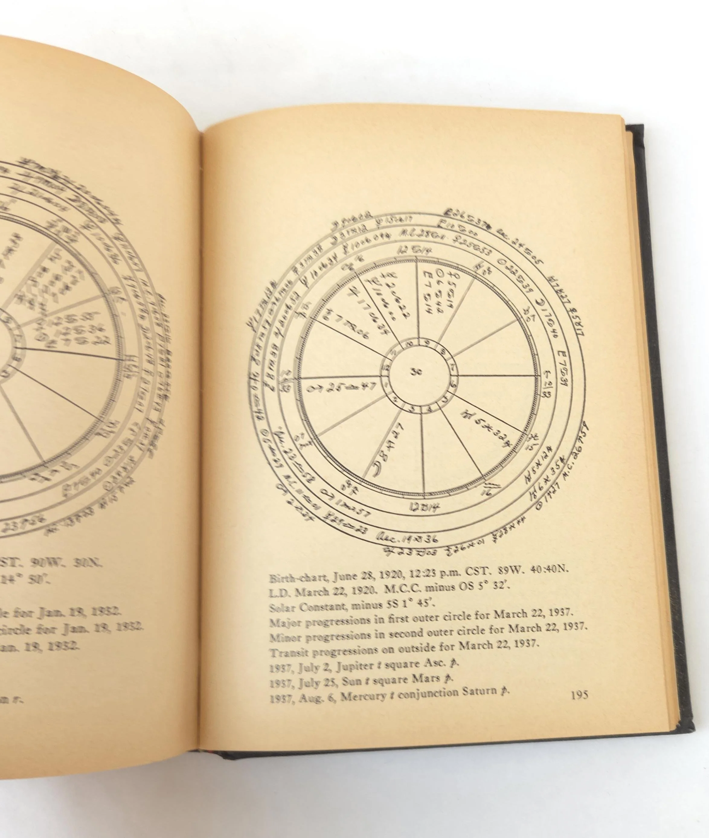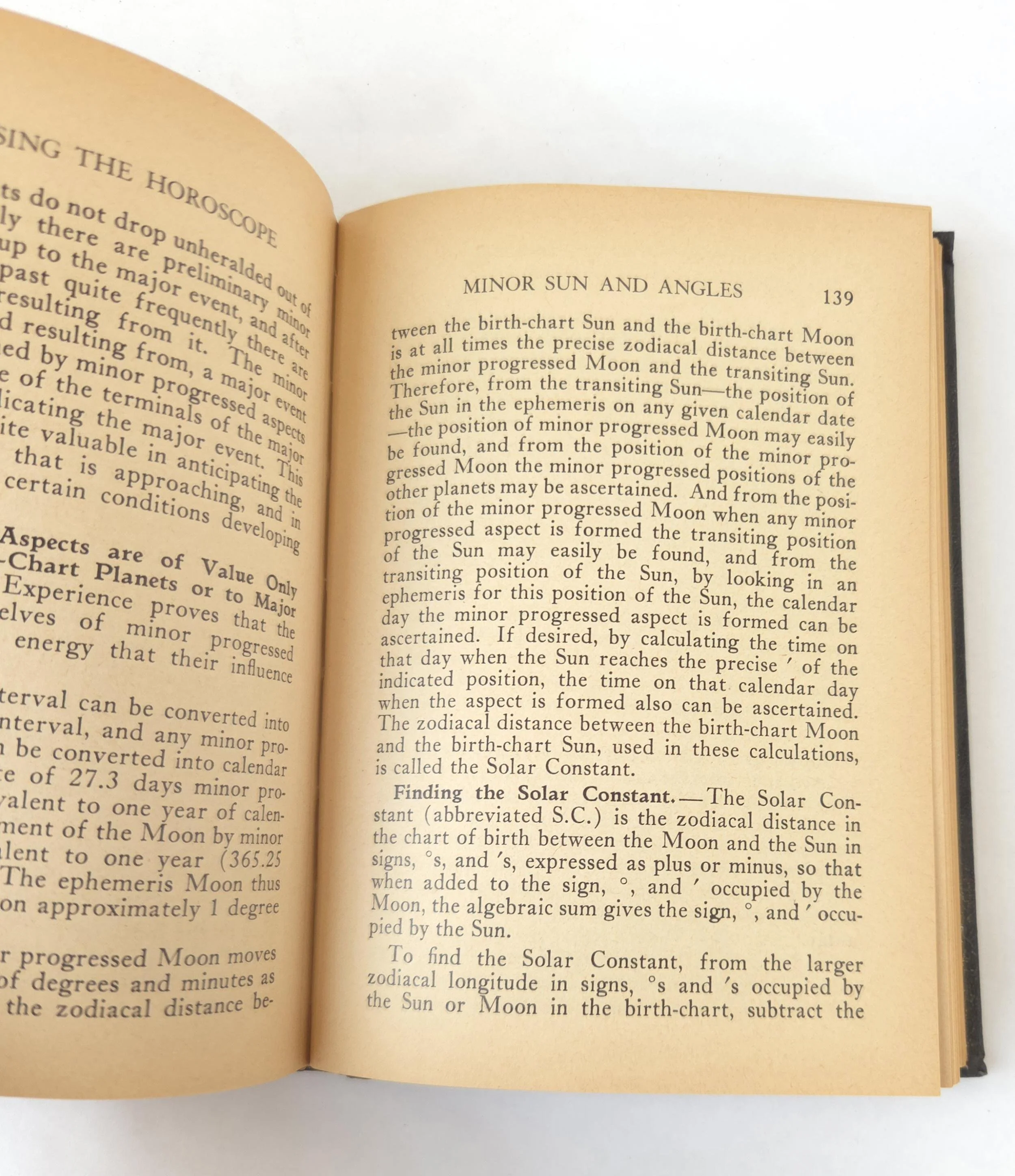 This vintage 1961 hardcover edition of Progressing the Horoscope by C.C. Zain is a key text from the Brotherhood of Light (also known as The Church of Light), a 20-volume esoteric home-study course by Elbert Benjamine (C.C. Zain) that teaches Hermetic sciences, focusing on advanced astrology, alchemy, and magic to guide spiritual evolution. This specific book (Course X-II) teaches techniques for interpreting future trends in a natal chart, including major and minor progressions and transits, revealing inner soul growth and external life events for proactive living. This copy is in used vintage condition with slightly bumped corners and some minimal underlining to a few passages inside the book. There are no torn or stained pages and excellent overall color quality.