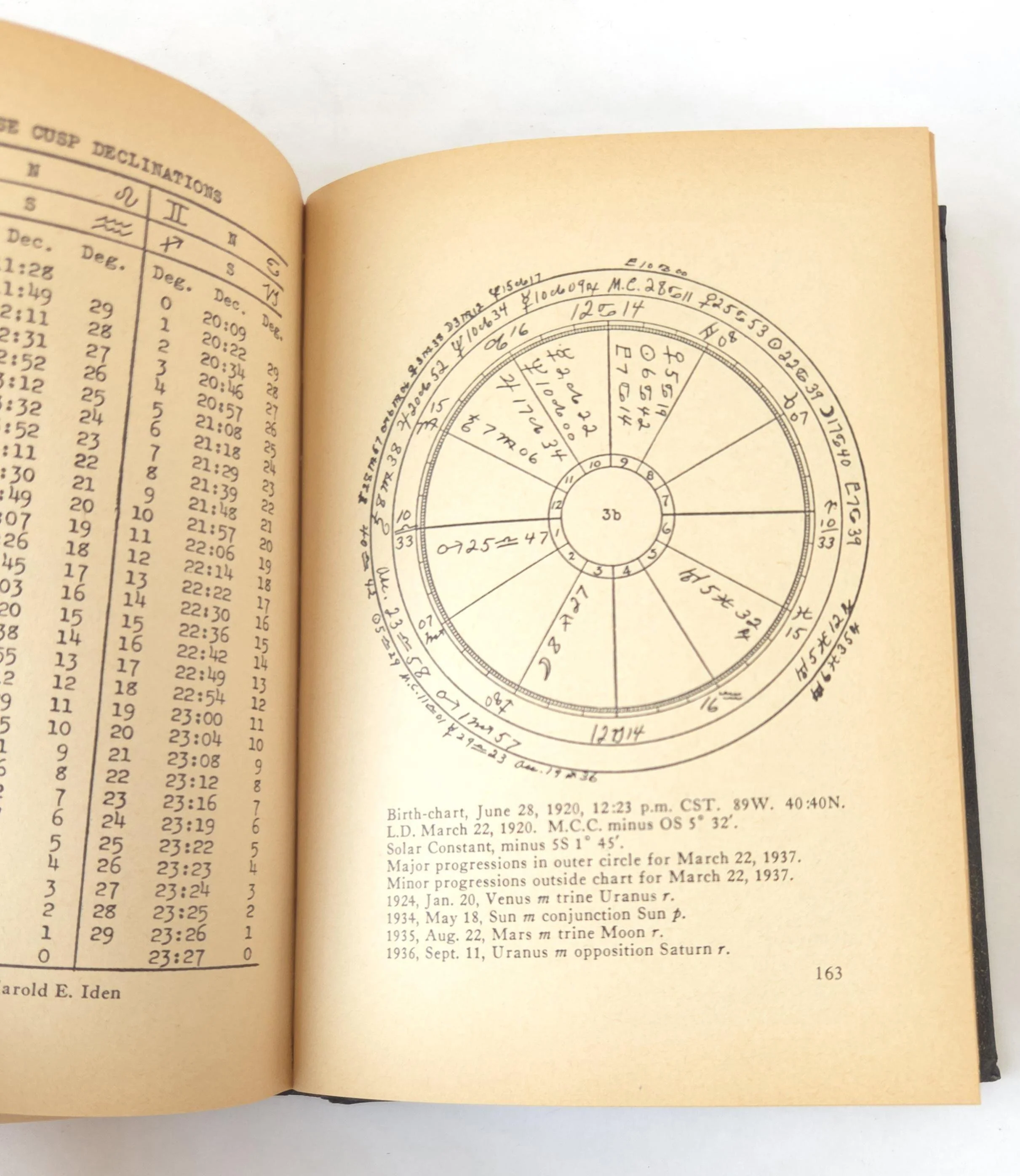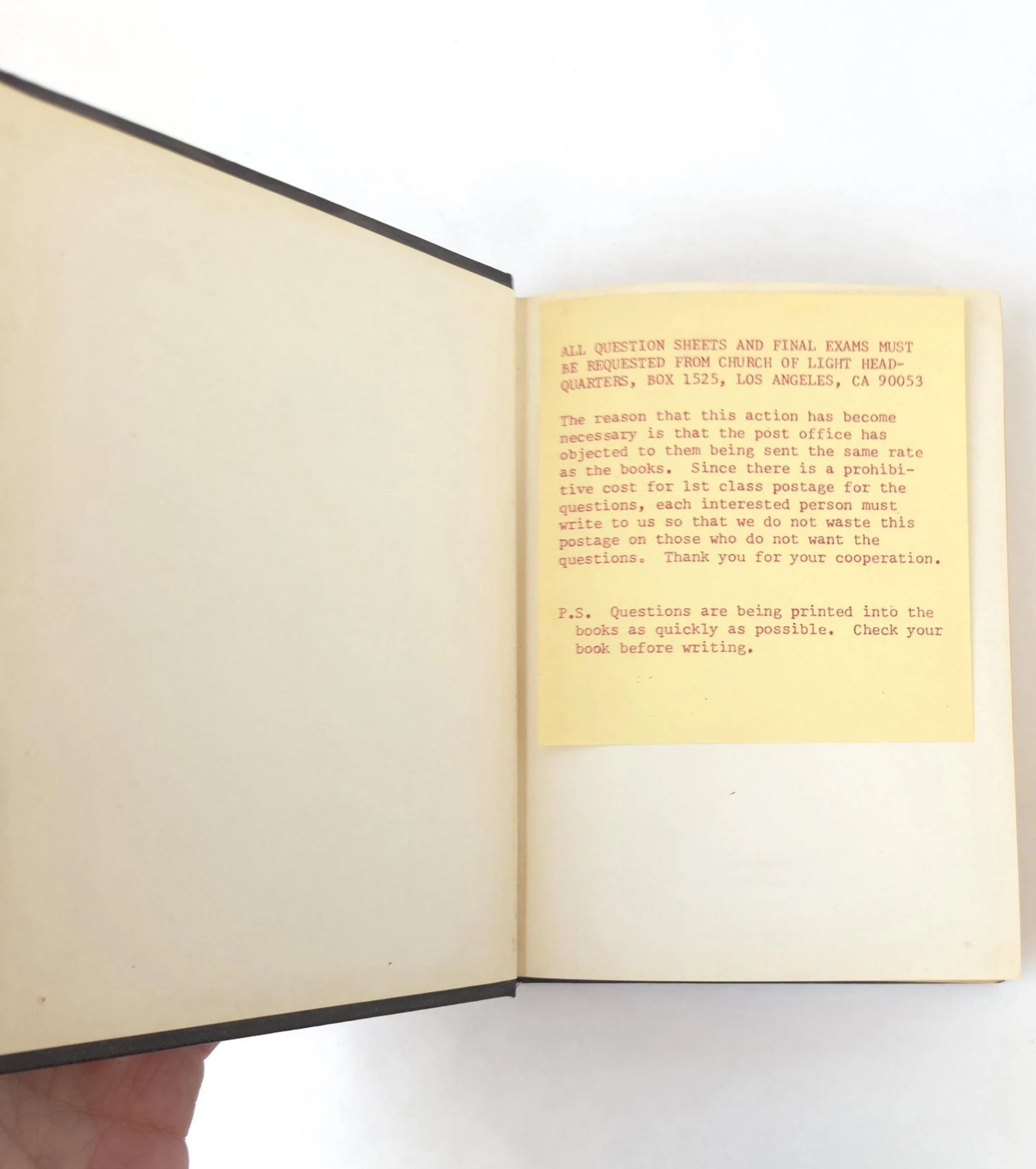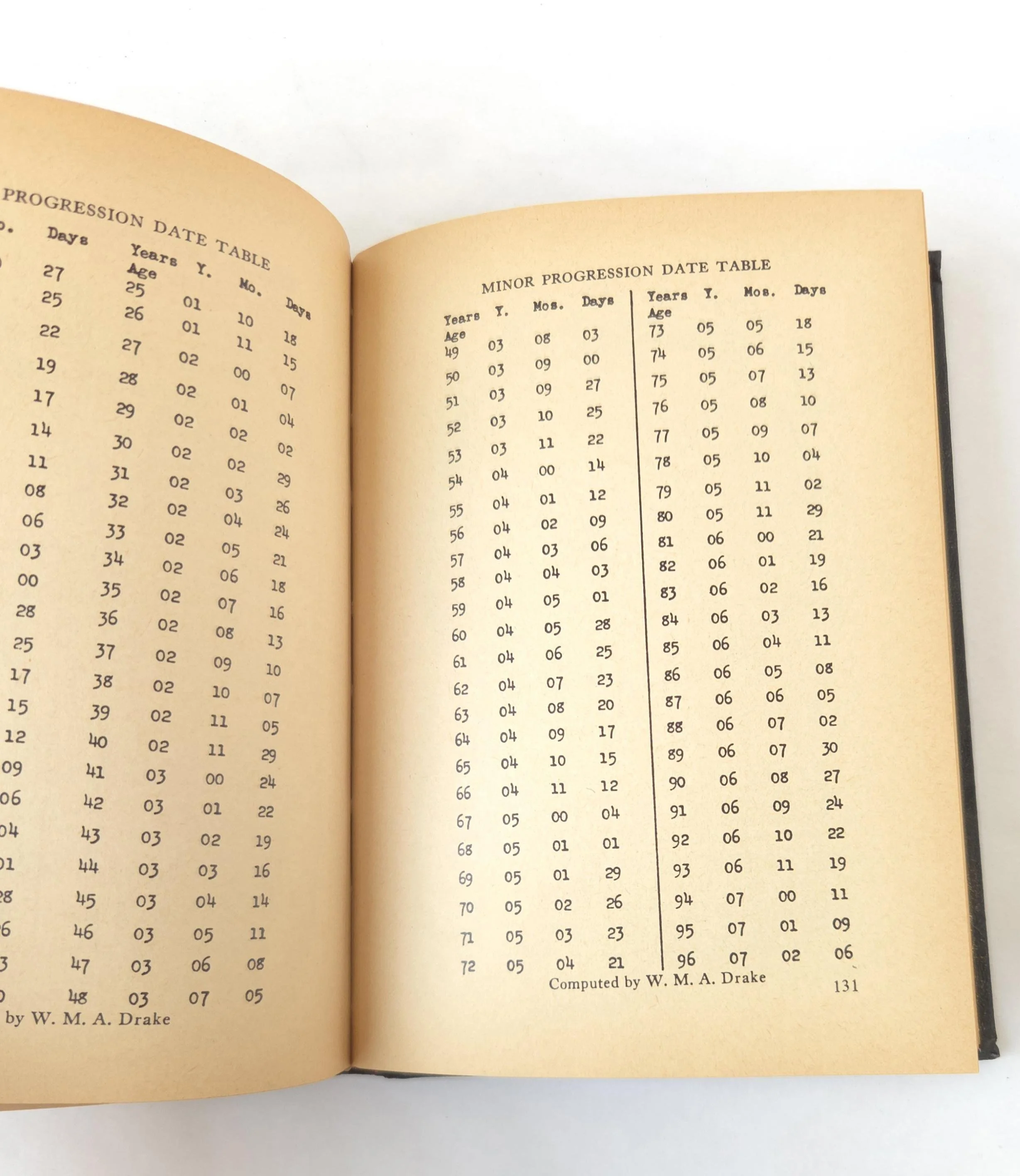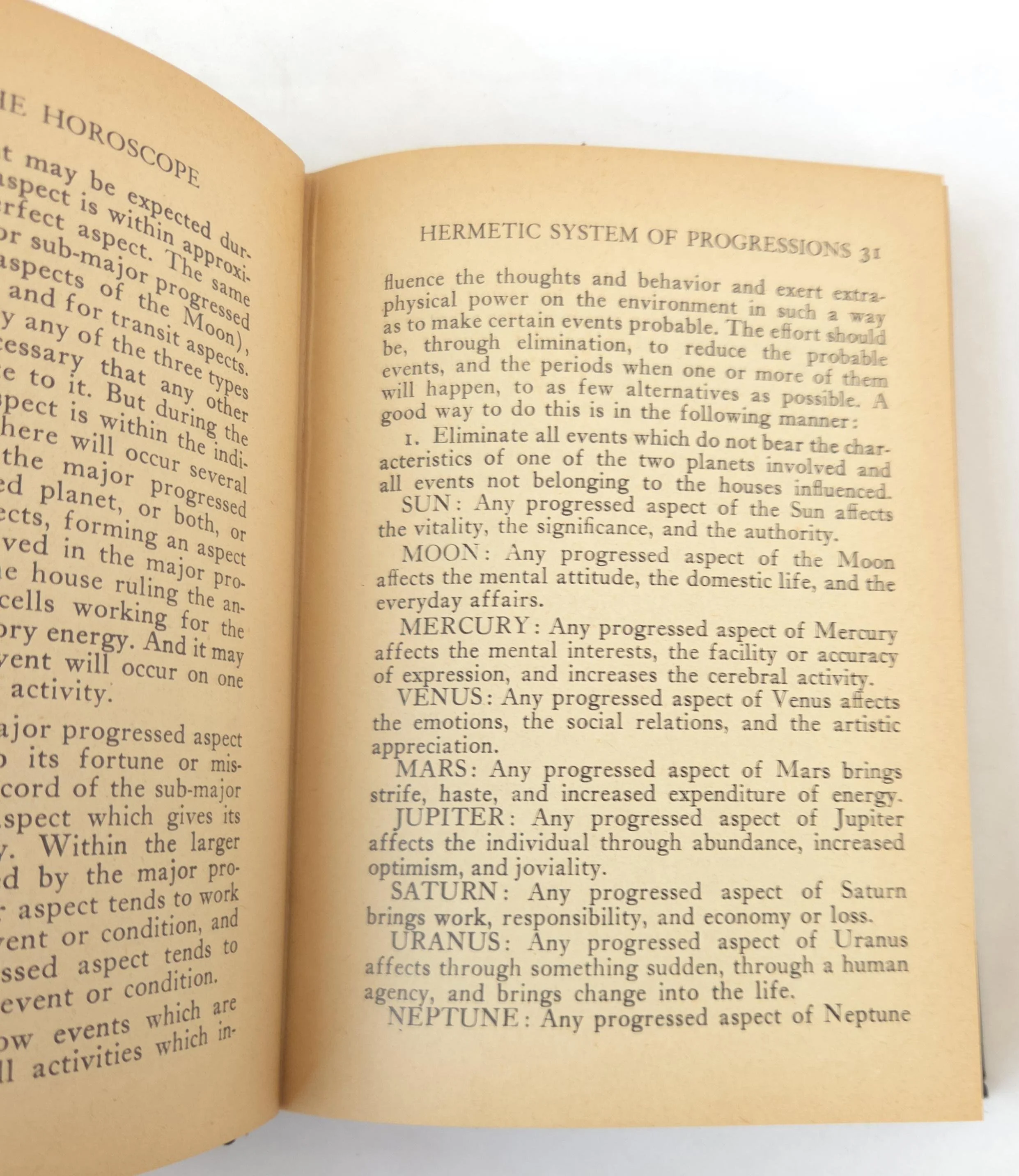 This vintage 1961 hardcover edition of Progressing the Horoscope by C.C. Zain is a key text from the Brotherhood of Light (also known as The Church of Light), a 20-volume esoteric home-study course by Elbert Benjamine (C.C. Zain) that teaches Hermetic sciences, focusing on advanced astrology, alchemy, and magic to guide spiritual evolution. This specific book (Course X-II) teaches techniques for interpreting future trends in a natal chart, including major and minor progressions and transits, revealing inner soul growth and external life events for proactive living. This copy is in used vintage condition with slightly bumped corners and some minimal underlining to a few passages inside the book. There are no torn or stained pages and excellent overall color quality.