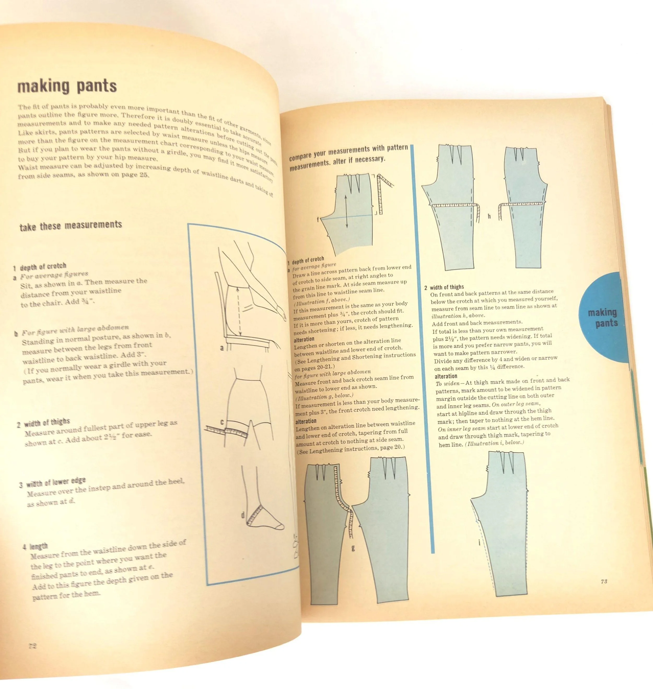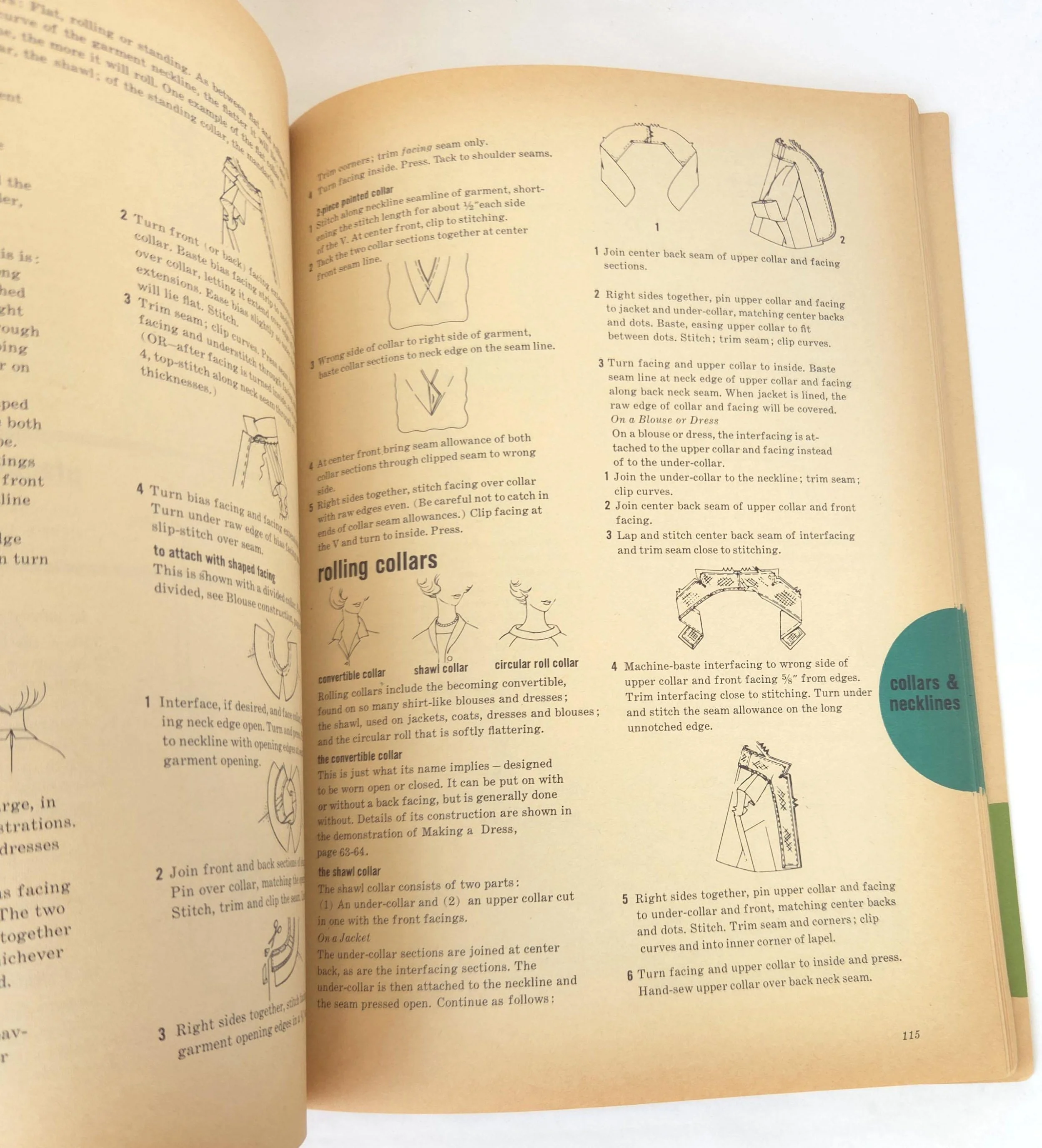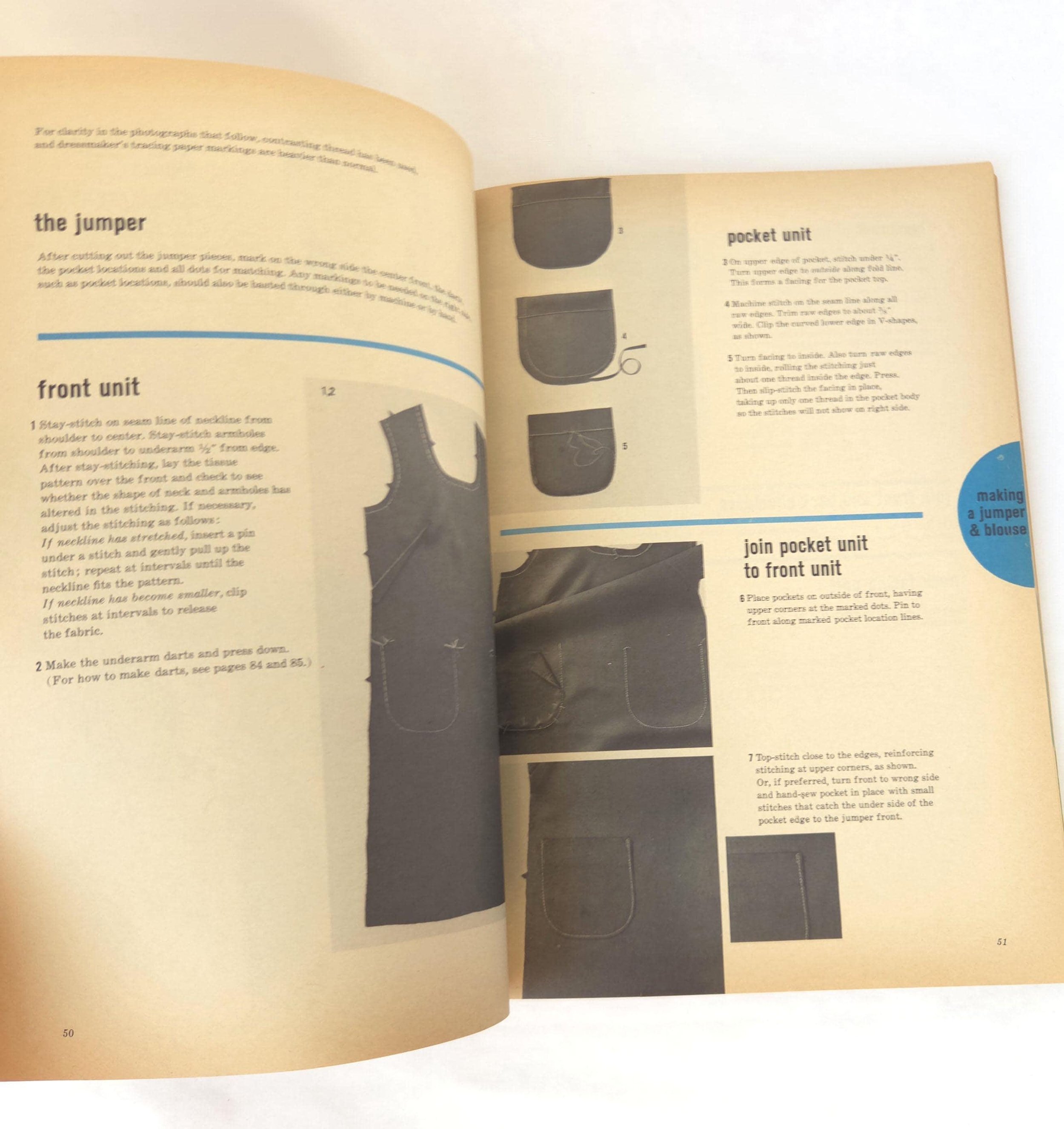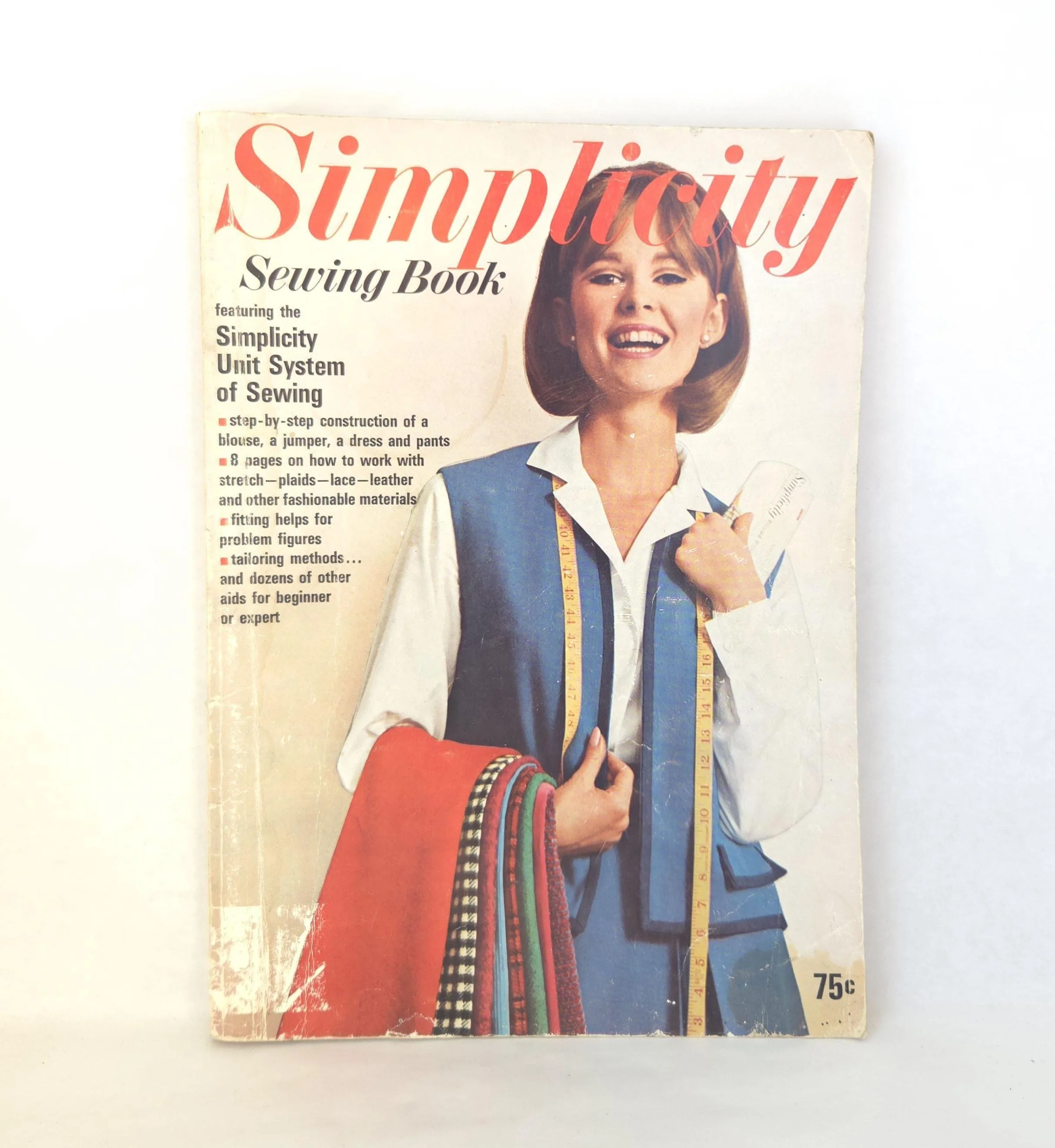 This charming vintage 1965 paperback edition of the Simplicity Sewing Book features the "Simplicity Unit System of Sewing" along with step-by-step construction for several garments, tips on how to work with different fabrics, tailoring methods and much more. This copy is in very much used condition with some small tears and stains to the cover as well as tanning to the pages from age. There are a few small pencil / pen marks to some pages and the last few pages have become detached from the binding, but are still present.
