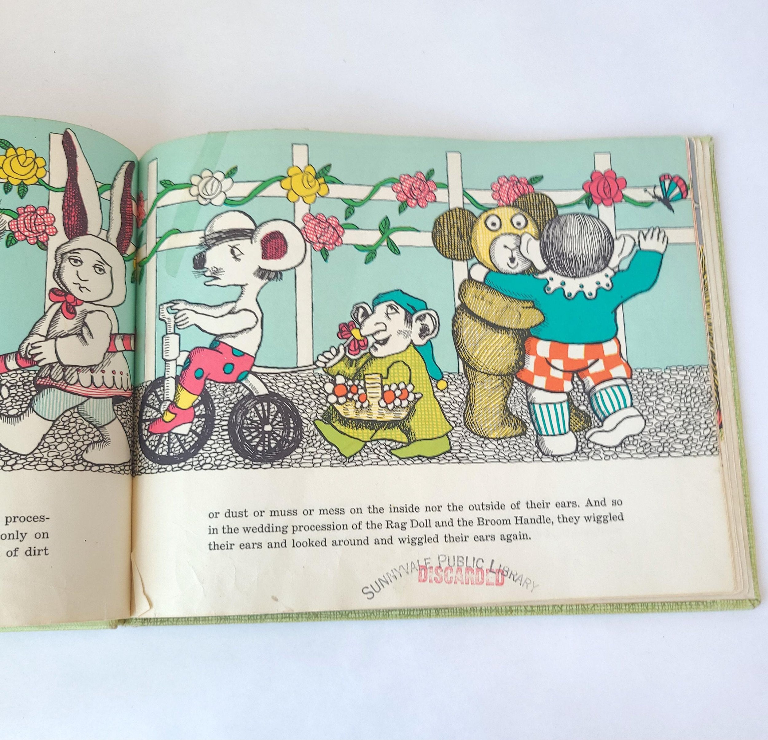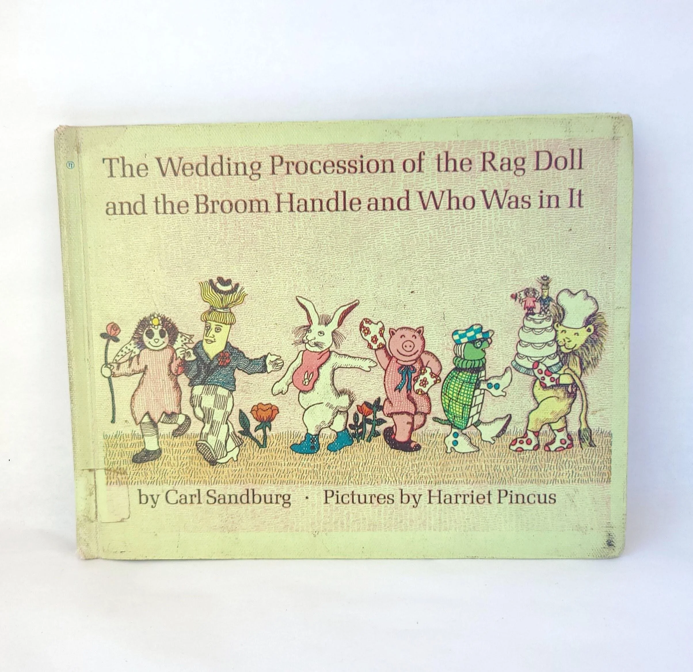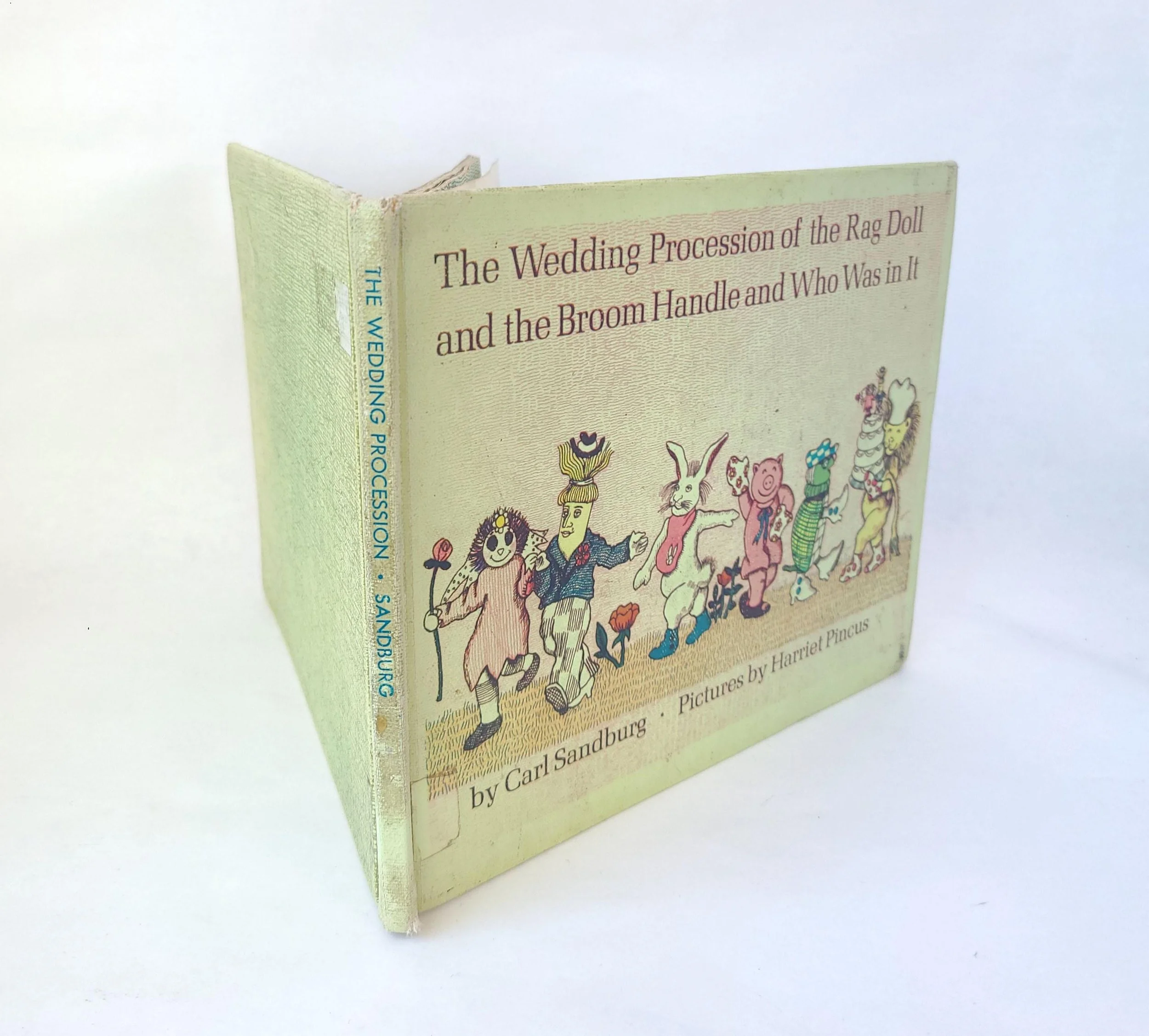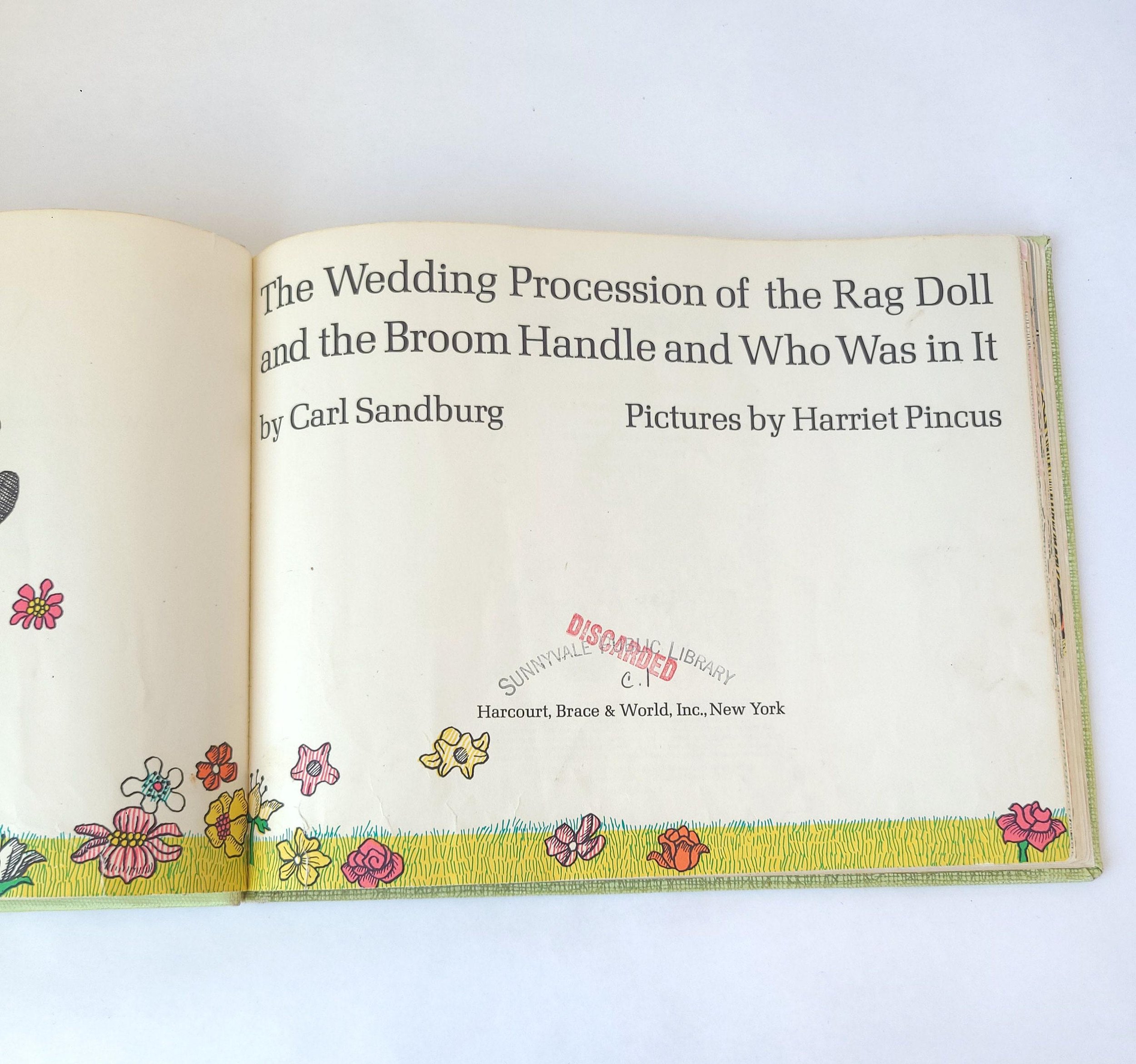 This rare vintage hardcover 1967 first edition of The Wedding Procession of The Rag Doll and The Broom Handle and Who Was in It was written by Carl Sandburg and illustrated by Harriet Pincus. The story is truly unusual and the whimsical pictures just make it that much more special. The book belonged to a public library - so the book is in very much used condition. There is some tape residue to the spine, along with a discard stamp on the front and back end pages, and a stamp from the library on the title page and one internal page. The cover has wear to the edges, along with some discoloration. There are small tears to the inner corners of most pages, with several measuring more than an inch in length. There are a few spots of discoloration, but no marked pages and good overall color quality.