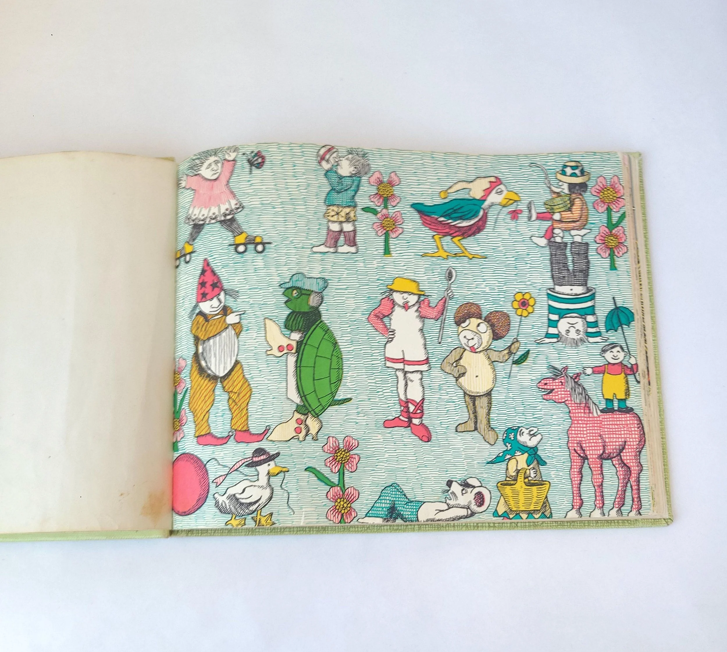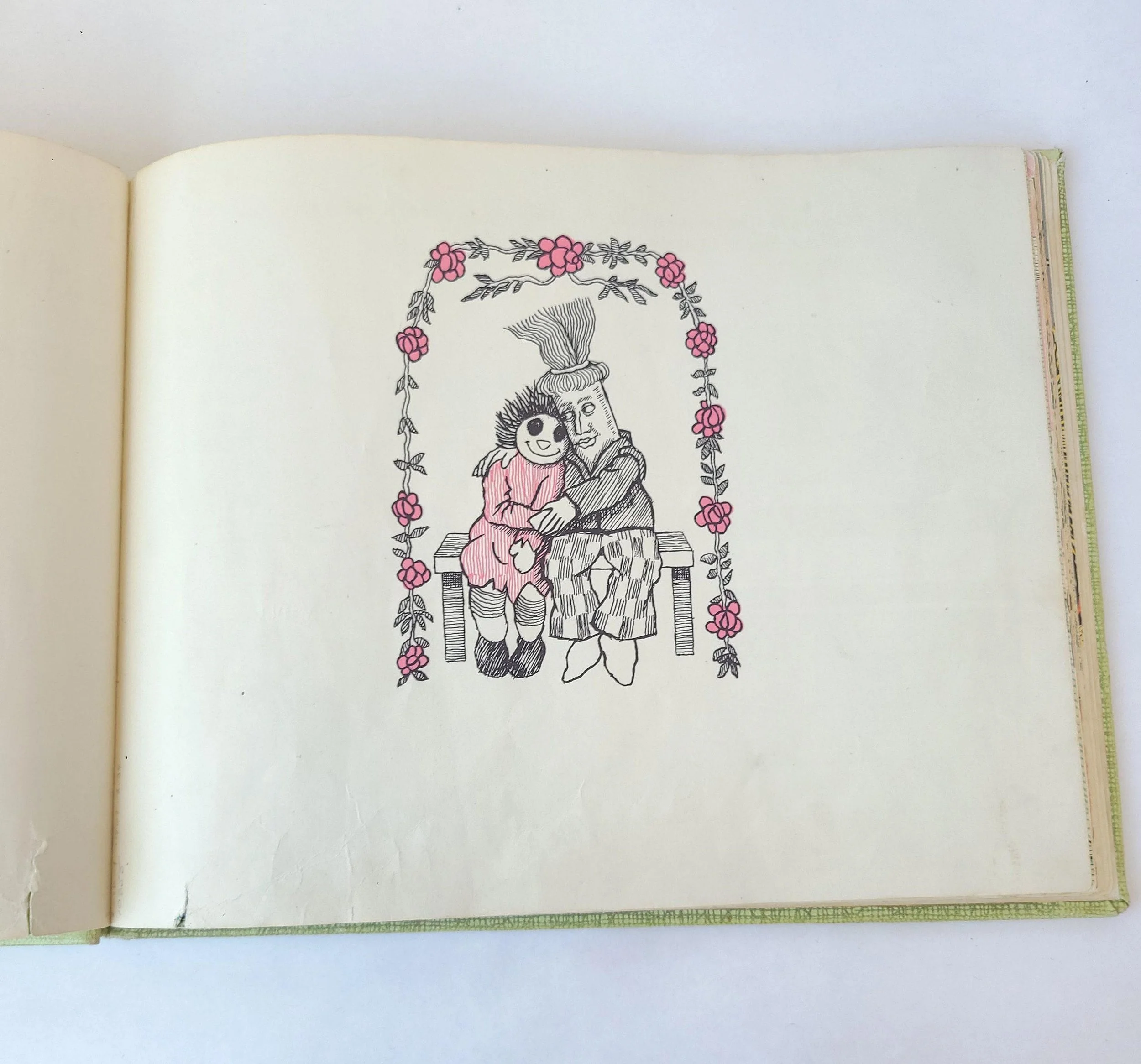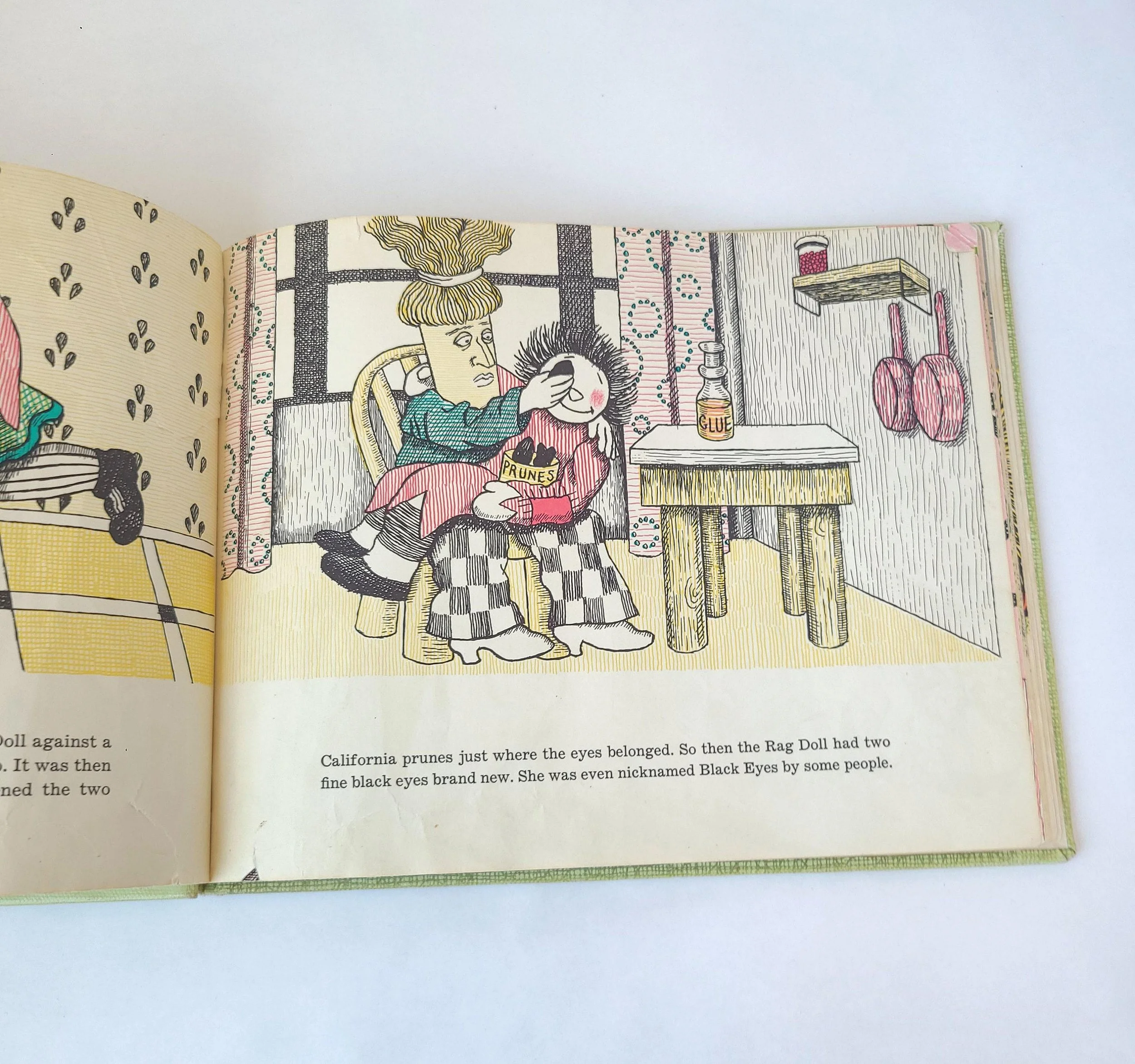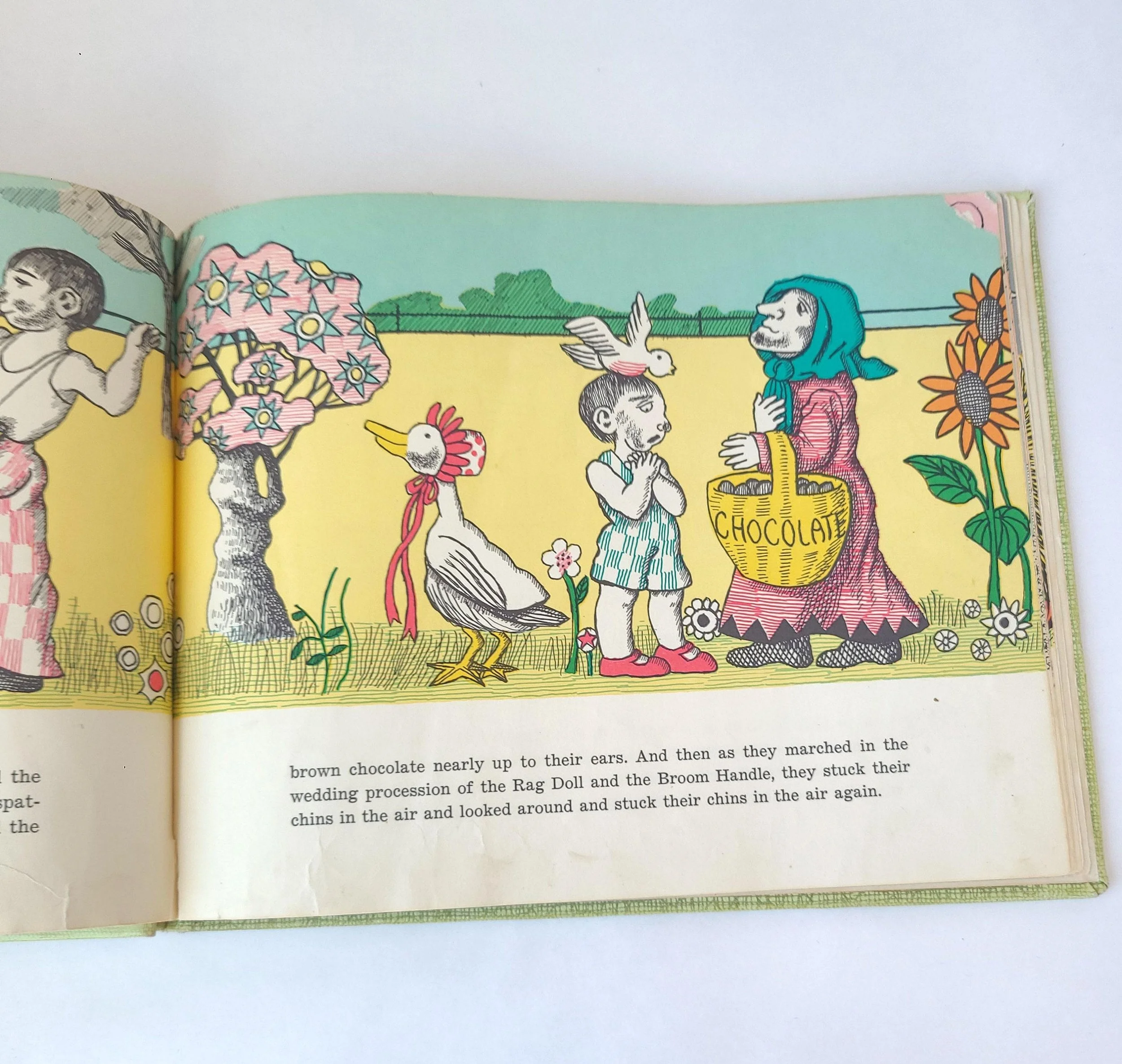 This rare vintage hardcover 1967 first edition of The Wedding Procession of The Rag Doll and The Broom Handle and Who Was in It was written by Carl Sandburg and illustrated by Harriet Pincus. The story is truly unusual and the whimsical pictures just make it that much more special. The book belonged to a public library - so the book is in very much used condition. There is some tape residue to the spine, along with a discard stamp on the front and back end pages, and a stamp from the library on the title page and one internal page. The cover has wear to the edges, along with some discoloration. There are small tears to the inner corners of most pages, with several measuring more than an inch in length. There are a few spots of discoloration, but no marked pages and good overall color quality.