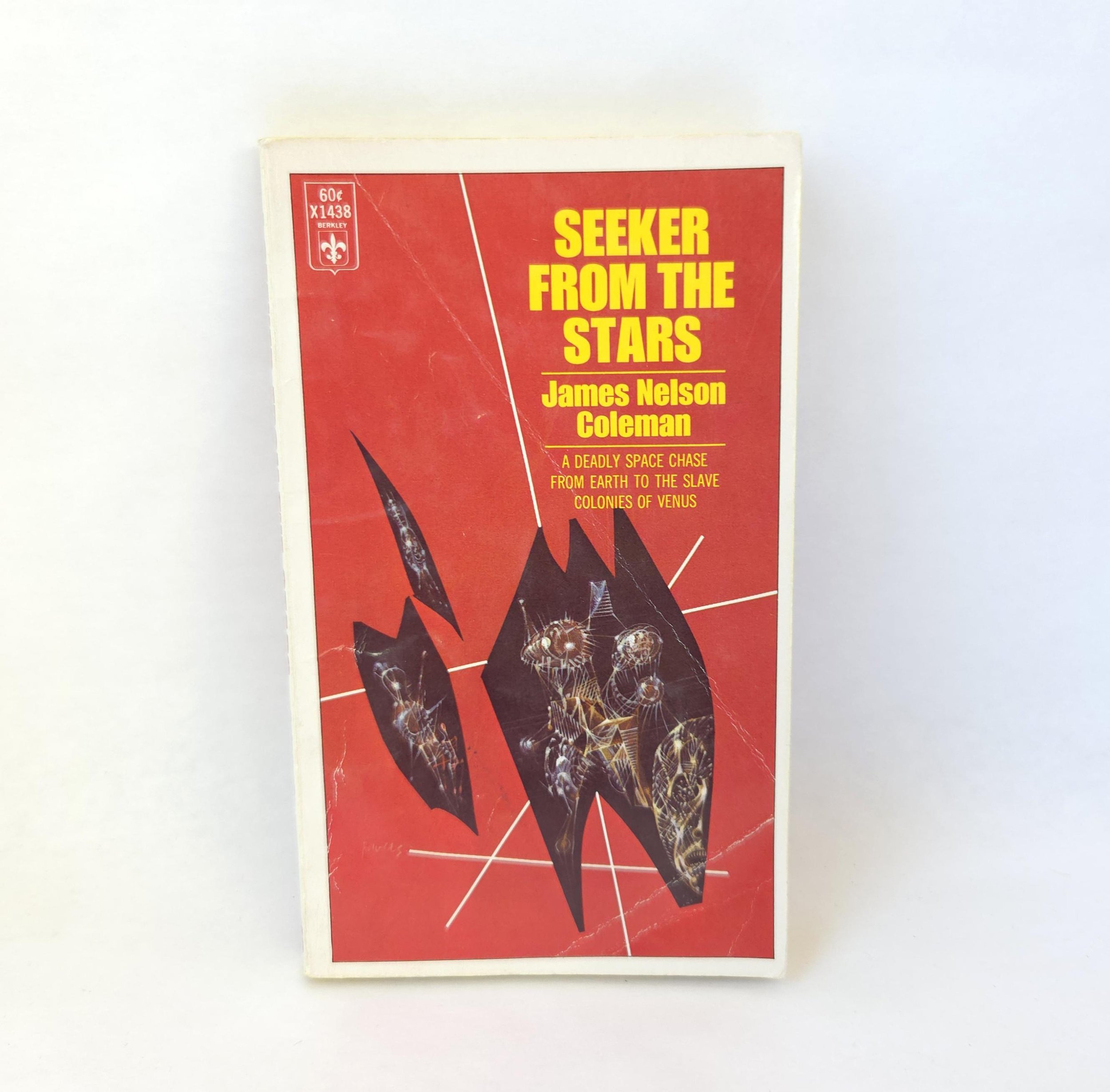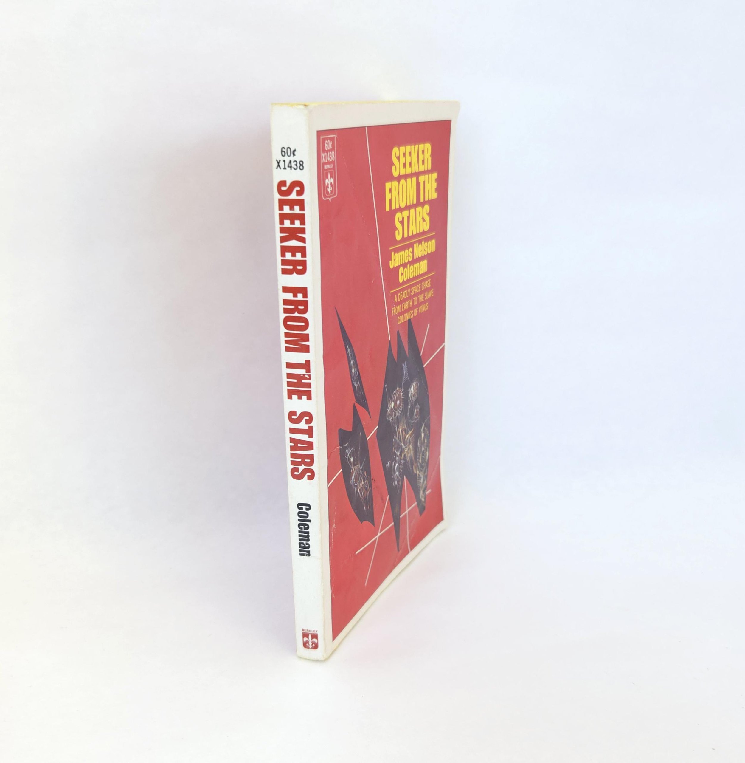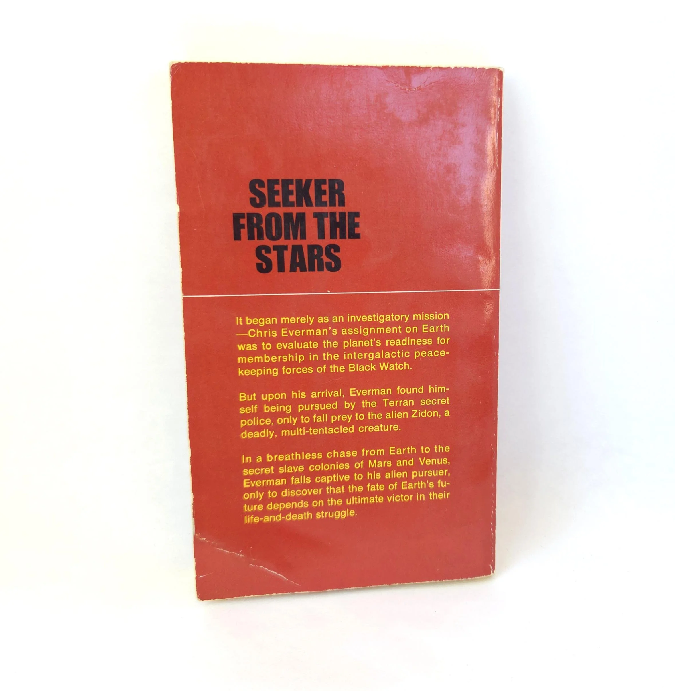 This vintage 1967 paperback edition of Seeker From The Stars was written by James Nelson Coleman. This science fiction novel tells the story of Chris Everman, assigned to Earth to evaluate its potential for intergalactic peacekeeping, and how her finds himself entangled in a larger conflict. His mission evolves from an assessment of Earth's readiness to a more profound involvement in the planet's destiny. The book is in used vintage condition with some creases and wear to the front and back cover, but no torn or marked pages and good overall color quality.