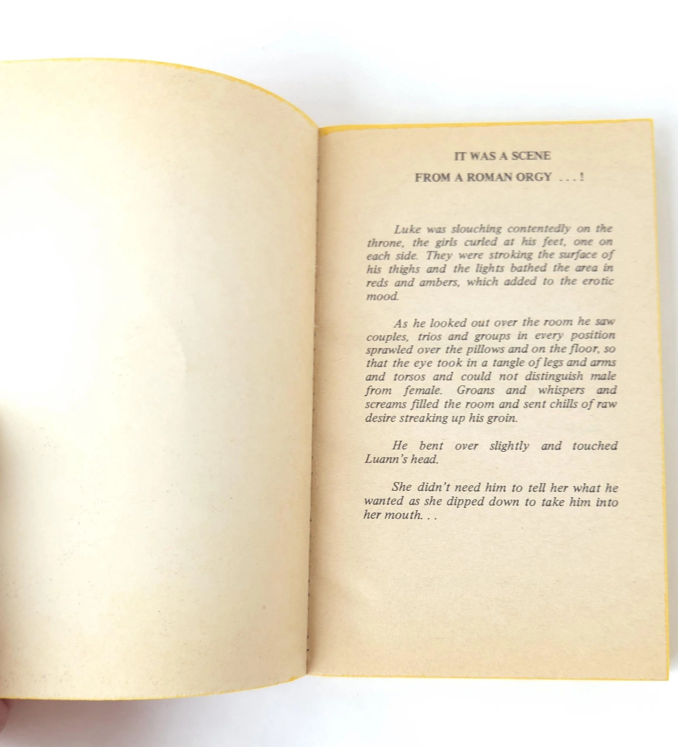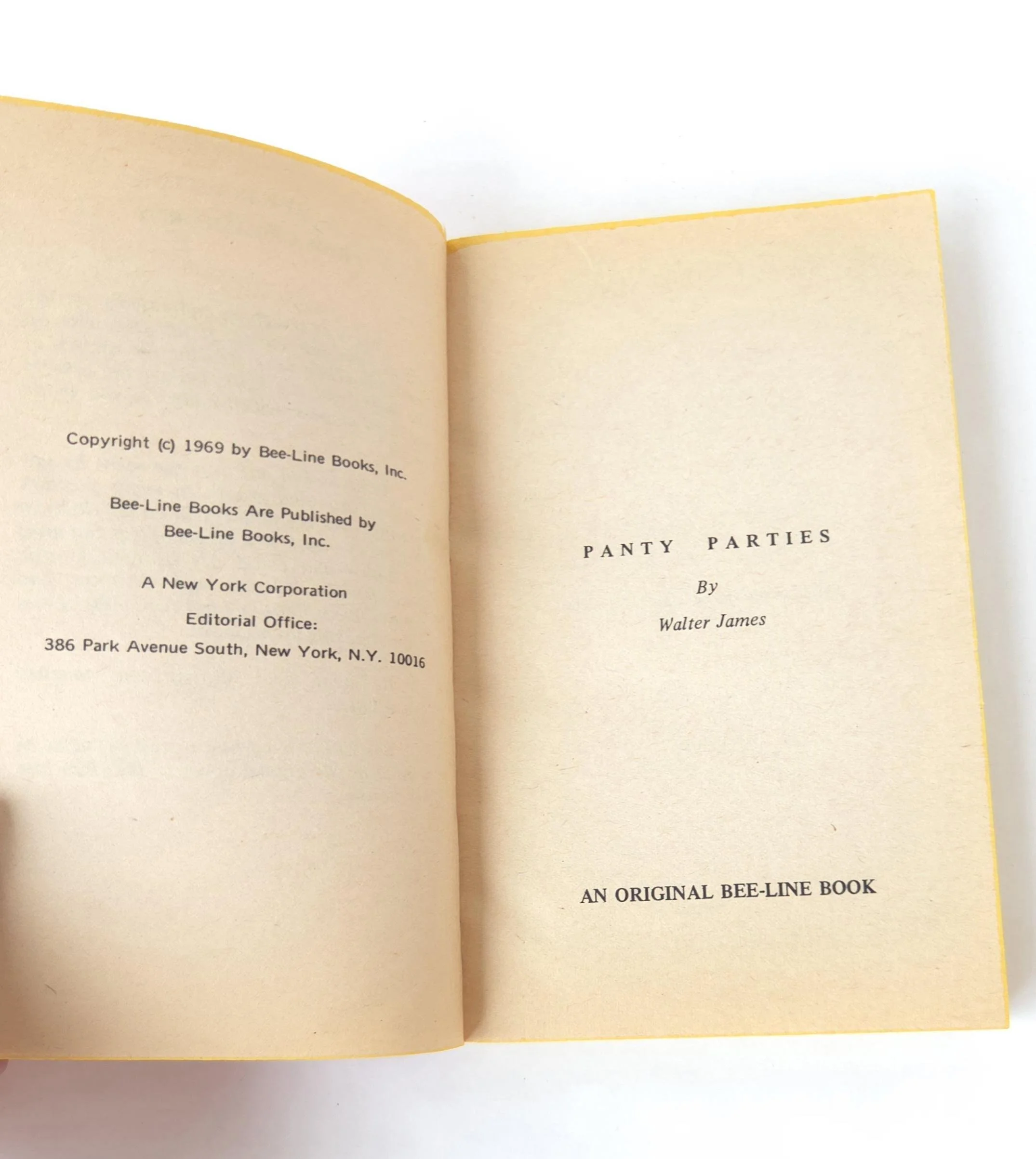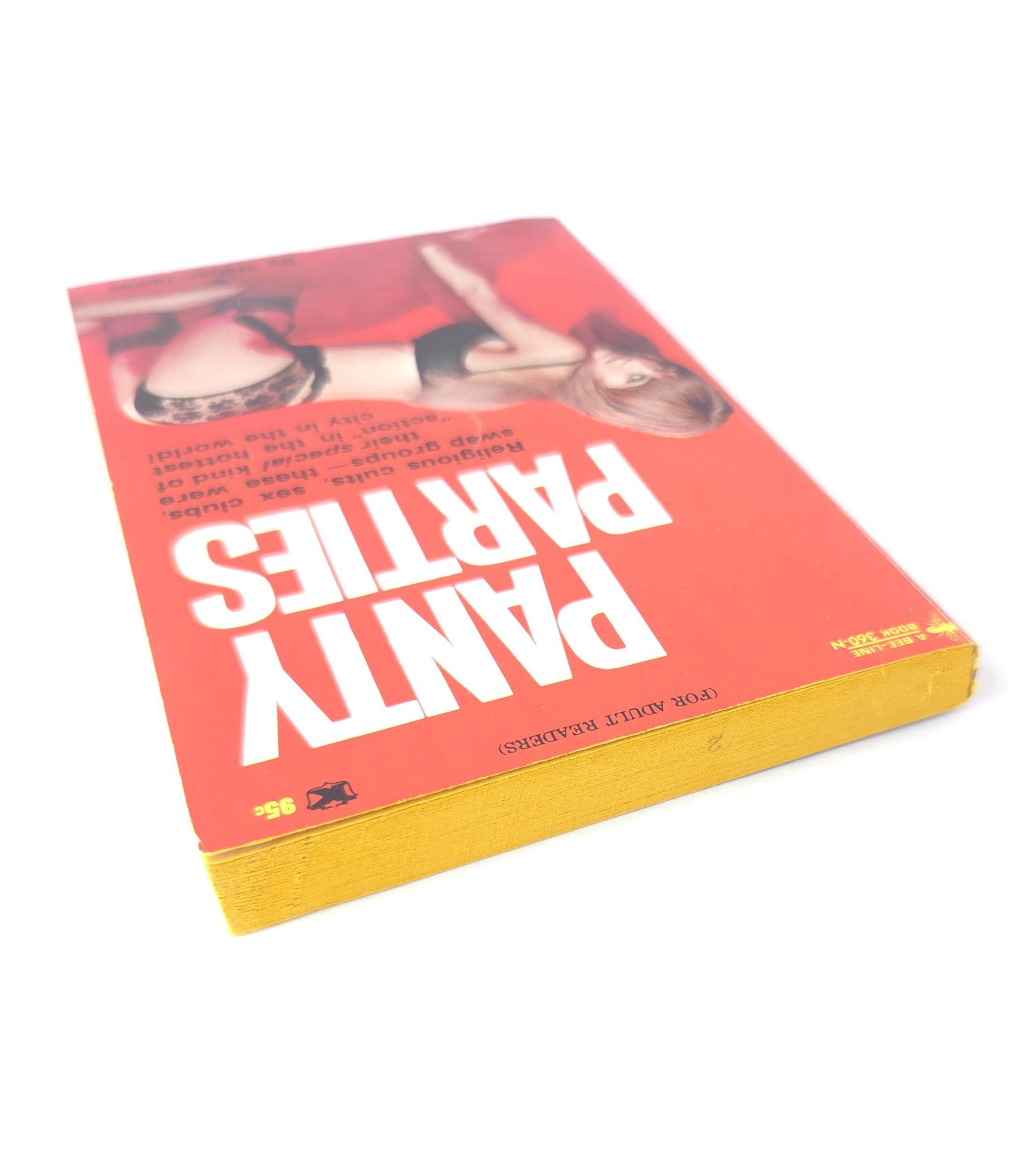 This extremely rare vintage 1969 paperback edition of Panty Parties by Walter James is an adult novel published by Bee-Line books. It talks about "religious cults, sex clubs, swap groups" and the "hottest city in the world". A great gift for the lover of vintage smut in your life! This copy is in good used vintage condition with a small scratch to the front cover along with some minor wear to the edges, but there are no torn or marked pages and excellent overall color quality.