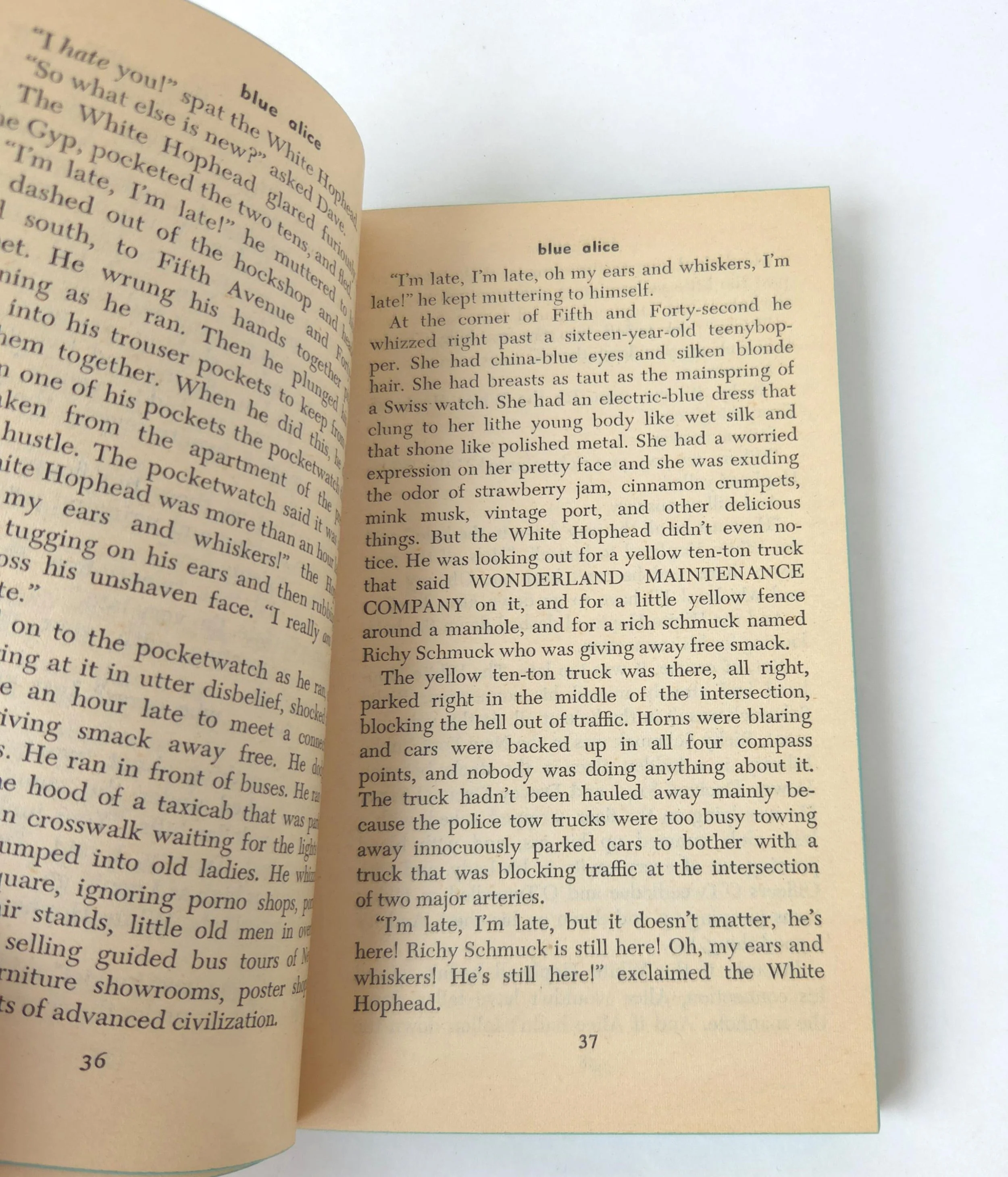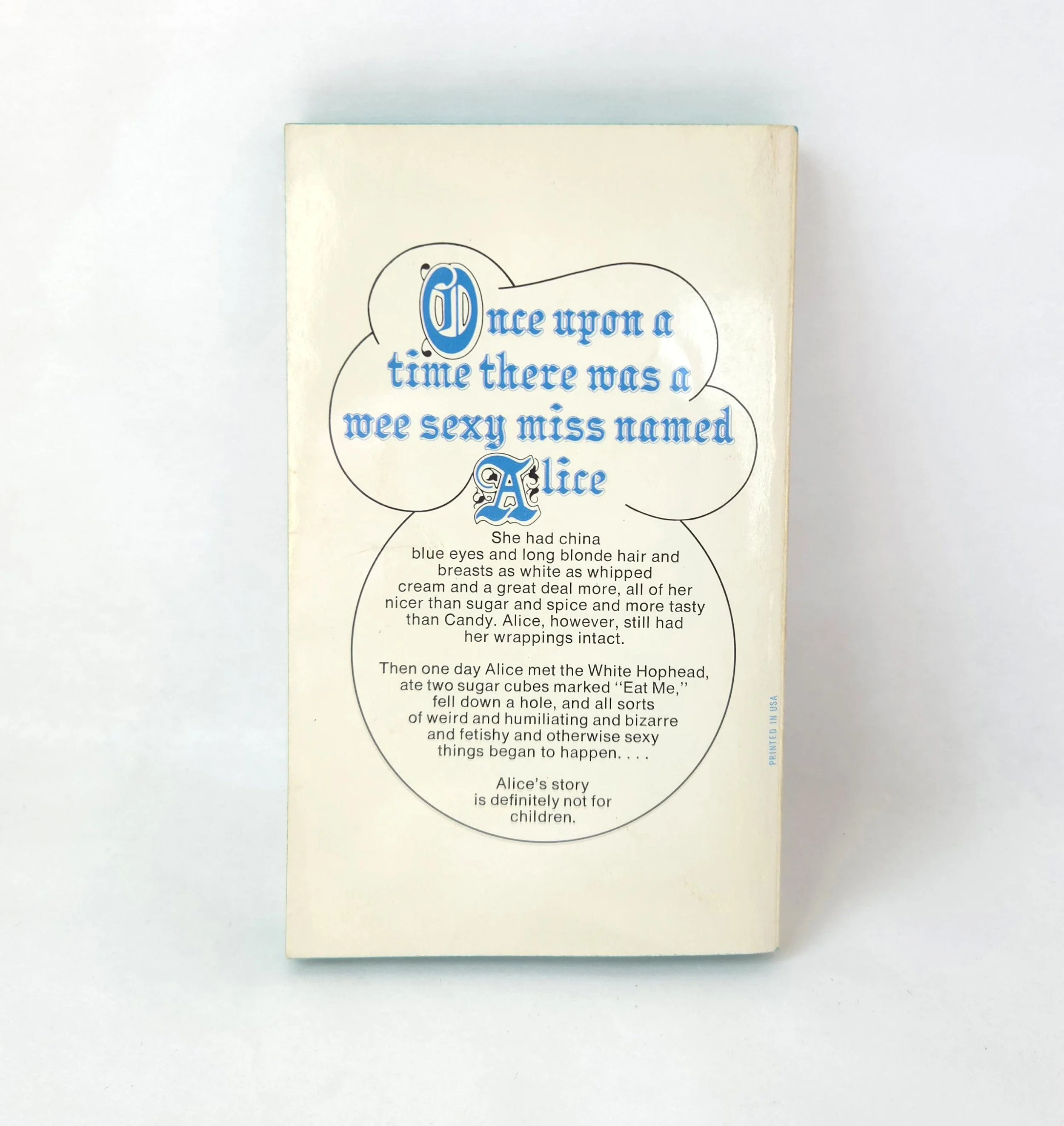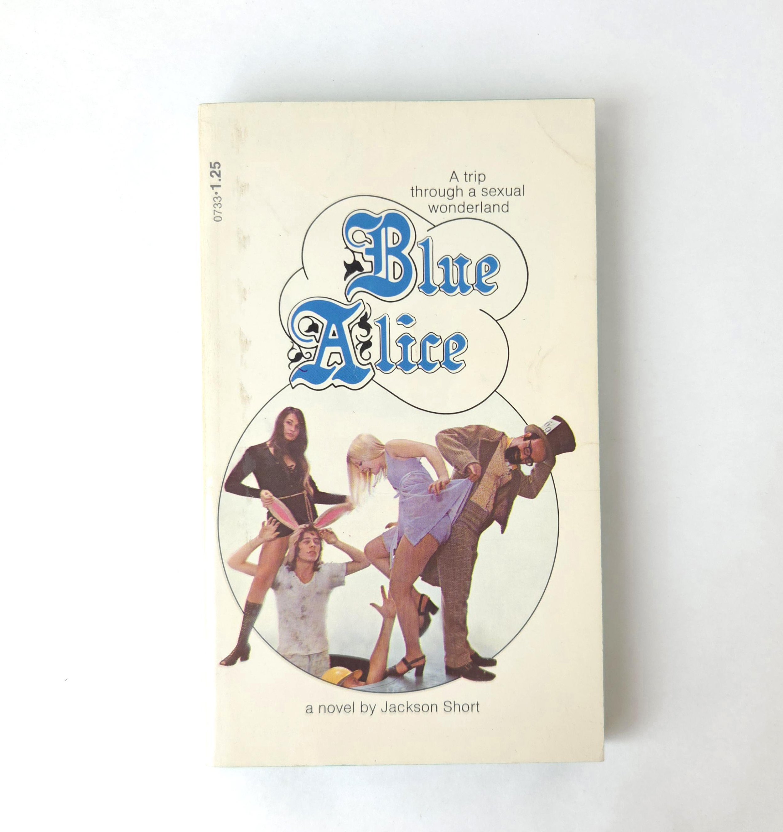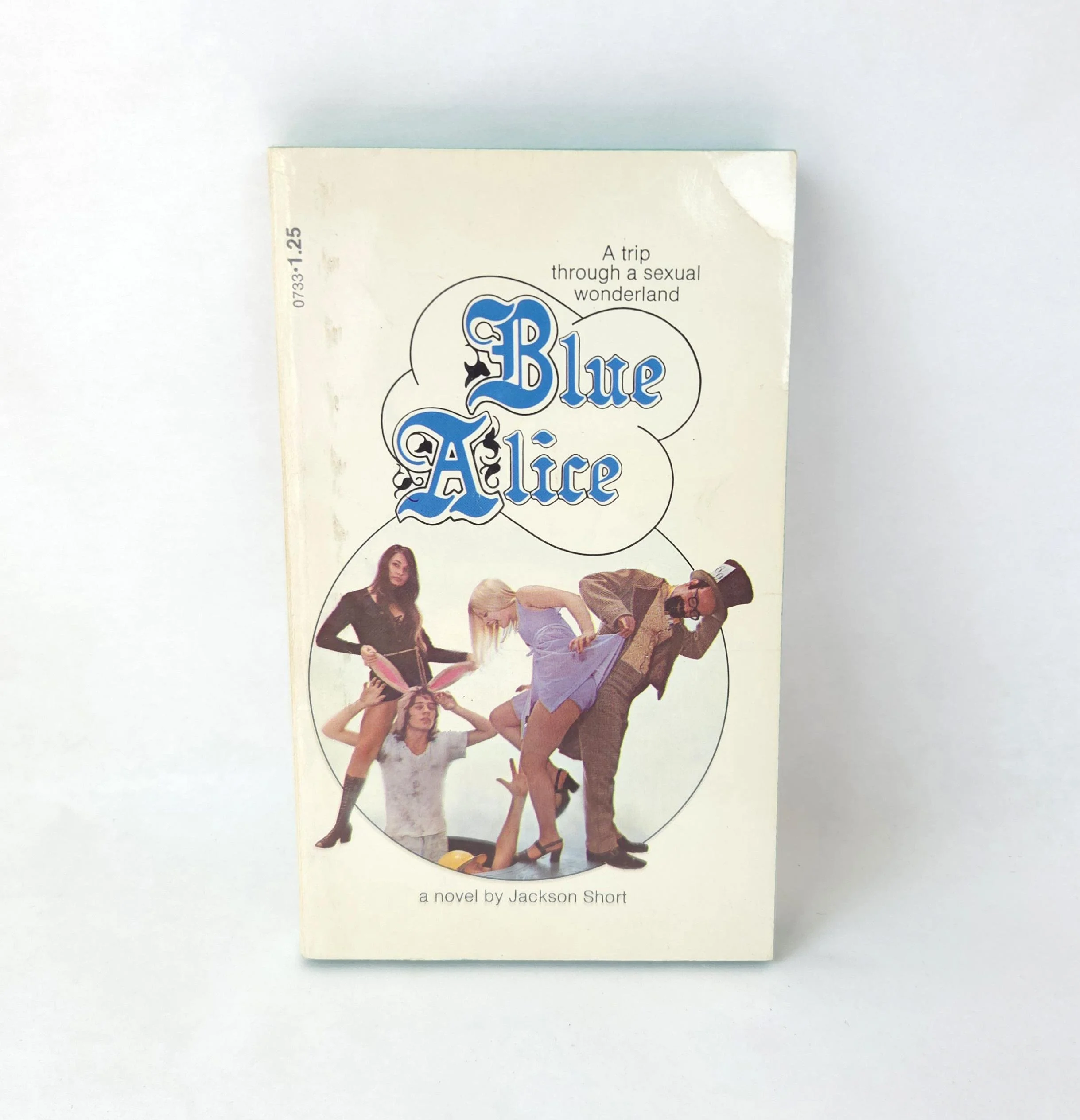 This vintage 1972 paperback edition of Blue Alice by Jackson Short is a "trip through a sexual wonderland" inspired by the classic children's tale Alice in Wonderland - but this version is not for kids! This adult novel tells the tale of a wee sexy miss named Alice and her drugged out and sexy adventures (that is why you may notice some language redacted in the photos). This copy is in used vintage condition with some scuffing to the cover and a slight crease to one corner, but no torn or marked pages and excellent overall color quality.