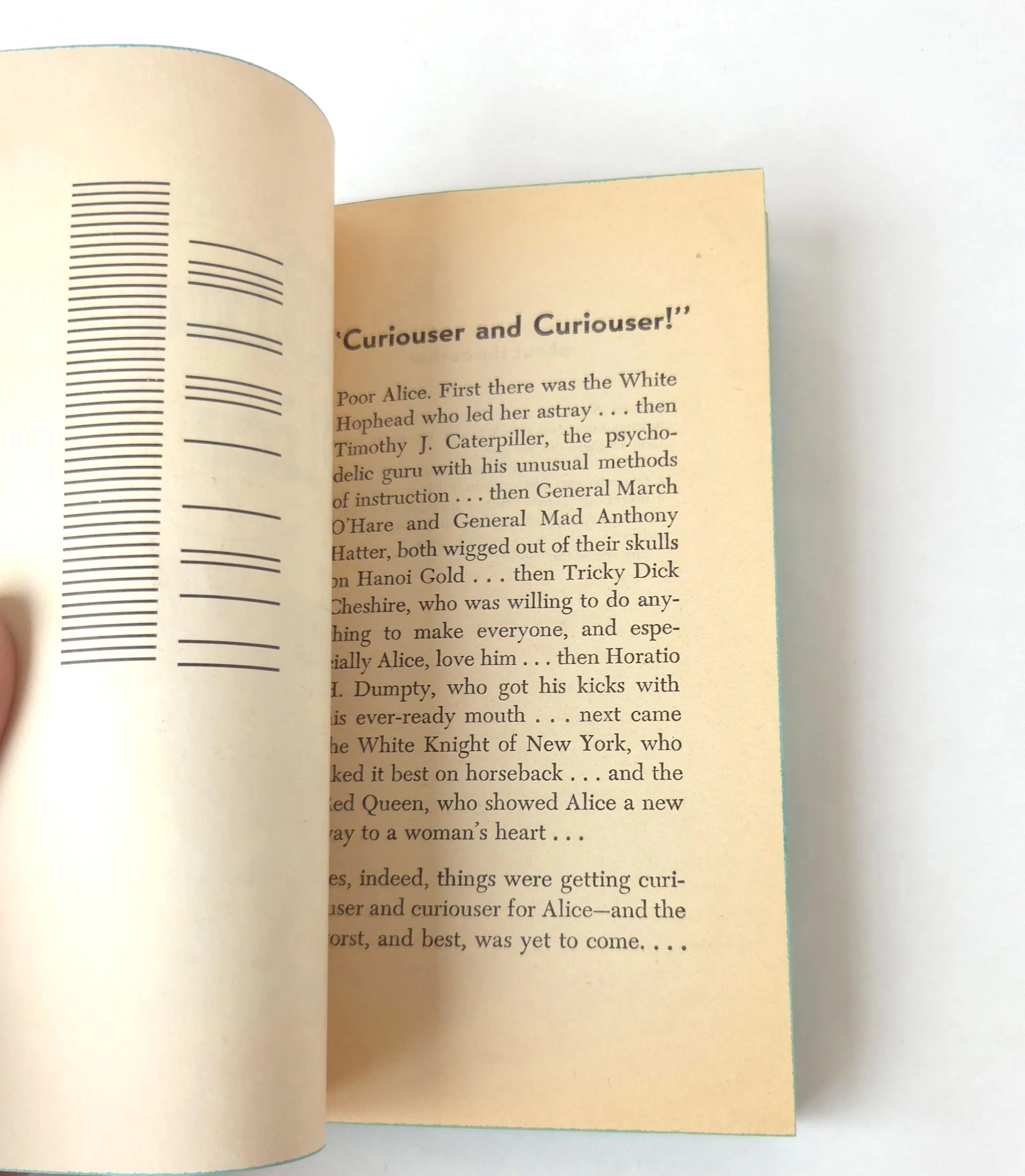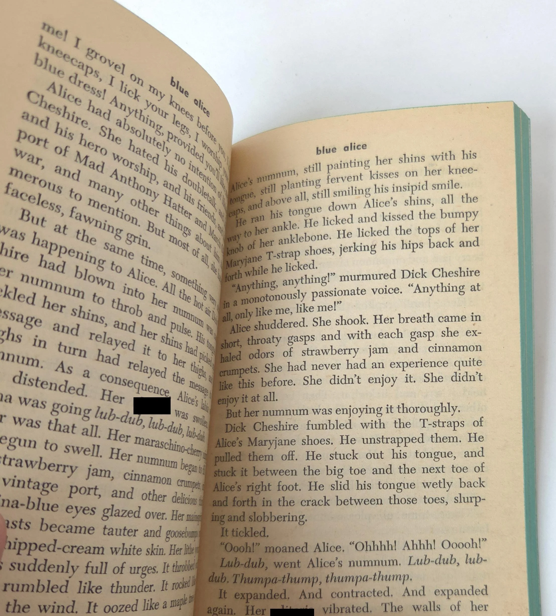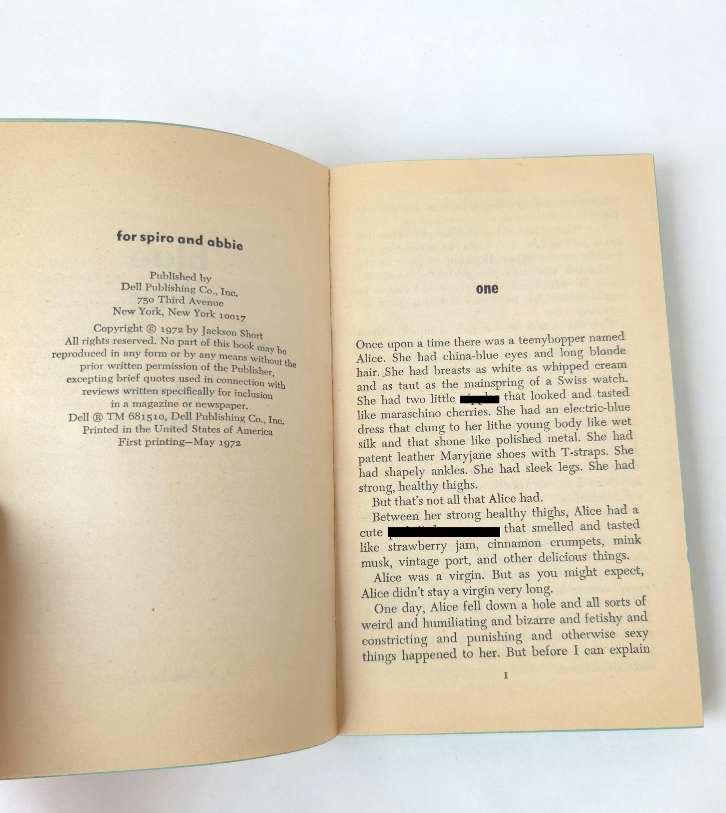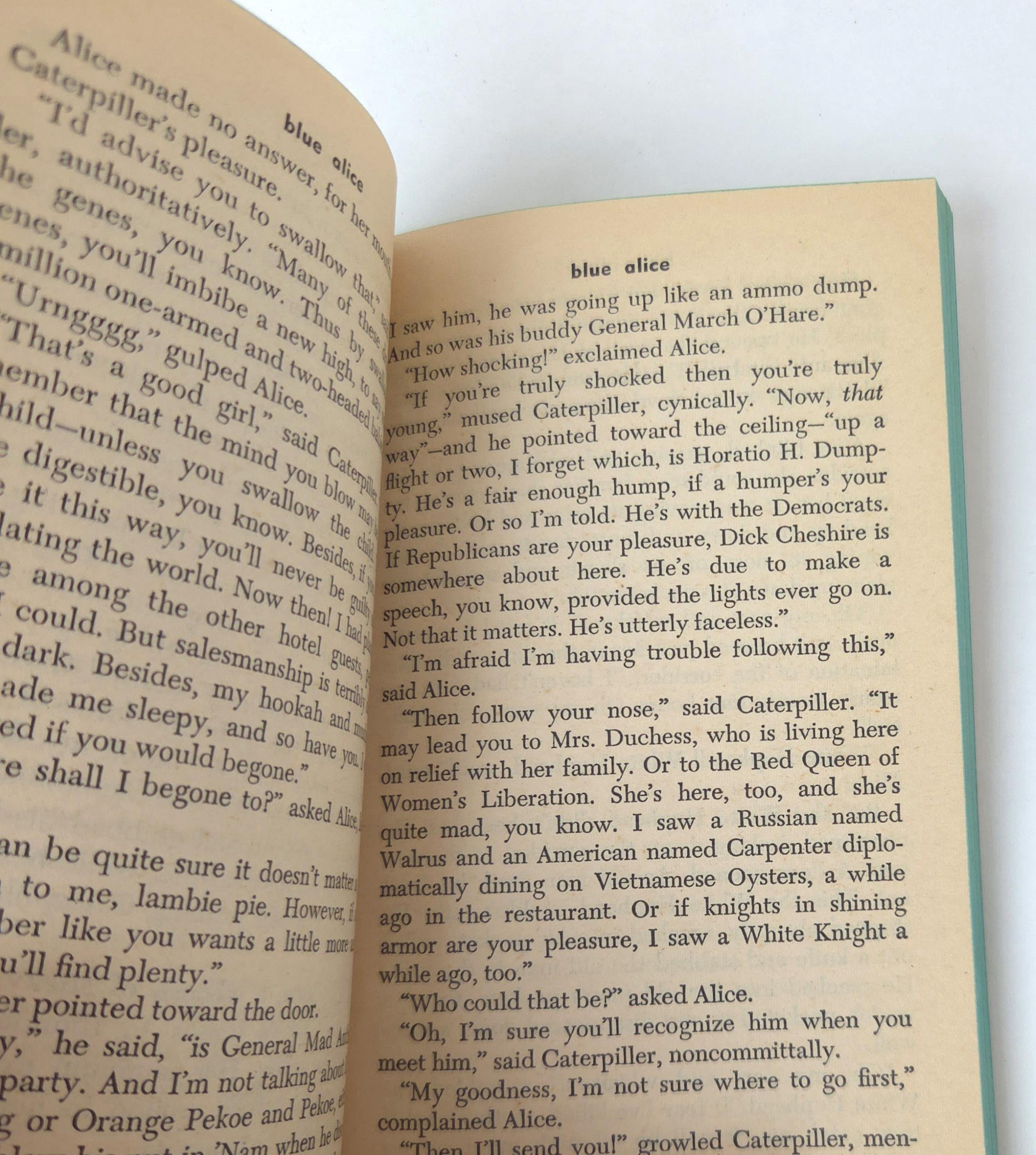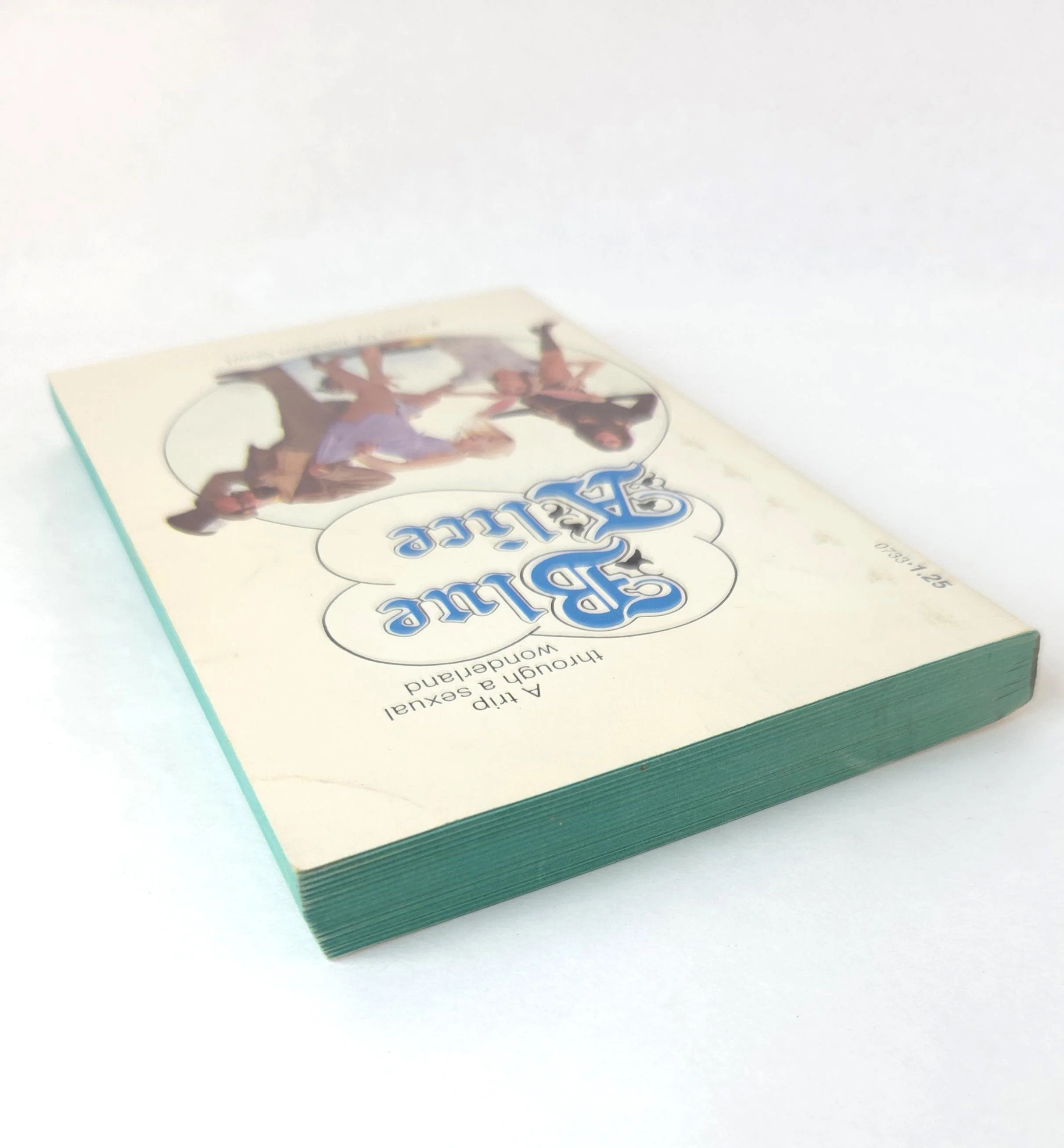 This vintage 1972 paperback edition of Blue Alice by Jackson Short is a "trip through a sexual wonderland" inspired by the classic children's tale Alice in Wonderland - but this version is not for kids! This adult novel tells the tale of a wee sexy miss named Alice and her drugged out and sexy adventures (that is why you may notice some language redacted in the photos). This copy is in used vintage condition with some scuffing to the cover and a slight crease to one corner, but no torn or marked pages and excellent overall color quality.