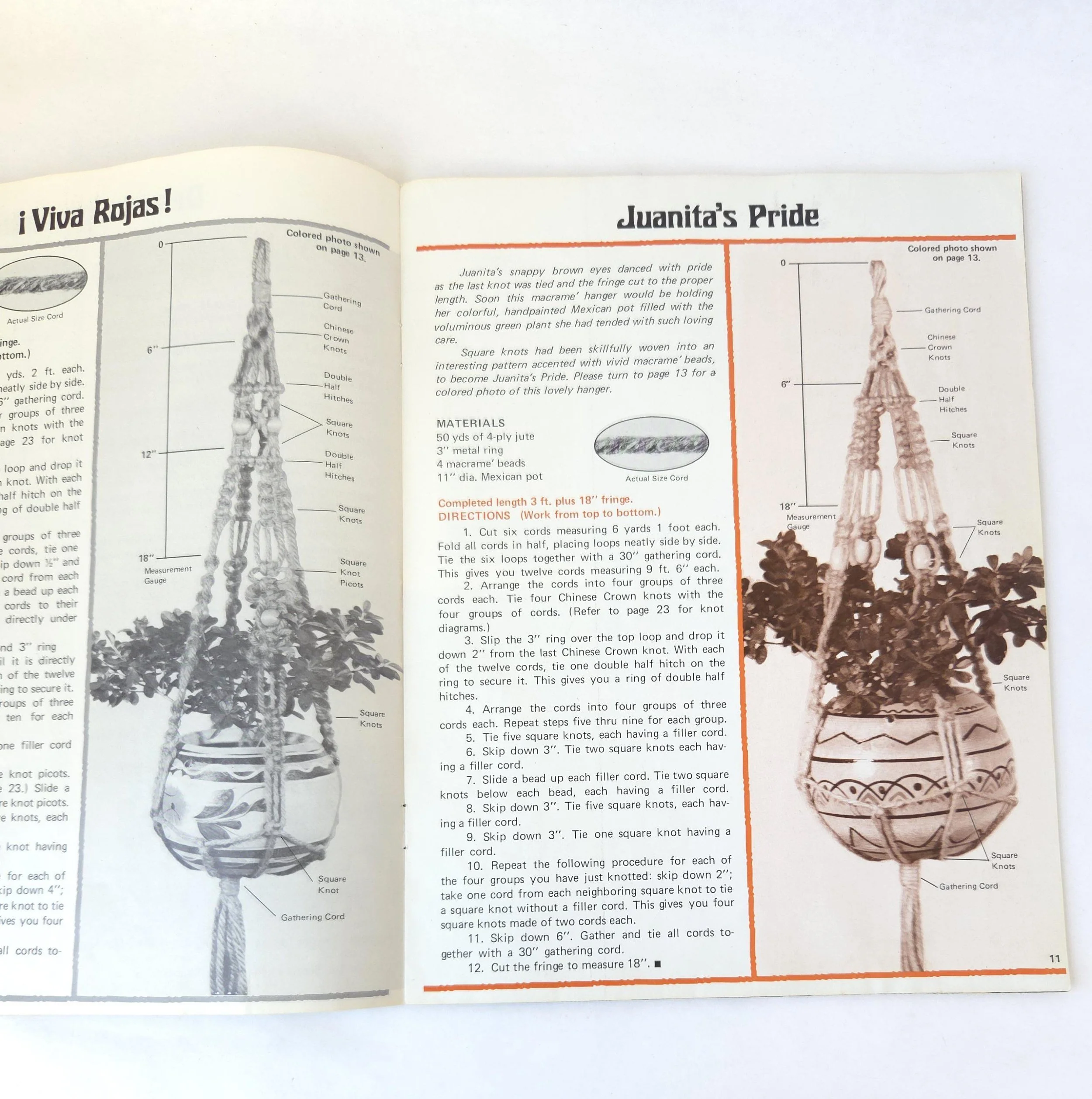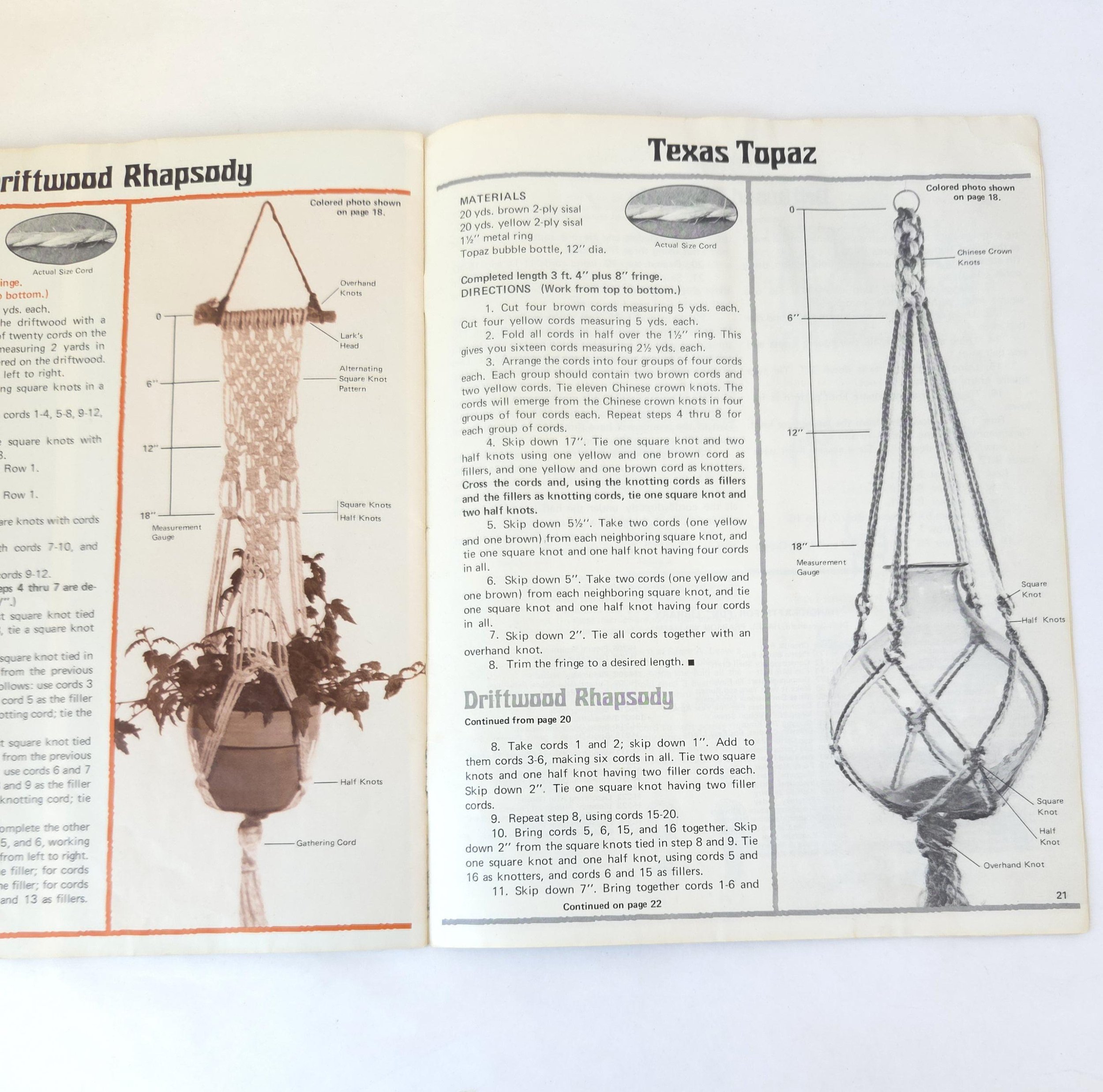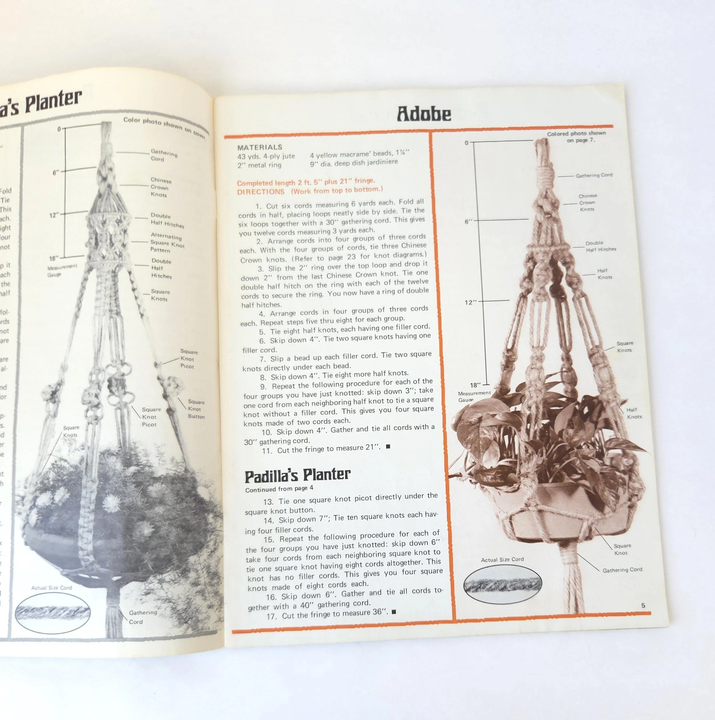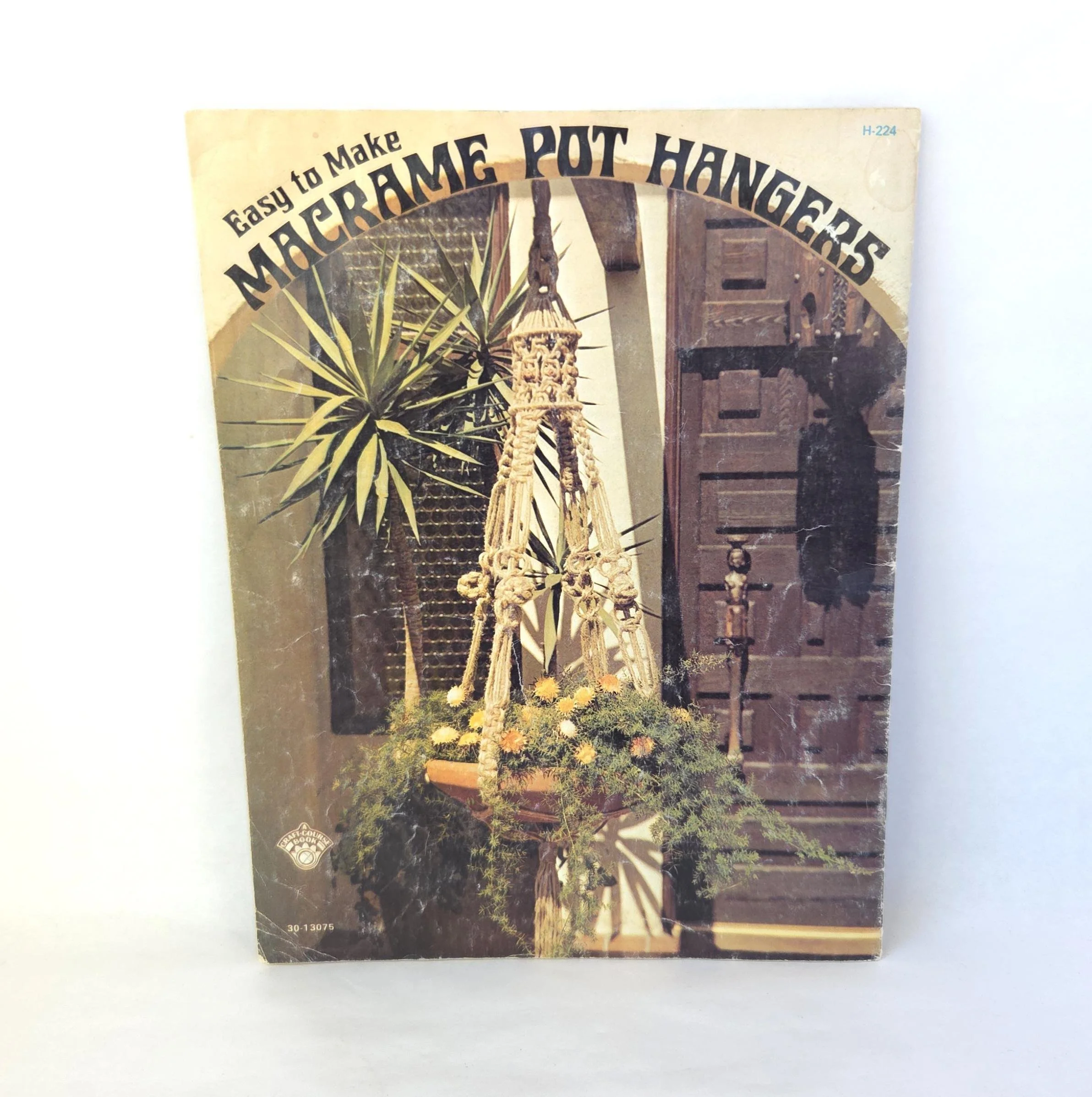 This vintage 1974 Easy To Make Macramé Pot Hangers magazine by Craft Course Publishers includes over a dozen projects with easy to follow directions. The magazine is in used condition with the original price tag still on the front, some creasing, wear and color loss to the cover, along with a couple of spots of discoloration inside the cover. There is some crinkling to the pages but are no torn or marked pages and good overall color quality.