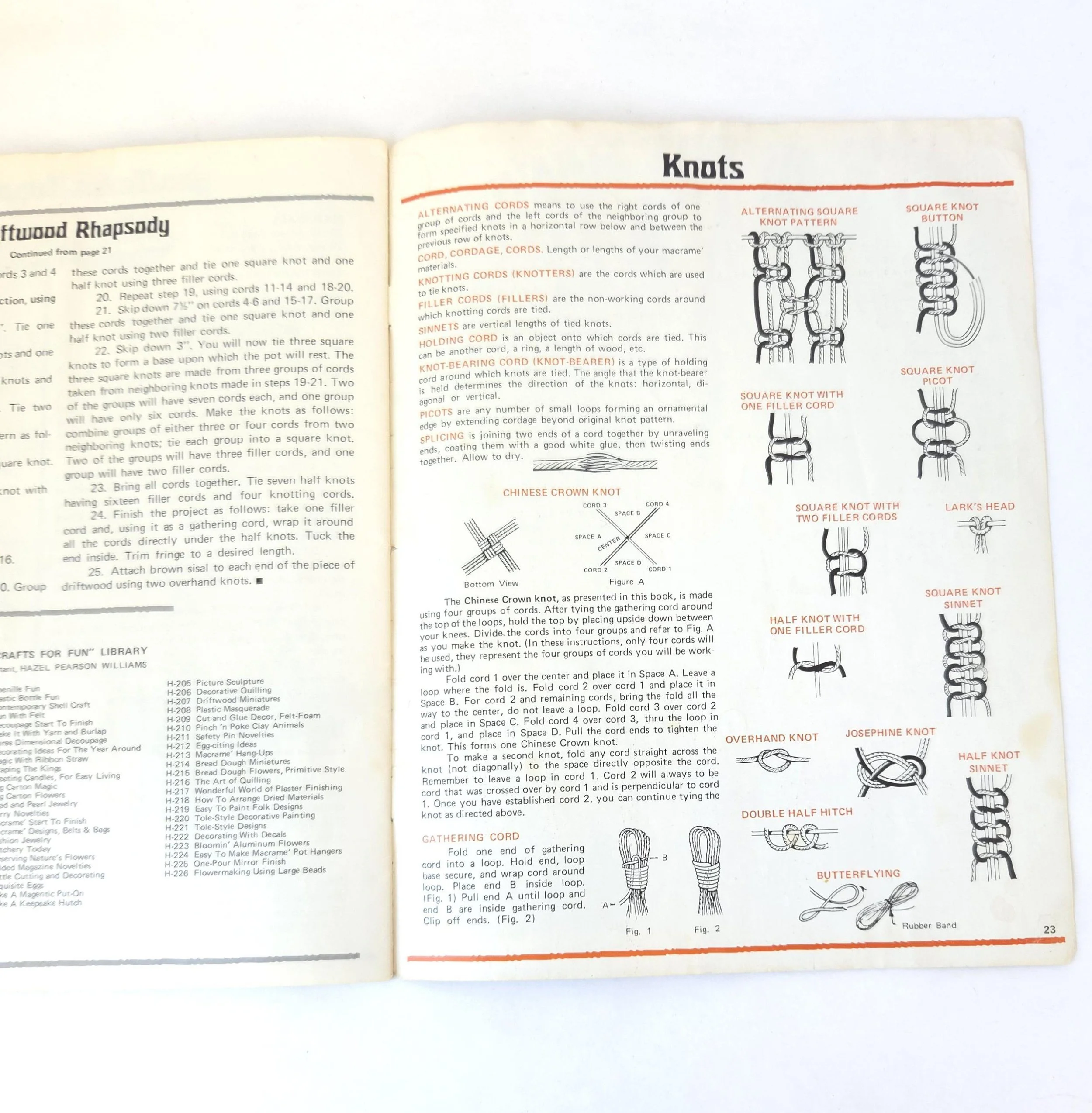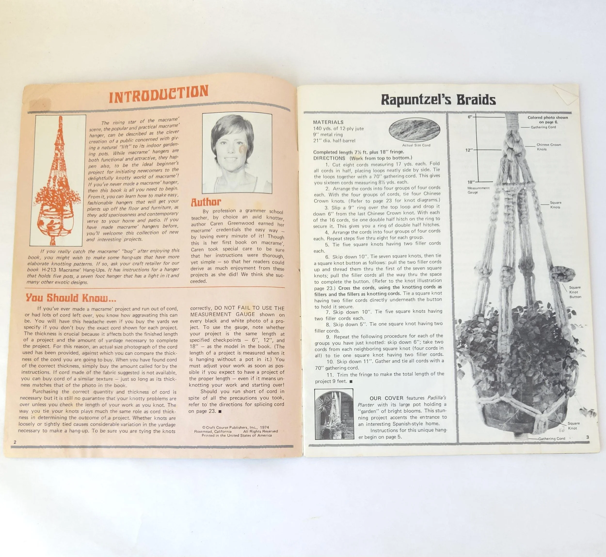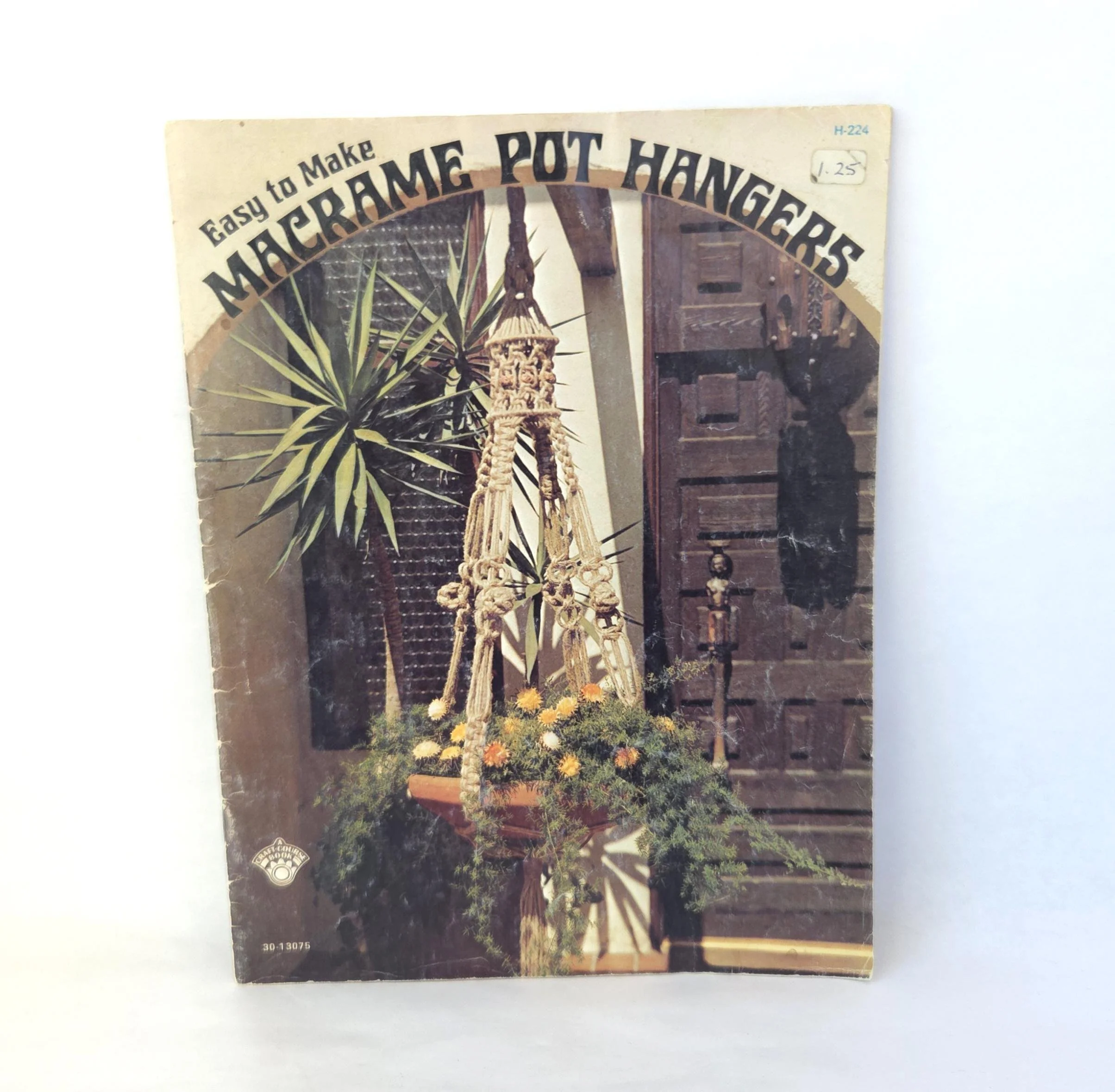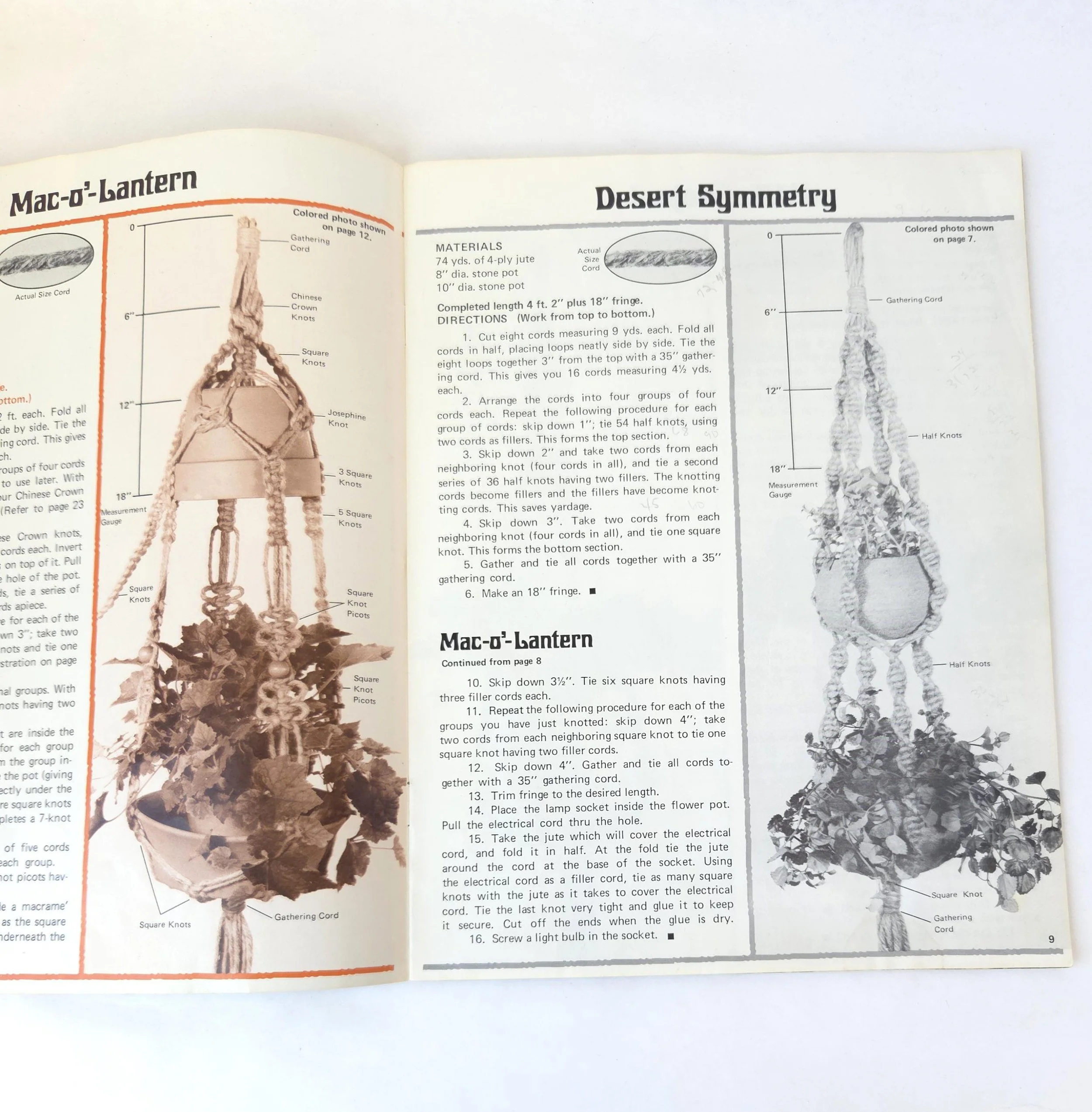 This vintage 1974 Easy To Make Macramé Pot Hangers magazine by Craft Course Publishers includes over a dozen projects with easy to follow directions. The magazine is in used condition with the original price tag still on the front, some creasing, wear and color loss to the cover, along with a couple of spots of discoloration inside the cover. There is some crinkling to the pages but are no torn or marked pages and good overall color quality.