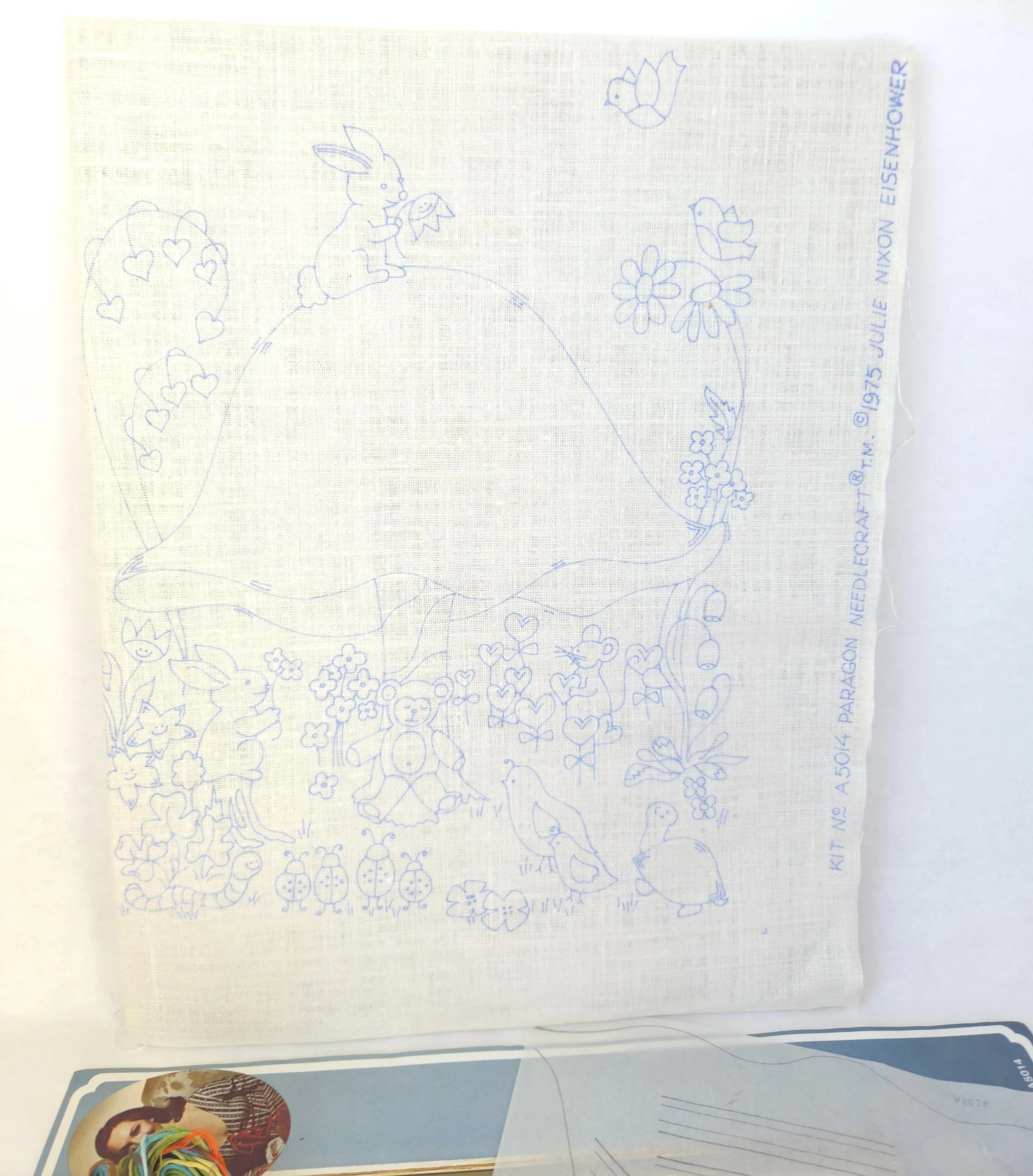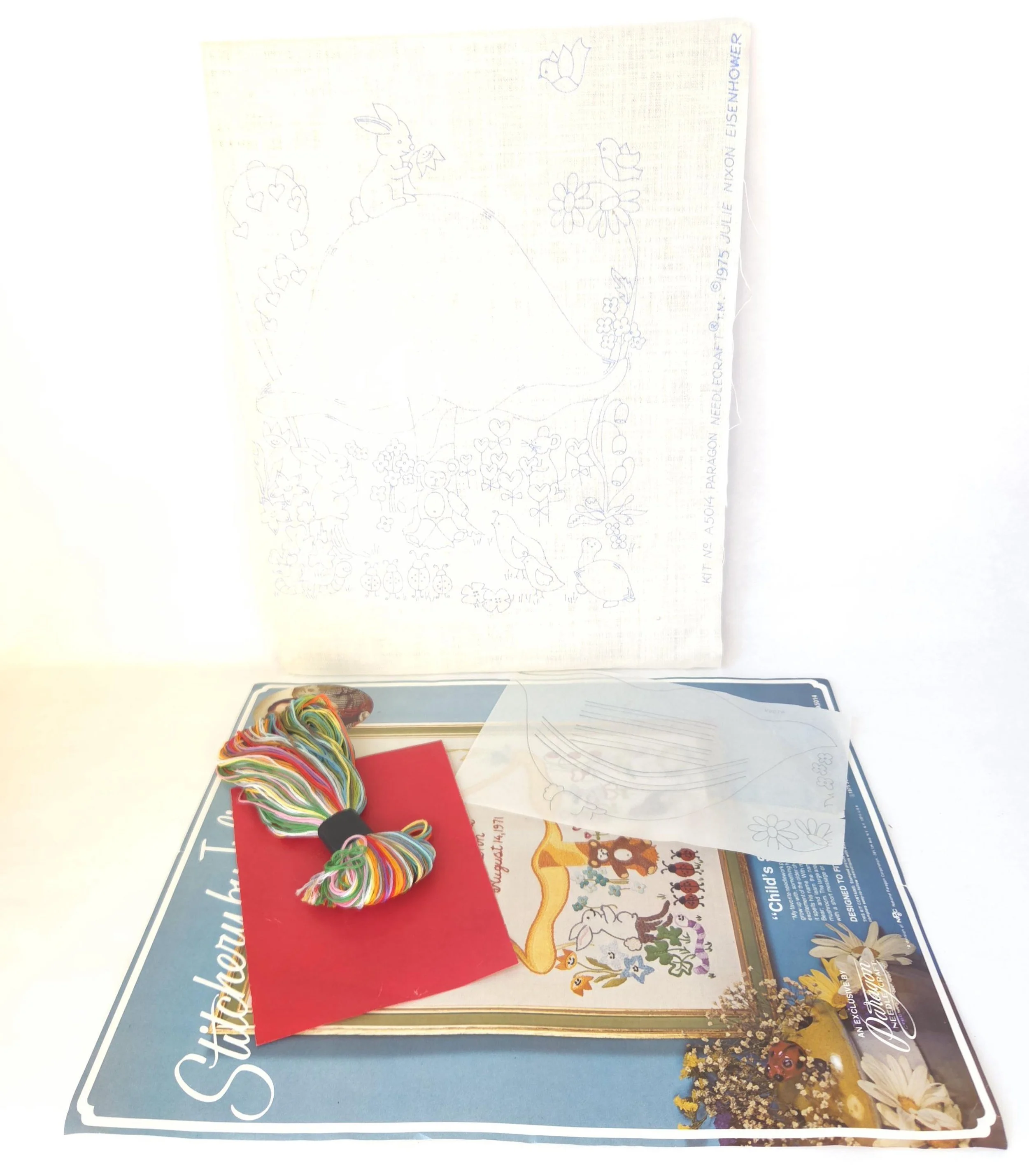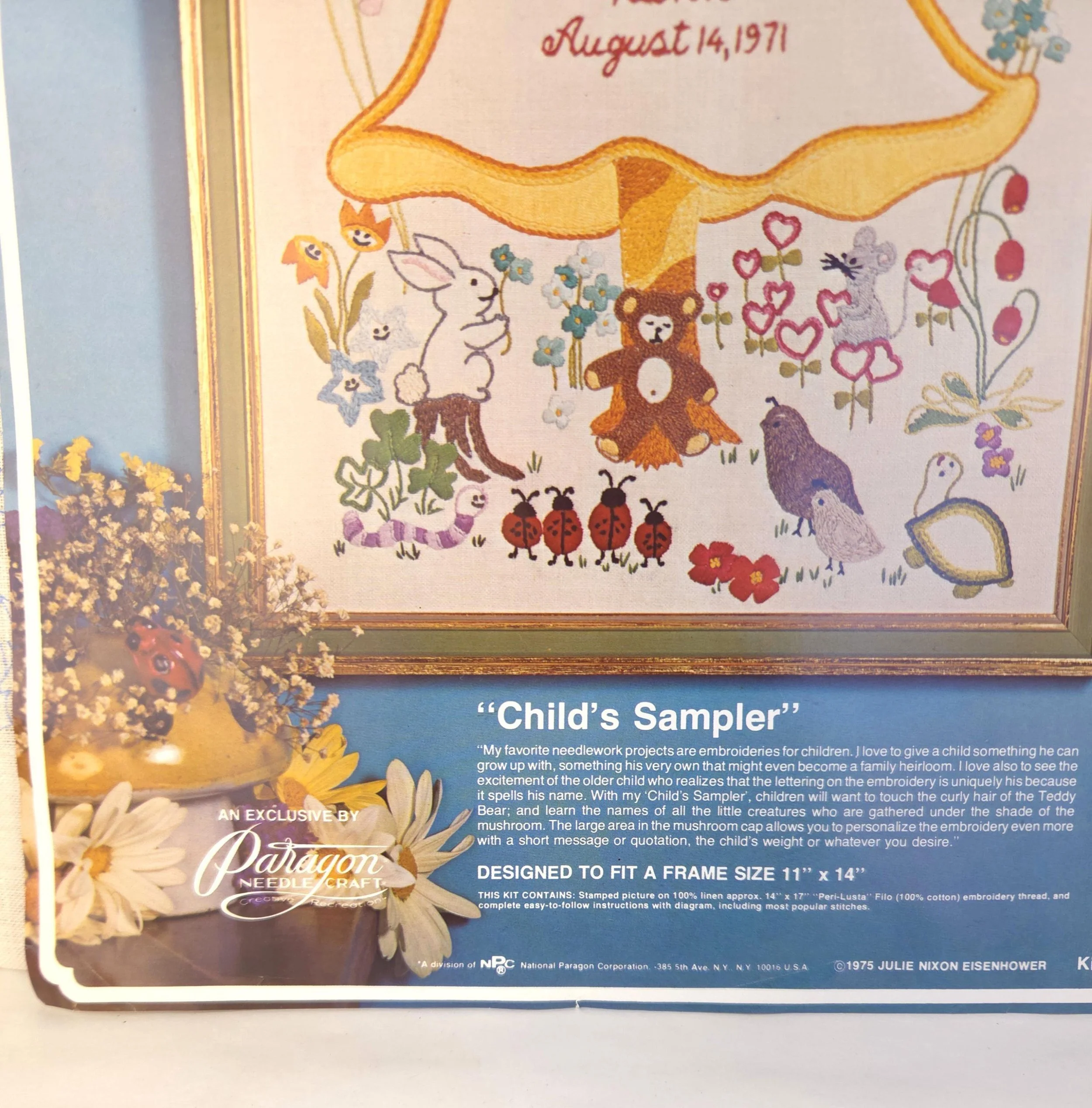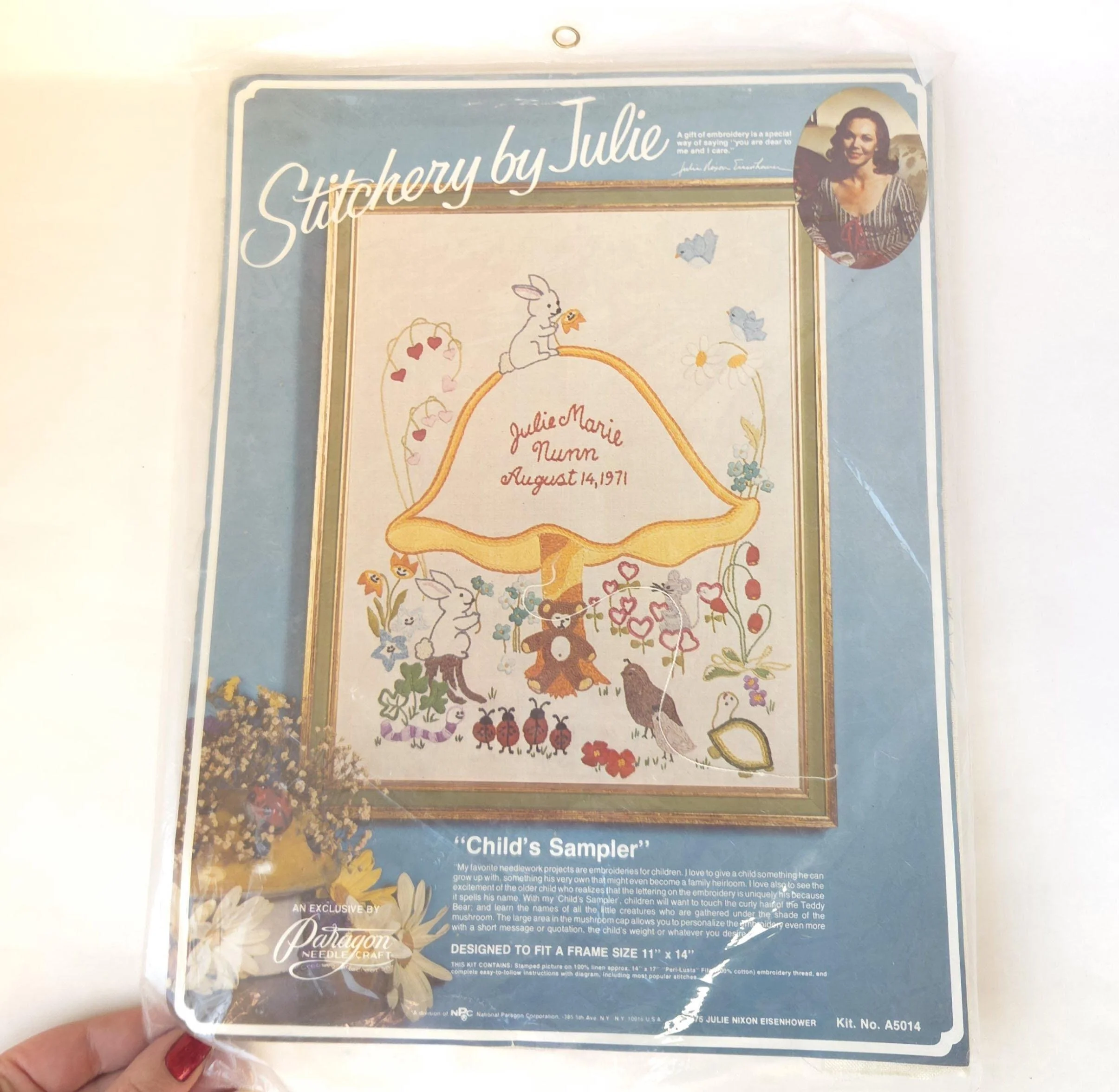 This darling vintage 1975 embroidery kit from Stitcher by Julia is Child's Sampler featuring a crew of happy critters gathering flowers underneath a giant mushroom. The kit includes: