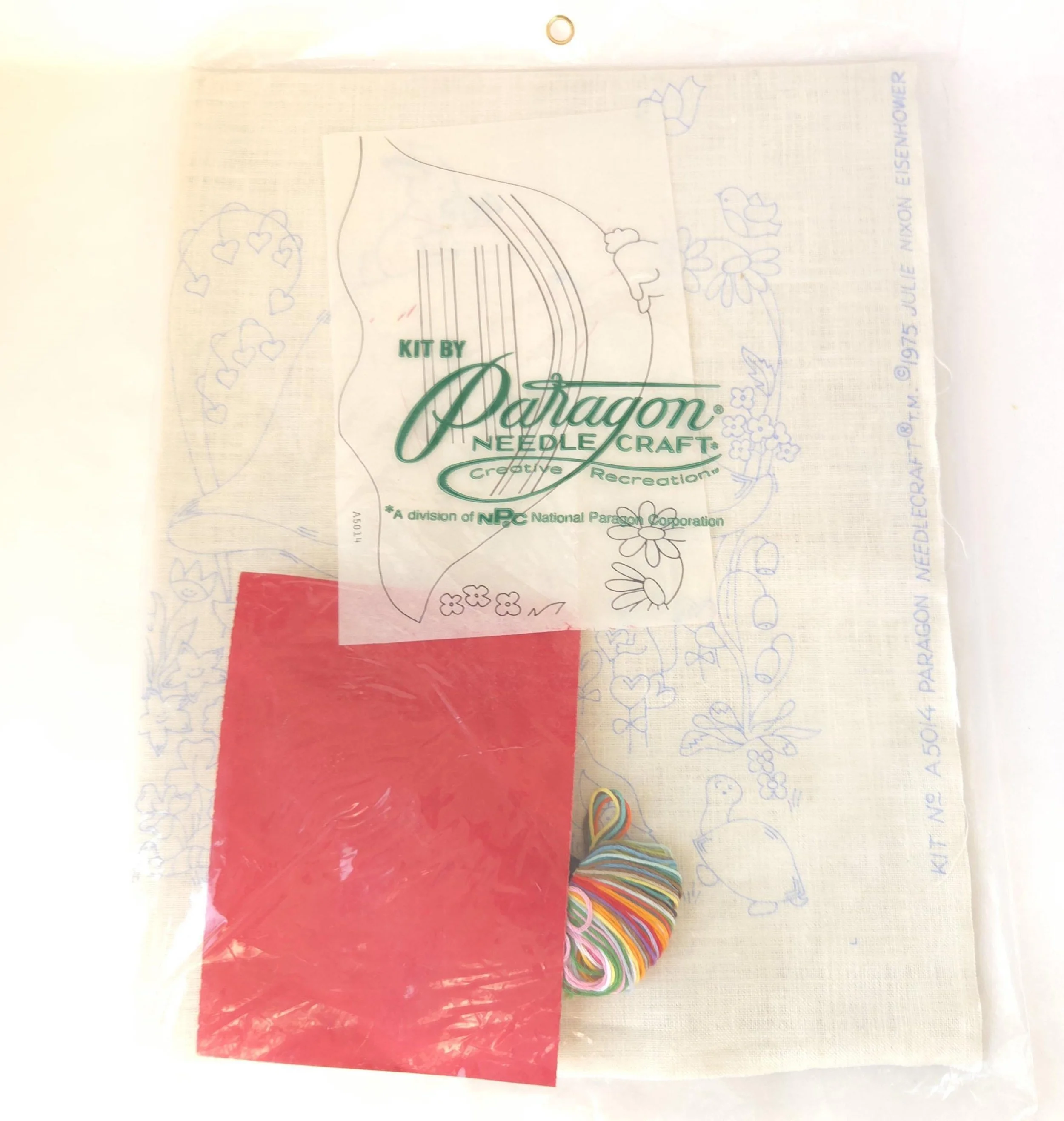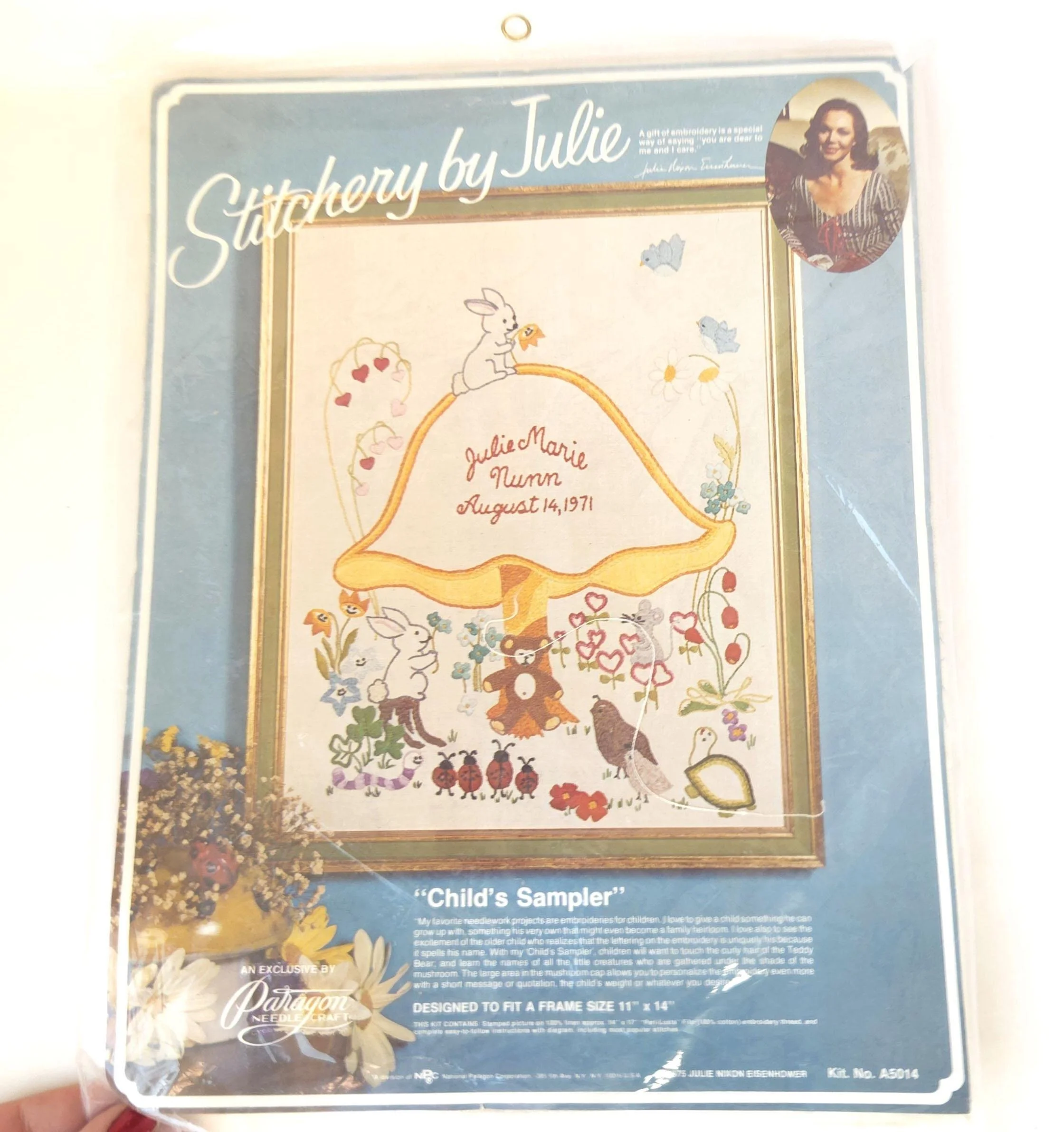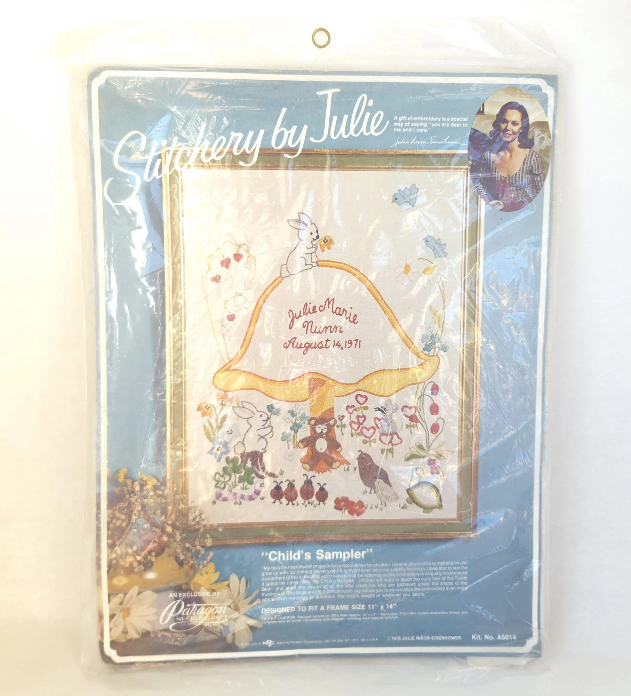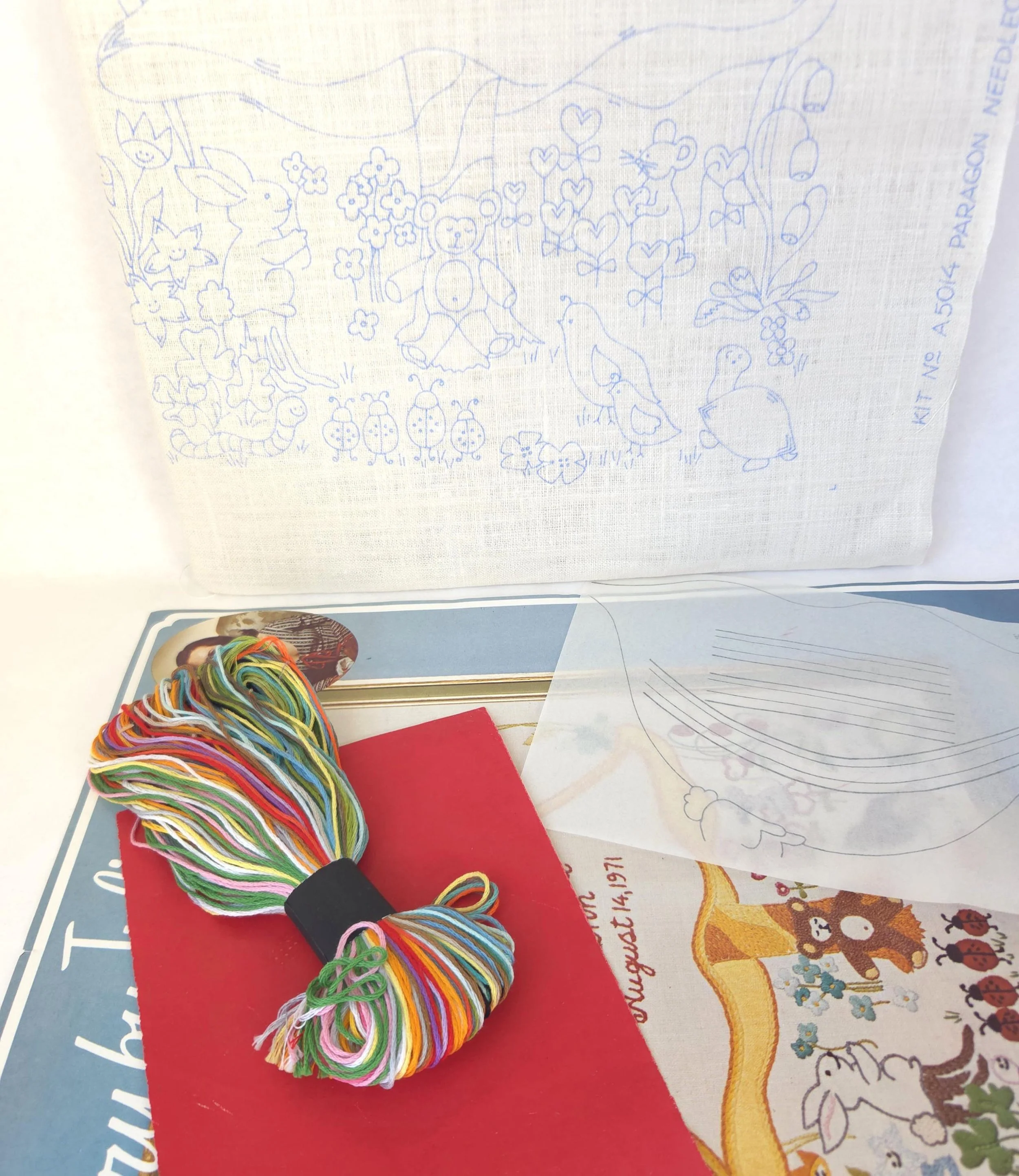 This darling vintage 1975 embroidery kit from Stitcher by Julia is Child's Sampler featuring a crew of happy critters gathering flowers underneath a giant mushroom. The kit includes: