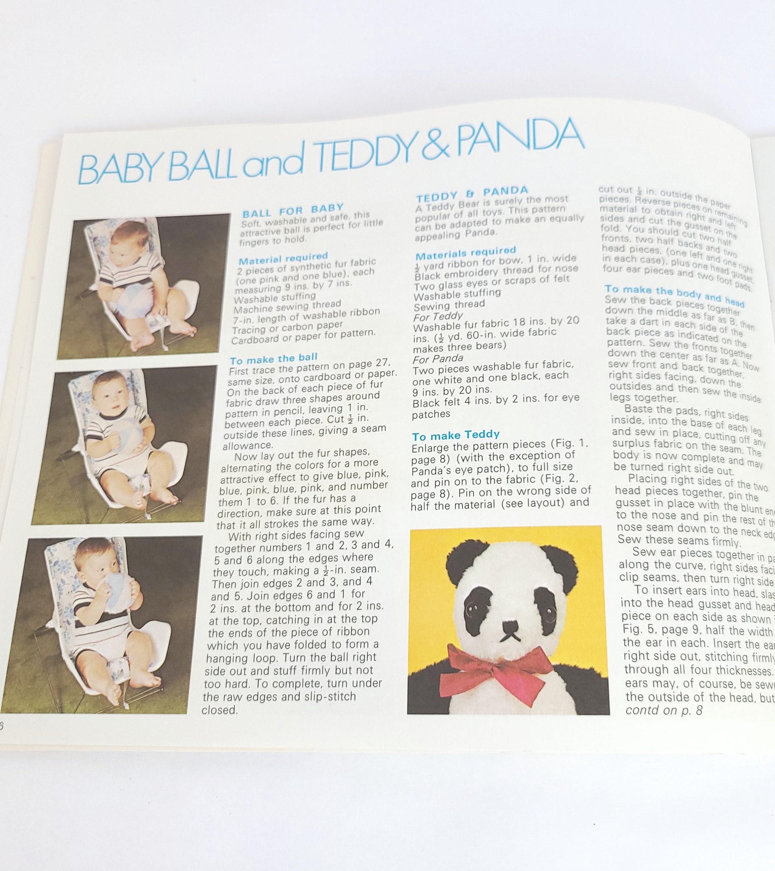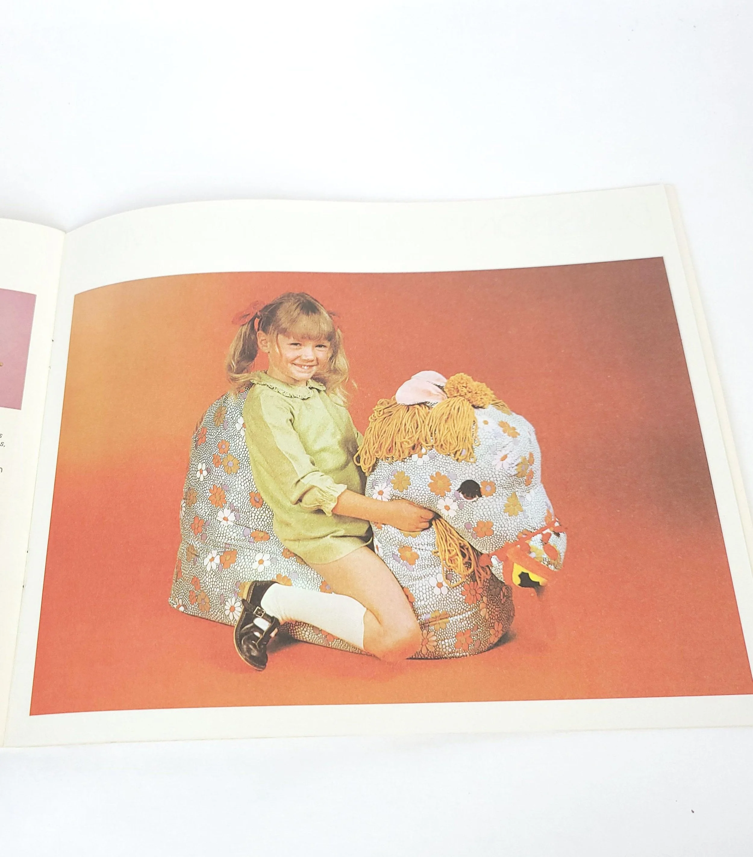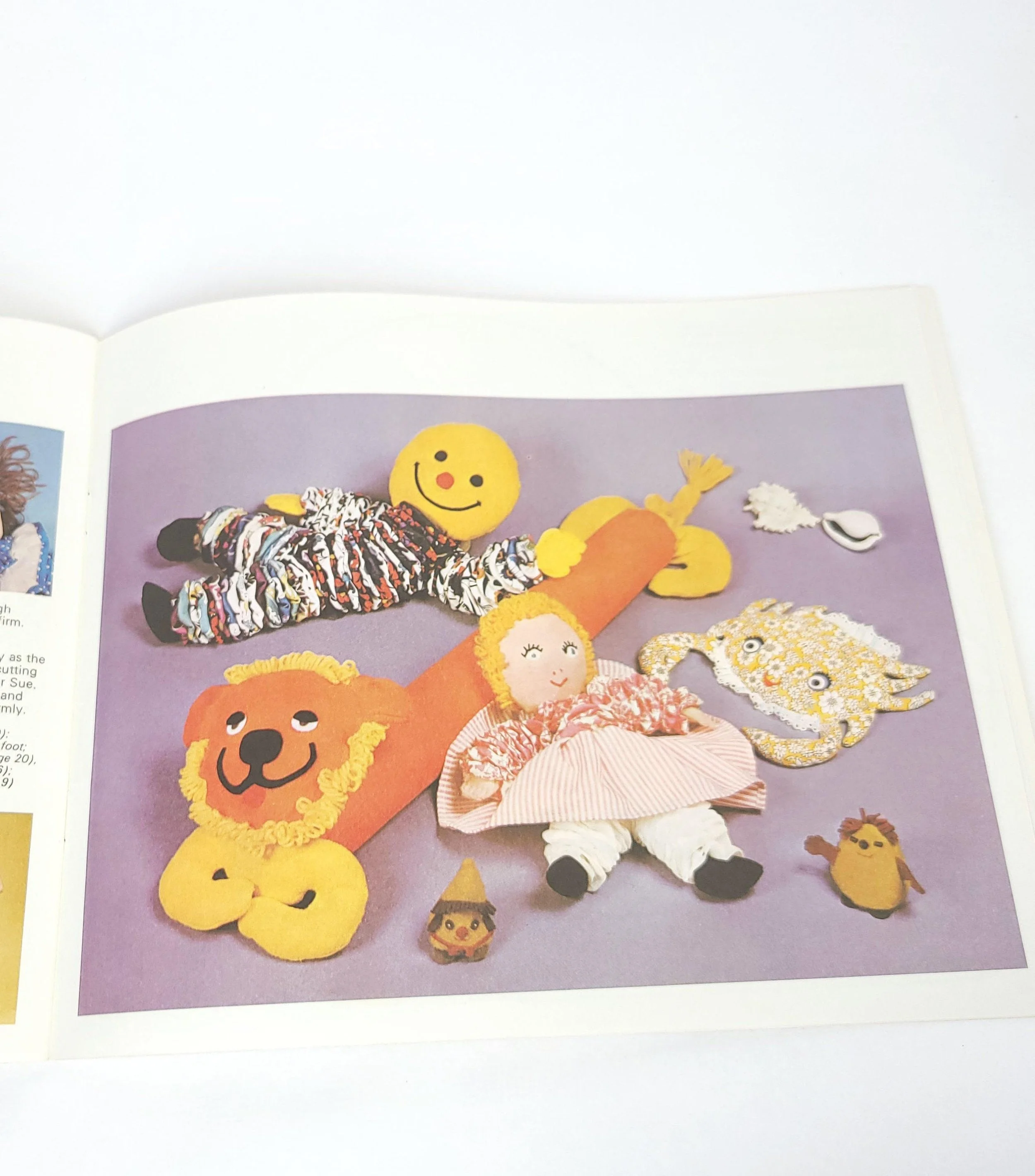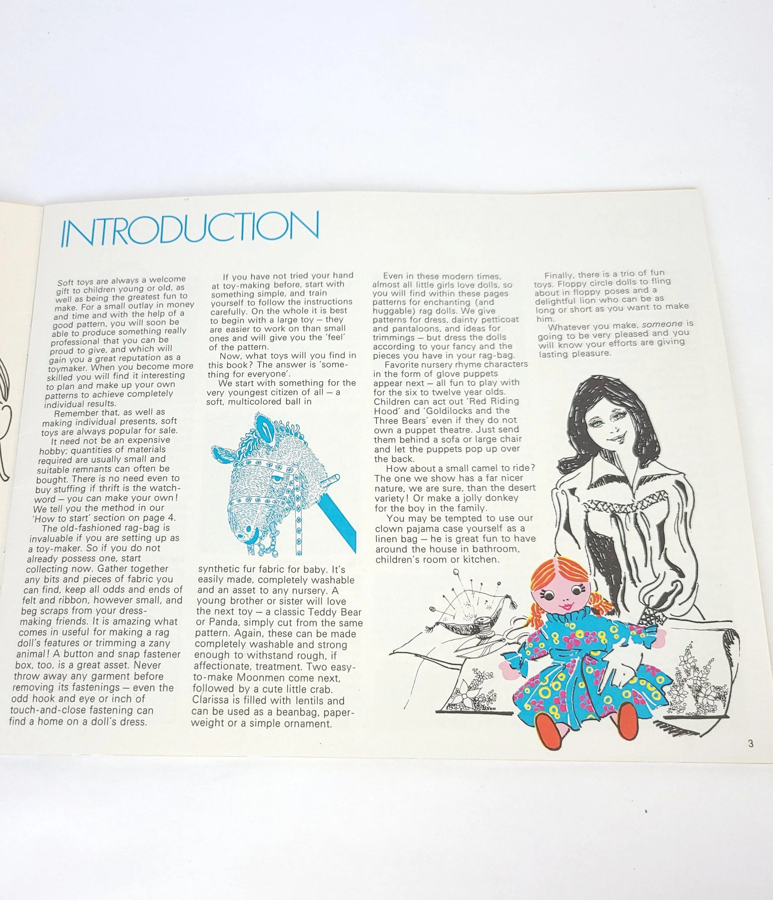 This 1975 edition of Creative Patterns for Soft Toys features over a dozen fun, easy to follow projects for making softs toys, including stuffed animals, puppets, dolls and much more. The booklet is in good used condition with no torn or missing pages and excellent color quality.