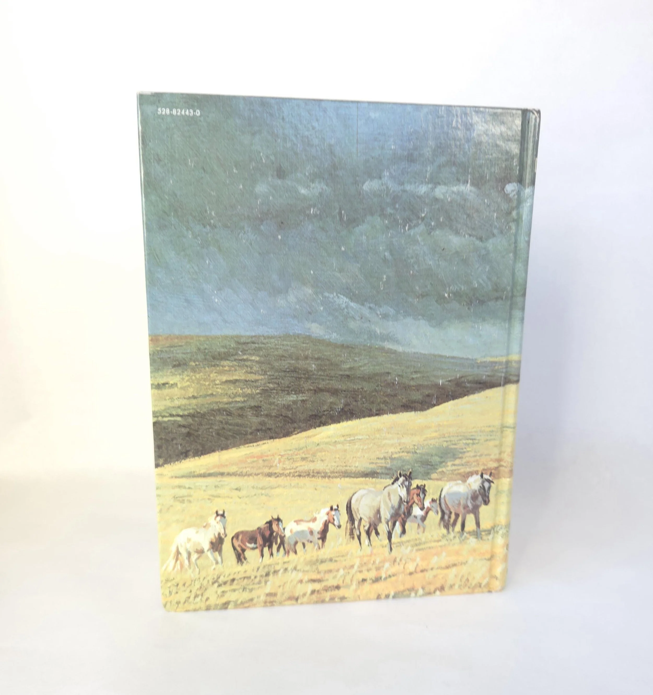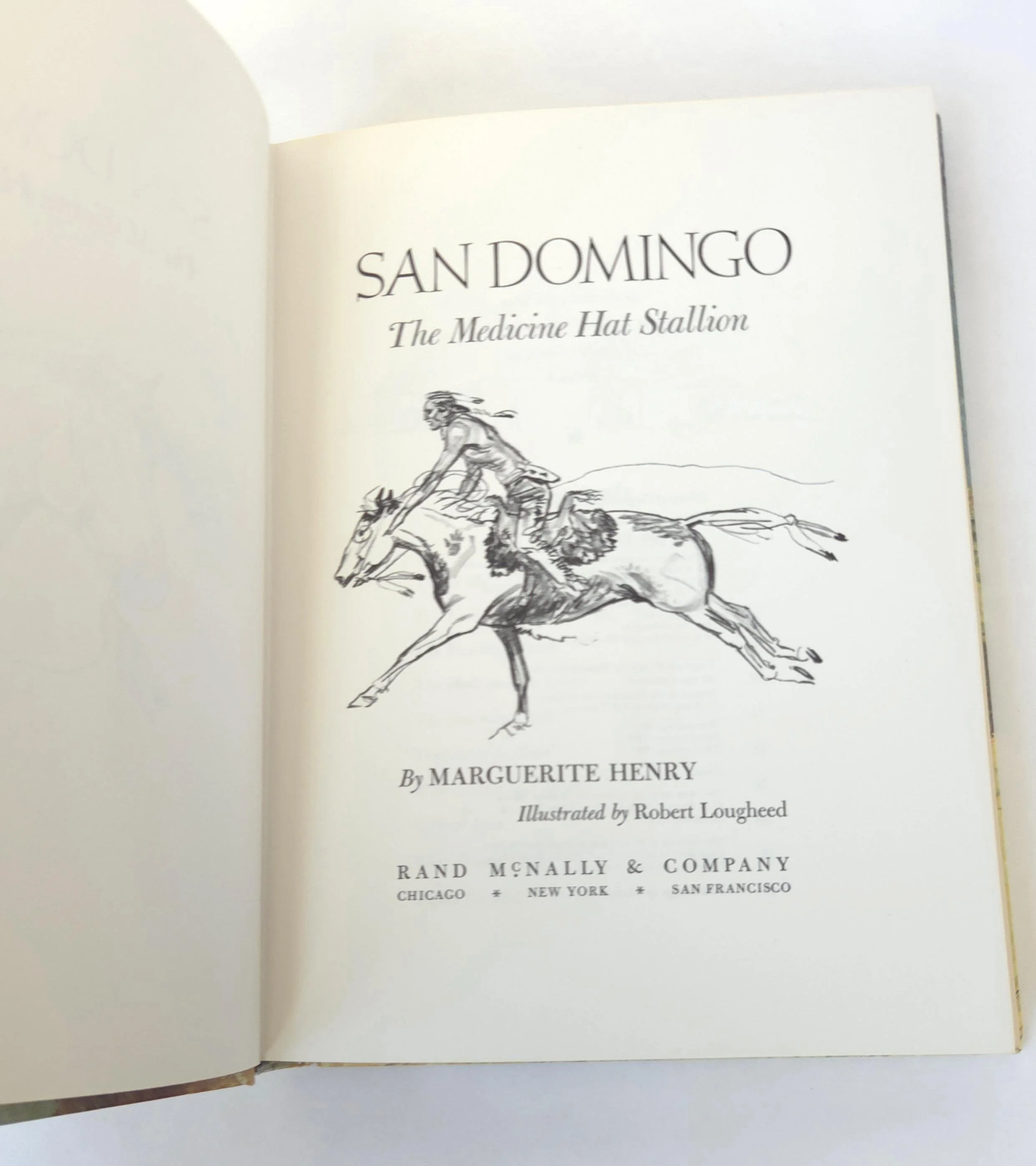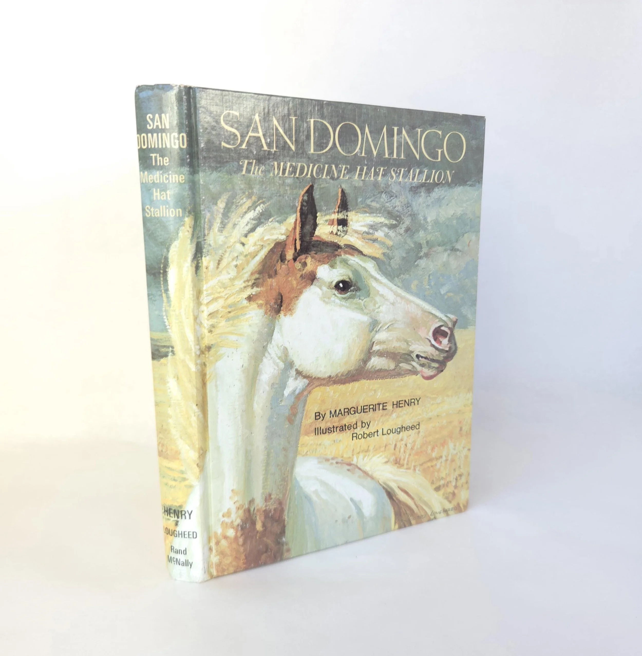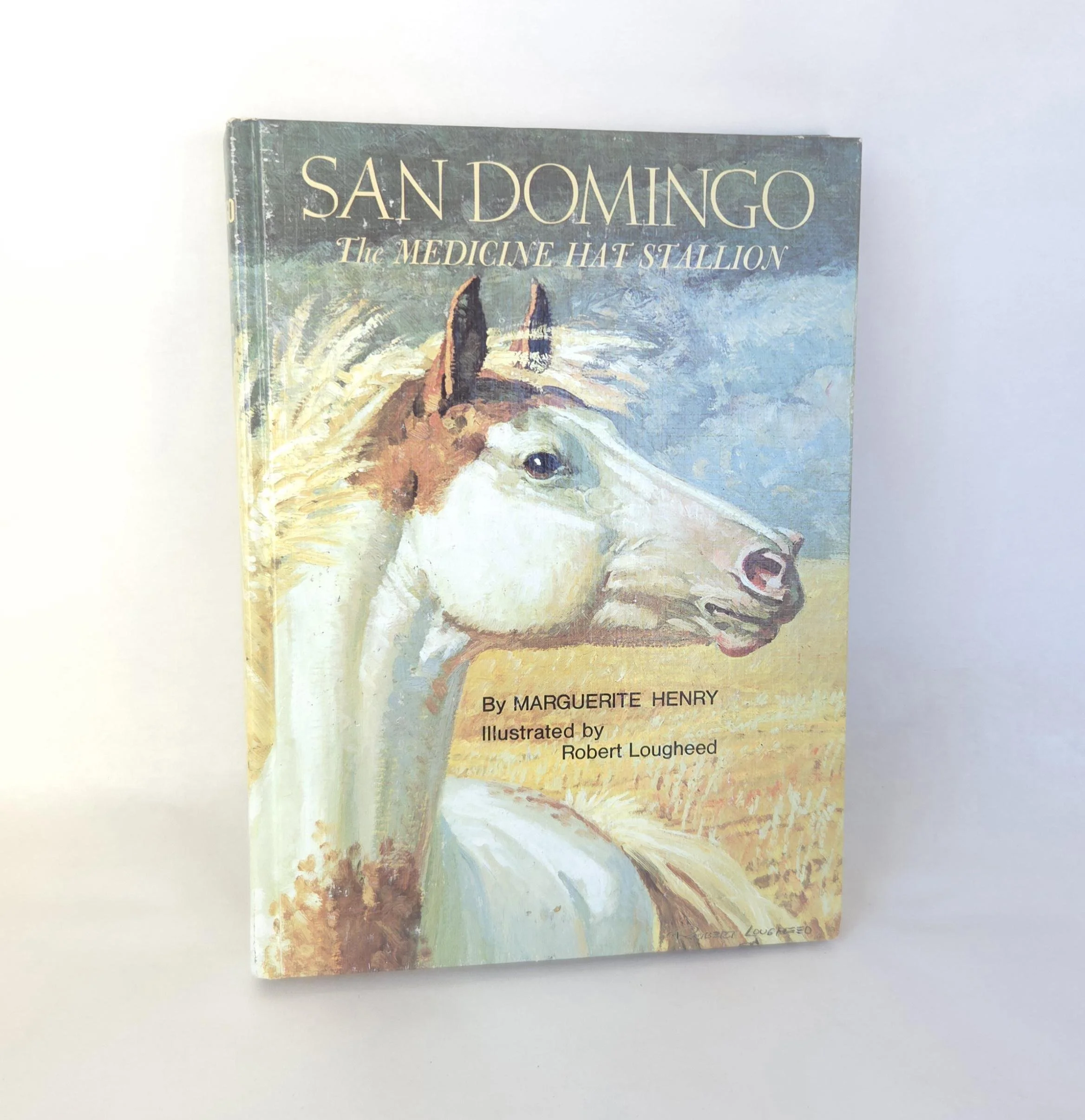 This special 1981 hardcover edition of San Domingo: The Medicine Hat Stallion is a novel by Marguerite Henry, featuring illustrations by Robert Loughee. It tells the story of a sacred horse with a white "war bonnet" marking, believed to protect its rider. The story follows Peter Lundy and his bond with the horse, which is broken when his father trades the horse, forcing Peter to leave home. This copy is in good used vintage condition with some minor wear to the edges of the cover, but no torn or marked pages and excellent overall color quality.