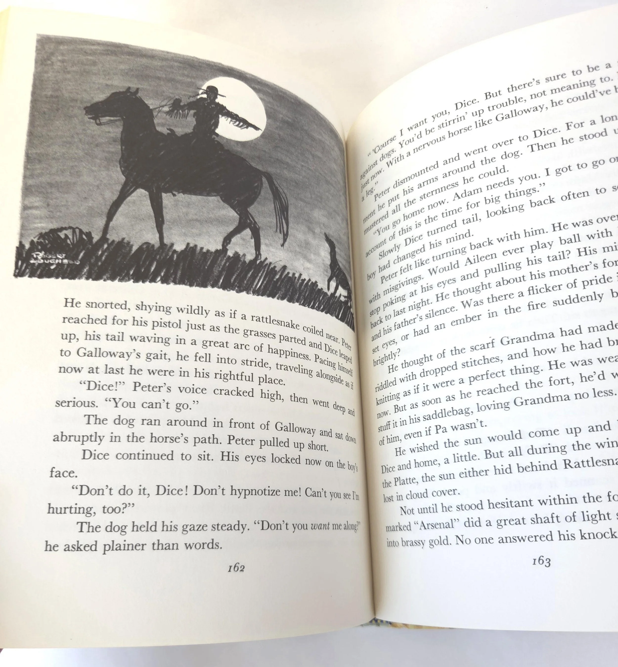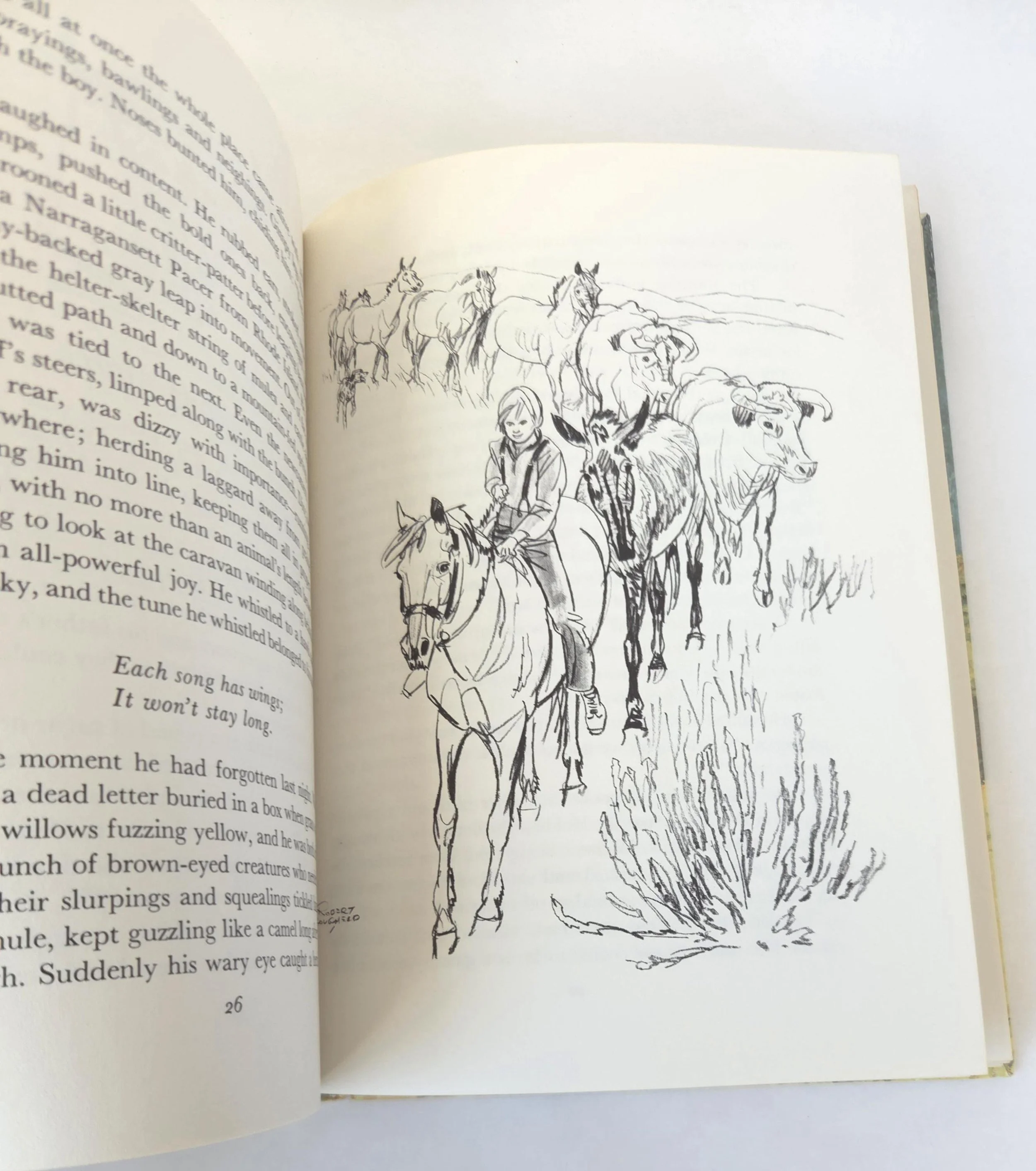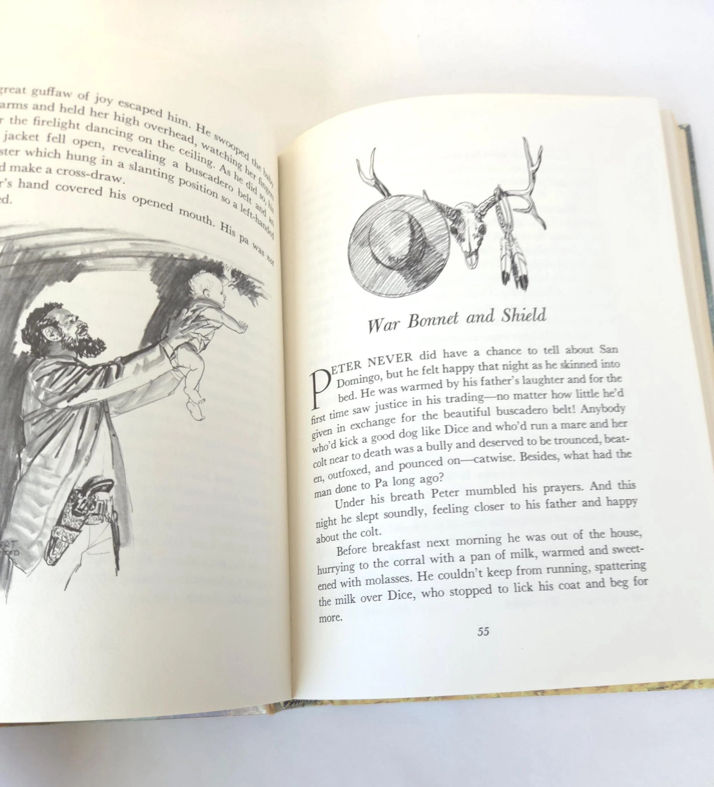 This special 1981 hardcover edition of San Domingo: The Medicine Hat Stallion is a novel by Marguerite Henry, featuring illustrations by Robert Loughee. It tells the story of a sacred horse with a white "war bonnet" marking, believed to protect its rider. The story follows Peter Lundy and his bond with the horse, which is broken when his father trades the horse, forcing Peter to leave home. This copy is in good used vintage condition with some minor wear to the edges of the cover, but no torn or marked pages and excellent overall color quality.