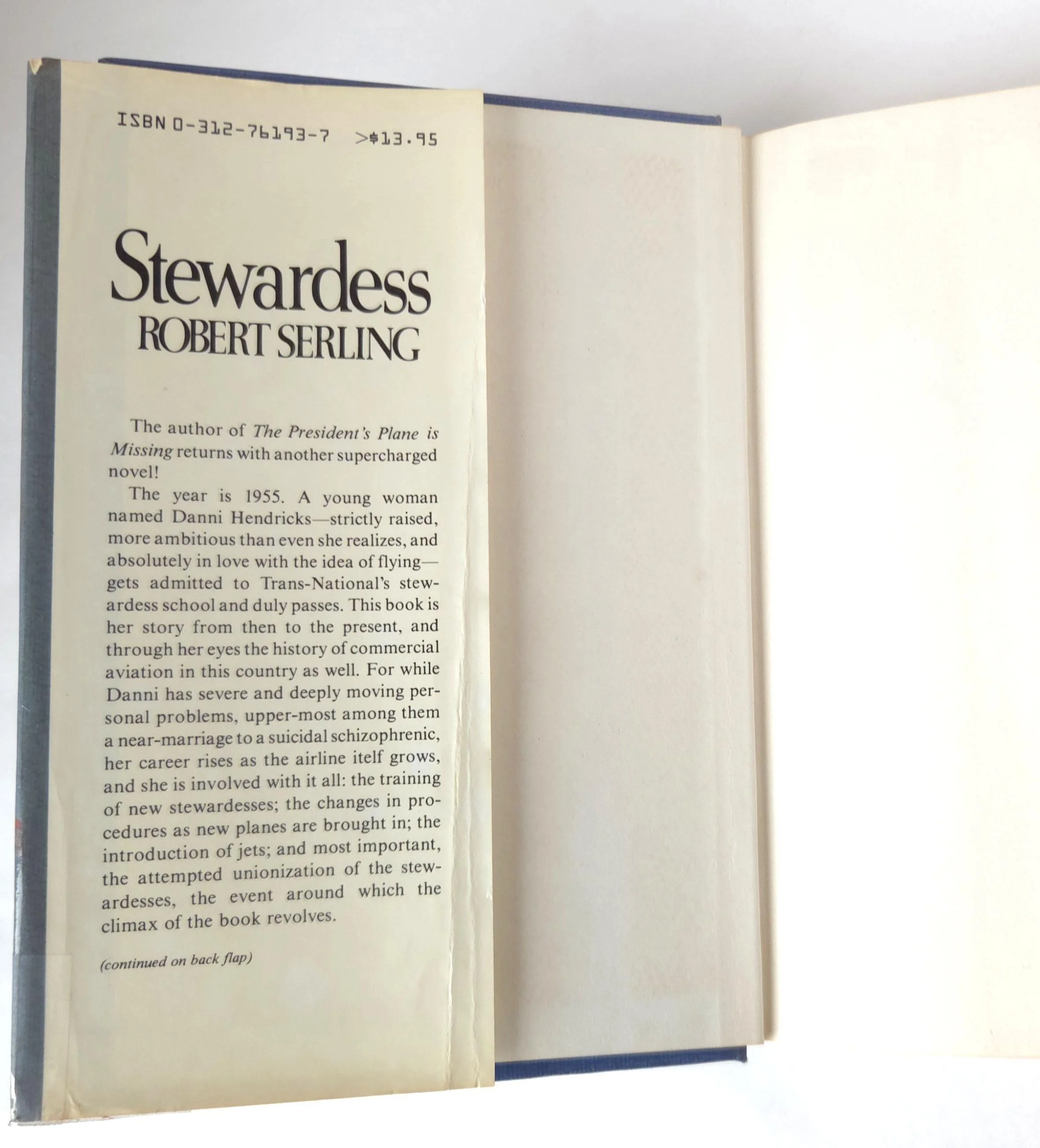 This charming vintage 1982 hardcover first edition of Stewardess was written by Robert Serling. It tells the story of Danni Hendricks - strictly raised, more ambitious than even she realizes, and absolutely in love with the idea of flying. This copy is in used vintage condition with some wear to the edges of the dust jacket, but no torn or marked pages and excellent overall color quality.