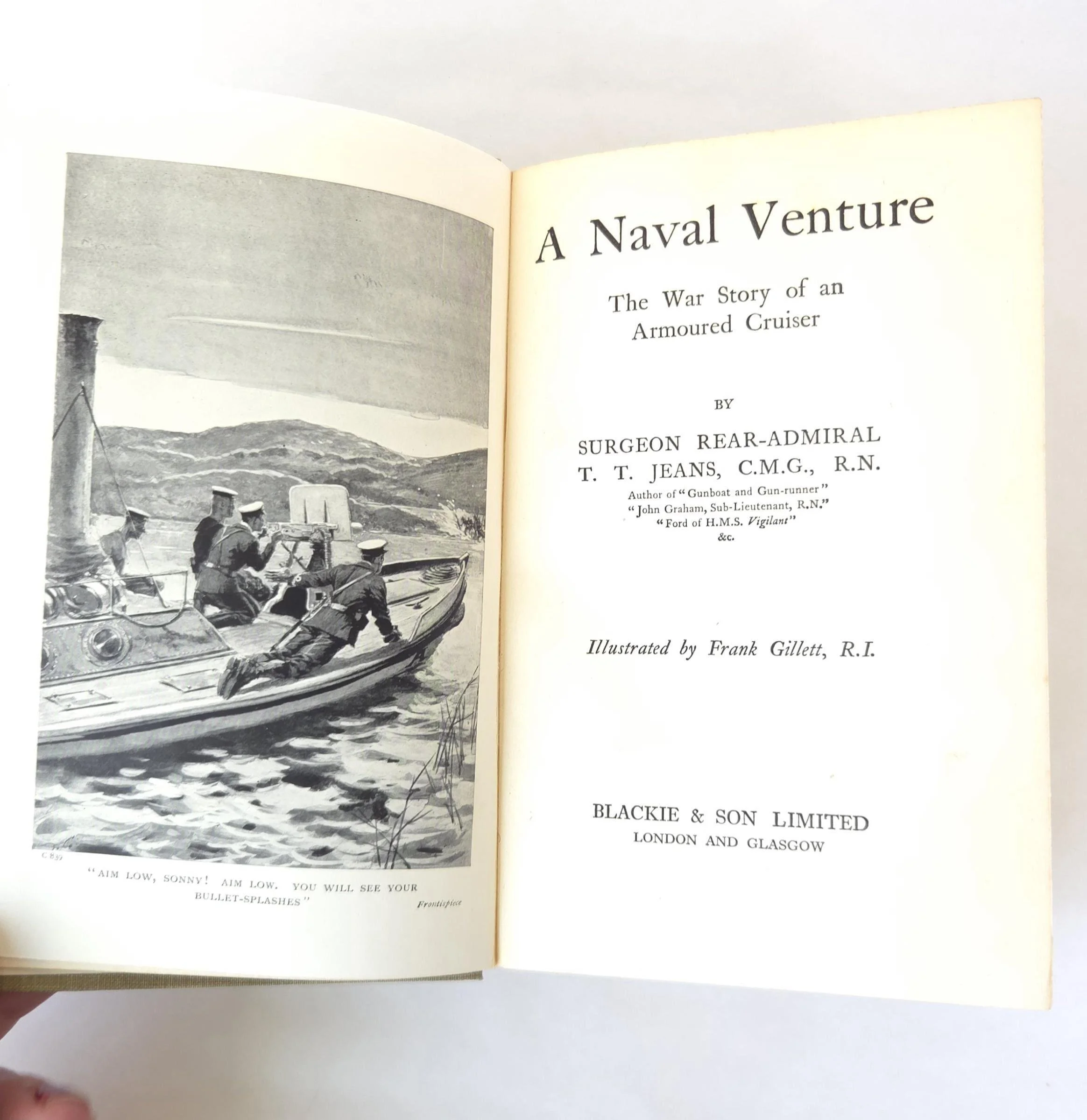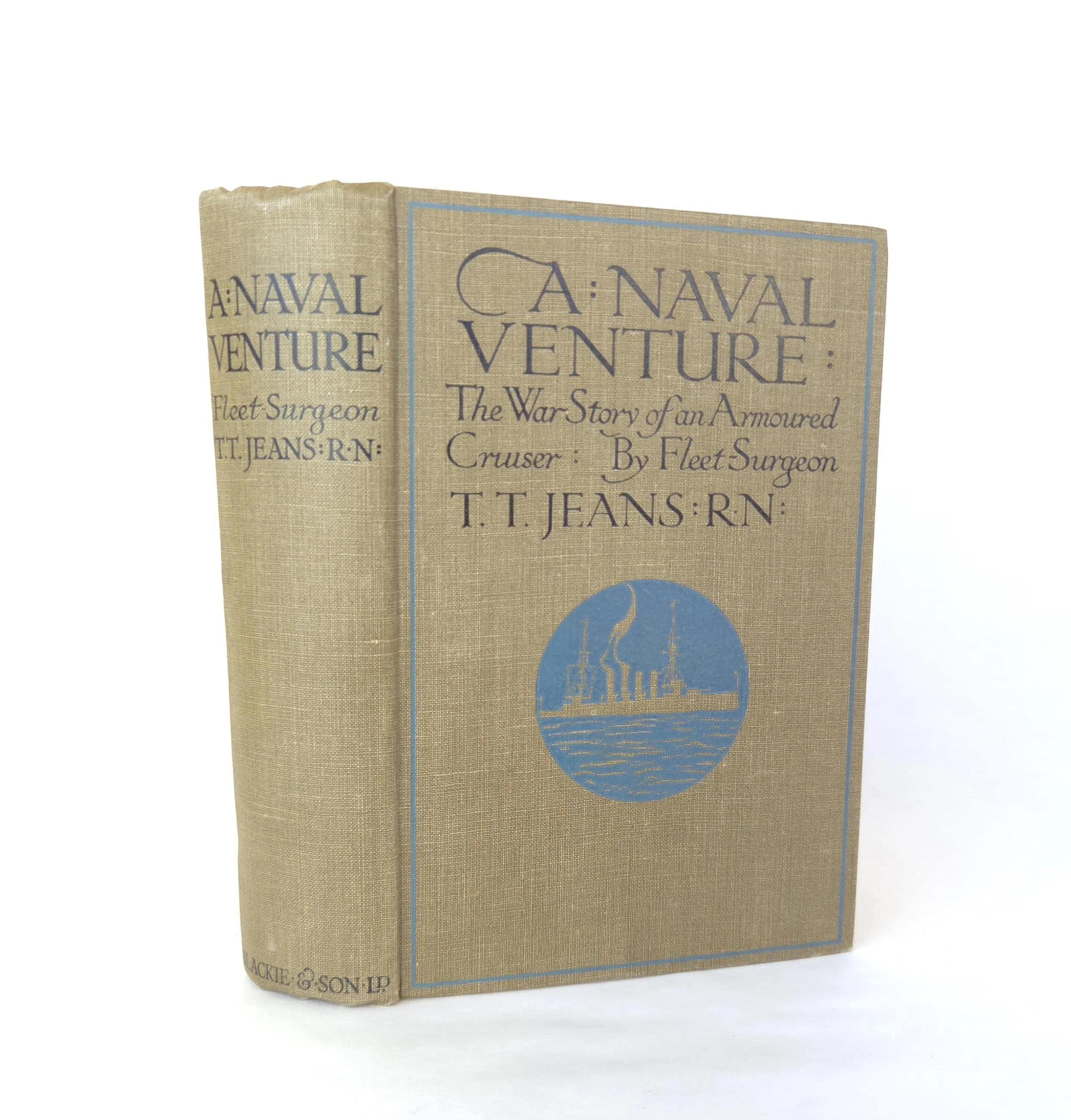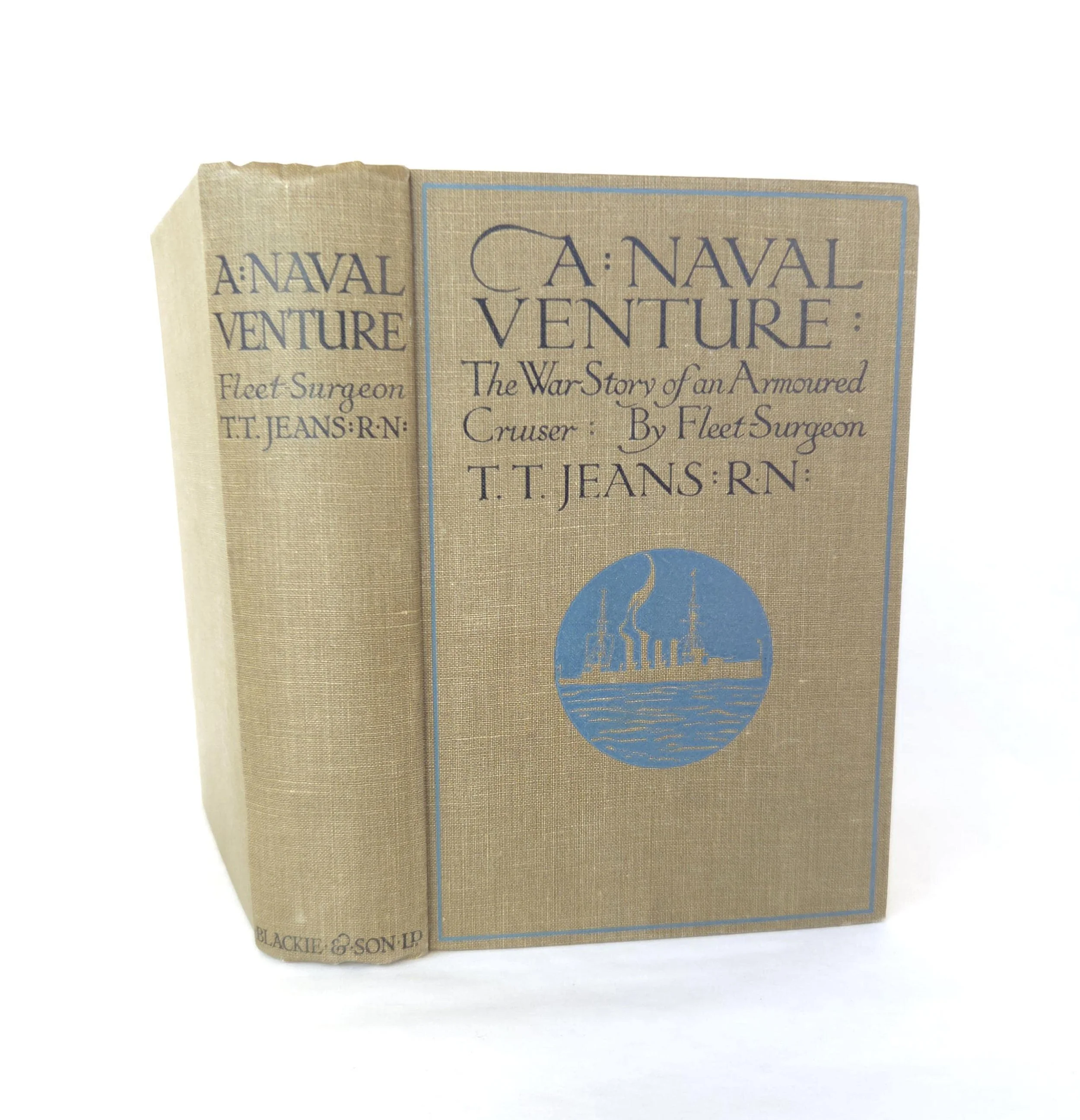 A Naval Venture is a naval adventure novel by T. T. Jeans, set during the age of armored cruisers in the early 20th century, a time when naval power was crucial for empires and warfare. The story centers around the exploits of a British armored cruiser, its crew, and its captain, who are engaged in various naval missions, including battles, espionage, and exploration of complex naval tactics during wartime. The novel provides a fictionalized account of naval operations, offering readers a window into the strategic and tactical importance of armored cruisers, which were the backbone of naval fleets at the time. This antique hardcover edition of the book is in used condition with the dust jacket missing and some minor wear to the edges of the cover. There are some small spots of discoloration to the outer edge of the pages as well as a few spots inside, but the book has good overall color quality.