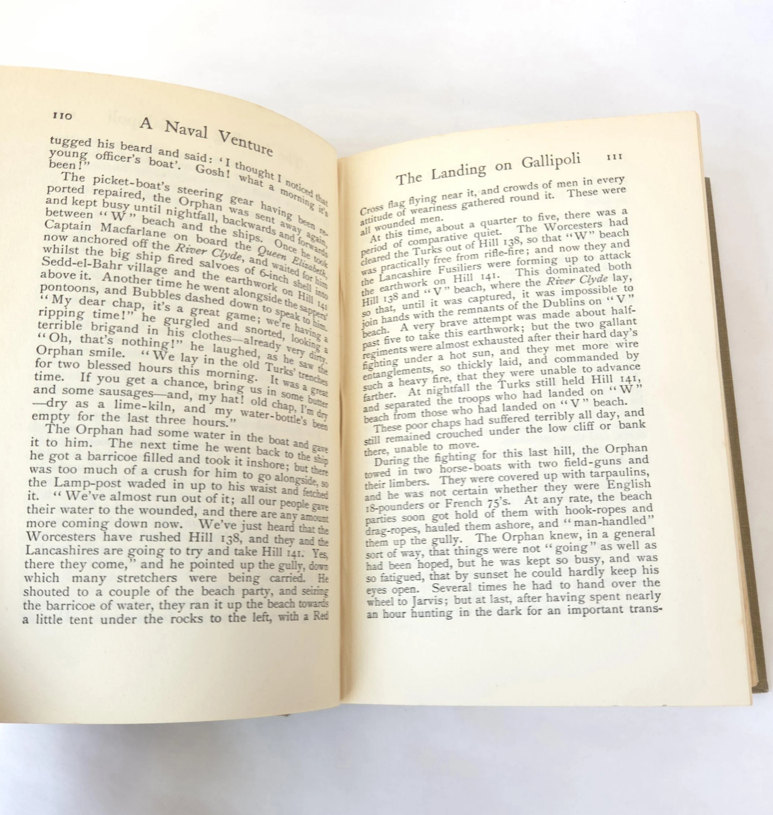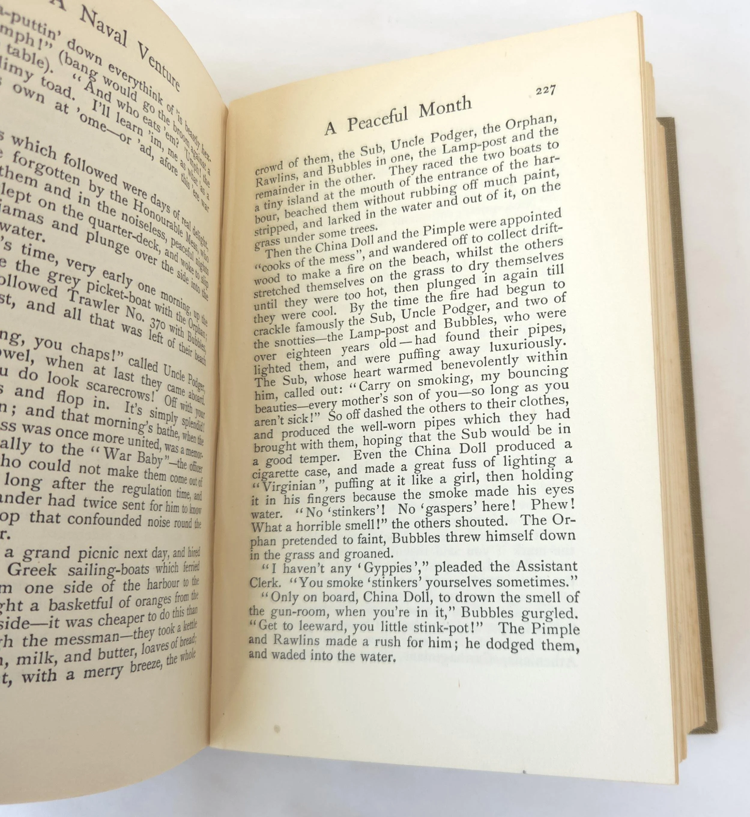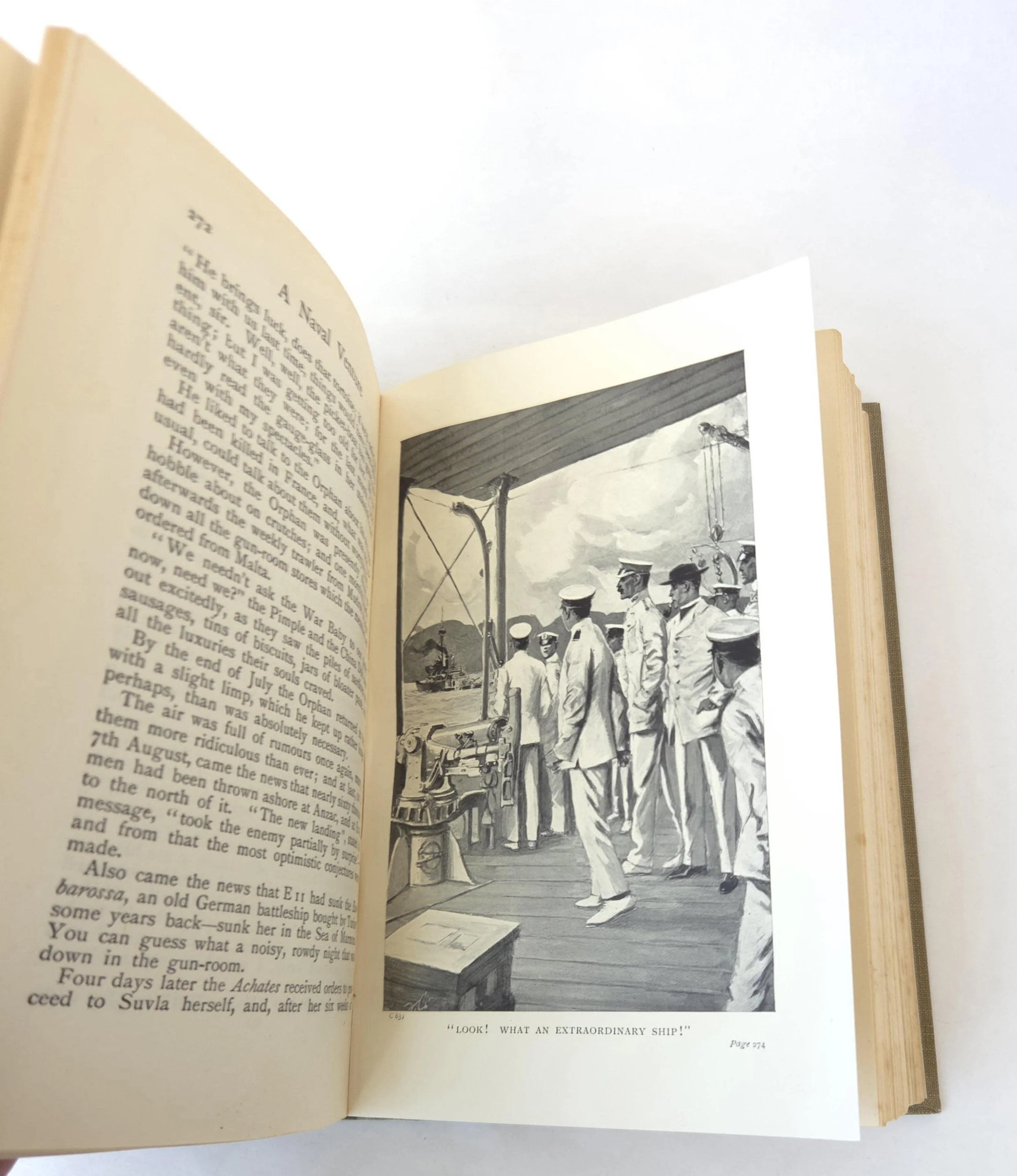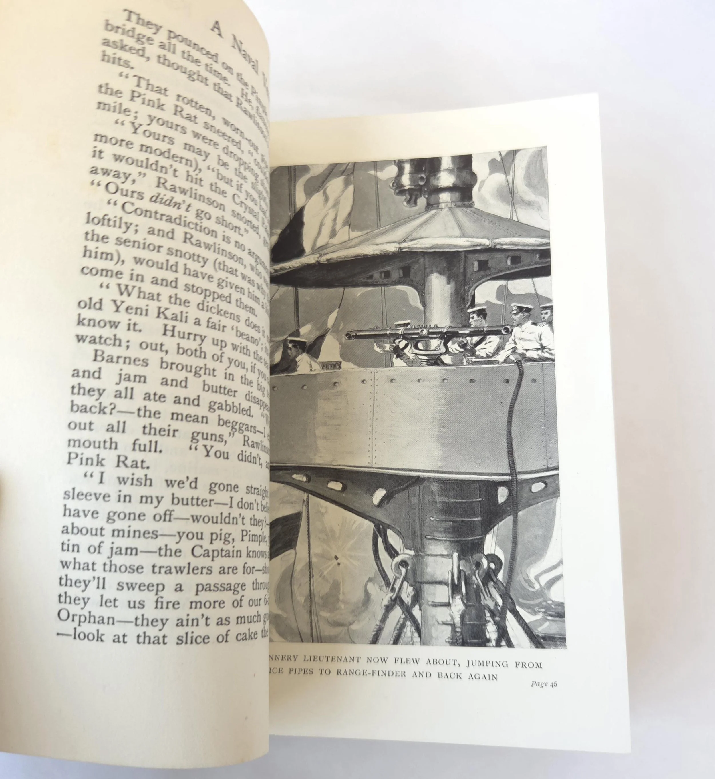 A Naval Venture is a naval adventure novel by T. T. Jeans, set during the age of armored cruisers in the early 20th century, a time when naval power was crucial for empires and warfare. The story centers around the exploits of a British armored cruiser, its crew, and its captain, who are engaged in various naval missions, including battles, espionage, and exploration of complex naval tactics during wartime. The novel provides a fictionalized account of naval operations, offering readers a window into the strategic and tactical importance of armored cruisers, which were the backbone of naval fleets at the time. This antique hardcover edition of the book is in used condition with the dust jacket missing and some minor wear to the edges of the cover. There are some small spots of discoloration to the outer edge of the pages as well as a few spots inside, but the book has good overall color quality.