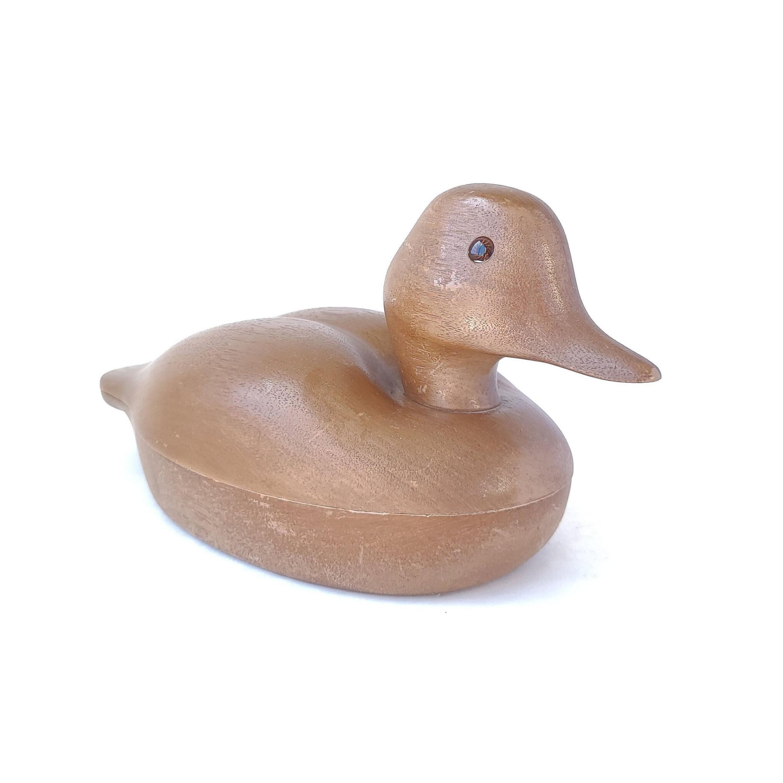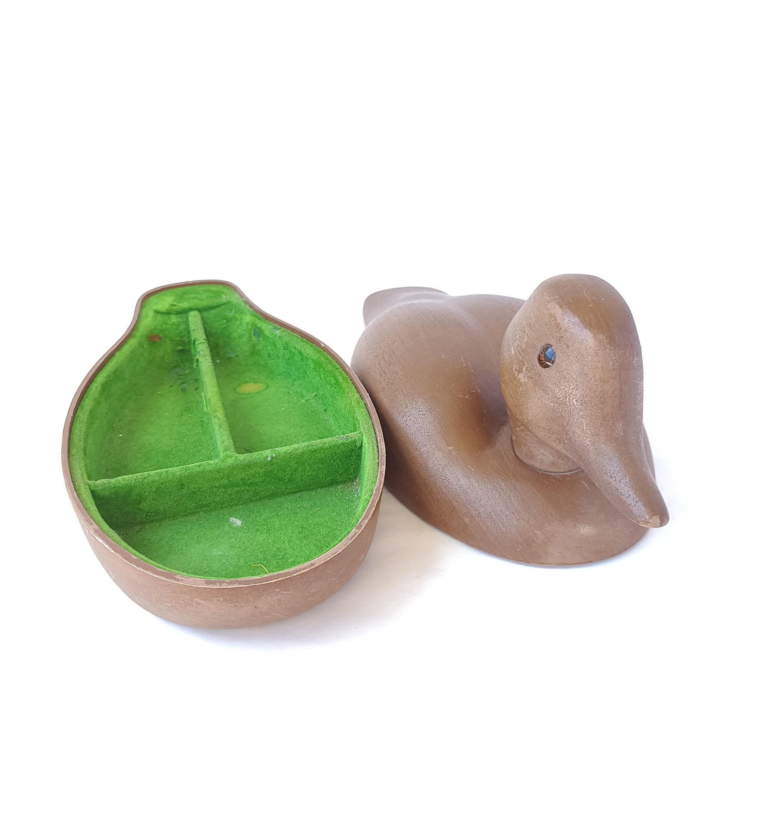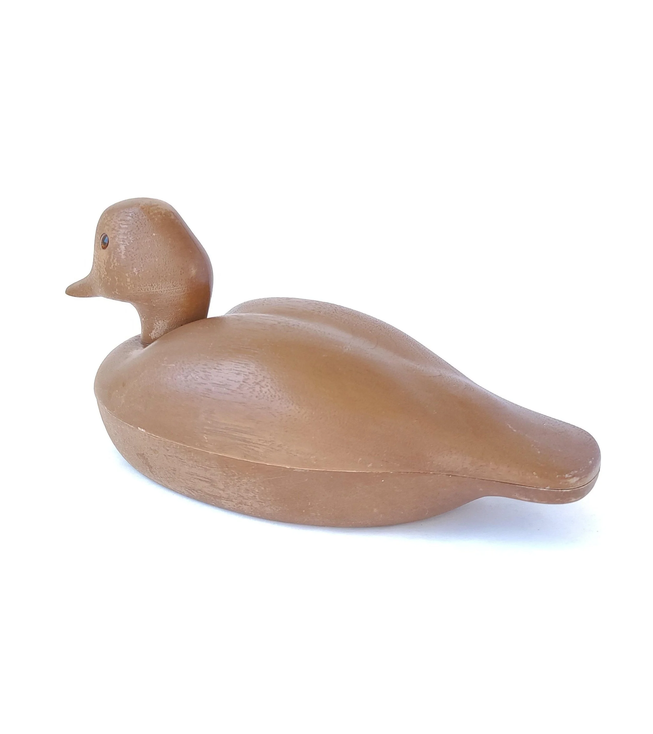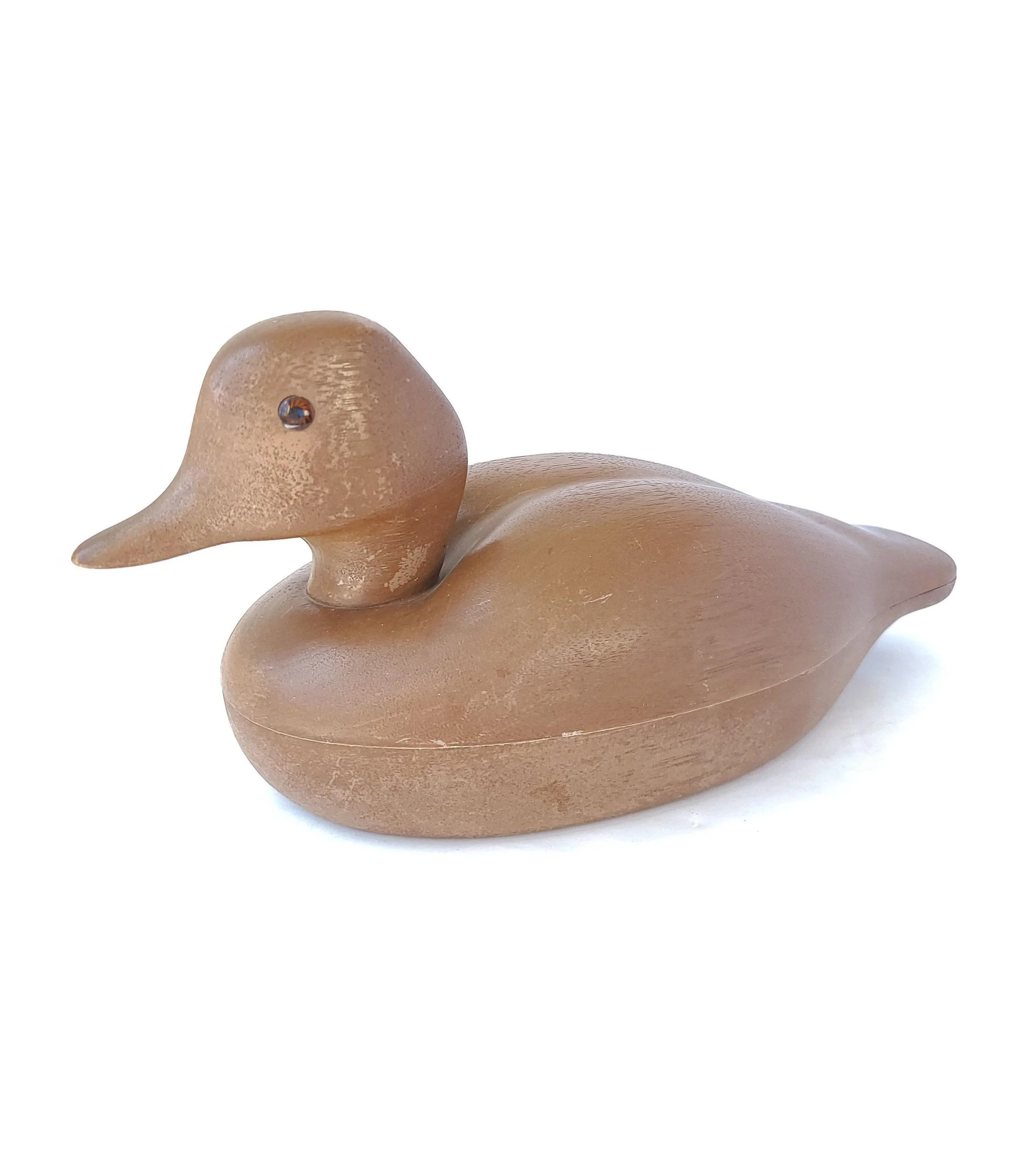 This charming vintage decoy duck box was made by Avon in the 1970's. It looks like a old wood decoy, but is made from lightweight plastic with green flocking inside. The box is in used condition with light scratching and scuffing to the outside and some peeling and spots of discoloration inside. Such a cutie, it would make a great gift!