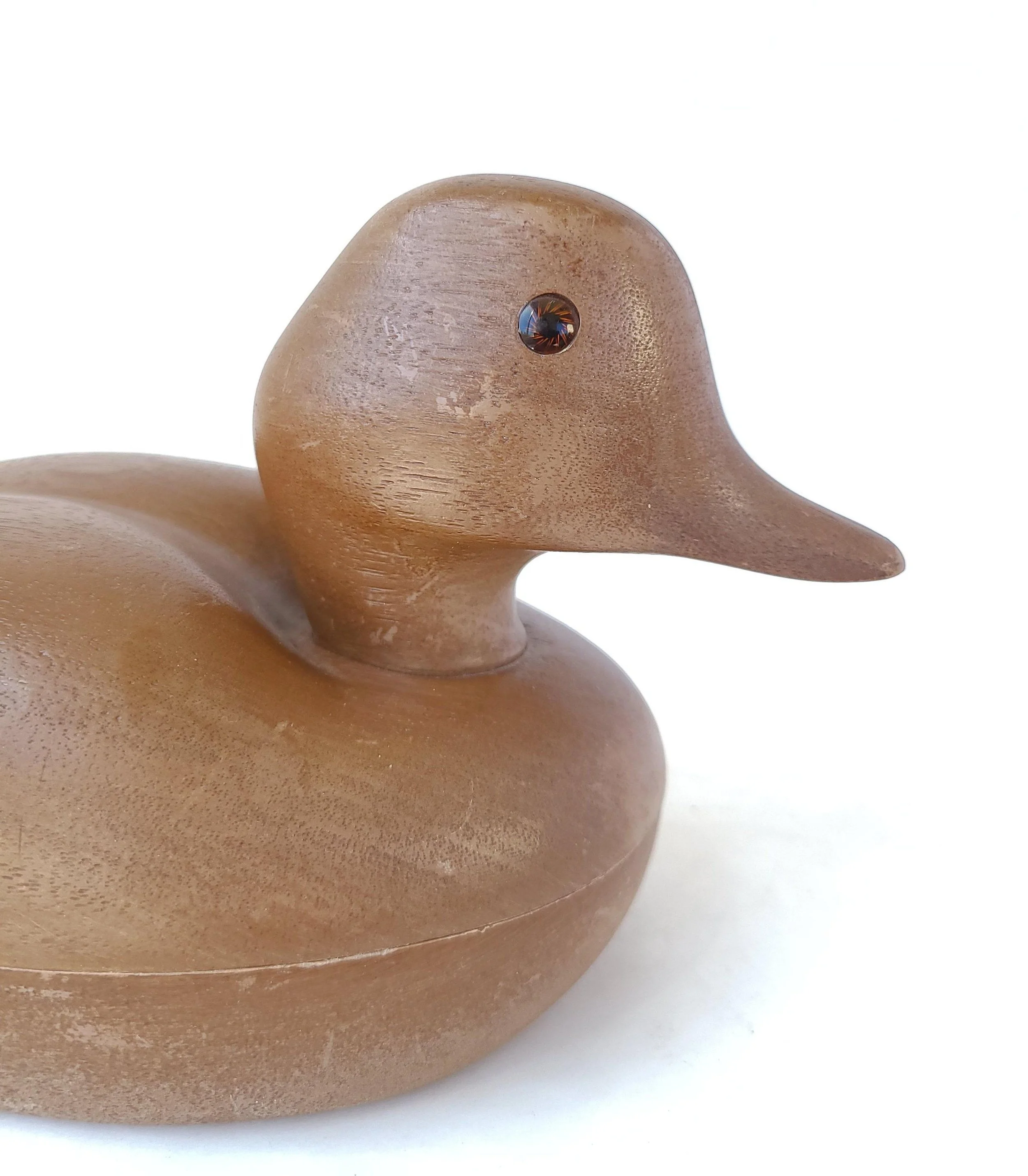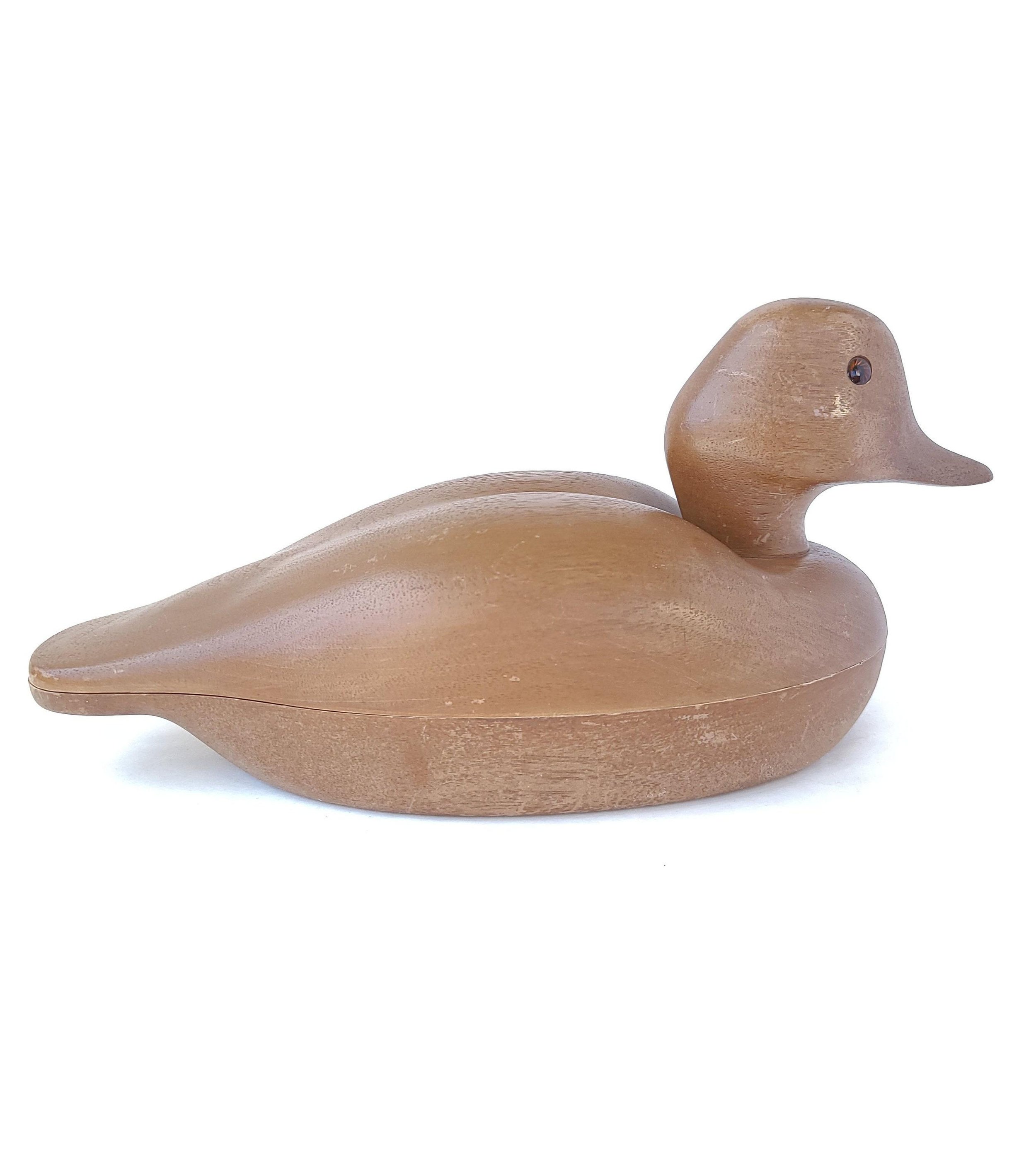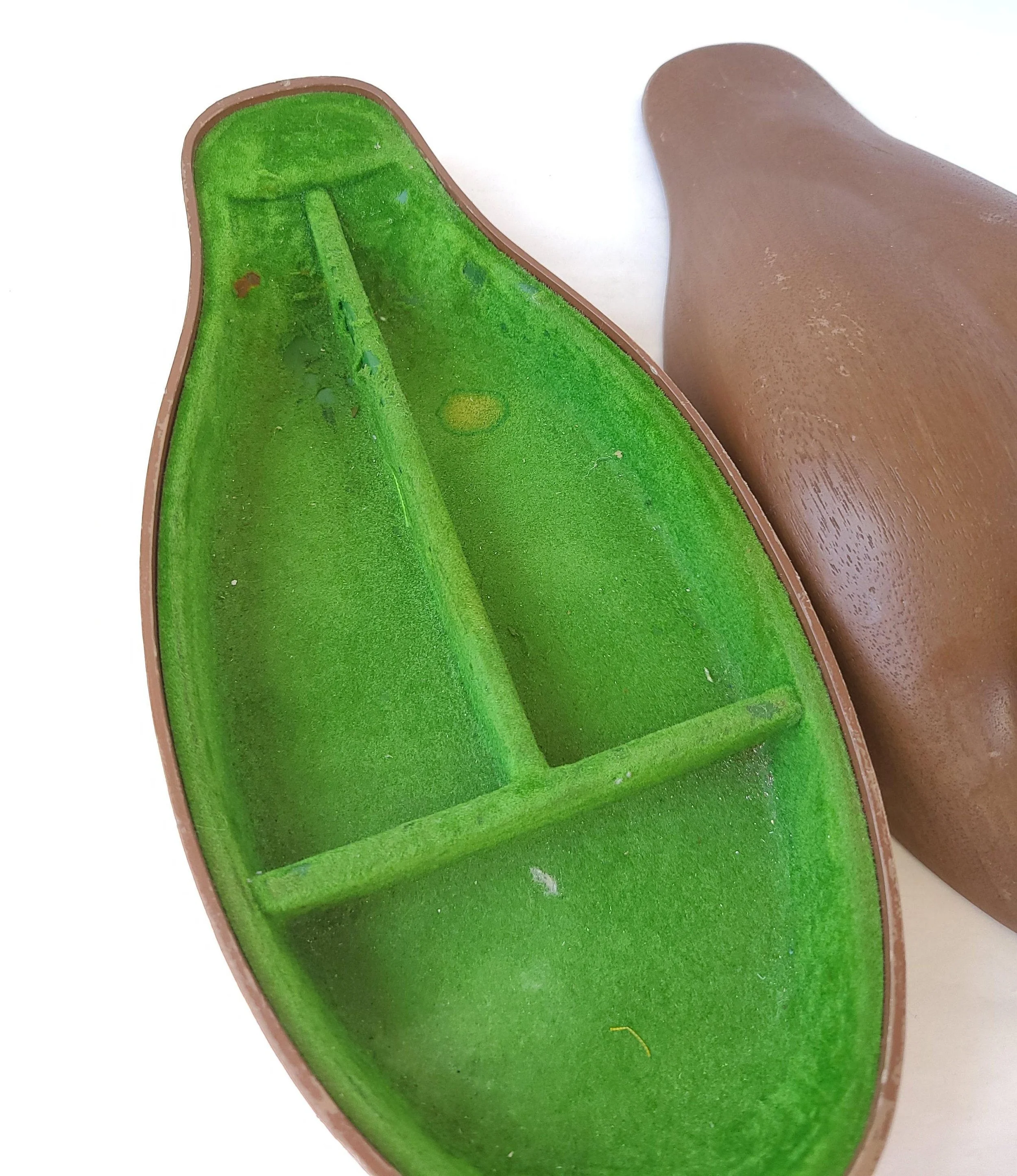 This charming vintage decoy duck box was made by Avon in the 1970's. It looks like a old wood decoy, but is made from lightweight plastic with green flocking inside. The box is in used condition with light scratching and scuffing to the outside and some peeling and spots of discoloration inside. Such a cutie, it would make a great gift!
